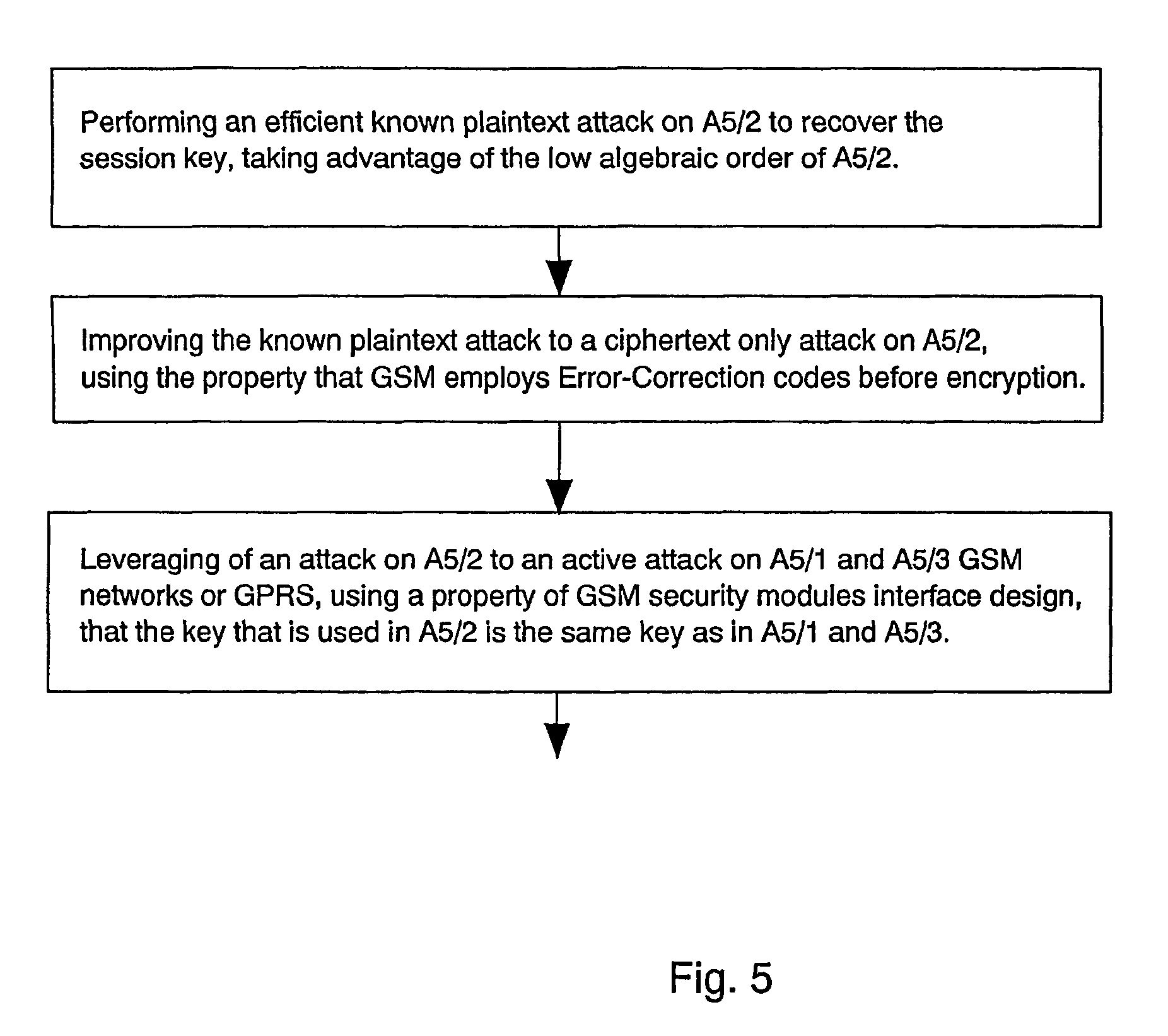 Various improvements in cellular systems will occur to persons skilled in the art upon reading the possible novel attack methods detailed in the present disclosure. Examples relating to GSM include: 1. GSM operators should replace the cryptographic algorithms and protocols now in use as early as possible, to protect the privacy of their customers. 2. Even GSM networks using the new A5/3 succumb to the attack presented here, in the way that A5/3 is at present integrated into GSM. Accordingly, it is suggested to make changes in the way A5/3 is integrated to protect the networks from such attacks. A possible correction is to make the keys used in A5/1 and A5/2 unrelated to the keys that are used in A5/3. This change should also be made in GPRS. In general, it is preferable to create unrelated keys for different encryptions, so that a weakness in one of them would be able to inflict on the others. 3. Even if GSM implements larger key sizes for A5/3, the trivial way for GSM to implement it, is to use the same first bits of the key to A5/1 and A5/2, and have some additional key bits added. Such implementation will cause our attack to easily discover 64 key bits of the key that is used in A5/3, thus reducing security considerably. 4. The present ciphertext-only attack is facilitated by the fact that the error-correction codes are now employed before the encryption. In the case of GSM, the addition of such a structured redundancy before the encryption is performed, fatally reduces the system's security. A method and structure to correct this flaw is proposed. 5. Modifying the GSM standard, to allow the use of more than 64-bit A5/3, would deliver a higher security, and limit the effectiveness of the attack. 6. Performing authentication more often, even during an on-going session, may prove to be a good protection. It would prove that the “real” subscriber is still the one on the other side of the channel. Also authentication in GSM changes the key, which would force an eavesdropper to perform the attack from the start. Even if the key is not changed during the conversation, it will still ensure that there is no impersonation. 7. Stop the use of A5/2, especially in phones. Stopping the use of A5/2, would leave the direct attack on A5/1, which is more expensive and difficult to perform. The attack against A5/1 could still be leveraged against GPRS (like the A5/2 attack), but the cost would be much higher to perform. The down side of this change, that it would force upgrading the infrastructure in networks that employ A5/2. An other option is to create series of phones that do not support A5/2. They will be have no encryption when roaming to A5/2 networks (but as we show A5/2 is not secure anyhow), but will increased security in A5/1 or A5/3 networks, since the A5/2 attack would not work. Therefore, the direct A5/1 would have to be employed, and this attack is far more expensive and difficult to perform. 8. Use more of the available bits for encryption, i.e., use the full 64 bits of key available. In future, as more bits may be available—more bits may be used. It will be recognized that the foregoing is but one example of an apparatus and method within the scope of the present invention and that various modifications will occur to those skilled in the art upon reading the disclosure set forth hereinbefore.TECHNICAL FIELD