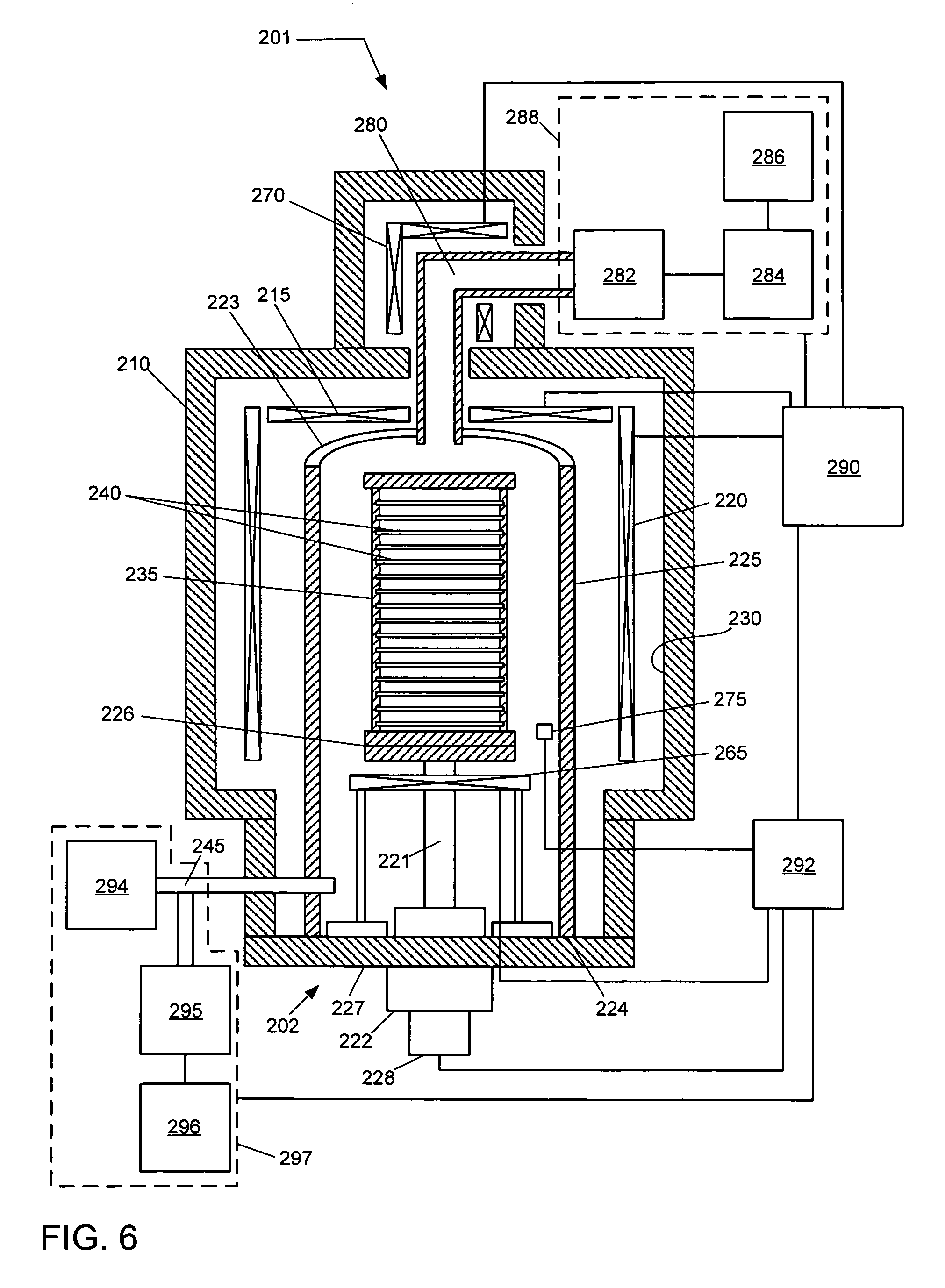 Referring now to FIG. 6, a simplified block diagram of a batch processing system is shown according to another embodiment. The batch processing system 201 contains a process chamber 210 and a process tube 225 that has an upper end 223 connected to an exhaust system 288 via an exhaust duct 280, and a lower end 224 hermetically joined to a lid 227 of cylindrical manifold 202. The exhaust duct 280 discharges gases from the process tube 225 to exhaust system 288 to maintain a pre-determined pressure, e.g., atmospheric or below atmospheric pressure, in the processing system 201. A substrate holder 235 for holding a plurality of substrates (wafers) 240 in a tier-like manner (in respective horizontal planes at vertical intervals) is placed in the process tube 225. The substrate holder 235 resides on a turntable 226 that is mounted on a rotating shaft 221 penetrating the lid 227 and driven by a drive system 228 (which may comprise an electric motor). The turntable 226 can be rotated during processing to improve overall film uniformity or, alternately, the turntable can be stationary during processing. The lid 227 is mounted on an elevator 222 for transferring the substrate holder 235 in and out of the process tube 225. When the lid 227 is positioned at its uppermost position, the lid 227 is adapted to close the open end of the manifold 202.