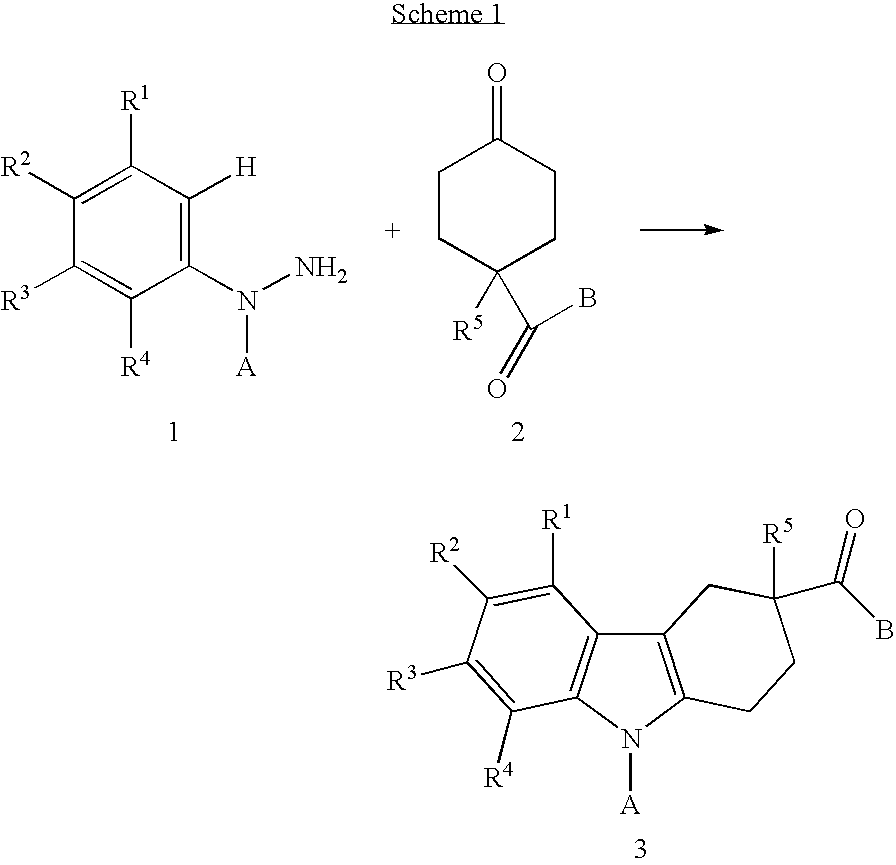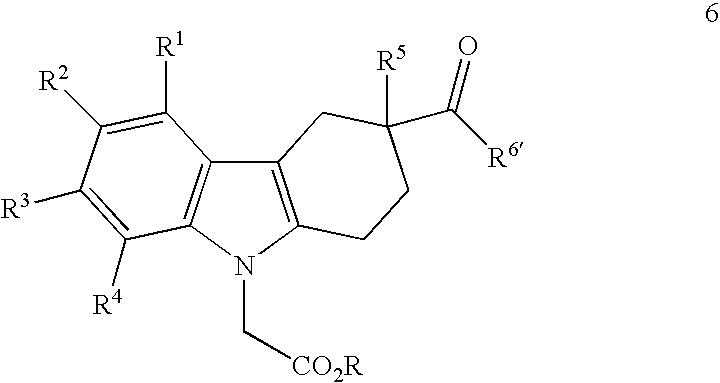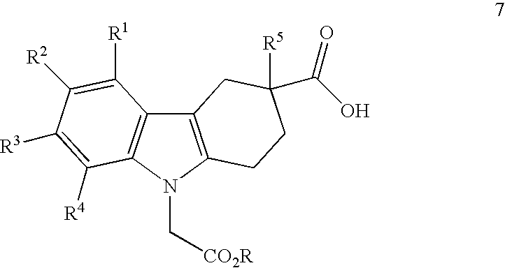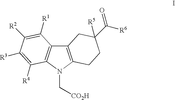 Examples A-03 to A-61 are prepared using procedures analogous to those described for Example A-01 or A-02. LC-MS Formula tR ESI Ex. Compound Name MW (Method) m/z A-03 (±)-[3-(3,4-Dihydro-1H- C24H24N2O3 2.28 389.18 isoquinoline-2-carbonyl)- 388.46 (LC-3) 1,2,3,4-tetrahydro- carbazol-9-yl]-acetic acid A-04 (±)-(3-Phenylcarbamoyl- C21H20N2O3 2.08 371.15 1,2,3,4-tetrahydro- 348.401 (LC-3) [M + Na]+ carbazol-9-yl)-acetic acid A-05 (±)-{3-[Benzyl-((S)-1- C30H30N2O3 2.55 467.21 phenyl-ethyl)- 466.579 (LC-3) carbamoyl]-1,2,3,4- tetrahydro-carbazol-9- yl}-acetic acid A-06 (±)-{3-[Benzyl-((R)-1- C30H30N2O3 2.53 467.21 phenyl-ethyl)- 466.579 (LC-3) carbamoyl]-1,2,3,4- tetrahydro-carbazol-9- yl}-acetic acid A-07 (±)-[3-(Methyl- C24H26N2O3 2.22 391.21 phenethyl-carbamoyl)- 390.481 (LC-3) 1,2,3,4-tetrahydro- carbazol-9-yl]-acetic acid A-08 (±)-[3-(Benzyl- C30H30N2O3 2.48 467.28 phenethyl-carbamoyl)- 466.579 (LC-3) 1,2,3,4-tetrahydro- carbazol-9-yl]-acetic acid A-09 (±)-(3- C31H32N2O3 2.56 481.23 Diphenethylcarbamoyl- 480.606 (LC-3) 1,2,3,4-tetrahydro- carbazol-9-yl)-acetic acid A-10 (±)-[3-(6,11-Dihydro- C29H26N2O3 1.14 450.98 dibenzo[b,e]azepine-5- 450.536 (LC-4) carbonyl)-1,2,3,4- tetrahydro-carbazol-9- yl]-acetic acid A-11 (±)-{3-[Phenyl-(3- C30H30N2O3 1.19 467.04 phenyl-propyl)- 466.579 (LC-4) carbamoyl]-1,2,3,4- tetrahydro-carbazol-9- yl}-acetic acid A-12 (±)-[3-(Phenyl-thiophen- C26H24N2O3S 1.13 444.96 3-ylmethyl-carbamoyl)- 444.554 (LC-4) 1,2,3,4-tetrahydro- carbazol-9-yl]-acetic acid A-13 (±)-[3-(Isopropyl-phenyl- C24H26N2O3 1.11 391.04 carbamoyl)-1,2,3,4- 390.481 (LC-4) tetrahydro-carbazol-9- yl]-acetic acid A-14 (±)-[3-(11,12-Dihydro- C30H28N2O3 2.46 465.17 6H-dibenzo[b,f]azocine- 464.563 (LC-3) 5-carbonyl)-1,2,3,4- tetrahydro-carbazol-9- yl]-acetic acid A-15 (±)-[3-(Butyl-phenyl- C25H28N2O3 2.47 405.23 carbamoyl)-1,2,3,4- 404.508 (LC-3) tetrahydro-carbazol-9- yl]-acetic acid A-16 (±)-[3-(3,4-Dihydro-2H- C24H24N2O3 2.22 389.31 quinoline-1-carbonyl)- 388.466 (LC-0) 1,2,3,4-tetrahydro- carbazol-9-yl]-acetic acid A-17 (±)-[3-(Benzyl-phenyl- C28H26N2O3 2.32 439.26 carbamoyl)-1,2,3,4- 438.525 (LC-3) tetrahydro-carbazol-9- yl]-acetic acid A-18 (±)-[3-(2-Methoxy- C22H22N2O4 2.12 379.05 phenylcarbamoyl)- 378.427 (LC-3) 1,2,3,4-tetrahydro- carbazol-9-yl]-acetic acid A-19 (±)-[3-(4-Methoxy- C28H26N2O4 2.41 455.37 biphenyl-3- 454.524 (LC-3) ylcarbamoyl)-1,2,3,4- tetrahydro-carbazol-9- yl]-acetic acid A-20 (±)-[3-(Ethyl-phenyl- C23H24N2O3 2.13 377.23 carbamoyl)-1,2,3,4- 376.455 (LC-3) tetrahydro-carbazol-9- yl]-acetic acid A-21 (±)-[3-(Methyl-phenyl- C22H22N2O3 2.03 363.26 carbamoyl)-1,2,3,4- 362.428 (LC-3) tetrahydro-carbazol-9- yl]-acetic acid A-22 (±)-[3-(3-Benzoyl- C28H24N2O4 2.28 453.21 phenylcarbamoyl)- 452.509 (LC-3) 1,2,3,4-tetrahydro- carbazol-9-yl]-acetic acid A-23 (±)-[3-(5-Chloro-2- C22H21N2O4Cl 2.33 435.30 methoxy- 412.872 (LC-3) [M + Na]+ phenylcarbamoyl)- 1,2,3,4-tetrahydro- carbazol-9-yl]-acetic acid A-24 (±)-[3-(2-Benzyl- C28H26N2O3 2.27 439.25 phenylcarbamoyl)- 438.525 (LC-3) 1,2,3,4-tetrahydro- carbazol-9-yl]-acetic acid A-25 (±)-[3- C29H24N2O3 2.29 449.28 (Dibenzo[b,f]azepine-5- 448.521 (LC-3) carbonyl)-1,2,3,4- tetrahydro-carbazol-9- yl]-acetic acid A-26 (±)-[3-(6,7-Dimethoxy- C26H28N2O5 1.98 449.18 3,4-dihydro-1H- 448.517 (LC-3) isoquinoline-2-carbonyl)- 1,2,3,4-tetrahydro- carbazol-9-yl]-acetic acid A-27 (±)-{3-[(4-Fluoro- C22H21N2O3F 2.10 381.28 phenyl)-methyl- 380.418 (LC-0) carbamoyl]-1,2,3,4- tetrahydro-carbazol-9- yl}-acetic acid A-28 (±)-[3-(Ethyl-naphthalen- C27H26N2O3 1.08 426.98 1-yl-carbamoyl)-1,2,3,4- 426.514 (LC-4) tetrahydro-carbazol-9- yl]-acetic acid A-29 (±)-[3-(Cyclohexyl- C27H30N2O3 1.14 430.97 phenyl-carbamoyl)- 430.546 (LC-4) 1,2,3,4-tetrahydro- carbazol-9-yl]-acetic acid A-30 (±)-[3-(Phenethyl- C29H28N2O3 1.14 453.05 phenyl-carbamoyl)- 452.552 (LC-4) 1,2,3,4-tetrahydro- carbazol-9-yl]-acetic acid A-31 (±)-[3-(Methyl-o-tolyl- C23H24N2O3 1.06 376.99 carbamoyl)-1,2,3,4- 376.455 (LC-4) tetrahydro-carbazol-9- yl]-acetic acid A-32 (±)-[3-(Allyl-phenyl- C24H24N2O3 1.09 388.96 carbamoyl)-1,2,3,4- 388.466 (LC-4) tetrahydro-carbazol-9- yl]-acetic acid A-33 (±)-[3-(7- C25H23N2O3F3 1.17 457.14 Trifluoromethyl-3,4- 456.463 (LC-4) dihydro-2H-quinoline-1- carbonyl)-1,2,3,4- tetrahydro-carbazol-9- yl]-acetic acid A-34 (±)-[3-(Benzyl- C25H28N2O3 1.13 405.02 isopropyl-carbamoyl)- 404.508 (LC-1) 1,2,3,4-tetrahydro- carbazol-9-yl]-acetic acid A-35 (±)-{3-[(3-Chloro- C22H21N2O3Cl 1.08 396.92 phenyl)-methyl- 396.873 (LC-1) carbamoyl]-1,2,3,4- tetrahydro-carbazol-9- yl}-acetic acid A-36 (±)-[3-(Benzhydryl- C28H26N2O3 1.12 439.07 carbamoyl)-1,2,3,4- 438.525 (LC-1) tetrahydro-carbazol-9- yl]-acetic acid A-37 (±)-{3-[Methyl-(2- C23H21N2O3F3 1.08 430.89 trifluoromethyl-phenyl)- 430.425 (LC-1) carbamoyl]-1,2,3,4- tetrahydro-carbazol-9- yl}-acetic acid A-38 (±)-{3-[(3,4-Dichloro- C22H20N2O3Cl2 1.14 452.77 phenyl)-methyl- 431.318 (LC-1) [M + Na]+ carbamoyl]-1,2,3,4- tetrahydro-carbazol-9- yl}-acetic acid A-39 (±)-[3-(2,3-Dihydro- C23H22N2O3 1.09 374.92 indole-1-carbonyl)- 374.439 (LC-1) 1,2,3,4-tetrahydro- carbazol-9-yl]-acetic acid A-40 (±)-{3-[(3-Fluoro- C22H21N2O3F 1.03 380.94 phenyl)-methyl- 380.418 (LC-1) carbamoyl]-1,2,3,4- tetrahydro-carbazol-9- yl}-acetic acid A-41 (±)-{3-[Ethyl-(4- C24H23N2O4F3 1.16 461.02 trifluoromethoxy- 460.451 (LC-1) phenyl)-carbamoyl]- 1,2,3,4-tetrahydro- carbazol-9-yl}-acetic acid A-42 (±)-[3-(Benzhydryl- C29H28N2O3 1.18 453.05 methyl-carbamoyl)- 452.552 (LC-1) 1,2,3,4-tetrahydro- carbazol-9-yl]-acetic acid A-43 (±)-{3-[Benzyl-(2-cyano- C25H25N3O3 1.02 416.02 ethyl)-carbamoyl]- 415.492 (LC-1) 1,2,3,4-tetrahydro- carbazol-9-yl}-acetic acid A-44 (±)-{3-[Methyl-(2- C23H25N3O3 0.69 392.01 pyridin-2-yl-ethyl)- 391.47 (LC-1) carbamoyl]-1,2,3,4- tetrahydro-carbazol-9- yl}-acetic acid A-45 (±)-{3- C23H22N2O5 0.99 406.87 [(Benzo[1,3]dioxol-5- 406.437 (LC-1) ylmethyl)-carbamoyl]- 1,2,3,4-tetrahydro- carbazol-9-yl}-acetic aci