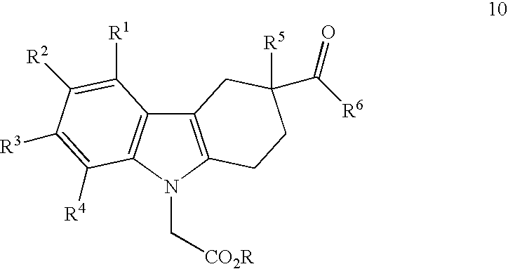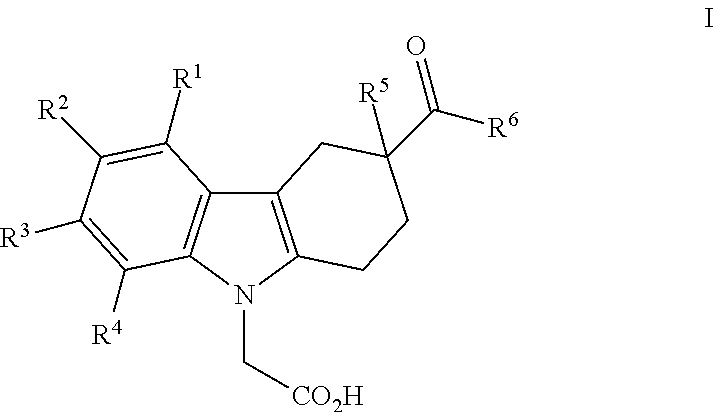 (±)-[3-(Methyl-phenyl-carbamoyl)-6-nitro-1,2,3,4-tetrahydro- 0.011 carbazol-9-yl]-acetic acid (±)-[3-Methyl-3-(methyl-phenyl-carbamoyl)-1,2,3,4-tetrahydro- 0.013 carbazol-9-yl]-acetic acid (±)-[3-(Benzhydryl-methyl-carbamoyl)-1,2,3,4-tetrahydro- 0.017 carbazol-9-yl]-acetic acid (±)-{3-[(3-Chloro-phenyl)-methyl-carbamoyl]-3-methyl- 0.020 1,2,3,4-tetrahydro-carbazol-9-yl}-acetic acid (±)-{3-[Methyl-(2-trifluoromethyl-phenyl)-carbamoyl]-1,2,3,4- 0.045 tetrahydro-carbazol-9-yl}-acetic acid (+)-[3-(2,3-Dihydro-indole-1-carbonyl)-6-fluoro-1,2,3,4- 0.028 tetrahydro-carbazol-9-yl]-acetic acid (+)-[3-(Azocane-1-carbonyl)-6-fluoro-1,2,3,4-tetrahydro- 0.046 carbazol-9-yl]-acetic acid (±)-{3-[Benzyl-(2-cyano-ethyl)-carbamoyl]-3-methyl-1,2,3,4- 0.036 tetrahydro-carbazol-9-yl}-acetic acid [3-(2,3-Dihydro-indole-1-carbonyl)-3-ethyl-1,2,3,4-tetrahydro- 0.067 carbazol-9-yl]-acetic acid (−)-{6-Fluoro-3-[4-(4-fluoro-phenyl)-piperazine-1-carbonyl]- 0.599 1,2,3,4-tetrahydro-carbazol-9-yl}-acetic acid Example E-01