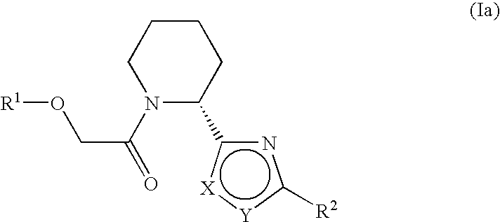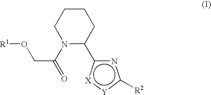 It will be appreciated that the compounds of general formula (I) in this invention may be derivatised at functional groups to provide derivatives which are capable of conversion back to the parent compound in vivo. The invention further relates to a process for the manufacture of compounds of formula (I) as defined above, which process comprises reacting a compound of formula (IV): The reaction of a compound of formula (IV) with a compound of formula R1—O—CH2—C(O)Cl can be carried out under conditions well known to the person skilled in the art. For example, the compound of formula (IV) is reacted with a compound of formula R1—O—CH2—C(O)Cl in anhydrous solvents such as dichloromethane, tetrahydrofuran, acetonitrile, toluene and mixtures thereof or in the absence of solvent, at temperatures between 0° C. and 110° C., optionally in the presence of a base like triethylamine, diisopropylethylamine or pyridine. The present invention also relates to compounds of formula (I) as defined above, when prepared by a process as described above. The compounds of formula (IV) and R1—O—CH2—C(O)Cl can be prepared by methods known in the art or as described below or in analogy thereto. Unless otherwise indicated, R1, R2, X and Y are as described above. Compounds of formula (I), where X is sulfur and Y is —CR3are part of the present invention and are represented by general formula (II): Compounds of general formula (II) can be accessed as detailed in scheme 1. In step 1, scheme 1, (R)-(+)-piperidine-1,2-dicarboxylic acid 1-tert-butyl ester 1 is converted to the corresponding primary amide 2 by methods well known to somebody skilled in the art, namely by condensation with an ammonia equivalent. Typical reaction conditions involve mixing of acid 1 with ammonium chloride or another ammonia equivalent under basic conditions in the presence of a condensing agent and eventual intermediacy of an activated ester, anhydride or acyl chloride. Typically used bases are diisopropylethylamine, triethylamine, pyridine, 4-dimethylaminopyridine, morpholine or other organic base. Typically used condensing reagents are for example O-(7-benzotriazol-1-yl)-N,N,N′,N′-tetramethyluronium-tetrafluoroborate (TBTU), O-(7-azabenzotriazol-1-yl)-N,N,N′,N′-tetramethyluronium-hexaflurophophate (HATU), N,N′-dicyclohexylcarbodiimide, 1-(3-dimethylaminopropyl)-3-ethyl-carbodiimide hydrochloride, O-(benzotriazol-1-yl)-N,N,N′,N′-tetramethyluronium hexafluoro-phosphate, bromo-tris-pyrrolidino-phosphonium hexafluorophosphate, carbonyl diimidazole or others well known to the person skilled in the art. The reaction is usually carried out in aprotic solvents such as dichloromethane, tetrahydrofuran, N,N-dimethylformamide, N,N-dimethylacetamide, N-methylpyrrolidinone and mixtures thereof at temperatures between 0° C. and 60° C. Alternatively, such reactions can be performed in two steps involving first formation of the acyl halide derivative of the acid 1 and subsequent coupling reaction with an ammonium equivalent in the presence of a base. Typically employed reagents for the formation of the acyl chloride are thionyl chloride, phosphorous pentachloride, oxalyl chloride, chloroformiates or cyanuric chloride, and the reaction is generally conducted in the absence of a solvent or in the presence of an aprotic solvent like dichloromethane, toluene or acetone. A base can optionally be added, like for example pyridine, triethylamine, diisopropyl ethyl amine or N-methyl morpholine. The obtained acyl chloride can be isolated or reacted as such with an appropriate ammonium equivalent in an aprotic solvent, like dichloromethane, tetrahydrofuran or acetone, in the presence of a base. Typical bases are triethylamine, 4-methylmorpholine, pyridine, diisopropyl ethyl amine or dimethylaminopyridine or mixtures thereof. In step 2, scheme 1, the amide 2 is converted to the corresponding thioamide 3 according to methods well known to somebody skilled in the art, namely by reaction with 2,4-bis(4-methoxyphenyl)-1,3,2,4-dithiadiphosphetane 2,4-disulfide (Lawesson's reagent). In step 3, scheme 1, the obtained thioamide 3 is reacted with aptly substituted α-bromoketones 4 to yield the corresponding thiazoles 5 according to methods well known to people skilled in the art, namely cyclocondensation. The reaction can be carried out under a variety of conditions favoring the elimination of hydrogen bromide and water. Typically used conditions involve a two stage reaction between the thioamide 3 and the α-bromoketone 4 at temperature between 0 and 100° C., followed by dehydration with trifluoracetic anyhdride and pyridine at temperatures between 0 and 50° C. In step 4, scheme 1, the obtained thiazoles of general formula 5 are deprotected to yield the free piperidines 6, by methods well known to somebody skilled in the art, namely by treatment of the BOC-protected piperdines 5 with organic or mineral acid in the absence of a solvent or in the presence of a suitable organic solvent. Typically used acids are hydrochloric acid and trifluoroacetic acid in solvents such as dichloromethane, dioxane, tetrahydrofurane, ether or alcoholic solvents. In step 5, scheme 1, the obtained free piperidine 6 is reacted with phenoxyacetyl chloride 7 under standard conditions to yield compounds of general formula (II). Typically used reaction conditions involve mixing the piperidines 6 with the acyl chloride 7 in an aprotic solvent, like dichloromethane, tetrahydrofuran or acetone, in the presence of a base. Typical bases are triethylamine, 4-methylmorpholine, pyridine, diisopropyl ethyl amine or dimethylaminopyridine or mixtures thereof. Compounds of formula (I) where X is CR3and Y is sulfur are part of the present invention and are represented by general formula (III): Compounds of general formula (III) can be accessed as detailed in scheme 2. In step 1, scheme 2, (R)-(+)-piperidine-1,2-dicarboxylic acid 1-tert-butyl ester 1 is converted to the corresp