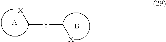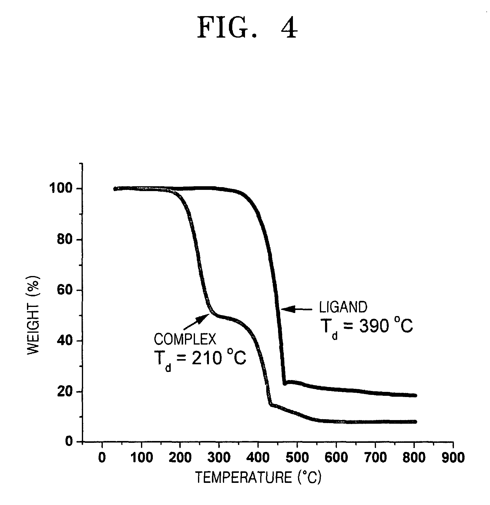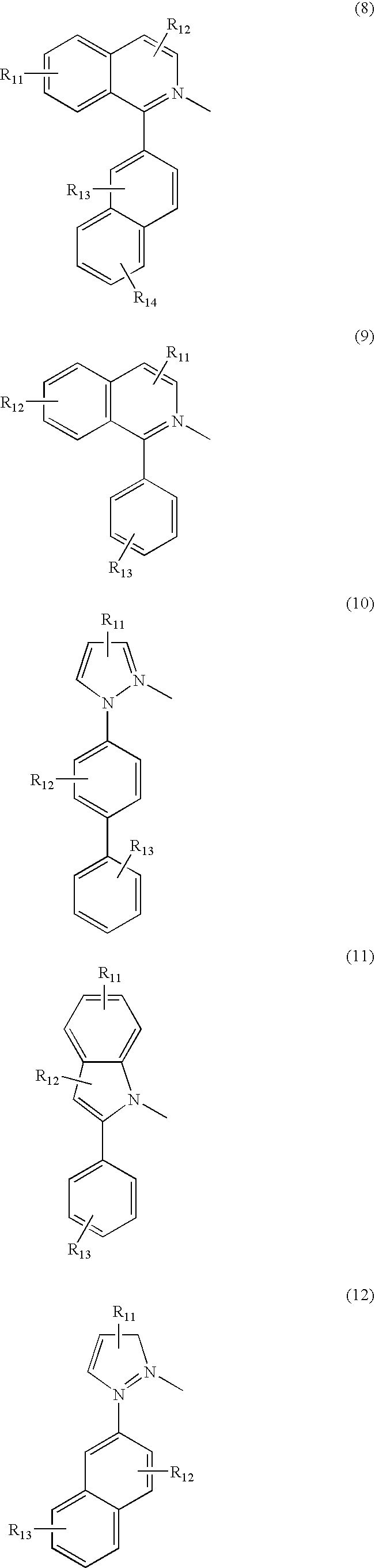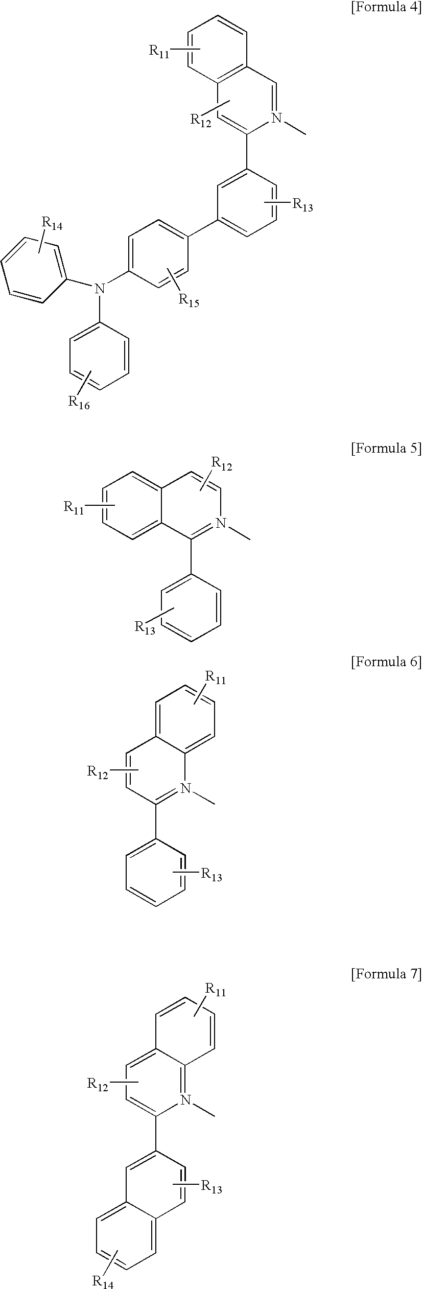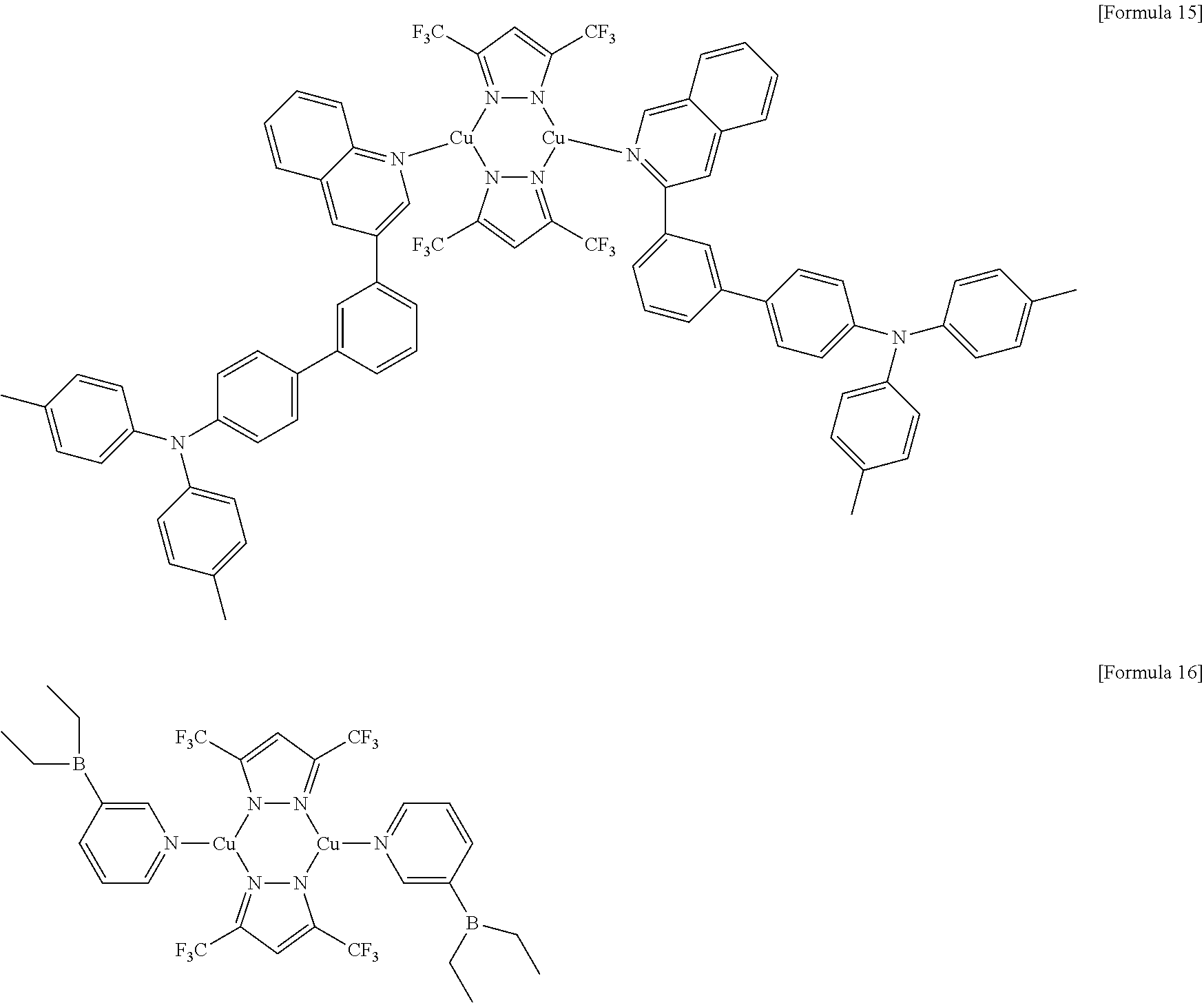 PL CIE λmax(nm) (x, y) Example Solution Film Solution Film Example 1: 485 560 (0.18, 0.30) (0.42, 0.53) Example 2: 595 595 (0.50, 0.47) (0.50, 0.46) Example 3 600 600 (0.52, 0.45) (0.53, 0.46) Example 4 585 585 (0.48, 0.42) (0.47, 0.44) Example 6