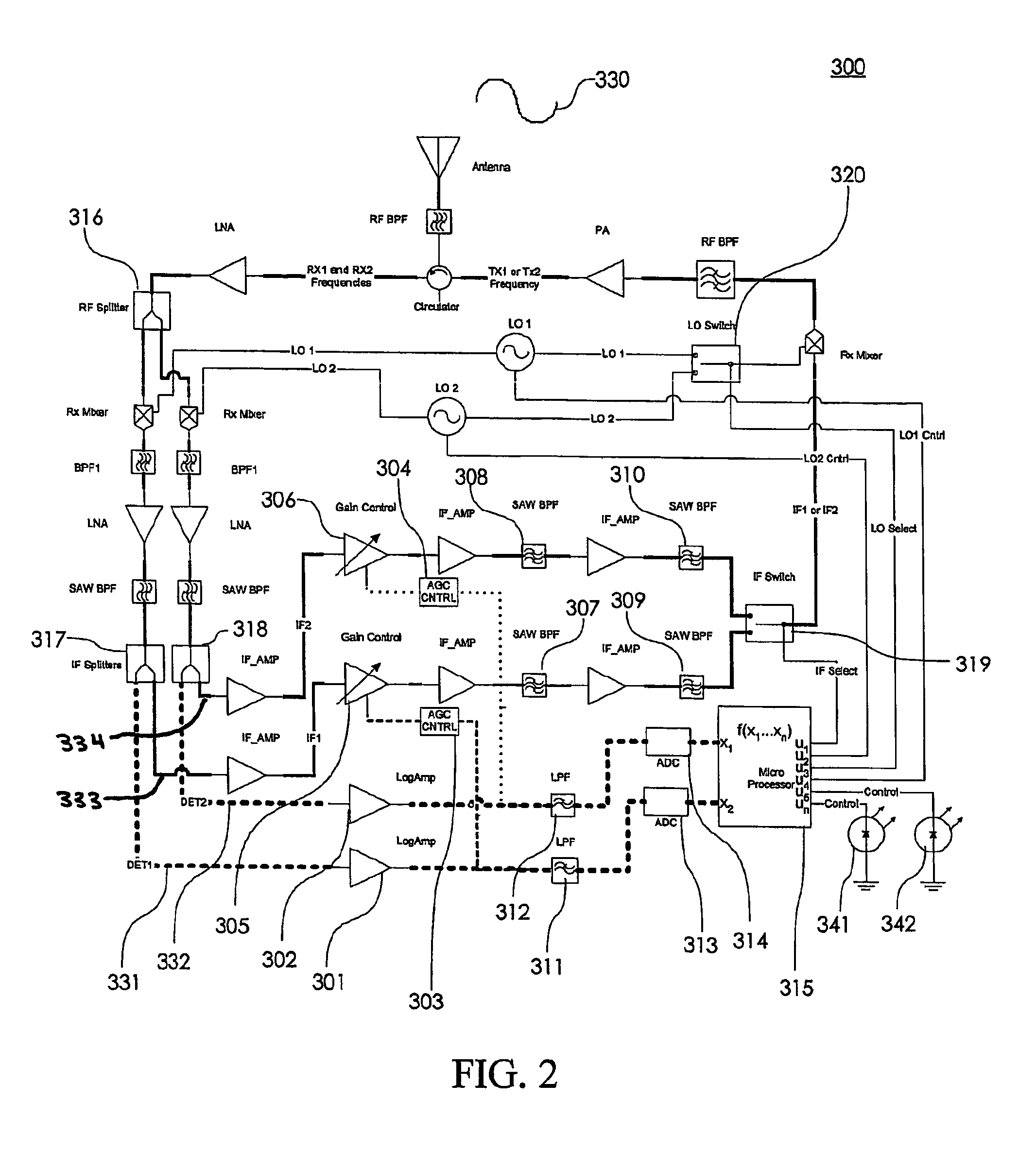 With reference still to FIG. 2 of the drawings, gain control is applied to signals on IF paths IF1333 and IF2334 using AGC control circuits 303 and 304 which circuits provide, inter alia, filtering of the analog voltage at the output of, for example, logarithmic amplifiers 301 and 302, any DC offset adjustment which may be necessary, AGC set point reference and control, level shifting/scaling, any required polarity reversal, and the like as would be appreciated by one of ordinary skill in the art. The output of AGC control circuits 303 and 304 are fed to gain control elements 305 and 306 which may provide either adjustable gain or adjustable attenuation of received signal 330 based on a value associated with, for example, the desired transmitter output power. It should be noted that AGC control circuits 303 and 304 may be one of a variety of gain control circuits, devices, or the like, as would be well known to those of ordinary skill in the art.