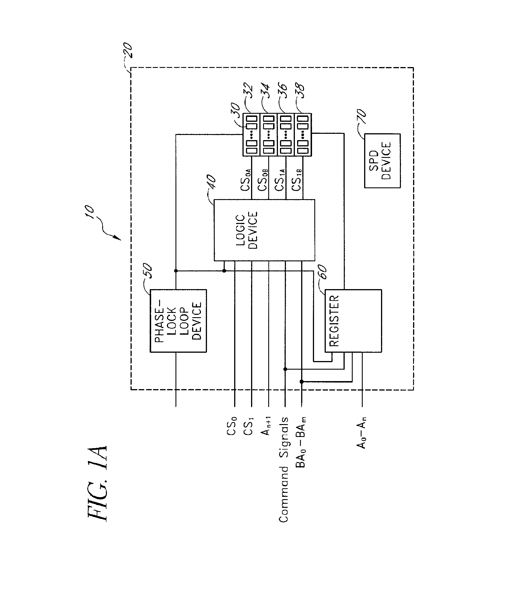 In certain embodiments, the SPD device 70 comprises data which characterize the memory module 10 as having fewer ranks of memory devices than the memory module 10 actually has, with each of these ranks having more memory density. For example, for a memory module 10 compatible with certain embodiments described herein having two ranks of memory devices 30, the SPD device 70 comprises data which characterizes the memory module 10 as having one rank of memory devices with twice the memory density per rank. Similarly, for a memory module 10 compatible with certain embodiments described herein having four ranks of memory devices 30, the SPD device 70 comprises data which characterizes the memory module 10 as having two ranks of memory devices with twice the memory density per rank. In addition, in certain embodiments, the SPD device 70 comprises data which characterize the memory module 10 as having fewer memory devices than the memory module 10 actually has, with each of these memory devices having more memory density per memory device. For example, for a memory module 10 compatible with certain embodiments described herein, the SPD device 70 comprises data which characterizes the memory module 10 as having one-half the number of memory devices that the memory module 10 actually has, with each of these memory devices having twice the memory density per memory device. In certain such embodiments, the SPD device 70 of the memory module 10 is programmed to describe the combined pair of lower-density memory devices 31, 33 as one virtual or pseudo-higher-density memory device. In an exemplary embodiment, two 512-Mb memory devices, each with a 128M×4-bit configuration, are used to simulate one 1-Gb memory device having a 128M×8-bit configuration. The SPD device 70 of the memory module 10 is programmed to describe the pair of 512-Mb memory devices as one virtual or pseudo-1-Gb memory device. For example, to fabricate a 1-GB (128M×8-byte) memory module, sixteen 512-Mb (128M×4-bit) memory devices can be used. The sixteen 512-Mb (128M×4-bit) memory devices are combined in eight pairs, with each pair serving as a virtual or pseudo-1-Gb (128M×8-bit) memory device. In certain such embodiments, the SPD device 70 contains the following SPD data (in appropriate bit fields of these bytes):