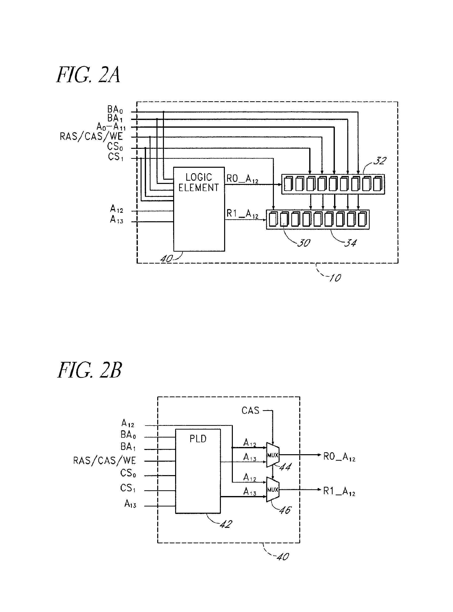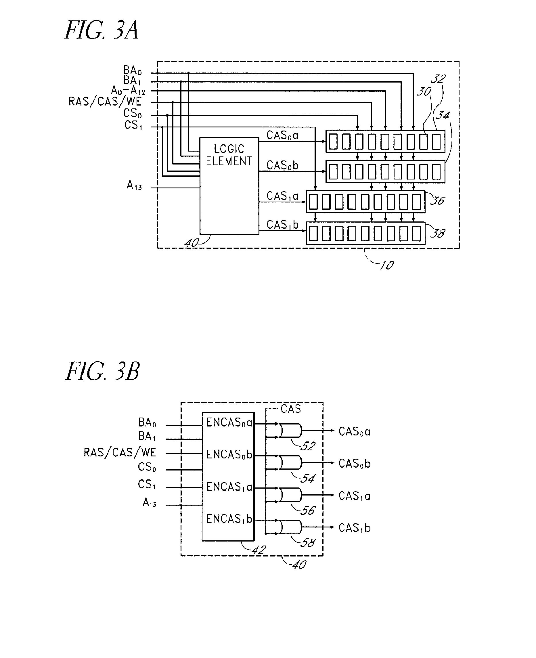In this exemplary embodiment, bytes 3, 4, and 17 are programmed to have the same values as they would have for a 512-MB (128M×4-byte) memory module utilizing 512-Mb (128M×4-bit) memory devices. However, bytes 13 and 14 of the SPD data are programmed to be equal to 8, corresponding to the bit width of the virtual or pseudo-higher-density 1-Gb (128M×8-bit) memory device, for a total capacity of 1-GB. Thus, the SPD data does not describe the actual-lower-density memory devices, but instead describes the virtual or pseudo-higher-density memory devices. The BIOS accesses the SPD data and recognizes the memory module as having 4 banks of memory locations arranged in 213rows and 212columns, with each memory location having a width of 8 bits rather than 4 bits. In certain embodiments, when such a memory module 10 is inserted in a computer system, the computer system's memory controller then provides to the memory module 10 a set of input control signals which correspond to the number of ranks or the number of memory devices reported by the SPD device 70. For example, placing a two-rank memory module 10 compatible with certain embodiments described herein in a computer system compatible with one-rank memory modules, the SPD device 70 reports to the computer system that the memory module 10 only has one rank. The logic element 40 then receives a set of input control signals corresponding to a single rank from the computer system's memory controller, and generates and transmits a set of output control signals corresponding to two ranks to the appropriate memory devices 30 of the memory module 10. Similarly, when a two-rank memory module 10 compatible with certain embodiments described herein is placed in a computer system compatible with either one- or two-rank memory modules, the SPD device 70 reports to the computer system that the memory module 10 only has one rank. The logic element 40 then receives a set of input control signals corresponding to a single rank from the computer system's memory controller, and generates and transmits a set of output control signals corresponding to two ranks to the appropriate memory devices 30 of the memory module 10. Furthermore, a four-rank memory module 10 compatible with certain embodiments described herein simulates a two-rank memory module whether the memory module 10 is inserted in a computer system compatible with two-rank memory modules or with two- or four-rank memory modules. Thus, by placing a four-rank memory module 10 compatible with certain embodiments described herein in a module slot that is four-rank-ready, the computer system provides four chip-select signals, but the memory module 10 only uses two of the chip-select signals. Memory Density Multiplication In certain embodiments, two memory devices having a memory density are used to simulate a single memory device having twice the memory density, and an additional address signal bit is used to access the additional memory. Similarly, in certain embodiments, two ranks of memory devices having a memory density are used to simulate a single rank of memory devices having twice the memory density, and an additional address signal bit is used to access the additional memory. As used herein, such simulations of memory devices or ranks of memory devices are termed as “memory density multiplication,” and the term “density transition bit” is used to refer to the additional address signal bit which is used to access the additional memory. In certain embodiments utilizing memory density multiplication embodiments, the memory module 10 can have various types of memory devices 30 (e.g., DDR1, DDR2, DDR3, and beyond). The logic element 40 of certain such embodiments utilizes implied translation logic equations having variations depending on whether the density transition bit is a row, column, or internal bank address bit. In addition, the translation logic equations of certain embodiments vary depending on the type of memory module 10 (e.g., UDIMM, RDIMM, FBDIMM, etc.). Furthermore, in certain embodiments, the translation logic equations vary depending on whether the implementation multiplies memory devices per rank or multiplies the number of ranks per memory module. Table 3A provides the numbers of rows and columns for DDR-1 memory devices, as specified by JEDEC standard JESD79D, “Double Data Rate (DDR) SDRAM Specification,” published February 2004, and incorporated in its entirety by reference herein. As described by Table 3A, 512-Mb (128M×4-bit) DRAM devices have 213rows and 212columns of memory locations, while 1-Gb (128M×8-bit) DRAM devices have 214rows and 211columns of memory locations. Because of the differences in the number of rows and the number of columns for the two types of memory devices, complex address translation procedures and structures would typically be needed to fabricate a 1-GB (128M×8-byte) memory module using sixteen 512-Mb (128M×4-bit) DRAM devices. Table 3B shows the device configurations as a function of memory density for DDR2 memory devices. In certain embodiments, the logic translation equations are programmed in the logic element 40 by hardware, while in certain other embodiments, the logic translation equations are programmed in the logic element 40 by software. Examples 1 and 2 provide exemplary sections of Verilog code compatible with certain embodiments described herein. As described more fully below, the code of Examples 1 and 2 includes logic to reduce potential problems due to “back-to-back adjacent read commands which cross memory device boundaries or “BBARX.” Persons skilled in the art are able to provide additional logic translation equations compatible with embodiments described herein. An exemplary section of Verilog code compatible with memory density multiplication from 512 Mb to 1 Gb using DDR2 memory devices with the BA2density transition bit is listed below in Example 1. The exemplary code of Example 1 corresponds to a logic element