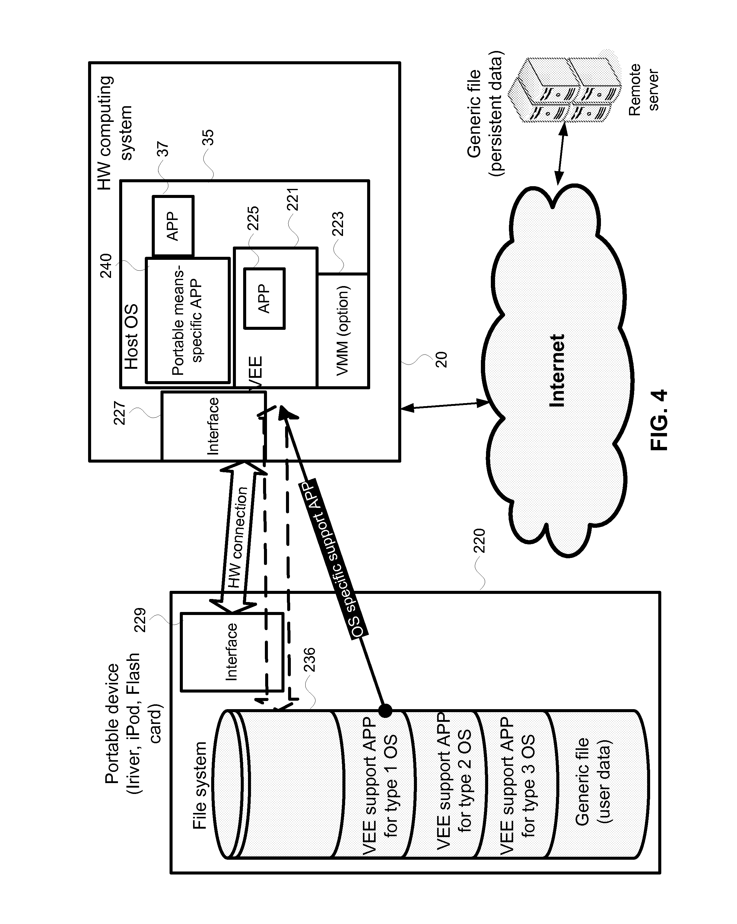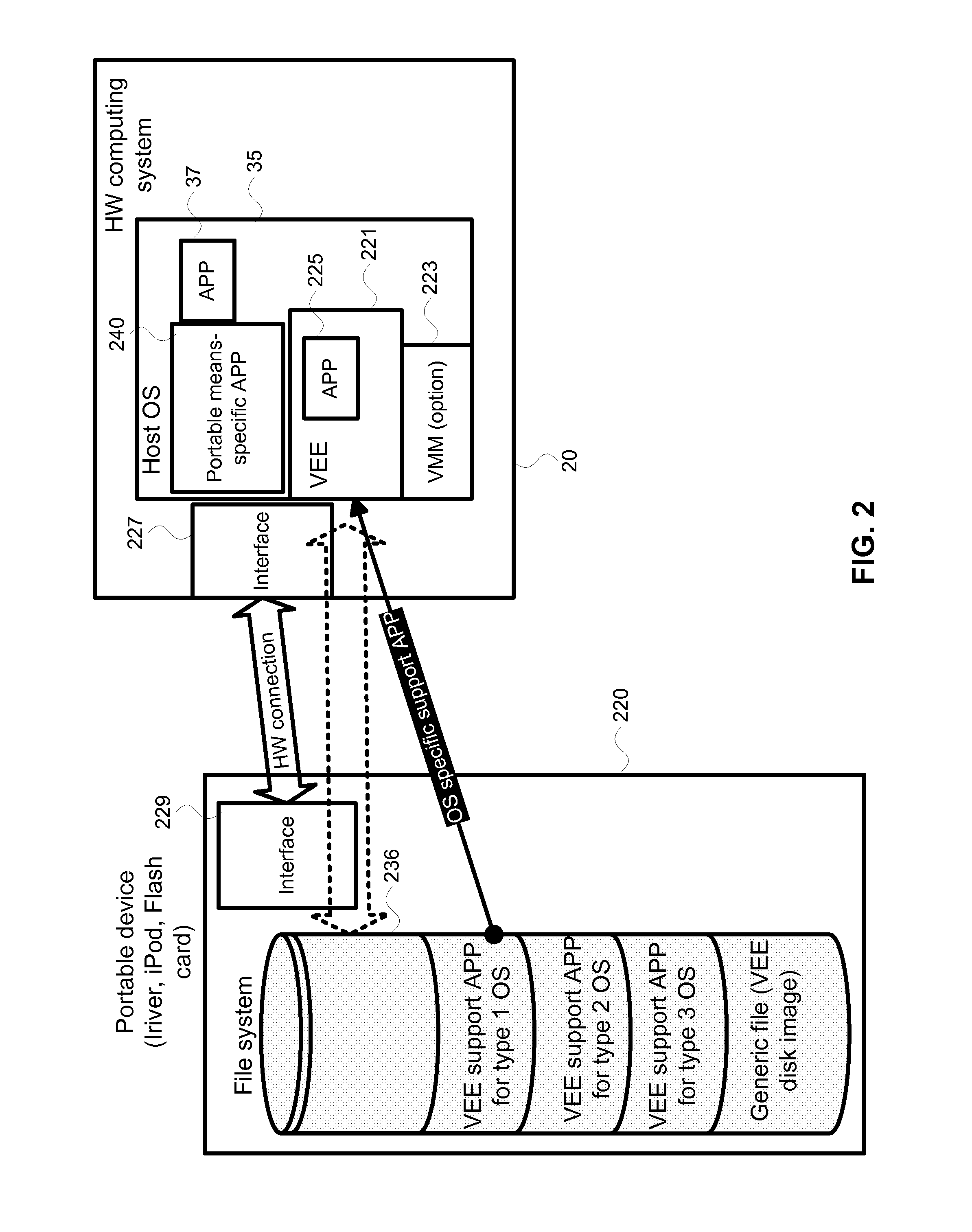 computer program code means for storing a snapshot of a Virtual Execution Environment (VEE) stored on a portable device, wherein the VEE snapshot is packed into a self-extracting file, the snapshot including register values and VEE memory state at a previous point in time, and tree structure representing VEE files; computer program code means for launching the VEE from the portable device on a computer connected to the portable device, such that the VEE is limited in any of (a) a number of VEE snapshot starts, and (b) total runtime of applications within the VEE; computer program code means for identifying an operating system of the host computer, and launching a corresponding set of drivers that correspond to the operating system; computer program code means for launching a virtual disk driver in the VEE, the virtual disk driver including redirecting capability; computer program code means for binding the VEE to local hardware of the host computer using Trusted Platform Module technology; and computer program code means for starting a user application within the VEE that available for use by a user; computer program code means for executing the user application and generating user data; and computer program code means for packing the VEE, including any generated user data and a current snapshot of the VEE, into an archive file and storing the archive file on the portable device. 30. A method for launching an application into a host OS, comprising: