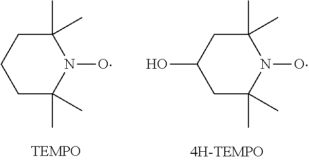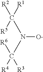 R1through R4are independently selected from a straight chained or branched, substituted or unsubstituted, alkyl or alkenyl group having a chain length sufficient to provide steric hinderance for the NO group; wherein the substituted group comprises oxygen-containing groups selected from the group consisting of hydroxyl, carbonyl, alkoxide, and carboxylic group; and