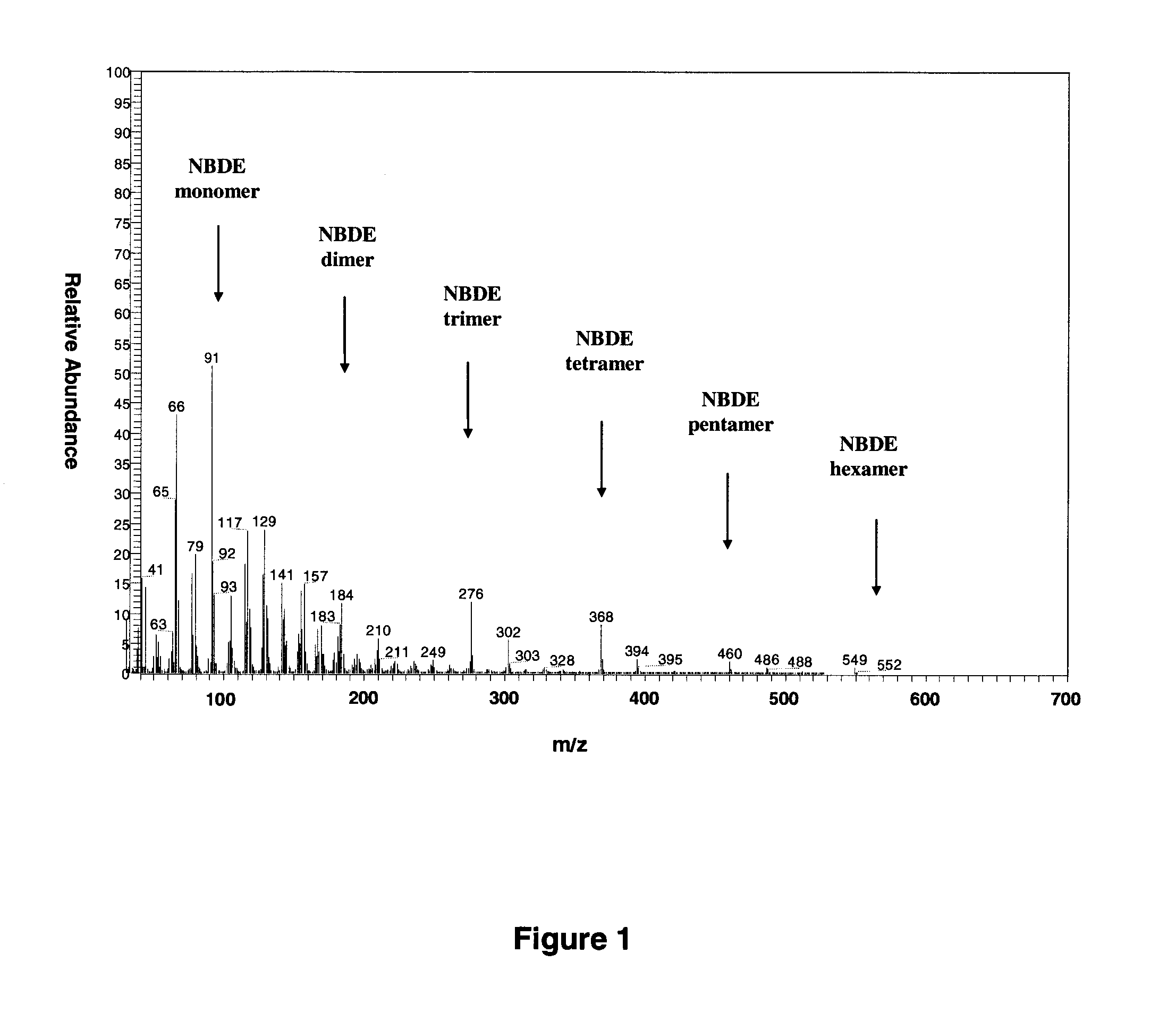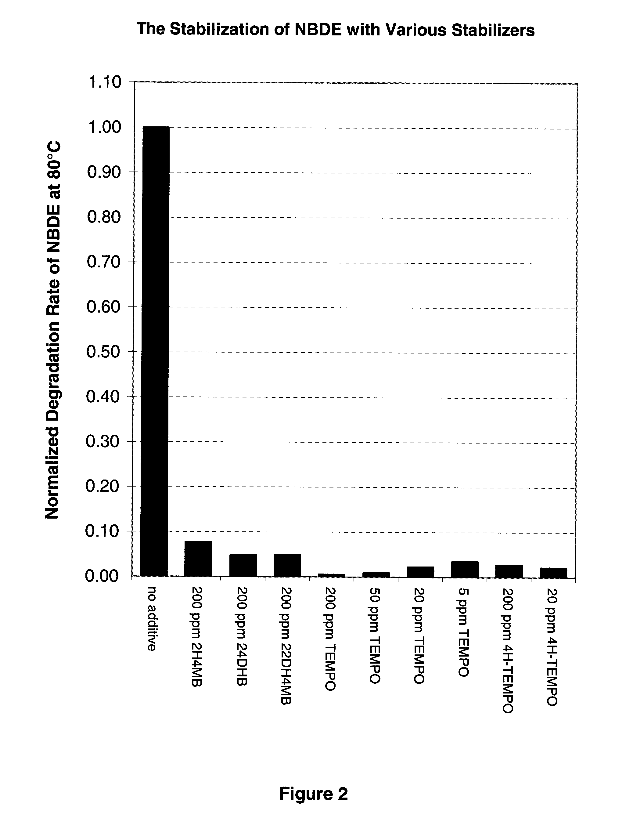 Summary of the non-volatile residue test results described in Examples 1-23. Degradation Normalized Reduction of Example Wt. of NBDE NVR (non-volatile residue) rate degradation degradation No. Stabilizer Aging Conditions (g) (g) (wt. %) avg (wt. %) (ppm/hr) rate rate (%) 1 no stabilizer none 619.32 0.59 0.10 0.05 NA NA NA 582.70 0.00 0.00 2 no stabilizer 287 days at RT 202.46 2.29 1.13 1.12 1.63 NA NA 202.15 2.24 1.11 3 no stabilizer 7 days at 80° C. 148.35 6.25 4.21 4.33 258 1.000 0.0 149.79 6.06 4.05 103.87 5.59 5.38 118.95 5.94 4.99 148.30 5.31 3.58 149.15 5.65 3.79 4 200 ppm 7 days at 80° C. 149.44 4.6 3.08 3.01 179 0.690 31.0 BHT 163.89 4.83 2.95 5 200 ppm 7 days at 80° C. 155.43 3.43 2.21 2.64 157 0.609 39.1 TBC 154.63 4.75 3.07 6 200 ppm 7 days at 80° C. 174.10 1.51 0.87 0.97 57 0.223 77.7 TBC with O2 164.59 1.75 1.06 7 200 ppm 7 days at 80° C. 154.95 1.14 0.74 0.79 47 0.183 81.7 MHQ 146.14 1.24 0.85 8 200 ppm 7 days at 80° C. 152.93 0.52 0.34 0.39 23 0.089 91.1 MHQ with O2 145.57 0.63 0.43 9 200 ppm 7 days at 80° C. 106.26 1.00 0.94 0.90 53 0.207 79.3 HQMME 114.82 0.98 0.85 10 50 ppm 7 days at 80° C. 110.75 1.20 1.08 1.42 84 0.327 67.3 HQMME 130.23 2.28 1.75 11 500 ppm 7 days at 80° C. 209.14 3.62 1.73 1.73 103 0.399 60.1 HQMME 12 200 ppm 7 days at 80° C. 147.78 0.59 0.40 0.33 20 0.077 92.3 2H4MB 154.91 0.41 0.26 13 200 ppm 7 days at 80° C. 149.14 0.32 0.21 0.21 12 0.048 95.2 24DHB 145.25 0.29 0.20 14 200 ppm 7 days at 80° C. 152.00 0.31 0.20 0.21 13 0.049 95.1 22DH4MB 165.88 0.37 0.22 15 200 ppm 7 days at 80° C. 140.51 0.04 0.03 0.02 1 0.006 99.4 TEMPO 148.59 0.03 0.02 16 50 ppm 7 days at 80° C. 143.38 0.08 0.06 0.04 3 0.010 99.0 TEMPO 139.63 0.04 0.03 17 20 ppm 7 days at 80° C. 130.45 0.17 0.13 0.10 6 0.023 97.7 TEMPO 144.58 0.10 0.07 18 5 ppm 6 days at 80° C. 68.82 0.09 0.13 0.13 9 0.035 96.5 TEMPO 19 200 ppm 6 days at 80° C. 137.56 0.12 0.09 0.10 7 0.028 97.2 4H-TEMPO 116.36 0.14 0.12 20 20 ppm 6 days at 80° C. 130.98 0.15 0.11 0.08 6 0.022 97.8 4H-TEMPO 102.25 0.05 0.05 21 200 ppm 7 days at 60° C. 130.38 0.03 0.02 0.02 1 0.005 99.5 TEMPO 172.71 0.03 0.02 22 50 ppm 7 days at 60° C. 147.10 0.12 0.08 0.06 3 0.013 98.7 TEMPO 155.90 0.05 0.03 23 20 ppm 7 days at 60° C. 154.92 0.03 0.02 0.03 2 0.007 99.3 TEMPO 167.67 0.07 0.04 Summary of the non-volatile residue test results from the forced precipitation experiments described in Examples 25-29. Wt. of Wt. of Degradation Normalized Reduction of Example Ageing NBDE DEMS NVR (non-volatile residue) rate degradation degradation No. Stabilizer Conditions (g) added (g) (g) (wt. %) avg (wt. %) (ppm/hr) rate rate (%) 25 none 7 days at 87.64 87.64 1.04 1.19 1.00 59 1.00 0.00 80° C. 90.23 90.23 0.73 0.81 26 200 ppm 7 days at 98.77 98.77 0.17 0.17 0.18 11 0.18 0.82 HQMME 80° C. 71.93 71.93 0.14 0.19 27 200 ppm 7 days at 94.77 94.77 0.10 0.10 0.06 4 0.06 0.94 MHQ 80° C. 110.56 110.56 0.03 0.03 28 200 ppm 7 days at 111.53 111.53 0.51 0.46 0.53 32 0.54 0.46 22DH4MB 80° C. 106.22 106.22 0.65 0.61 29 200 ppm 7 days at 94.77 94.77 0.11 0.12 0.10 6 0.10 0.90 TEMPO 80° C. 110.56 110.56 0.10 0.09