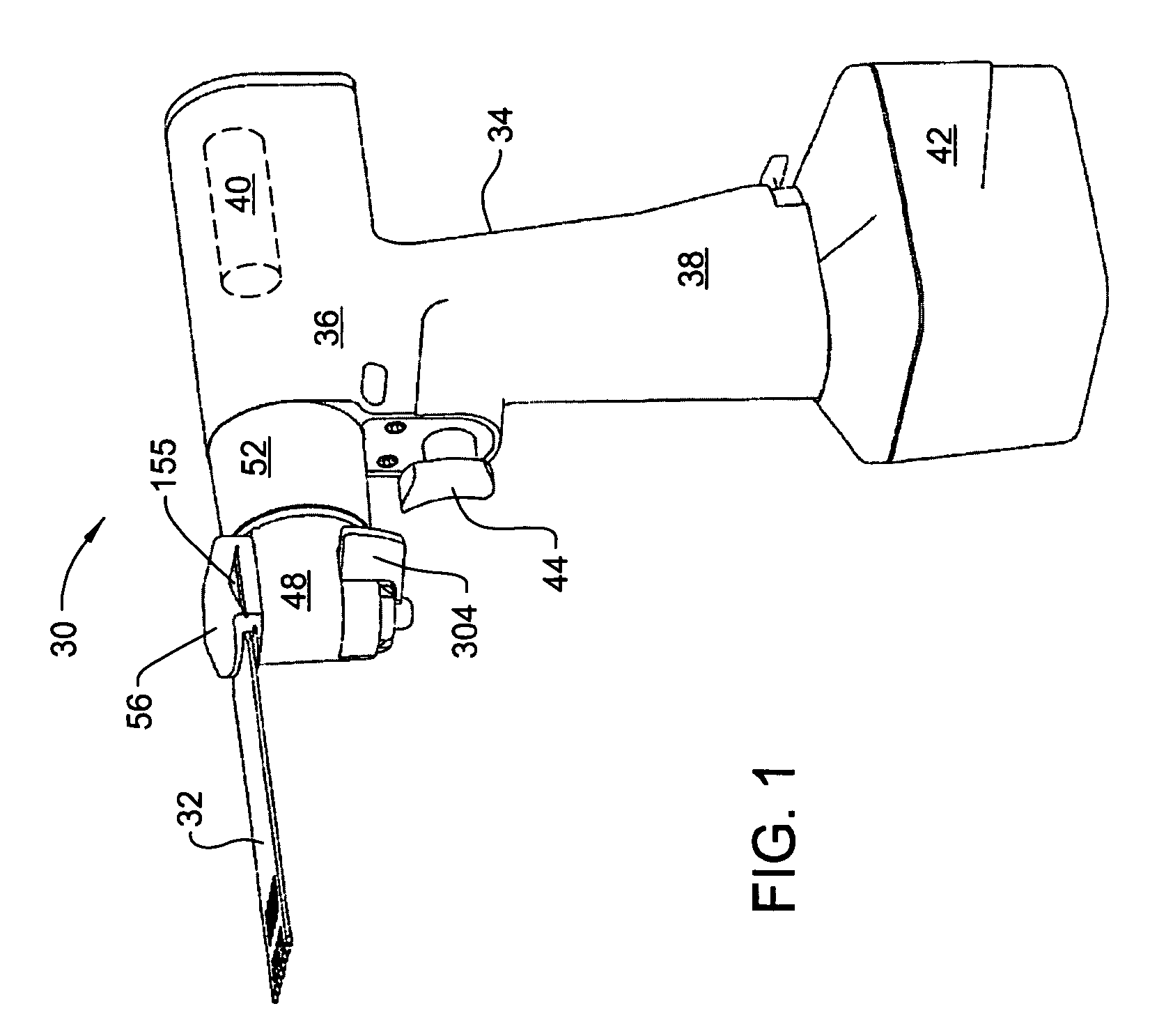 Forward of the section of the indexing link 214 that defines opening 220, the link has a proximally extending tab 222. Tab 222 has a rectangular cross section and a width less than that of the adjacent section of the link in which opening 220 is formed. Tab 222 is the most proximal portion of the indexing link 214. The tab 222 is provided to facilitate disassembly of the saw 30. When saw 30 is assembled, the indexing link 214 extends through sagittal neck bore 98 into the proximal end bore 116 of the sagittal head 48.