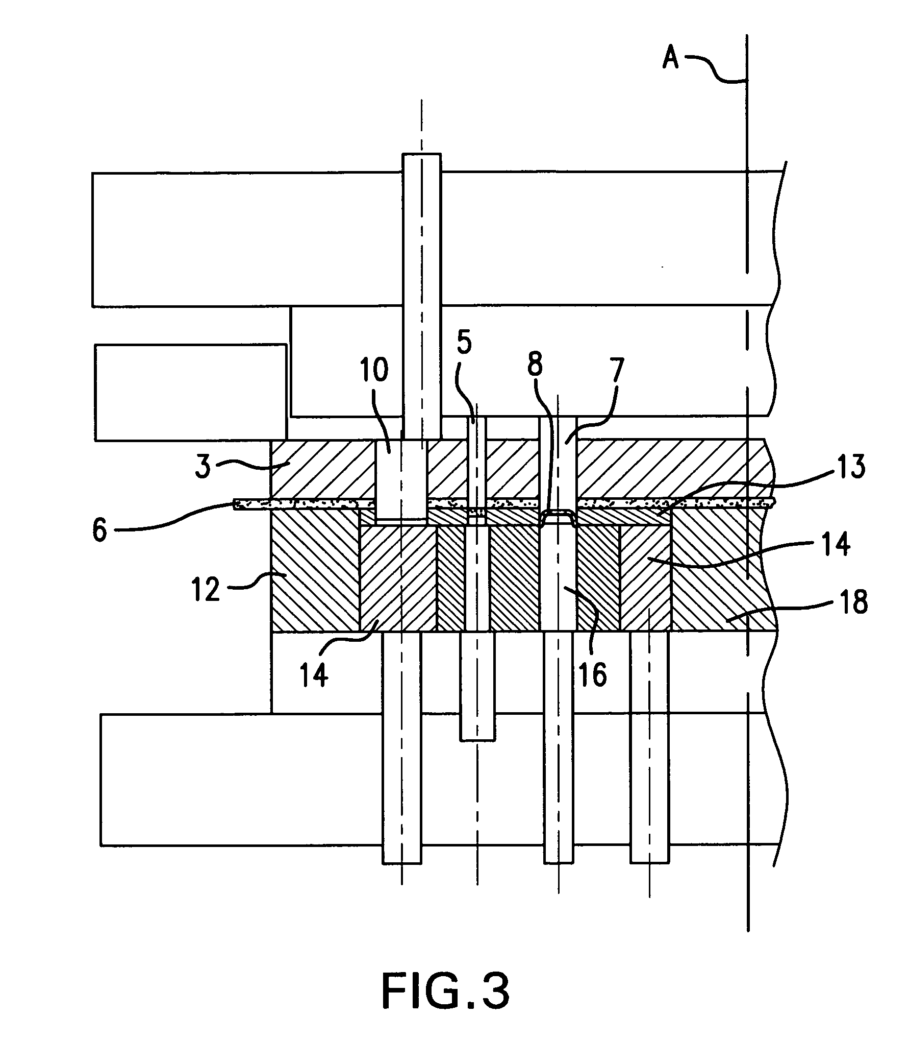 clamping the flat strip between said upper pressure plate defining said V-shaped projections thereon and said lower part by closing the upper and lower parts during machining thereof; moving the flat strip on, step by step, in a feeding direction in an open state of said upper and lower parts; receiving and clamping or storing a cut out workpiece and/or blank in a cutting opening of the cutting die and lifting the cutting die with the workpiece remaining in the cutting opening over the effective elements of the lower part; and rotatably moving the cutting die, by an amount which coincides with a distance of respective ones of the upper and lower part effective elements from each other, step by step, so that the workpiece is fed to the effective elements of the upper part, wherein during every turning step, the effective elements of the upper part and the effective elements of the lower part are registered with and closed with respect to each other so as to form a pair of effective elements of a respective one of the machining stages. 13. A method according to 14. A method according to cutting out the blank into a process opening of the cutting die, said blank remaining in the process opening with upper and lower parts closed following lift of the cutting die over the effective elements of the lower part and stepwise turning of a respective one of the process opening of the cutting die to a next following machining stage with upper and lower parts open; lining up and fixing of the effective elements during closing of the upper and lower parts and carrying out a next forming operation; carrying out said cutting and lining up again, wherein said cutting and lining up are repeated until machining of the part is finished; and ejecting and blowing out a finished part with the upper and lower parts open, wherein the cutting die, after the lift movement, is turned until the process opening of a free machining stage is reached for carrying out a new machining cycle. 15. A method according to 16. A method according to 17. A method according to 18. A method according to