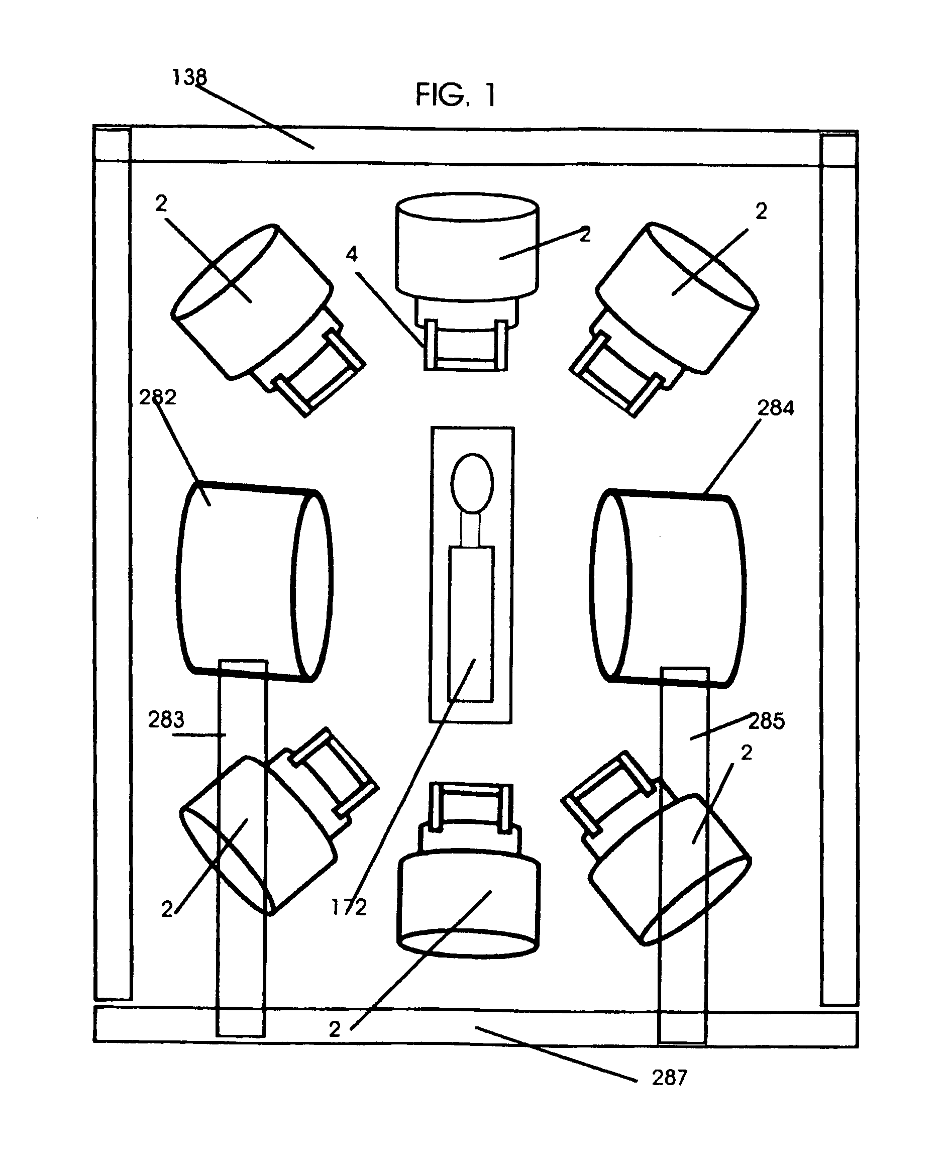 It demonstrates four pairs of opposing treatment heads 380. Each of the four treatment heads are equipped with five60Co sources 381. The other four treatment-heads are equipped for single Linac-x-ray beam 396. The treatment heads are arranged in a circle at 45° angle distance from each other. The source to D0distance in this instance is 80 cm. The60Co simultaneous parallel beams provide an array of cross firing parallel opposed beams at the isocenter 66. Four-treatment head 398 is equipped to produce Linac x-ray beams. They also converge at the isocenter 66.