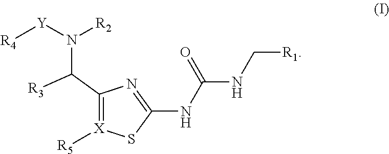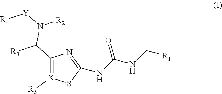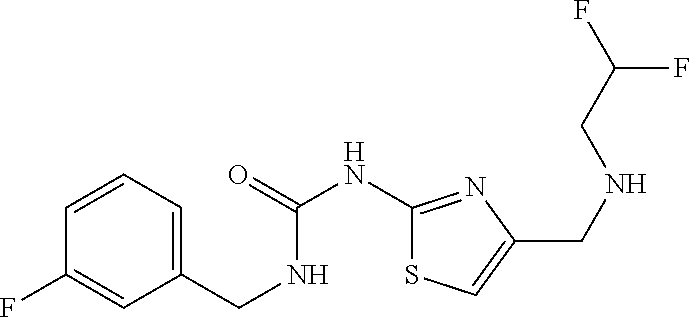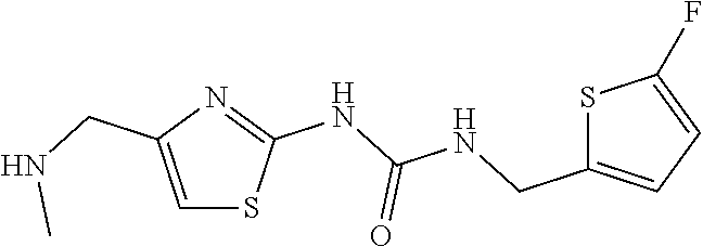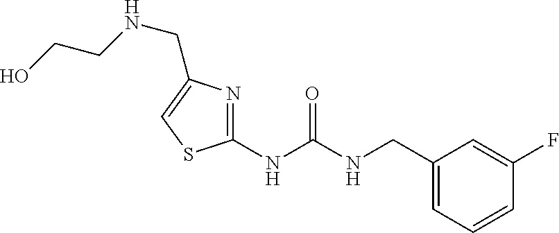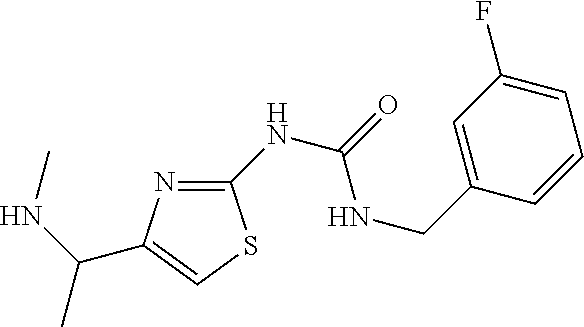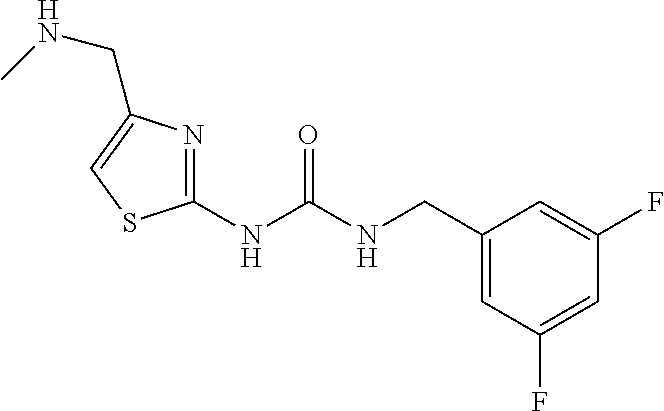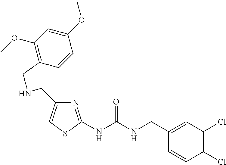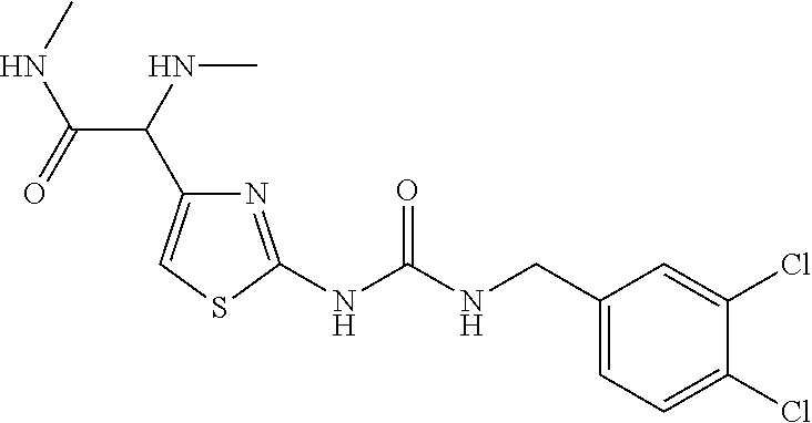 N-((2-(3-(3,4-dichlorobenzyl)ureido)thiazol-4-yl)methyl)-N-(2-methoxyethyl)acetamide; 3-(N-((2-(3-(3,4-dichlorobenzyl)ureido)thiazol-4-yl)methyl)acetamido)propylphosphonic acid; N-((2-(3-(3,4-dichlorobenzyl)ureido)thiazol-4-yl)methyl)-2-(2-methoxyethoxy)-N-methylacetamide; N-((2-(3-(3,4-dichlorobenzyl)ureido)thiazol-4-yl)methyl)-2-methoxy-N-methylacetamide; N-((2-(3-(3,4-dichlorobenzyl)ureido)thiazol-4-yl)methyl)-N,4-dimethylisoxazole-5-carboxamide; N-((2-(3-(3,4-dichlorobenzyl)ureido)thiazol-4-yl)methyl)-N-methylisoxazole-5-carboxamide; N-((2-(3-(3,4-dichlorobenzyl)ureido)thiazol-4-yl)methyl)-N-methyl-3-phenylpropanamide; N-((2-(3-(3,4-dichlorobenzyl)ureido)thiazol-4-yl)methyl)-N-methylfuran-2-carboxamide; N-((2-(3-(3,4-dichlorobenzyl)ureido)thiazol-4-yl)methyl)-N-methyl-4-phenoxybutanamide; 1-(3,4-Dichloro-benzyl)-3-{4-[3-(1,1-dioxo-tetrahydro-1,6-thiophen-3-ylmethyl)-1-methyl-ureidomethyl]-thiazol-2-yl}-urea; N-((2-(3-(3,4-dichlorobenzyl)ureido)thiazol-4-yl)methyl)-N,3,5-trimethylisoxazole-4-carboxamide; N-((2-(3-(3,4-dichlorobenzyl)ureido)thiazol-4-yl)methyl)-N,1-dimethyl-1H-imidazole-5-carboxamide; N-((2-(3-(3,4-dichlorobenzyl)ureido)thiazol-4-yl)methyl)-N-methylfuran-3-carboxamide; N-((2-(3-(3,4-dichlorobenzyl)ureido)thiazol-4-yl)methyl)-N,3-dimethylfuran-2-carboxamide; N-((2-(3-(3,4-dichlorobenzyl)ureido)thiazol-4-yl)methyl)-N,5-dimethyl-3-phenylisoxazole-4-carboxamide; N-((2-(3-(3,4-dichlorobenzyl)ureido)thiazol-4-yl)methyl)-N-ethyl-3,5-dimethylisoxazole-4-carboxamide; N-((2-(3-(3,4-dichlorobenzyl)ureido)thiazol-4-yl)methyl)-N-isopropyl-3,5-dimethylisoxazole-4-carboxamide; N-((2-(3-(3,4-dichlorobenzyl)ureido)thiazol-4-yl)methyl)-N,5-dimethyl-2-phenyl-2H-1,2,3-triazole-4-carboxamide; N-((2-(3-(3,4-dichlorobenzyl)ureido)thiazol-4-yl)methyl)-N,5-dimethylisoxazole-3-carboxamide; N-((2-(3-(3,4-dichlorobenzyl)ureido)thiazol-4-yl)methyl)-N,3-dimethyl-5-phenylisoxazole-4-carboxamide; N-((2-(3-(3,4-dichlorobenzyl)ureido)thiazol-4-yl)methyl)-N,3-dimethyl-5-(4-methyl-1,2,3-thiadiazol-5-yl)isoxazole-4-carboxamide; N-((2-(3-(3,4-dichlorobenzyl)ureido)thiazol-4-yl)methyl)-N-methyl-2-(2H-tetrazol-5-yl)acetamide; N-((2-(3-(3,4-dichlorobenzyl)ureido)thiazol-4-yl)methyl)-N-methylbenzofuran-2-carboxamide; N-(1-(2-(3-(3,4-dichlorobenzyl)ureido)thiazol-4-yl)ethyl)-N,3,5-trimethylisoxazole-4-carboxamide; N-((2-(3-(3,4-dichlorobenzyl)ureido)thiazol-4-yl)methyl)-N-methyl-1,2,5-oxadiazole-3-carboxamide; N-((2-(3-(3,4-dichlorobenzyl)ureido)thiazol-4-yl)methyl)-2-(3,5-dimethylisoxazol-4-yl)-N-methylacetamide; N-((2-(3-(3,4-dichlorobenzyl)ureido)thiazol-4-yl)methyl)-3-ethyl-N,5-dimethylisoxazole-4-carboxamide; N-((2-(3-(3,4-dichlorobenzyl)ureido)thiazol-4-yl)methyl)-N,3-dimethylisoxazole-4-carboxamide; N-((2-(3-(3,4-dichlorobenzyl)ureido)thiazol-4-yl)methyl)-N,5-dimethylisoxazole-4-carboxamide; 5-cyclopropyl-N-((2-(3-(3,4-dichlorobenzyl)ureido)thiazol-4-yl)methyl)-N-methylisoxazole-4-carboxamide; N-((2-(3-(3,4-dichlorobenzyl)ureido)thiazol-4-yl)methyl)-N,2,6-trimethylbenzamide; N-((2-(3-(3,4-dichlorobenzyl)ureido)thiazol-4-yl)methyl)-5-(furan-2-yl)-N-methylisoxazole-3-carboxamide; N-((2-(3-(3,4-dichlorobenzyl)ureido)thiazol-4-yl)methyl)-N,2,5-trimethyloxazole-4-carboxamide; N-((2-(3-(3,4-dichlorobenzyl)ureido)thiazol-4-yl)methyl)-N-methyl-2-phenylthiazole-4-carboxamide; N-((2-(3-(3,4-dichlorobenzyl)ureido)thiazol-4-yl)methyl)-N-(2,4-dimethoxybenzyl)-3,5-dimethylisoxazole-4-carboxamide; N-((2-(3-(3,4-dichlorobenzyl)ureido)thiazol-4-yl)methyl)-N-(2-methoxyethyl)-3,5-dimethylisoxazole-4-carboxamide; N-((2-(3-(3,4-dichlorobenzyl)ureido)thiazol-4-yl)methyl)-N-methyl-2-(thiophen-2-yl)thiazole-4-carboxamide; N-((2-(3-(3,4-dichlorobenzyl)ureido)thiazol-4-yl)methyl)-3-hydroxy-N-methylisoxazole-5-carboxamide; N-((2-(3-(3,4-dichlorobenzyl)ureido)thiazol-4-yl)methyl)-N-methyl-5-phenyl-1,3,4-oxadiazole-2-carboxamide; N-((2-(3-(3,4-dichlorobenzyl)ureido)thiazol-4-yl)methyl)-N,5-dimethylfuran-2-carboxamide; N-((2-(3-(3,4-dichlorobenzyl)ureido)thiazol-4-yl)methyl)-N,4-dimethyl-1,2,5-oxadiazole-3-carboxamide; 4-Methyl-2-pyrazin-2-yl-thiazole-5-carboxylic acid {2-[3-(3,4-dichlorobenzyl)ureido]-thiazol-4-ylmethyl}-methyl-amide; N-((2-(3-(3,4-dichlorobenzyl)ureido)thiazol-4-yl)methyl)-2,4-dimethoxy-N-methylbenzamide; N-((2-(3-(3,4-dichlorobenzyl)ureido)thiazol-4-yl)methyl)-4-methoxy-N-methylbenzamide; N-((2-(3-(3,4-dichlorobenzyl)ureido)thiazol-4-yl)methyl)-3,4-dimethoxy-N-methylbenzamide; N-((2-(3-(3,4-dichlorobenzyl)ureido)thiazol-4-yl)methyl)-N-methylbenzo[1,3]dioxole-5-carboxamide; N-((2-(3-(3,4-dichlorobenzyl)ureido)thiazol-4-yl)methyl)-3,4,5-trimethoxy-N-methylbenzamide; N-((2-(3-(3,4-dichlorobenzyl)ureido)thiazol-4-yl)methyl)-N,5-dimethyl-3-(trifluoromethyl)isoxazole-4-carboxamide; N-((2-(3-(3,4-dichlorobenzyl)ureido)thiazol-4-yl)methyl)-N-methyl-2-(pyridin-3-yl)acetamide; N-(1-(2-(3-(3,4-dichlorobenzyl)ureido)thiazol-4-yl)-2-(methylamino)-2-oxoethyl)-N,3,5-trimethylisoxazole-4-carboxamide; N-((2-(3-(3,4-dichlorobenzyl)ureido)thiazol-4-yl)methyl)-N,2,4-trimethylnicotinamide; N-((2-(3-(3,4-dichlorobenzyl)ureido)thiazol-4-yl)methyl)-N,2,4,6-tetramethylbenzamide; N-((2-(3-(3,4-dichlorobenzyl)ureido)thiazol-4-yl)methyl)-N-(2-hydroxyethyl)-3,5-dimethylisoxazole-4-carboxamide; N-((2-(3-(3-fluorobenzyl)ureido)thiazol-4-yl)methyl)-N,3,5-trimethylisoxazole-4-carboxamide; N-((2-(3-(3-fluorobenzyl)ureido)thiazol-4-yl)methyl)-5-(methoxymethyl)-N,3-dimethylisoxazole-4-carb oxamide; N-((2-(3-(3,4-dichlorobenzyl)ureido)thiazol-4-yl)methyl)-5-(methoxymethyl)-N,3-dimethylisoxazole-4-carboxamide; N-((2-(3-(3-fluorobenzyl)ureido)thiazol-4-yl)methyl)-2-methoxy-N-methylacetamide; methyl 2-(((2-(3-(3-fluorobenzyl)ureido)thiazol-4-yl)methyl)(methyl)amino)-2-oxoacetate; N-((2-(3-(3-fluorobenzyl)ureido)thiazol-4-yl)methyl)-N,3-dimethylisoxazole-4-carboxamide; 3-ethyl-N-((2-(3-(3-fluorobenzyl)ureido)thiazol-4-yl)methyl)-N,5-dimethylisoxazole-4-carboxamide; N-((2-(3-(3-fluorobenzyl)ureido)thiazol-4-yl)methyl)-N,2,4-trimethylnicotinamide; N-((2-(3