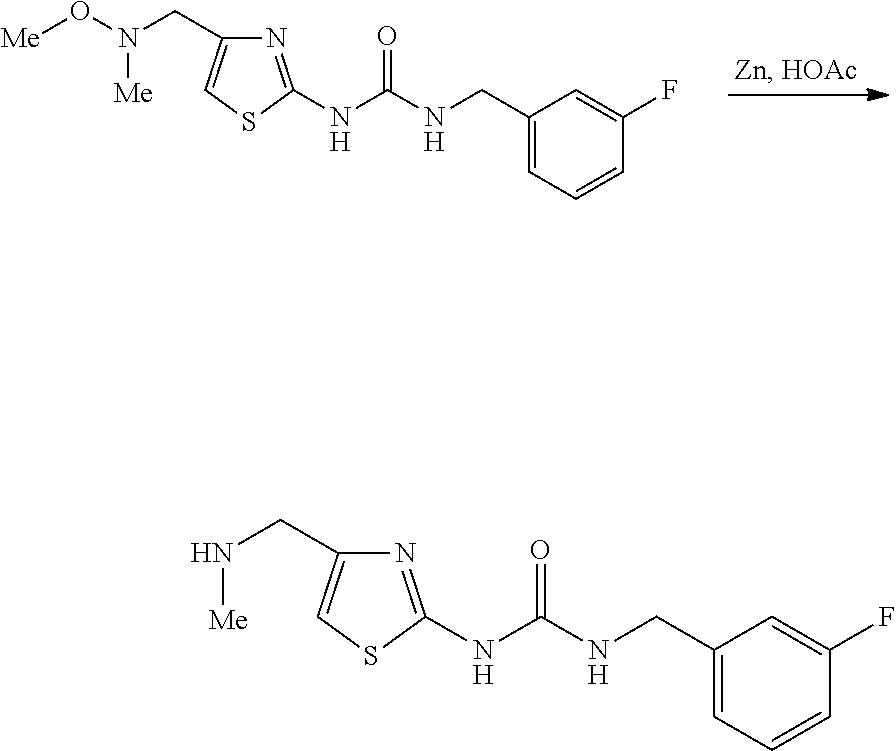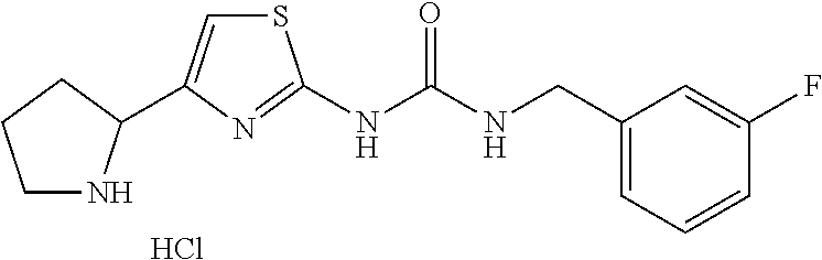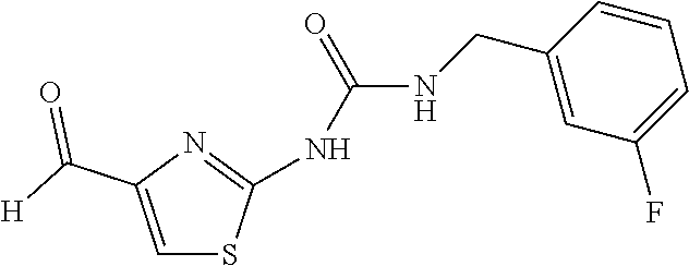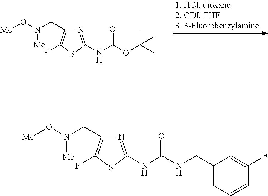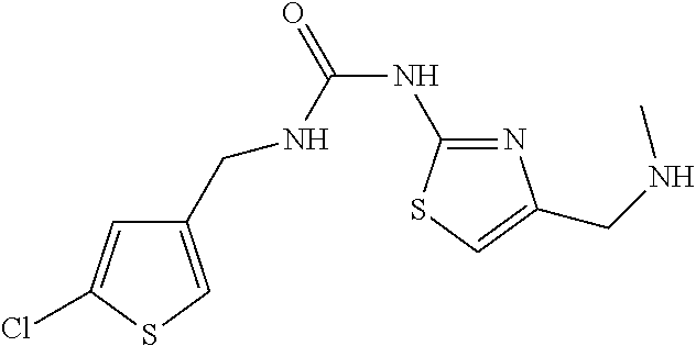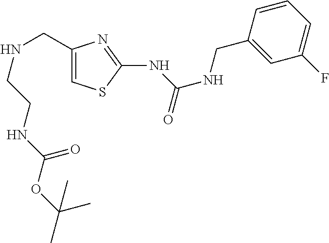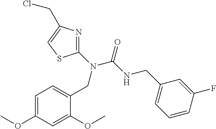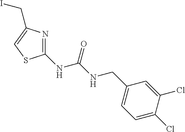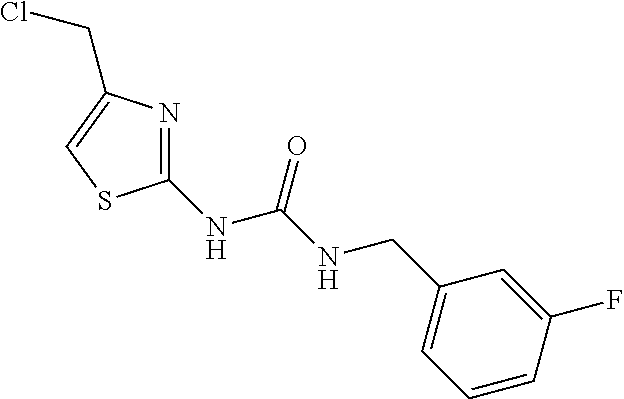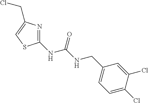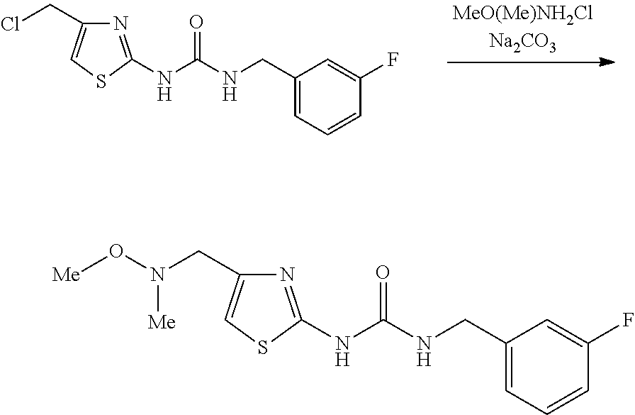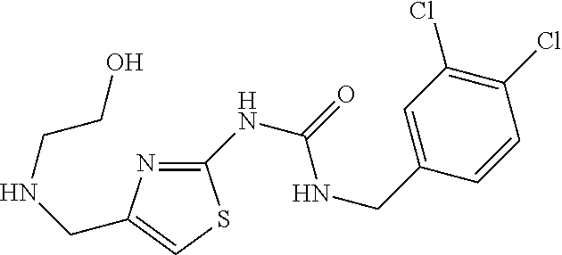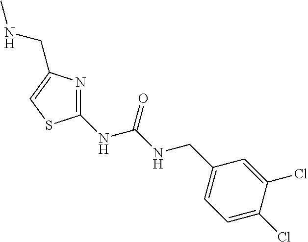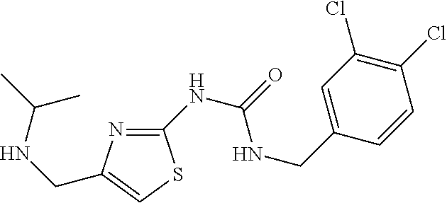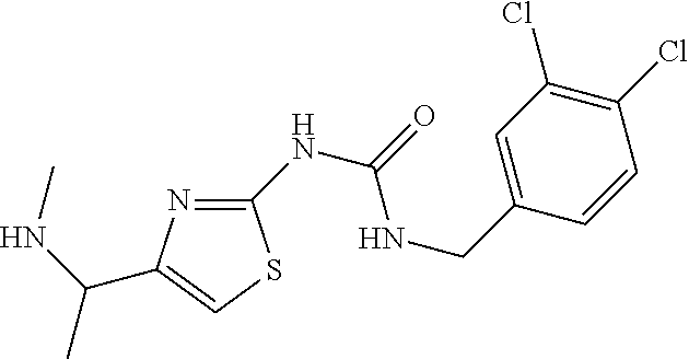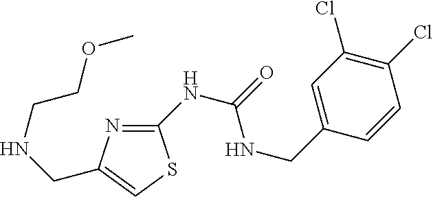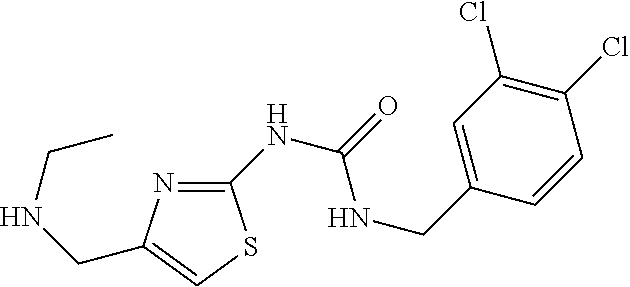 Preparation of Thiazolyl Amides EX # NAME MOL FORMULA MOL WEIGHT MASS METHOD Starting Material 1 (SM1) Starting Material 2 (SM2) 1 N-((2-(3-(3,4-dichlorobenzyl) C17H20Cl2N4O3S 431.3 431, 3 Int. 12 Acetyl chloride ureido)thiazol-4-yl)methyl)-N- 433 (2-methoxyethyl)acetamide 2 3-(N-((2-(3-(3,4-dichlorobenzyl)ureido) C17H21Cl2N4O5PS 495.3 495, 3 Int. 23 Acetyl chloride thiazol-4-yl)methyl) acetamido) propylphosphonic acid 497 3 N-((2-(3-(3,4-dichlorobenzyl) C18H22Cl2N4O4S 461.4 461, 3 Int. 3 2-(2-Methoxyethoxy)acetyl chloride ureido)thiazol-4-yl)methyl)-2- 463 (2-methoxyethoxy)-N-methylacetamide 4 N-((2-(3-(3,4-dichlorobenzyl) C16H18Cl2N4O3S 417.3 417, 3 Int. 3 2-Methoxyacetyl chloride ureido)thiazol-4-yl)methyl)-2- 419 methoxy-N-methylacetamide 5 N-((2-(3-(3,4-dichlorobenzyl) C18H17Cl2N5O3S 454.3 454, 3 Int. 3 4-Methyl-isoxazole-5- ureido)thiazol-4-yl)methyl)- 456 carboxylic acid chloride N,4-dimethylisoxazole-5-carboxamide 6 N-((2-(3-(3,4-dichlorobenzyl) C17H15Cl2N5O3S 440.3 440, 3 Int. 3 Isoxazole-5-carboxylic acid ureido)thiazol-4-yl)methyl)-N- 442 chloride methylisoxazole-5-carboxamide 7 N-((2-(3-(3,4-dichlorobenzyl) C22H22Cl2N4O2S 477.4 477, 3 Int. 3 3-Phenylpropionyl chloride ureido)thiazol-4-yl)methyl)-N- 479 methyl-3-phenylpropanamide 8 N-((2-(3-(3,4-dichlorobenzyl) C18H16Cl2N4O3S 439.3 439, 3 Int. 3 2-Furoyl chloride ureido)thiazol-4-yl)methyl)-N- 441 methylfuran-2-carboxamide 9 N-((2-(3-(3,4-dichlorobenzyl) C23H24Cl2N4O3S 507.4 507, 3 Int. 3 4-Phenoxy-butyryl chloride ureido)thiazol-4-yl)methyl)-N- 509 methyl-4-phenoxybutanamide 10 1-(3,4-Dichloro-benzyl)-3-{4- C19H23Cl2N5O4S2 520.5 520, 3 Int. 3 N-(1,1-Dioxo-tetrahydrothiophen-3-yl- [3-(1,1-dioxo-tetrahydro-1l6- 522 methyl)carbamoyl chloride thiophen-3-ylmethyl)-1- methyl-ureidomethyl]-thiazol-2-yl}-urea 11 N-((2-(3-(3,4-dichlorobenzyl) C19H19Cl2N5O3S 468.4 468, 3 Int. 3 3,5-Dimethyl-isoxazole-4- ureido)thiazol-4-yl)methyl)- 470 carboxylic acid chloride N,3,5-trimethylisoxazole-4-carboxamide 12 N-((2-(3-(3,4-dichlorobenzyl) C18H18Cl2N6O2S 453.4 453, 3 Int. 3 1-Methyl-imidazole-5- ureido)thiazol-4-yl)methyl)- 455 carboxylic acid chloride N,1-dimethyl-1H-imidazole-5-carboxamide 13 N-((2-(3-(3,4-dichlorobenzyl) C18H16Cl2N4O3S 439.3 439, 3 Int. 3 3-Furoyl chloride ureido)thiazol-4-yl)methyl)-N- 441 methylfuran-3-carboxamide 14 N-((2-(3-(3,4-dichlorobenzyl) C19H18Cl2N4O3S 453.3 453, 3 Int. 3 3-Methyl-2-furoyl chloride ureido)thiazol-4-yl)methyl)- 455 N,3-dimethylfuran-2-carboxamide 15 N-((2-(3-(3,4-dichlorobenzyl) C24H21Cl2N5O3S 530.4 530, 3 Int. 3 5-Methyl-3-phenyl-isoxazole- ureido)thiazol-4-yl)methyl)- 532 4-carboxylic acid chloride N,5-dimethyl-3-phenylisoxazole-4-carboxamide 16 N-((2-(3-(3,4-dichlorobenzyl) C20H21Cl2N5O3S 482.4 482, 3 Int. 8 3,5-Dimethyl-isoxazole-4-carboxylic acid ureido)thiazol-4-yl)methyl)-N- 484 chloride ethyl-3,5-dimethylisoxazole-4-carboxamide 17 N-((2-(3-(3,4-dichlorobenzyl) C21H23Cl2N5O3S 496.4 496, 3 Int. 9 3,5-Dimethyl-isoxazole-4- ureido)thiazol-4-yl)methyl)-N-isopropyl-3,5- 498 carboxylic acid chloride dimethylisoxazole-4-carboxamide 18 N-((2-(3-(3,4-dichlorobenzyl) C23H21Cl2N7O2S 530.4 530, 3 Int. 3 5-Methyl-2-phenyl-2H-1,2,3- ureido)thiazol-4-yl)methyl)- 532 triazole-4-carboxylic acid N,5-dimethyl-2-phenyl-2H- chloride 1,2,3-triazole-4-carboxamide 19 N-((2-(3-(3,4- C18H17Cl2N5O3S 454.3 454, 3 Int. 3 5-Methylisoxazole-3-carboxylic acid dichlorobenzyl)ureido)thiazol-4-yl)methyl)- 456 chloride N,5-dimethylisoxazole-3-carboxamide 20 N-((2-(3-(3,4-dichlorobenzyl) C24H21Cl2N5O3S 530.4 530, 3 Int. 3 3-Methyl-5-phenylisoxazole- ureido)thiazol-4-yl)methyl)- 532 4-carboxylic acid chloride N,3-dimethyl-5-phenylisoxazole-4-carboxamide 21 N-((2-(3-(3,4-dichlorobenzyl) C21H19Cl2N7O3S2 552.5 552, 3 Int. 3 3-Methyl-5-(4-methyl-1,2,3- ureido)thiazol-4-yl)methyl)- 554 thiadiazol-5-yl)isoxazole-4- N,3-dimethyl-5-(4-methyl- carboxylic acid chloride 1,2,3-thiadiazol-5-yl)isoxazole-4-carboxamide 22 N-((2-(3-(3,4-dichlorobenzyl) C16H16Cl2N8O2S 455.3 455/457 2 Int. 3 2-(2H-Tetrazol-5-yl)acetic ureido)thiazol-4-yl)methyl)-N- acid methyl-2-(2H-tetrazol-5-yl)acetamide 23 N-((2-(3-(3,4-dichlorobenzyl) C22H18Cl2N4O3S 489.4 489, 3 Int. 3 Benzofuran-2-carboxylic acid ureido)thiazol-4-yl)methyl)-N- 491 chloride methylbenzofuran-2-carboxamide 24 N-(1-(2-(3-(3,4- C20H21Cl2N5O3S 482.4 482/484 3 Int. 10a 3,5-Dimethyl-isoxazole-4- dichlorobenzyl) carboxylic acid chloride ureido)thiazol-4-yl)ethyl)- N,3,5-trimethylisoxazole-4-carboxamide 25 N-((2-(3-(3,4-dichlorobenzyl) C16H14Cl2N6O3S 441.3 441/443 2 Int. 3 1,2,5-Oxadiazole-3-carboxylic ureido)thiazol-4-yl)methyl)-N- acid chloride methyl-1,2,5-oxadiazole-3-carboxamide 26 N-((2-(3-(3,4-dichlorobenzyl) C20H21Cl2N5O3S 482.4 482, 2 Int. 3 2-(3,5-Dimethylisoxazol-4- ureido)thiazol-4-yl)methyl)-2- 484 yl)acetic acid (3,5-dimethylisoxazol-4-yl)-N-methylacetamide 27 N-((2-(3-(3,4-dichlorobenzyl) C20H21Cl2N5O3S 482.4 482, 2 Int. 3 3-Ethyl-5-methylisoxazole-4- ureido)thiazol-4-yl)methyl)-3- 484 carboxylic acid ethyl-N,5-dimethylisoxazole-4-carboxamide 28 N-((2-(3-(3,4-dichlorobenzyl) C18H17Cl2N5O3S 454.3 454, 2 Int. 3 3-Methylisoxazole-4- ureido)thiazol-4-yl)methyl)- 456 carboxylic acid N,3-dimethylisoxazole-4-carboxamide 29 N-((2-(3-(3,4-dichlorobenzyl) C18H17Cl2N5O3S 454.3 454, 2 Int. 3 5-Methylisoxazole-4- ureido)thiazol-4-yl)methyl)- 456 carboxylic acid chloride N,5-dimethylisoxazole-4-carboxamide 30 5-cyclopropyl-N-((2-(3-(3,4- C20H19Cl2N5O3S 480.4 480, 2 Int. 3 5-Cyclopropylisoxazole-4- dichlorobenzyl)ureido)thiazol- 482 carboxylic acid 4-yl)methyl)-N-methylisoxazole-4-carboxamide 31 N-((2-(3-(3,4-dichlorobenzyl) C22H22Cl2N4O2S 477.4 477, 3 Int. 3 2,6-Dimethylbenzoyl chloride ureido)thiazol-4-yl)methyl)- 479 N,2,6-trimethylbenzamide 32 N-((2-(3-(3,4-dichlorobenzyl) C21H17Cl2N5O4S 506.4 506, 3 Int. 3 5-(Furan-2-yl)isoxazole-3- ureido)thiazol-4-yl)methyl)-5- 508 carboxylic acid chloride (furan-2-yl)-N-methylisoxazole-3-carboxamide 33 N-((2-(3-(3,4-dichlorobenzyl) C19H19Cl2N5O3S 468.4 468, 3 