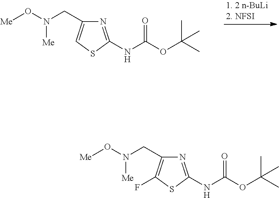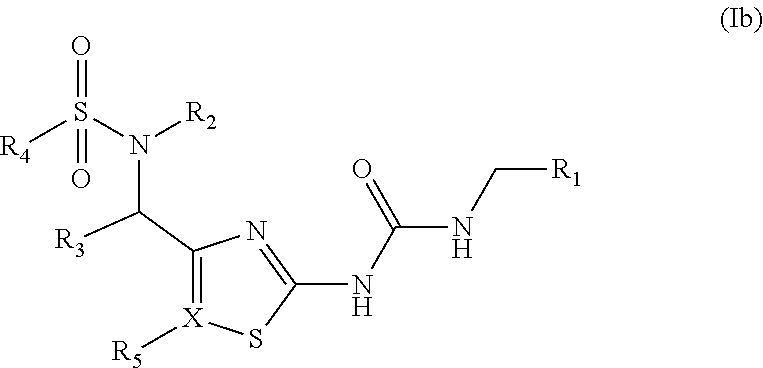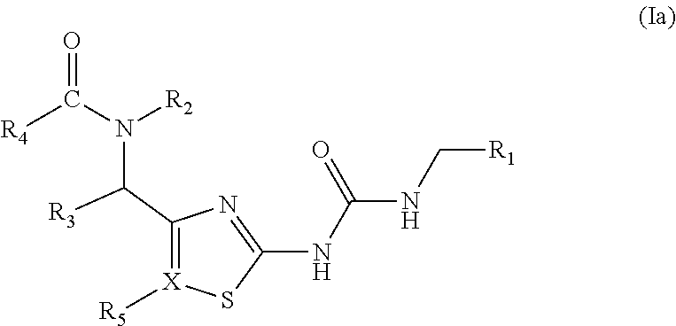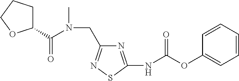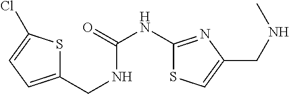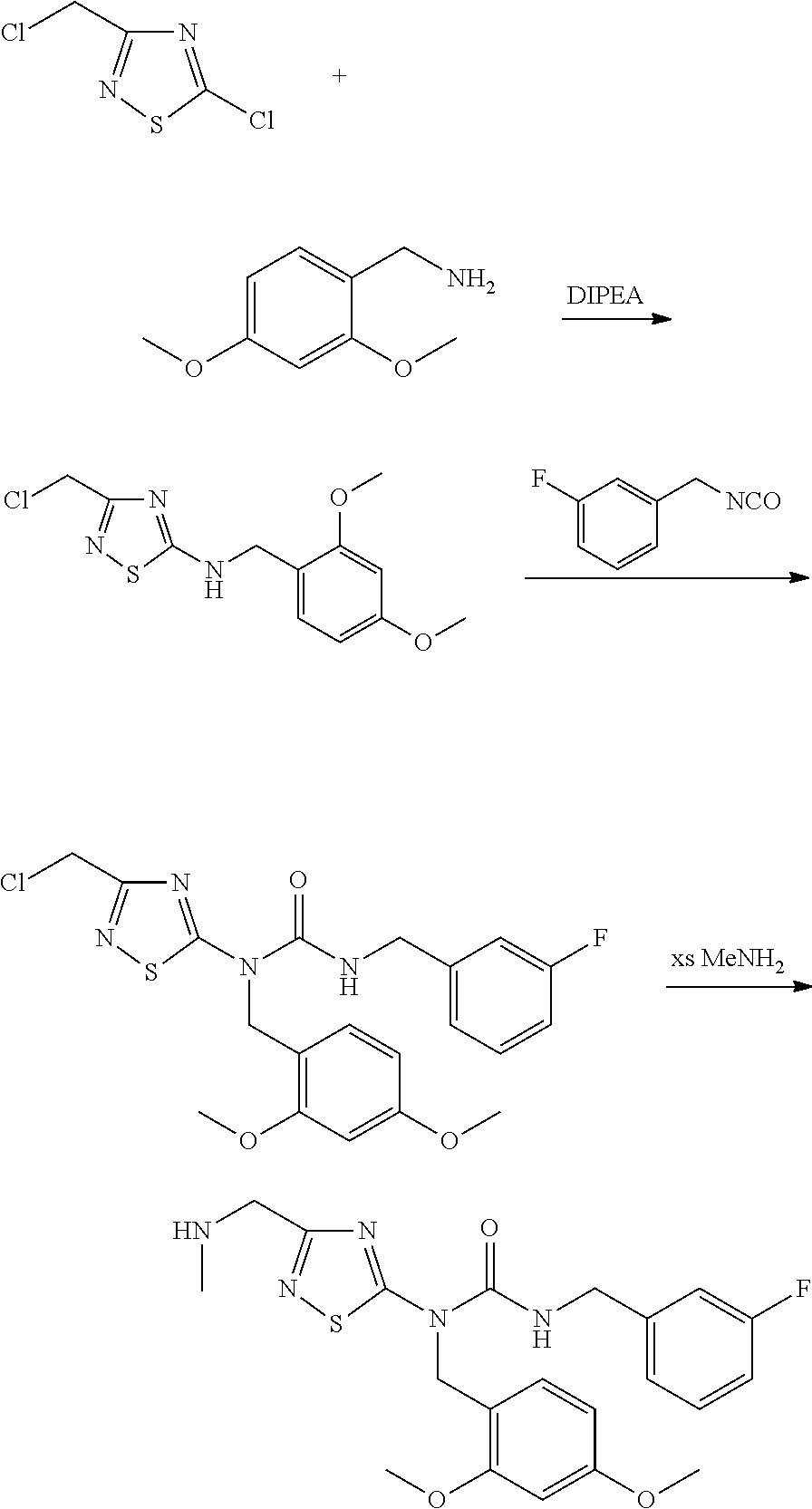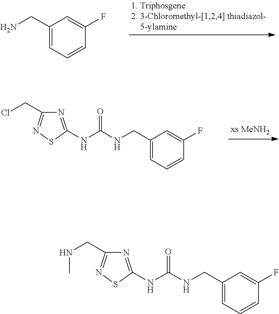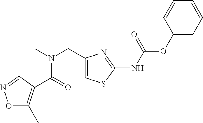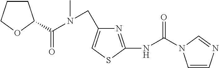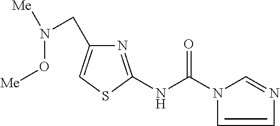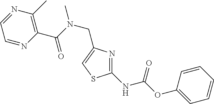 Preparation of Thiazolyl Amides EX # NAME MOL FORMULA MOL WEIGHT MASS METHOD Starting Material 1 (SM1) Starting Material 2 (SM2) 1 N-((2-(3-(3,4-dichlorobenzyl) C17H20Cl2N4O3S 431.3 431, 3 Int. 12 Acetyl chloride ureido)thiazol-4-yl)methyl)-N- 433 (2-methoxyethyl)acetamide 2 3-(N-((2-(3-(3,4-dichlorobenzyl)ureido) C17H21Cl2N4O5PS 495.3 495, 3 Int. 23 Acetyl chloride thiazol-4-yl)methyl) acetamido) propylphosphonic acid 497 3 N-((2-(3-(3,4-dichlorobenzyl) C18H22Cl2N4O4S 461.4 461, 3 Int. 3 2-(2-Methoxyethoxy)acetyl chloride ureido)thiazol-4-yl)methyl)-2- 463 (2-methoxyethoxy)-N-methylacetamide 4 N-((2-(3-(3,4-dichlorobenzyl) C16H18Cl2N4O3S 417.3 417, 3 Int. 3 2-Methoxyacetyl chloride ureido)thiazol-4-yl)methyl)-2- 419 methoxy-N-methylacetamide 5 N-((2-(3-(3,4-dichlorobenzyl) C18H17Cl2N5O3S 454.3 454, 3 Int. 3 4-Methyl-isoxazole-5- ureido)thiazol-4-yl)methyl)- 456 carboxylic acid chloride N,4-dimethylisoxazole-5-carboxamide 6 N-((2-(3-(3,4-dichlorobenzyl) C17H15Cl2N5O3S 440.3 440, 3 Int. 3 Isoxazole-5-carboxylic acid ureido)thiazol-4-yl)methyl)-N- 442 chloride methylisoxazole-5-carboxamide 7 N-((2-(3-(3,4-dichlorobenzyl) C22H22Cl2N4O2S 477.4 477, 3 Int. 3 3-Phenylpropionyl chloride ureido)thiazol-4-yl)methyl)-N- 479 methyl-3-phenylpropanamide 8 N-((2-(3-(3,4-dichlorobenzyl) C18H16Cl2N4O3S 439.3 439, 3 Int. 3 2-Furoyl chloride ureido)thiazol-4-yl)methyl)-N- 441 methylfuran-2-carboxamide 9 N-((2-(3-(3,4-dichlorobenzyl) C23H24Cl2N4O3S 507.4 507, 3 Int. 3 4-Phenoxy-butyryl chloride ureido)thiazol-4-yl)methyl)-N- 509 methyl-4-phenoxybutanamide 10 1-(3,4-Dichloro-benzyl)-3-{4- C19H23Cl2N5O4S2 520.5 520, 3 Int. 3 N-(1,1-Dioxo-tetrahydrothiophen-3-yl- [3-(1,1-dioxo-tetrahydro-1l6- 522 methyl)carbamoyl chloride thiophen-3-ylmethyl)-1- methyl-ureidomethyl]-thiazol-2-yl}-urea 11 N-((2-(3-(3,4-dichlorobenzyl) C19H19Cl2N5O3S 468.4 468, 3 Int. 3 3,5-Dimethyl-isoxazole-4- ureido)thiazol-4-yl)methyl)- 470 carboxylic acid chloride N,3,5-trimethylisoxazole-4-carboxamide 12 N-((2-(3-(3,4-dichlorobenzyl) C18H18Cl2N6O2S 453.4 453, 3 Int. 3 1-Methyl-imidazole-5- ureido)thiazol-4-yl)methyl)- 455 carboxylic acid chloride N,1-dimethyl-1H-imidazole-5-carboxamide 13 N-((2-(3-(3,4-dichlorobenzyl) C18H16Cl2N4O3S 439.3 439, 3 Int. 3 3-Furoyl chloride ureido)thiazol-4-yl)methyl)-N- 441 methylfuran-3-carboxamide 14 N-((2-(3-(3,4-dichlorobenzyl) C19H18Cl2N4O3S 453.3 453, 3 Int. 3 3-Methyl-2-furoyl chloride ureido)thiazol-4-yl)methyl)- 455 N,3-dimethylfuran-2-carboxamide 15 N-((2-(3-(3,4-dichlorobenzyl) C24H21Cl2N5O3S 530.4 530, 3 Int. 3 5-Methyl-3-phenyl-isoxazole- ureido)thiazol-4-yl)methyl)- 532 4-carboxylic acid chloride N,5-dimethyl-3-phenylisoxazole-4-carboxamide 16 N-((2-(3-(3,4-dichlorobenzyl) C20H21Cl2N5O3S 482.4 482, 3 Int. 8 3,5-Dimethyl-isoxazole-4-carboxylic acid ureido)thiazol-4-yl)methyl)-N- 484 chloride ethyl-3,5-dimethylisoxazole-4-carboxamide 17 N-((2-(3-(3,4-dichlorobenzyl) C21H23Cl2N5O3S 496.4 496, 3 Int. 9 3,5-Dimethyl-isoxazole-4- ureido)thiazol-4-yl)methyl)-N-isopropyl-3,5- 498 carboxylic acid chloride dimethylisoxazole-4-carboxamide 18 N-((2-(3-(3,4-dichlorobenzyl) C23H21Cl2N7O2S 530.4 530, 3 Int. 3 5-Methyl-2-phenyl-2H-1,2,3- ureido)thiazol-4-yl)methyl)- 532 triazole-4-carboxylic acid N,5-dimethyl-2-phenyl-2H- chloride 1,2,3-triazole-4-carboxamide 19 N-((2-(3-(3,4- C18H17Cl2N5O3S 454.3 454, 3 Int. 3 5-Methylisoxazole-3-carboxylic acid dichlorobenzyl)ureido)thiazol-4-yl)methyl)- 456 chloride N,5-dimethylisoxazole-3-carboxamide 20 N-((2-(3-(3,4-dichlorobenzyl) C24H21Cl2N5O3S 530.4 530, 3 Int. 3 3-Methyl-5-phenylisoxazole- ureido)thiazol-4-yl)methyl)- 532 4-carboxylic acid chloride N,3-dimethyl-5-phenylisoxazole-4-carboxamide 21 N-((2-(3-(3,4-dichlorobenzyl) C21H19Cl2N7O3S2 552.5 552, 3 Int. 3 3-Methyl-5-(4-methyl-1,2,3- ureido)thiazol-4-yl)methyl)- 554 thiadiazol-5-yl)isoxazole-4- N,3-dimethyl-5-(4-methyl- carboxylic acid chloride 1,2,3-thiadiazol-5-yl)isoxazole-4-carboxamide 22 N-((2-(3-(3,4-dichlorobenzyl) C16H16Cl2N8O2S 455.3 455/457 2 Int. 3 2-(2H-Tetrazol-5-yl)acetic ureido)thiazol-4-yl)methyl)-N- acid methyl-2-(2H-tetrazol-5-yl)acetamide 23 N-((2-(3-(3,4-dichlorobenzyl) C22H18Cl2N4O3S 489.4 489, 3 Int. 3 Benzofuran-2-carboxylic acid ureido)thiazol-4-yl)methyl)-N- 491 chloride methylbenzofuran-2-carboxamide 24 N-(1-(2-(3-(3,4- C20H21Cl2N5O3S 482.4 482/484 3 Int. 10a 3,5-Dimethyl-isoxazole-4- dichlorobenzyl) carboxylic acid chloride ureido)thiazol-4-yl)ethyl)- N,3,5-trimethylisoxazole-4-carboxamide 25 N-((2-(3-(3,4-dichlorobenzyl) C16H14Cl2N6O3S 441.3 441/443 2 Int. 3 1,2,5-Oxadiazole-3-carboxylic ureido)thiazol-4-yl)methyl)-N- acid chloride methyl-1,2,5-oxadiazole-3-carboxamide 26 N-((2-(3-(3,4-dichlorobenzyl) C20H21Cl2N5O3S 482.4 482, 2 Int. 3 2-(3,5-Dimethylisoxazol-4- ureido)thiazol-4-yl)methyl)-2- 484 yl)acetic acid (3,5-dimethylisoxazol-4-yl)-N-methylacetamide 27 N-((2-(3-(3,4-dichlorobenzyl) C20H21Cl2N5O3S 482.4 482, 2 Int. 3 3-Ethyl-5-methylisoxazole-4- ureido)thiazol-4-yl)methyl)-3- 484 carboxylic acid ethyl-N,5-dimethylisoxazole-4-carboxamide 28 N-((2-(3-(3,4-dichlorobenzyl) C18H17Cl2N5O3S 454.3 454, 2 Int. 3 3-Methylisoxazole-4- ureido)thiazol-4-yl)methyl)- 456 carboxylic acid N,3-dimethylisoxazole-4-carboxamide 29 N-((2-(3-(3,4-dichlorobenzyl) C18H17Cl2N5O3S 454.3 454, 2 Int. 3 5-Methylisoxazole-4- ureido)thiazol-4-yl)methyl)- 456 carboxylic acid chloride N,5-dimethylisoxazole-4-carboxamide 30 5-cyclopropyl-N-((2-(3-(3,4- C20H19Cl2N5O3S 480.4 480, 2 Int. 3 5-Cyclopropylisoxazole-4- dichlorobenzyl)ureido)thiazol- 482 carboxylic acid 4-yl)methyl)-N-methylisoxazole-4-carboxamide 31 N-((2-(3-(3,4-dichlorobenzyl) C22H22Cl2N4O2S 477.4 477, 3 Int. 3 2,6-Dimethylbenzoyl chloride ureido)thiazol-4-yl)methyl)- 479 N,2,6-trimethylbenzamide 32 N-((2-(3-(3,4-dichlorobenzyl) C21H17Cl2N5O4S 506.4 506, 3 Int. 3 5-(Furan-2-yl)isoxazole-3- ureido)thiazol-4-yl)methyl)-5- 508 carboxylic acid chloride (furan-2-yl)-N-methylisoxazole-3-carboxamide 33 N-((2-(3-(3,4-dichlorobenzyl) C19H19Cl2N5O3S 468.4 468, 3 