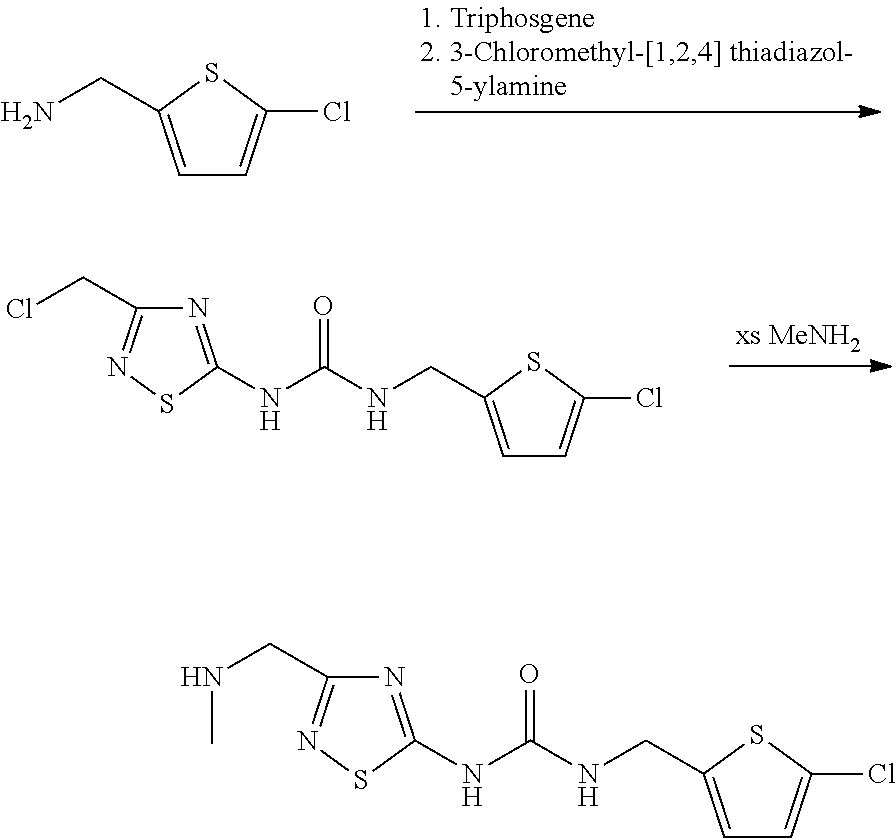 Intermediate 69: 1-(5-Chloro-thiophen-2-ylmethyl)-3-(3-methylaminomethyl-[1,2,4]thiadiazol-5-yl)-urea