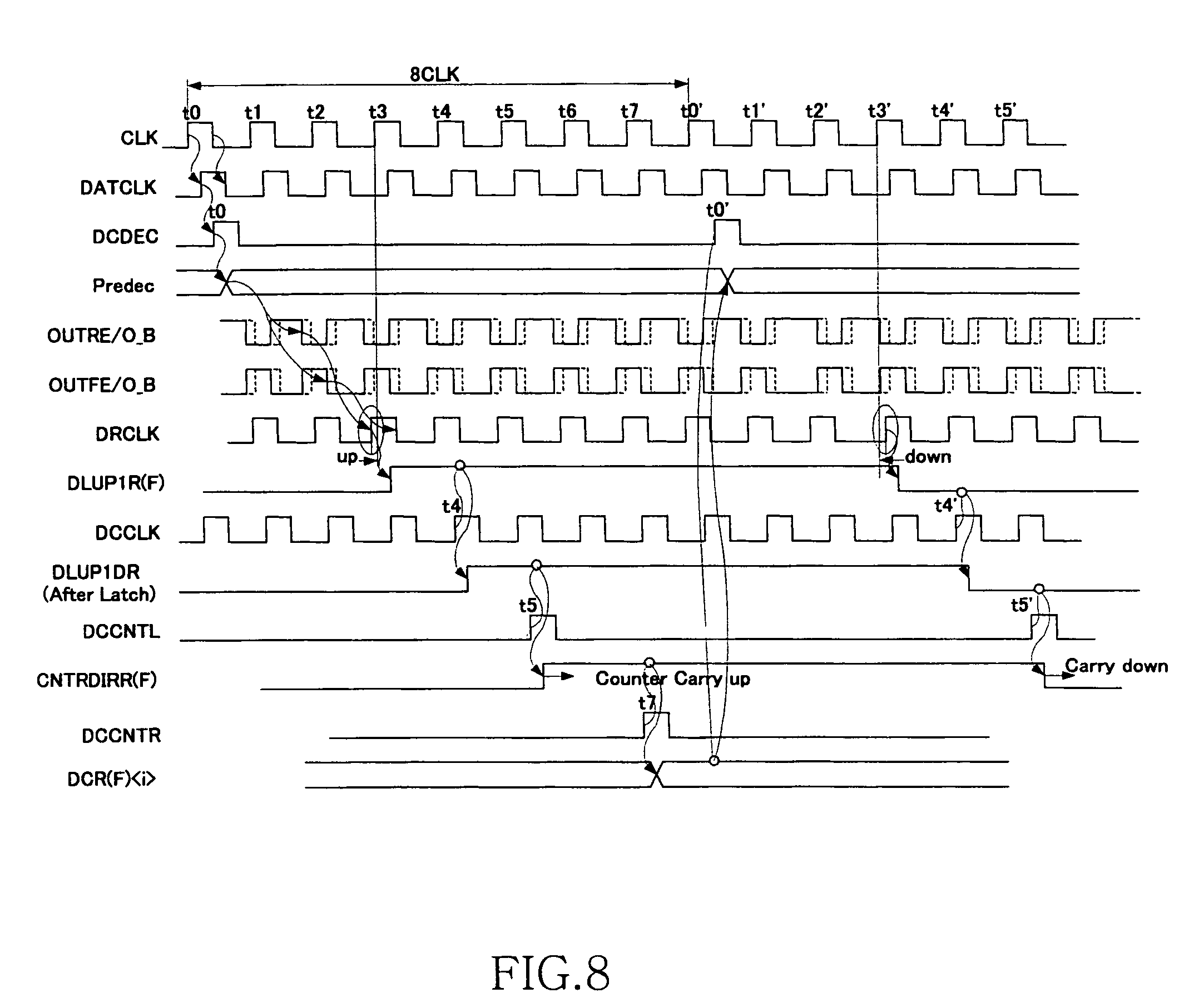 The operation clock DCCNTL is then activated synchronously with the active edge at the time t5. The rise control circuit 140R and the fall control circuit 140F thereby generate the up-down signals CNTRDIRR and CNTRDIRF based on latched contents, respectively. The operation clock DCCNTR is activated synchronously with the active edge at the time t7, thereby updating the count values of the counter circuits 120R and 120F.
