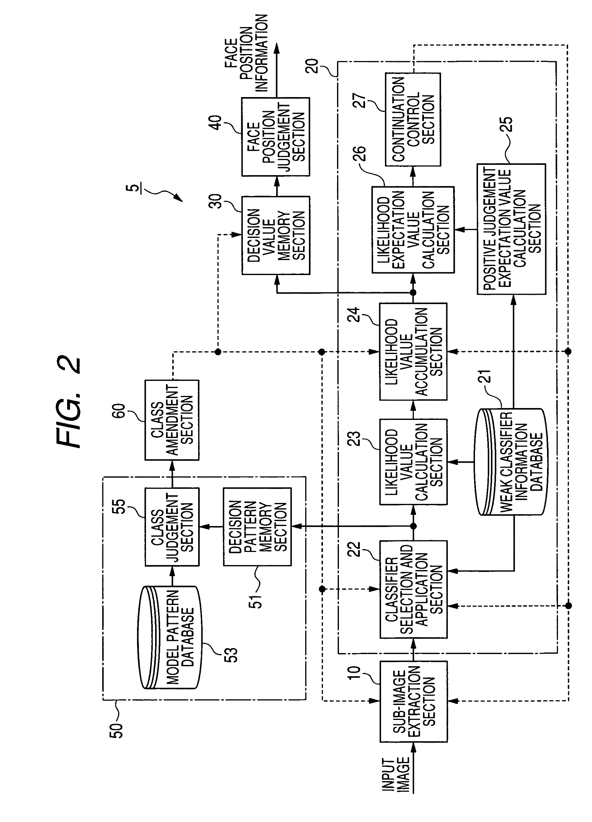 The position of a face image within an input image is detected based on results from applying a plurality of weak classifiers in sequence to each of sub-images extracted from the input image. A decision whether to interrupt the sequence and reject a currently extracted sub-image is made based on the sum of a total of weighted decision values obtained up to the current point in the sequence and a total of potential weighted decision values obtainable from the remaining weak classifiers if the extracted sub-image were a face image.