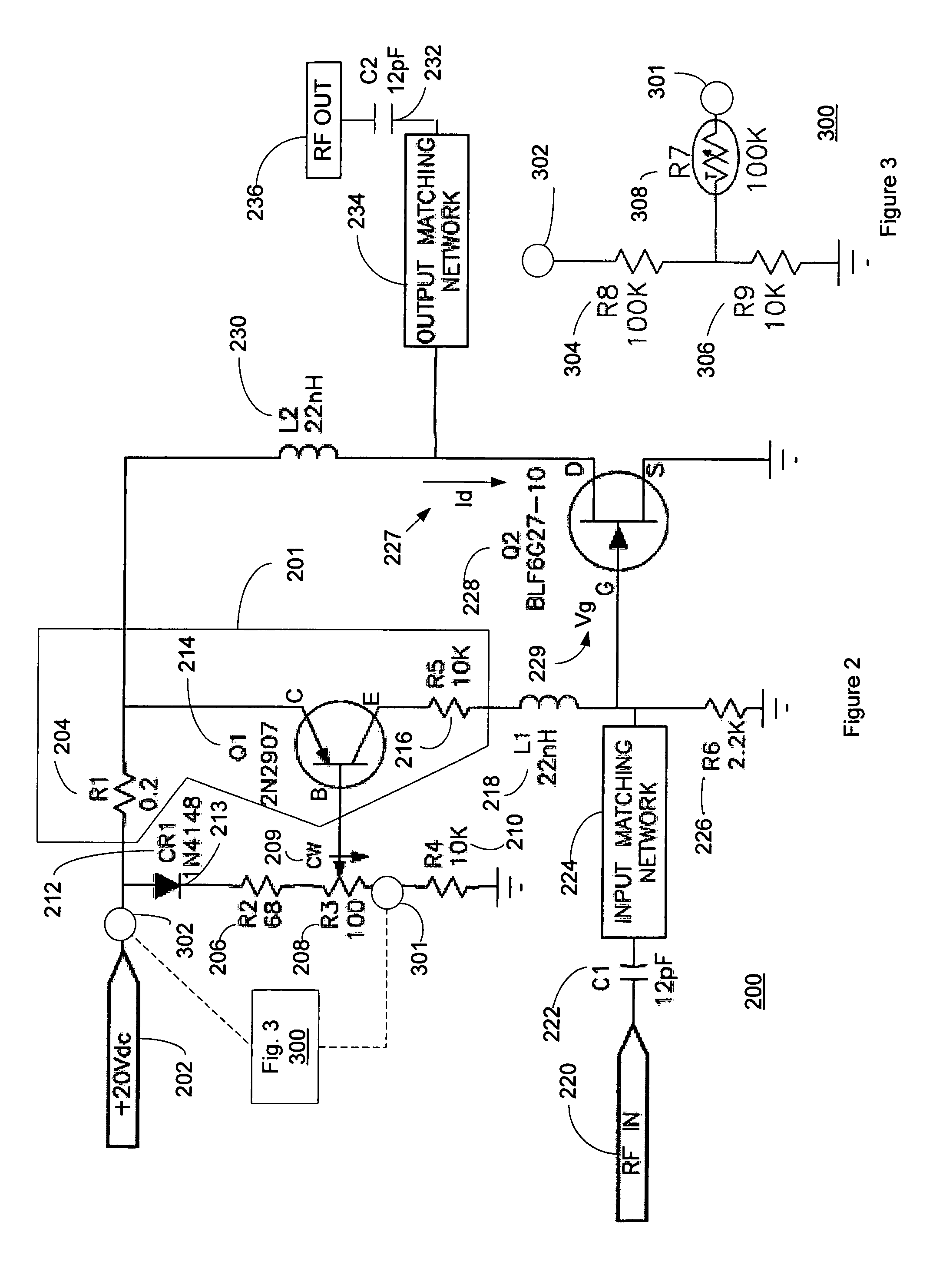 FIG. 3 represents an optional thermal or temperature compensation circuit 300 for incorporation into the circuit of FIG. 2 as shown at connection nodes 301 and 302. The exemplary circuit of FIG. 3 includes two resistors 304 and 306 (R8, R9) and a thermistor 308 (R7) that are added to provide the opportunity to intentionally change the drain current Id 227 of Q2228 as a function of temperature. It is often desirable to increase the drain current Id 227 as the temperature increases in order to maintain a constant output power. With the values shown, and the ambient current set to 1.15 Amps, this would increase to approximately 1.50 Amps at +70 C. However, when the drain current is allowed to change according to temperature, the function of the control circuit varies slightly. Whereas in FIG. 2 the control circuit's function is to draw a constant current at the drain, its function in FIG. 3 is to draw a constant current at the drain with respect to all parameters except for temperature. By allowing the drain current Id to vary according to temperature, a constant output can be maintained within a range of different temperatures. This advantage is not achieved in the first embodiment of the invention. In the example of FIG. 2, the gate bias control circuit 201 senses the drain current Id 227 of Q2228 and automatically adjusts the gate voltage Vg 229 to maintain drain current Id 227 independently of temperature, time, input drive, frequency, as well as from device to device variations. Adjusting the potentiometer R3208 causes the drain current Id 227 to vary from, e.g., 650 mA to 1.60 A and, once set, Id 227 will remain essentially constant. The temperature compensation circuit of FIG. 3 is used to introduce a change to separately adjust and manipulate operation of transistor Q1214 to manipulate the gate voltage of LDFET Q2228 so as to force more or less current to flow across the drain current sense resistor R1204. This may be particularly useful in over-temperature situations when it is desirable to have greater current flowing during “hot” operation.