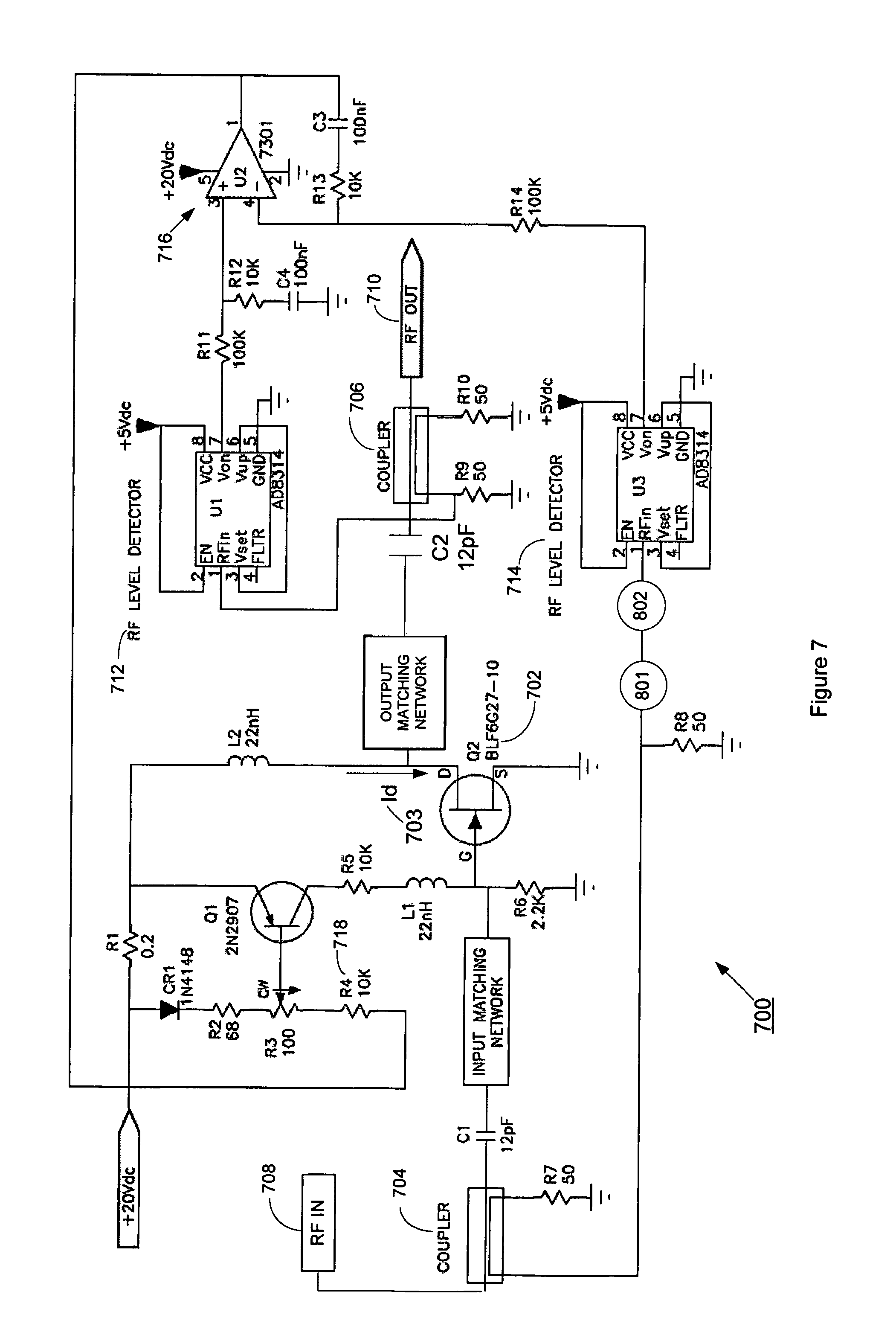 FIG. 7 illustrates an alternative amplifier 700 in which transistor Q2702 operates as a high power gain block—the gain being determined by the ratio of the coupling coefficients of the output to input couplers 704/706. The input and output RF levels 708/710 are measured by RF Level Detectors U3714 and U1712 respectively. The outputs Von of RF Level Detectors U1712 and U3714 are delivered, respectively, to inputs 3 and 4 of integrator U2716. The output 1 of U2 will in turn increase or decrease the voltage to resistor R4718 causing the drain current Id 703 to increase or decrease as required cause the correct amount of current to flow through Q2702 to cause the two inputs to equalize and maintain a constant output RF power.