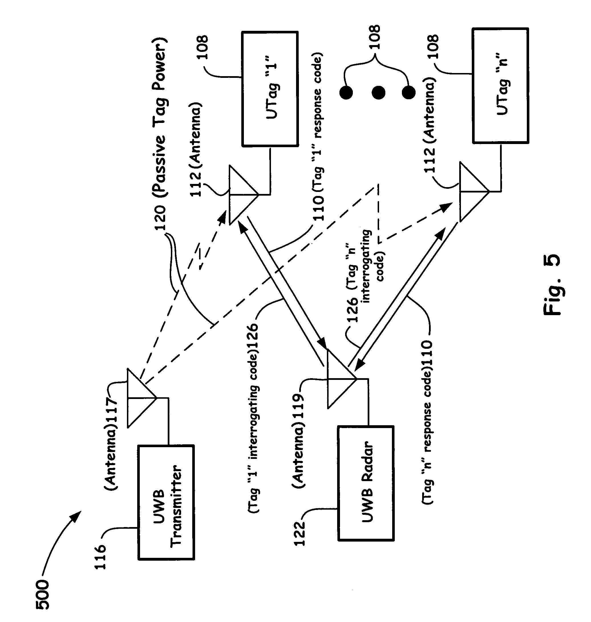 one or more tags configured in a passive state; an ultra-wideband high peak power burst generator configured to activate said one or more tags using ultra-wideband high peak power pulses; an ultra-wideband transmitter adapted to interrogate said activated one or more tags using uniquely coded tag specific ultra-wideband pulsed formats so as to awaken predetermined one or more tags and initiate a unique response code; one or more ultra-wideband receivers configured to receive modulated interrogation ultra-wideband signals resulting from said initiated unique response codes directed from said awakened tags; and processing means coupled to each said ultra-wideband receiver for correlation, range determination, and for distinguishing said modulated interrogation ultra-wideband signals received from said awakened one or more tags. 2. The system of 3. The system of 4. The system of 5. The system of 6. The system of 7. The system of 8. The system of 9. The system of