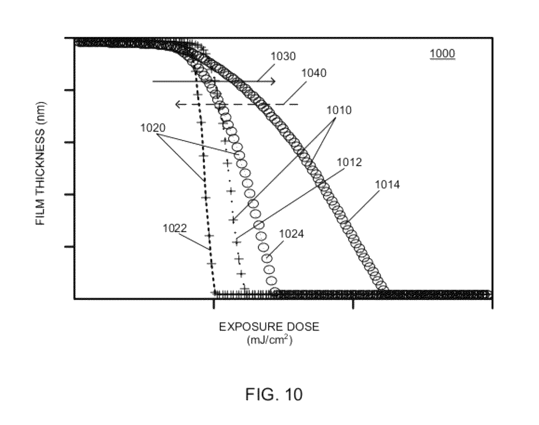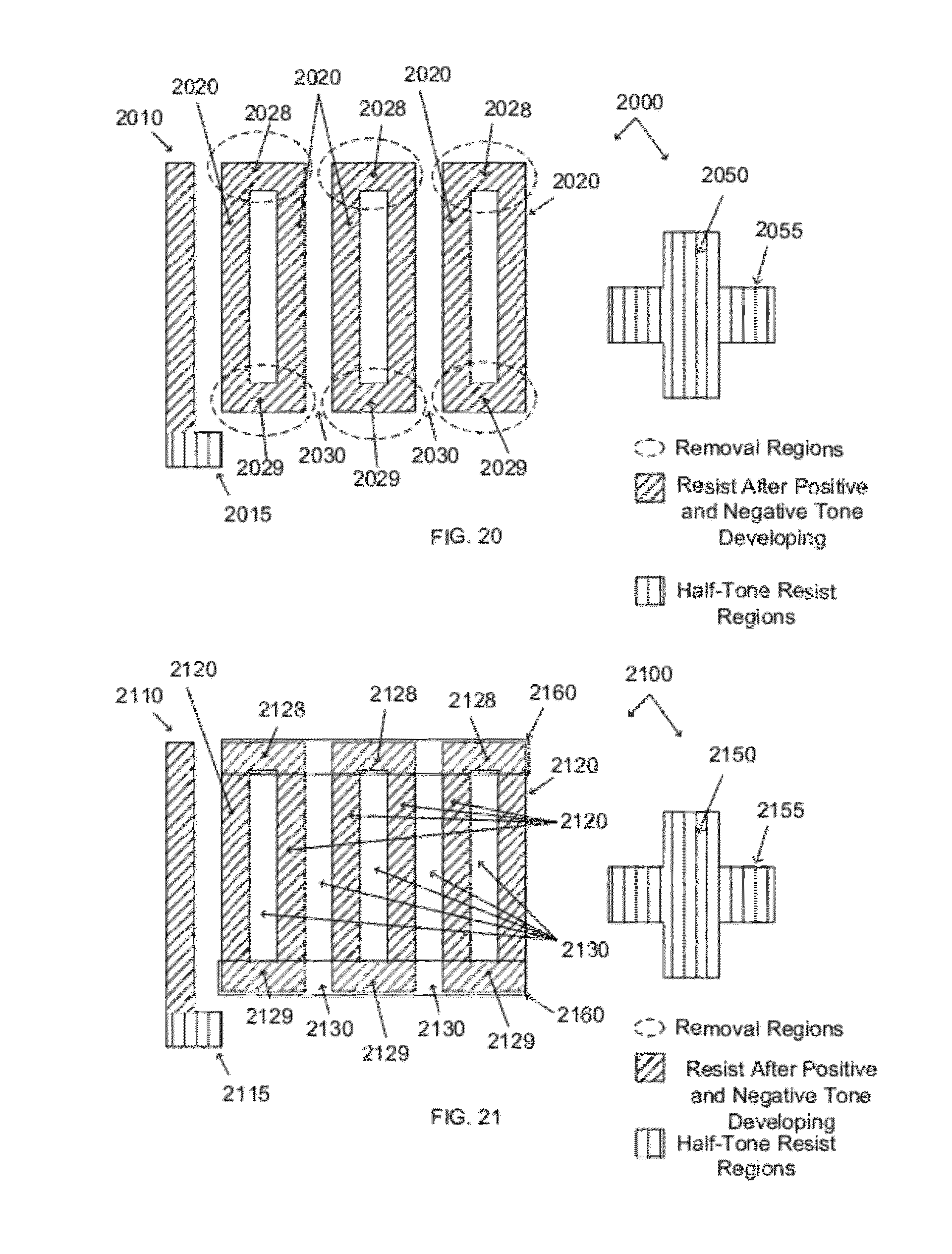 At least one of the first line features 2910 can have a first negative edge 2911 associated therewith, and at least one of the second line features 2920 can have another negative edge 2921 associated therewith. Alternatively, the first line feature 2910 may have positive edges associated therewith, and the second line features 2920 may also have positive edges associated therewith. For example, the second line features 2920 can have at least one first positive edge 2922 In some examples, the first space regions 2915 can be formed using two negative edges (2911 and 2921), and when the first space region 2915 is formed using the two negative edges (2911 and 2921), a “negative” space can be established that has a negative space width (Sn). For example, the negative space width (Sn) can vary from about 4 nm to about 40 nm. In addition, the second space region 2925 can be formed using two positive edges (2922 Both edges (2911 and 2921) of the first space regions 2915 can be defined by a first development process, and both edges (2922 The exemplary line pattern 2900 can include an inside line edge placement target 2990 that can have a first tolerance limit 2991 and a second tolerance limit 2992 associated therewith. For example, the space regions (2915 and 2925) can have zero placement error, and the inside line edge placement target 2990 associated with the second line feature 2920 can be controlled by changing the dose-related parameters. In addition, the first tolerance limit 2991 and the second tolerance limit 2992 can be dependent on the type of dual-tone resist being used. For example, the CD specification and tolerances can be the same when the inside line edge placement target 2990 is used. In addition, when the space CDs is within the limits, the inside line edge will be within the specified limits as well. If the positive space 2925 meets the CD specification and both line edges (2922 In addition, the inventors further believe that they have invented one or more novel optimization routines for Dual-tone Development (DTD) procedures. Because the DTD procedures are complex, optimization can be very challenging. The inventors have developed several novel algorithms for optimizing the process based on various desired outputs: 1) Profile; 2) Profile+Exposure Latitude; 3) Profile+Exposure Latitude+Depth of Focus; 4) Profile+Exposure Latitude+Depth of Focus+MEF (Mask Error Factor); and 5) Profile+Exposure Latitude+Depth of Focus+MEF+additional output parameter (in this manner the methodology can be extended to include many variables.) Once the planes of interest have been established, the input parameters (scanner settings, process conditions, resist parameters) can be varied, and in some embodiments, the de-protection gradient and other associated parameters can be calculated and/or optimized at the planes of interest. In order to have a substantially vertical profile, the de-protection gradients can be calculated at (n) points in the vertical planes of interest (as shown in After this particular methodology for optimizing a dual-tone development process is completed, additional metrics can be added to the optimization. For example, a user can monitor how the de-protection gradient metrics that were calculated for an ideal situation vary through dose and focus. The user can also see how the process responds to changes on the reticle (MEF) or to changes in track processing parameters like PEB time. The inventors have developed techniques to co-optimize the gradients at two critical planes, and to balance the final image on both sides of line. The inventors also have developed techniques to monitor the contrast at multiple planes of resist depth in order to have good sidewalls. In addition, the inventors have used (10%, 50%, and 80%) values to minimize errors at the surface. The swing curve concept is well understood. Because of thin film interference effects, energy input into a resist film is dependent on the resist film itself. As shown in As shown in 1) The CD 3460 of the line may or may not change size. Each line feature can be composed of one edge defined by the positive development process and one line edge from the negative development process. If the responses of the positive and negative development processes to dose are equal in magnitude and opposite in sign, the CD 3460 of the line does not shift. (If the magnitudes are not equal, the CD 3460 of the line will change, but not symmetrically). 2) The center of the line can move, and this is because the positive tone space gets bigger while the negative tone space shrinks. Because of this behavior, it is not possible to use traditional swing curve methods (measurement of a line CD 3460) to determine the best operating point for a resist process. Instead a different figure of merit can be used based on the CD of adjacent spaces. Specifically, instead of plotting the CD 3460 of a line as a function of resist thickness, one could plot the (Space-positive tone and/or the Space-negative tone) as functions of resist thickness. This merit function will swing in a way similar to line CD 3460 for a traditional lithographic process. In still other embodiments of the invention, the inventors have developed novel dual-tone development code algorithms. The inventors believe that the commercially available software package does not do what they want to do with dual-tone development, and that is to use a single exposure to generate acid and then provide two different develop routines with the second operating on the output of the first. The inventors have constructed novel code that uses a single exposure, and have used this novel code to understand and model the double development procedures. For example, 1) The boundary condition for the second development is no longer a flat surface but one with trenches that are already patterned, therefore, the programming involved is much more complex. 2) As a result of (1), interaction between the two d