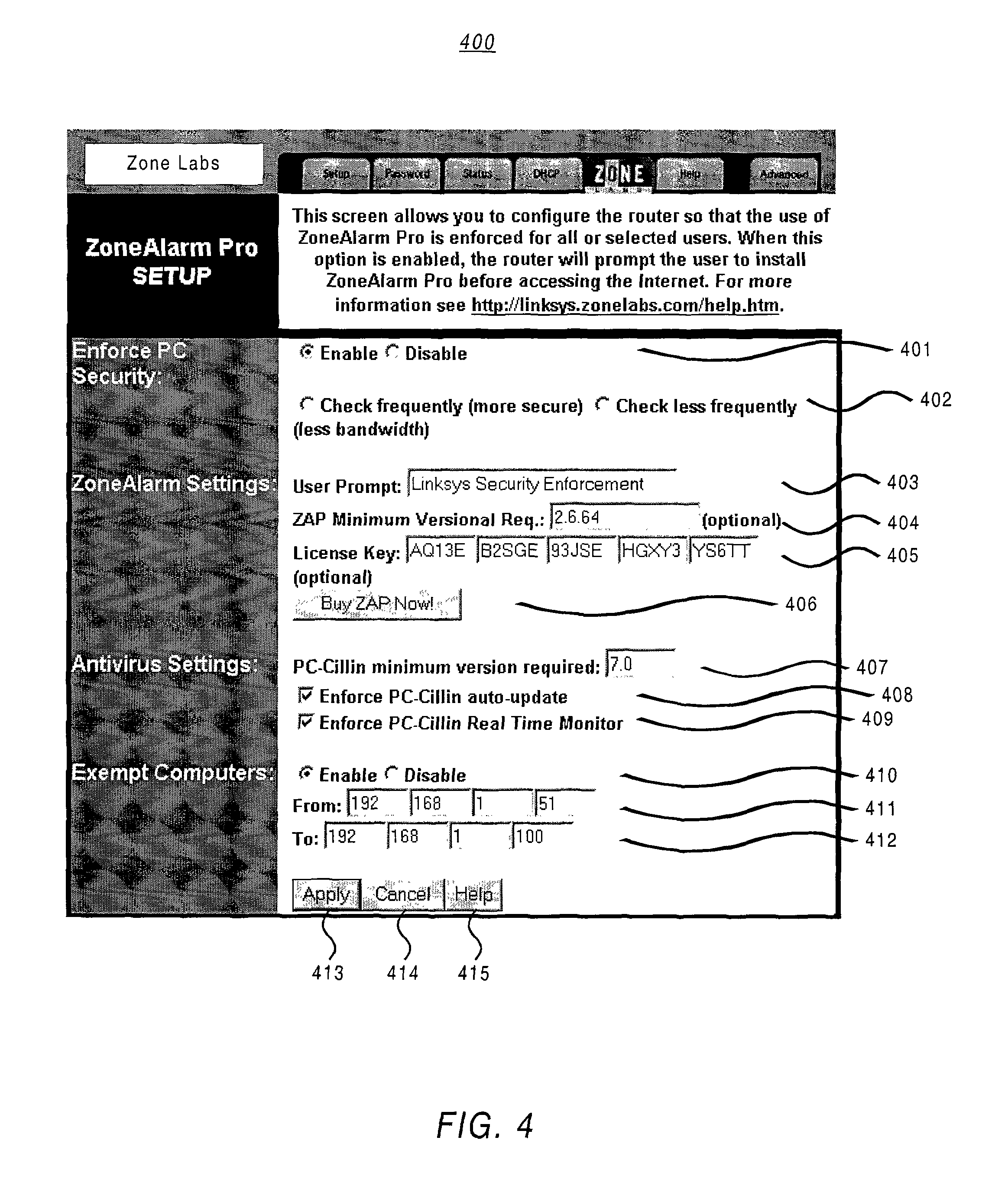 In step 951 the destination IP address is replaced with the IP address of the sandbox server (“lynksys.zonelabs.com” in this example). Also in step 951, if the entry in the router compliance table is less than 256, then the destination port is set to the value of the table entry plus 8080. For example if the table entry is 1, the destination port is set to port 8081 (which represents 8080 plus 1). This also conveys information to the sandbox server in the HTTP header permitting the sandbox server to categorize the reason for non-compliance. Using this information, the sandbox server then displays a page with information enabling the client to address the specific problem that was detected. An alternative approach that can also be used is to redirect the client to the sandbox server for a warning that he or she was not running the required security software, but then permit the client at his or her option to continue (notwithstanding the warning) and connect to the original destination if he or she elected to do so. Otherwise, in step 951 if the entry is 256 or greater, the destination port is set to port 8080. In this manner, the connection request from a non-compliant client computer is patched and manipulated to reroute this packet to the sandbox server.