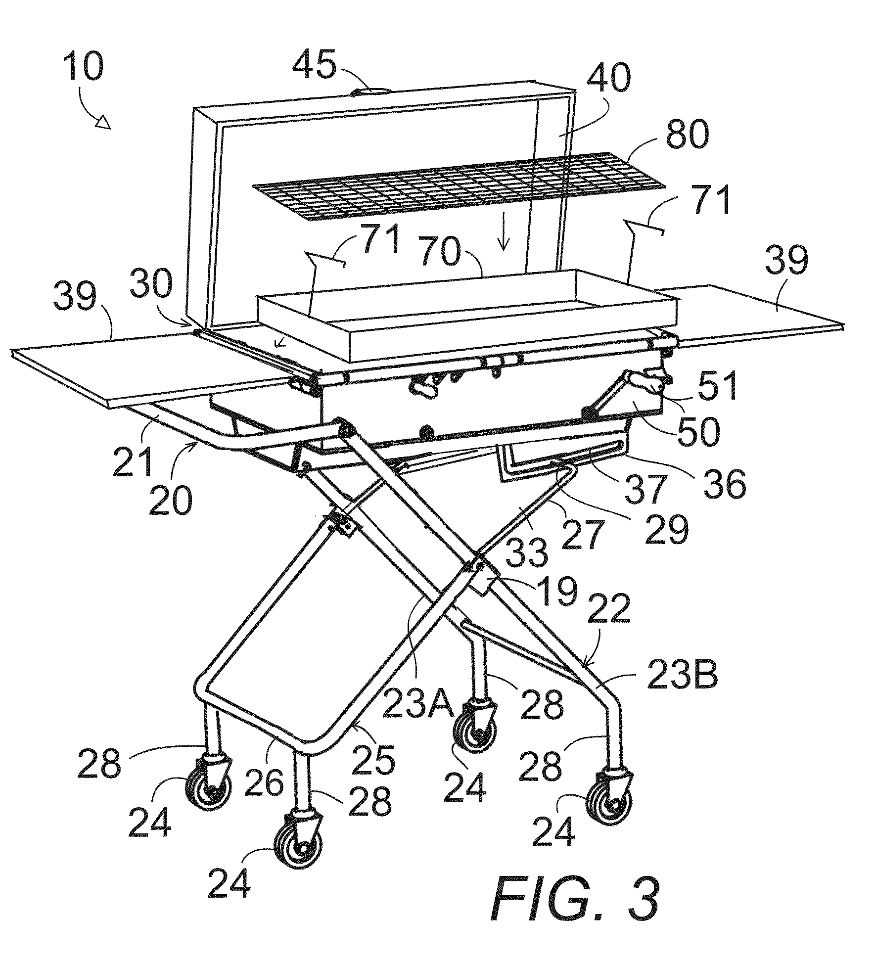 a charcoal grill comprising a base and a cover pivotally attached to the base; a charcoal grilling tray removably mounted in the base to cook using charcoal with the charcoal grilling tray; a food supporting grill mounted over the charcoal grilling tray for supporting food being grilled; at least one side tray foldable into the base; a grill stand pivotally attached to the base of the grill, the grill stand comprising a first U-shaped stand portion having two first parallel legs and a first end cross bar between the legs, the first cross bar serving as a handle for the grill stand and further comprising at least one means for rolling the stand at the end of each of the first legs thereof, the base of the grill positioned between the two first parallel legs adjacent to and spaced apart from the first end cross bar, a first end of the base of the grill pivotally attached to each of the two first parallel legs; a second U-shaped stand portion having two second parallel legs and a second end cross bar between the second legs, the ends of the second support legs pivotally attached to a mid-portion of the first U-shaped stand portion, the second U-shaped stand portion positioned between the first U-shaped stand and the base of the grill; a third U-shaped stand portion having two third parallel legs and a third end cross bar between the second legs, the ends of the third support legs pivotally attached to a mid-portion of the first U-shaped stand portion with the third end cross bar extending downwardly therefrom, and further comprising at least one means for rolling the stand extending downwardly at each outer end of the third end cross bar; a structure extending downwardly from each of two side edges of a second end of the base of the grill, each of the structures having an L-shaped slot therein with a long leg of the L positioned substantially parallel to a bottom of the base of the grill spaced apart from the base of the grill and a short leg of the L extending upwardly from the long leg, the second end cross bar extending across the second end of the base between the structures with the second end cross bar resting slidably within the L-shaped slot on each side so that locking the second end cross bar in the short leg of the L and the first and third U-shaped stand portion pivoted apart on a lower end, the second U-shaped stand portion supports the base of the grill in a horizontal position and releasing the second end cross bar so that it slides within the long leg of the L allows the base of the grill to pivot down parallel to the first U-shaped stand portion for transport vertically with the first U-shaped stand portion and third U-shaped stand portion pivoted together. 2. The device of 3. The device of 4. The device of