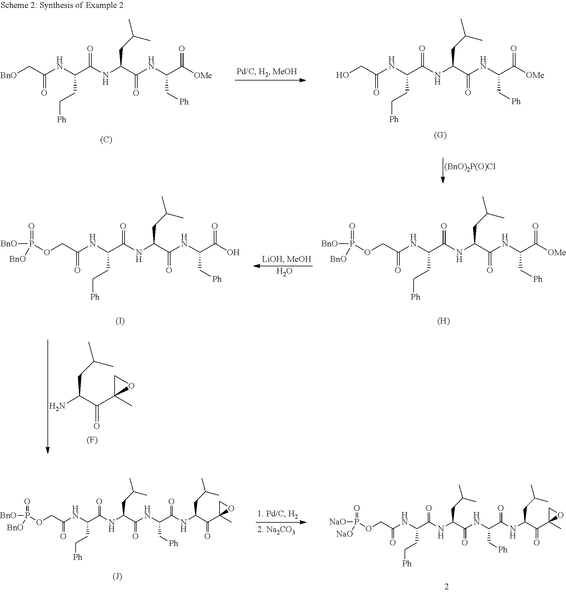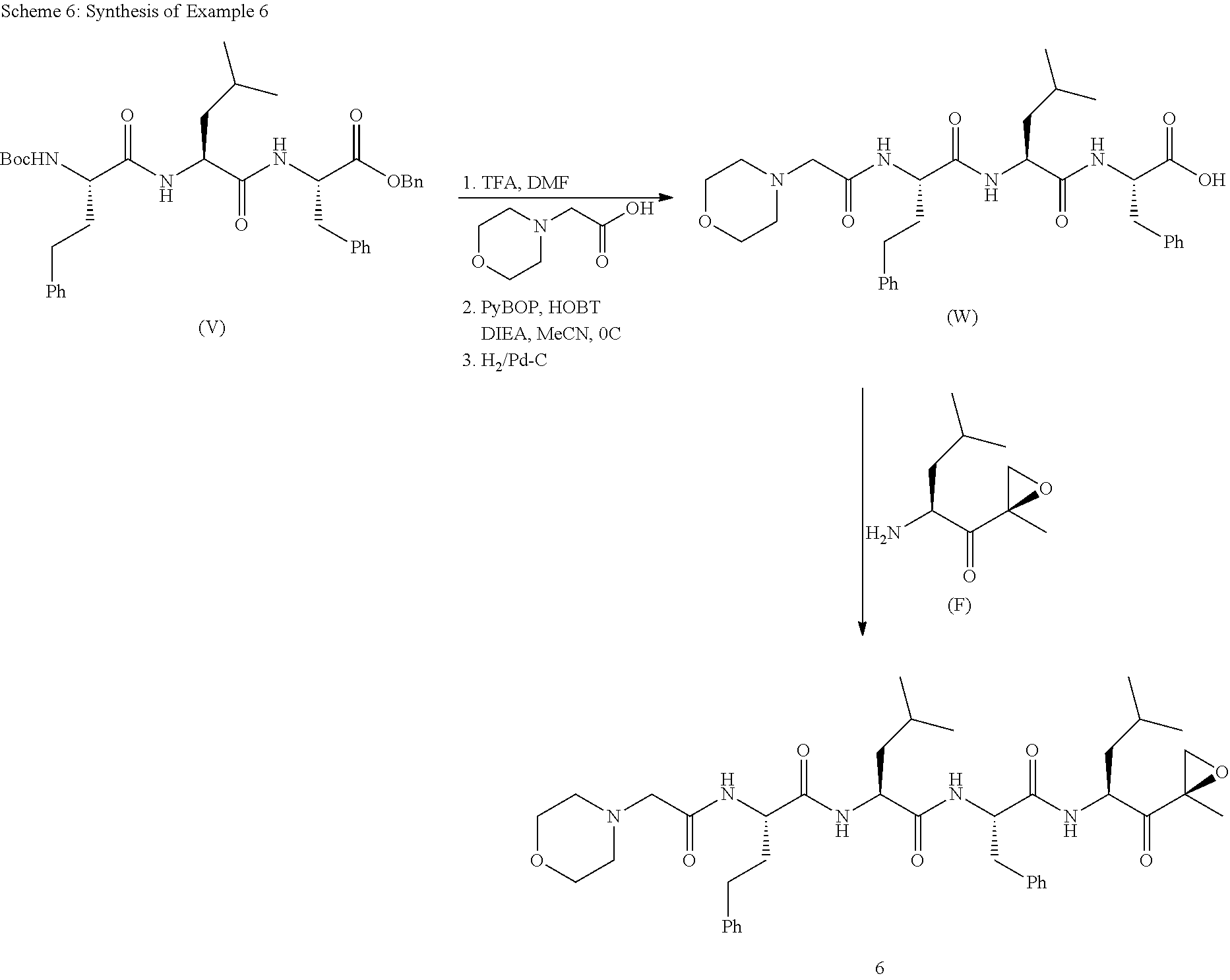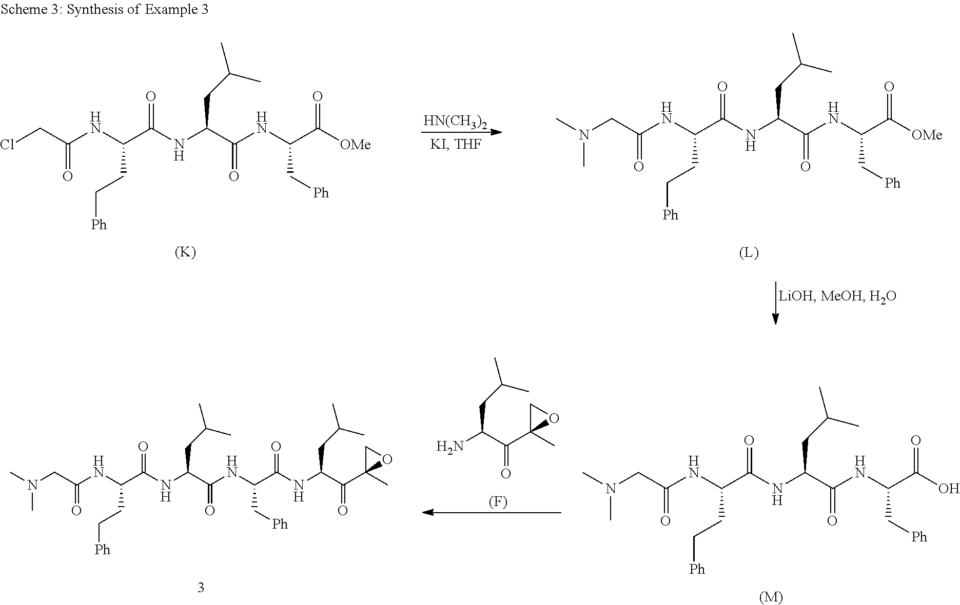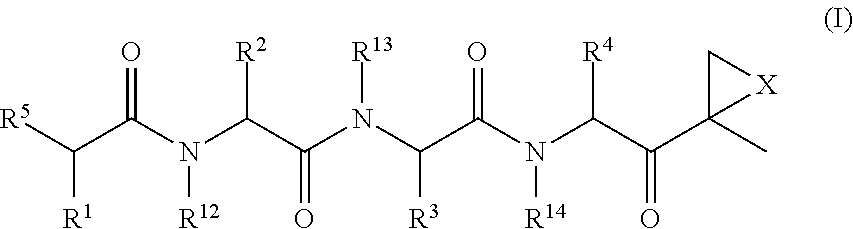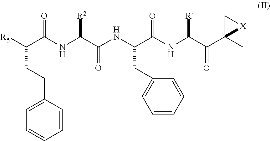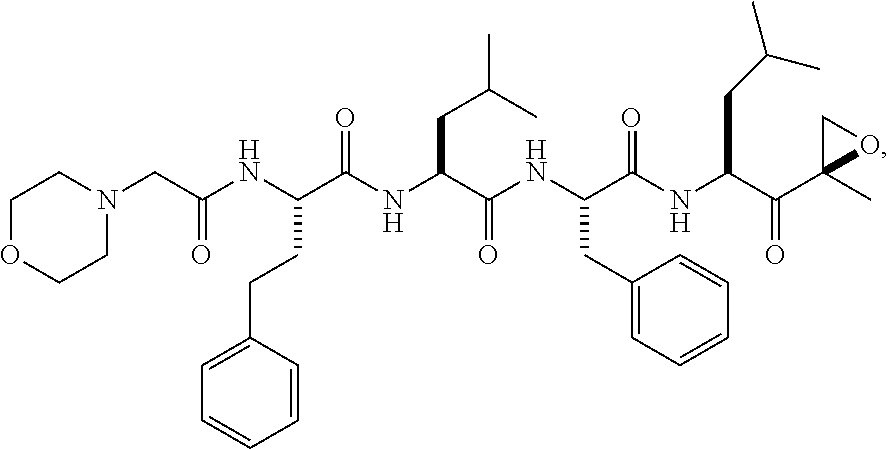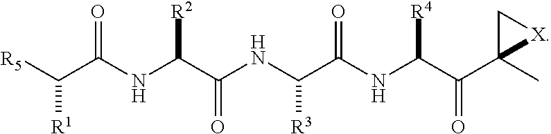 This application is a continuation of U.S. application Ser. No. 11/578,626, which has a mail date of Oct. 16, 2006 and a 35 U.S.C. §371(c) date of Aug. 10, 2007 and is the U.S. National Stage of International Application No. PCT/US2005/012740, filed on Apr. 14, 2005, which in turn claims the benefit of U.S. Provisional Application No. 60/562,340, filed on Apr. 15, 2004; U.S. Provisional Application No. 60/569,096, filed on May 7, 2004; U.S. Provisional Application No. 60/599,401, filed on Aug. 6, 2004; U.S. Provisional Application No. 60/610,001, filed on Sep. 14, 2004; U.S. Provisional Application No. 60/610,002, filed on Sep. 14, 2004; U.S. Provisional Application No. 60/610,159, filed on Sep. 14, 2004; and U.S. Provisional Application No. 60/620,573, filed on Oct. 20, 2004; each of these prior filed applications is incorporated herein by reference in its entirety. This invention relates to compounds and methods for enzyme inhibition. In particular, the invention relates to therapeutic methods based on enzyme inhibition. In eukaryotes, protein degradation is predominately mediated through the ubiquitin pathway in which proteins targeted for destruction are ligated to the 76 amino acid polypeptide ubiquitin. Once targeted, ubiquitinated proteins then serve as substrates for the 26S proteasome, a multicatalytic protease, which cleaves proteins into short peptides through the action of its three major proteolytic activities. While having a general function in intracellular protein turnover, proteasome-mediated degradation also plays a key role in many processes such as major histocompatibility complex (MHC) class I presentation, apoptosis, cell division, and NF-κB activation. The 20S proteasome is a 700 kDa cylindrical-shaped multicatalytic protease complex comprised of 28 subunits organized into four rings that plays important roles in cell growth regulation, major histocompatibility complex class I presentation, apoptosis, antigen processing, NF-κB activation, and transduction of pro-inflammatory signals. In yeast and other eukaryotes, 7 different α subunits form the outer rings and 7 different β subunits comprise the inner rings. The α subunits serve as binding sites for the 19S (PA700) and 11S (PA28) regulatory complexes, as well as a physical barrier for the inner proteolytic chamber formed by the two β subunit rings. Thus, in vivo, the proteasome is believed to exist as a 26S particle (“the 26S proteasome”). In vivo experiments have shown that inhibition of the 20S form of the proteasome can be readily correlated to inhibition of 26S proteasome. Cleavage of amino-terminal prosequences of β subunits during particle formation expose amino-terminal threonine residues, which serve as the catalytic nucleophiles. The subunits responsible for catalytic activity in proteasome thus possess an amino terminal nucleophilic residue, and these subunits belong to the family of N-terminal nucleophile (Ntn) hydrolases (where the nucleophilic N-terminal residue is, for example, Cys, Ser, Thr, and other nucleophilic moieties). This family includes, for example, penicillin G acylase (PGA), penicillin V acylase (PVA), glutamine PRPP amidotransferase (GAT), and bacterial glycosylasparaginase. In addition to the ubiquitously expressed β subunits, higher vertebrates also possess three γ-interferon-inducible β subunits (LMP7, LMP2 and MECL1), which replace their normal counterparts, X, Y and Z respectively, thus altering the catalytic activities of the proteasome. Through the use of different peptide substrates, three major proteolytic activities have been defined for the eukaryote 20S proteasome: chymotrypsin-like activity (CT-L), which cleaves after large hydrophobic residues; trypsin-like activity (T-L), which cleaves after basic residues; and peptidylglutamyl peptide hydrolyzing activity (PGPH), which cleaves after acidic residues. Two additional less characterized activities have also been ascribed to the proteasome: BrAAP activity, which cleaves after branched-chain amino acids; and SNAAP activity, which cleaves after small neutral amino acids. The major proteasome proteolytic activities appear to be contributed by different catalytic sites, since inhibitors, point mutations in β subunits and the exchange of γ interferon-inducing β subunits alter these activities to various degrees. There are several examples of small molecules which have been used to inhibit proteasome activity; however, these compounds generally lack the specificity, stability, or potency necessary to explore and exploit the roles of the proteasome at the cellular and molecular level. Therefore, the synthesis of small molecule inhibitor(s) with increased site specificity, improved stability and solubility, and increased potency are needed to allow the exploration of the roles of the proteasome at the cellular and molecular level. The invention relates to analogs and prodrugs of classes of molecules known as peptide α′,β′-epoxides and peptide α′,β′-aziridines. The parent molecules are understood to bind efficiently, irreversibly and selectively to N-terminal nucleophile (Ntn) hydrolases, and can specifically inhibit particular activities of enzymes having multiple catalytic activity. Once thought merely to dispose of denatured and misfolded proteins, the proteasome is now recognized as constituting proteolytic machinery that regulates the levels of diverse intracellular proteins through their degradation in a signal-dependent manner. Hence, there is great interest in identifying reagents that can specifically perturb the activities of the proteasome and other Ntn hydrolases and thereby be used as probes to study the role of these enzymes in biological processes. Analogs and prodrugs for compounds that target the Ntn hydrolases are herein described, synthesized, and investigated. Peptide epoxides and peptide aziridines that can potently, selectively, and irreversibly inhibit particular proteasome activiti