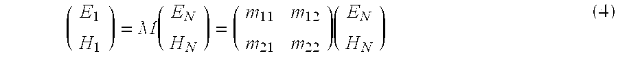 where E and H, respectively, represent the Electric and Magnetic field residing in the stack, and Mirepresents the transformation matrix for the i-th layer in the stack. The transformation matrix is given by: