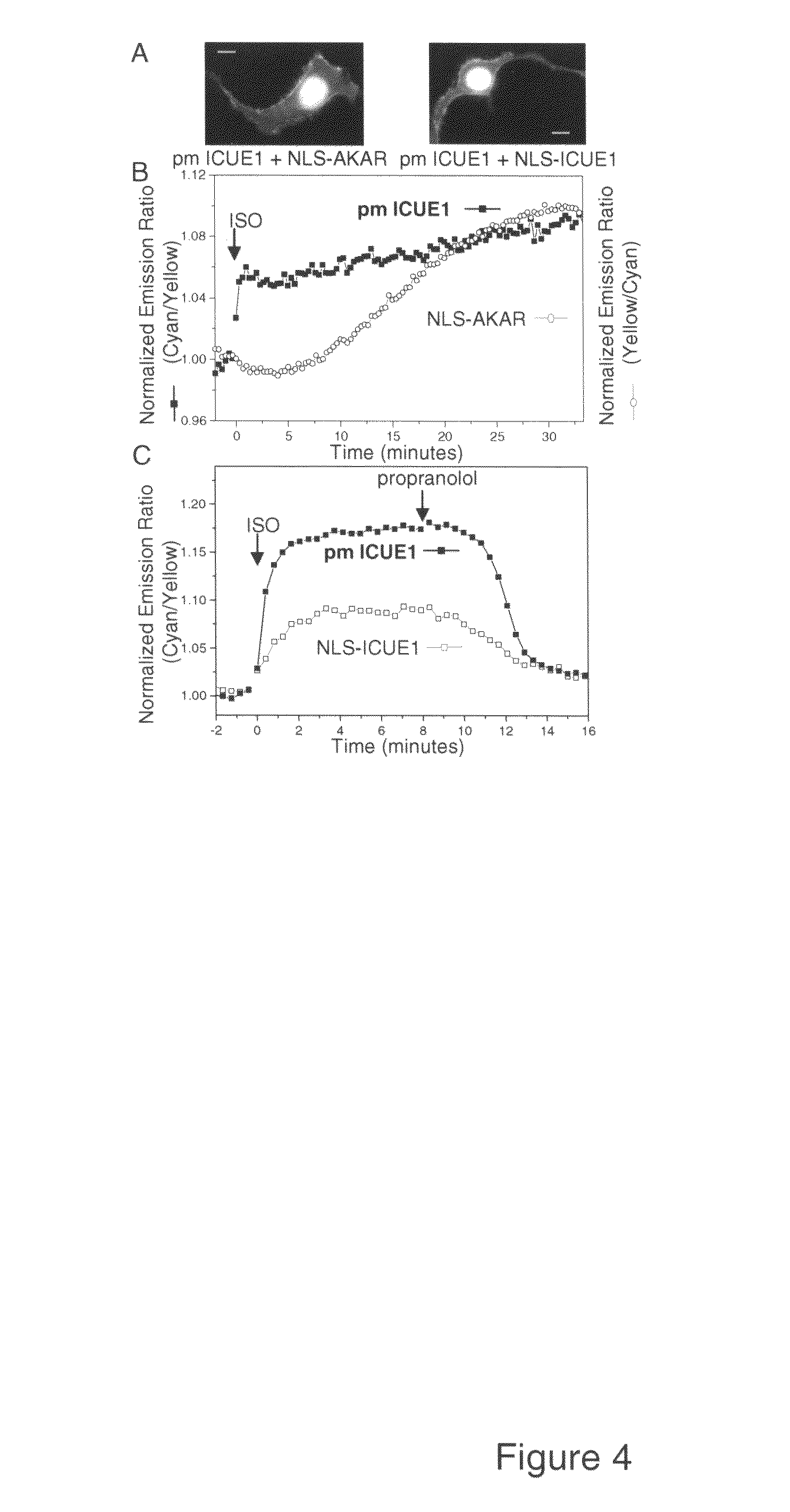 Live cell plate reading. HEK293 cells were transfected with cDNA encoding ICUE reporters using calcium phosphate at 40% confluency and allowed to grow for 40 hours. Cells were then trypsinized and plated in a Costar 3603 96-well assay plate (Coming) at a density of 150,000 cells per well. After incubation for another 24 hours, cells were washed once with HBSS and left in 150 μl HBSS at 20-25° C. Fluorescence reading was taken on a FLUOstar OPTIMA fluorescence microplate reader (BMG Labtechnologies Inc.) using a 420DF20 excitation filter and two emission filters (470DF40 for cyan and 525DF25 for yellow). A baseline was established in three cycles, each consisting of a full plate reading of yellow intensity, followed by a reading of cyan intensity. Each cycle lasted between 64 and 145 seconds. Cells were then treated with ISO, FSK, H89, PRO, or IBMX as indicated in FIG. 10. Readings were taken in additional cycles. FRET change was calculated as the percent increase of emission ratios (cyan-to-yellow) over baseline for each well during a given cycle. To assess the efficacy of the assay, several statistical parameters were calculated, including Z factor, coefficient of variation, and signal-to-noise ratio (Zhang et al., J. Biomol. Screen. 4, 67-73, 1999).