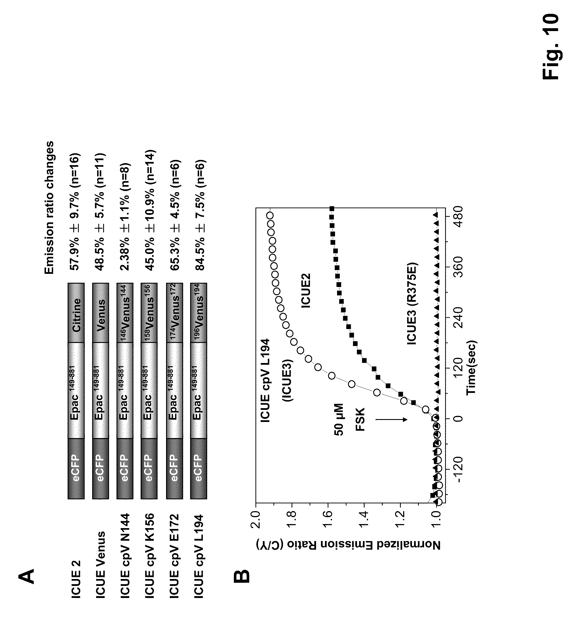 HEK293 cells expressing the four constructs individually (cpV N144, cpV E172, cpV K156, and cpV L194) were stimulated with FSK, and average emission ratio changes were calculated. In the case of cpV N144, low yellow fluorescence intensity was observed, yielding a reporter with a reduced dynamic range (FIG. 10A). The cpV E172 and cpV K156 did not significantly change the dynamic range, showing an average response of 65.3%±4.50% (n=6) and 45.0%±10.9% (n=14), respectively. On the other hand, incorporation of cpV L194 showed a more dramatic effect. Upon stimulation with FSK, HEK293 cells expressing ICUE cpV L194 generated an emission ratio change of 76-93% with an average of 84.5%±7.50% (n=6) (FIG. 10B). Thus, this approach of using cpV variants to create variations in the relative spatial orientation of YFP with respect to CFP proved effective for multiple FRET reporters. This improved indicator of cAMP, named ICUE3, maintained the specificity for cAMP, as a loss-of-function mutation in the cAMP binding site (de Rooij et al., Nature 396, 474-77, 1998) abolished the FRET response of ICUE3 (FIG. 10B). When Cypet and Ypt were used as the FRET pair, the resulting ICUE construct generated emission ratio changes of up to 110%; experimental variations and reduced fluorescence intensities in HEK-293 cells suggested that additional optimization can be carried out.
