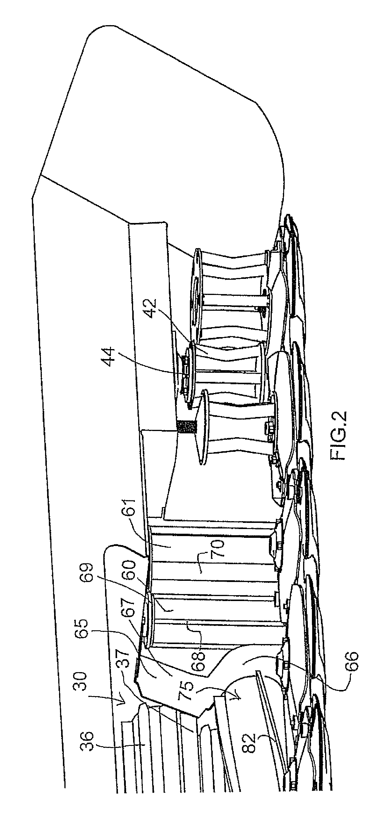 The end disk 50 is arranged to rotate so that a front of the first disk moves outwardly of the respective end of the discharge opening as marked at direction arrow D. A first outer disk 56, which is mounted outwardly of the end line 55 of the discharge opening and outwardly of the end disk 50, forms a pair with the end disks 50 so as to rotate in a direction D opposite thereto such that at least some of the crop tends to be swept into a first zone 57 between the first pair of disks and to pass through that zone as shown schematically at arrow 58.