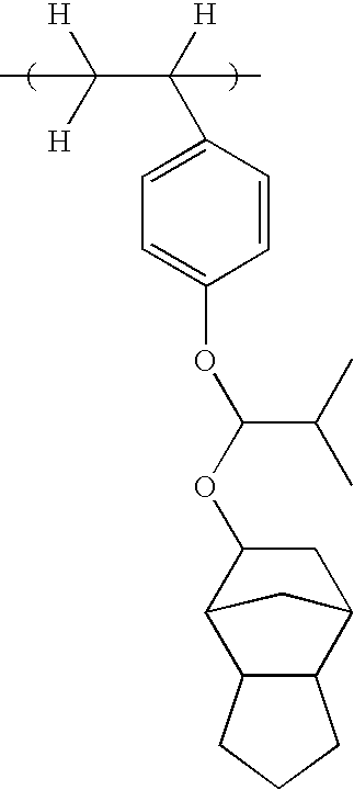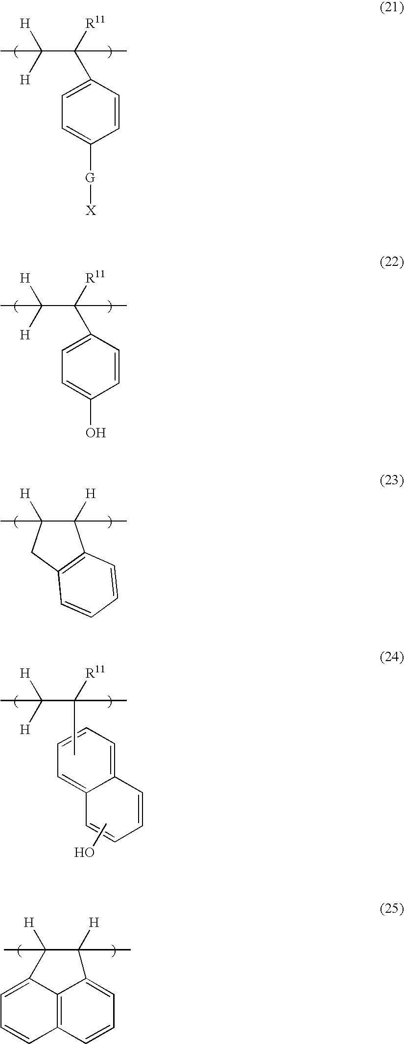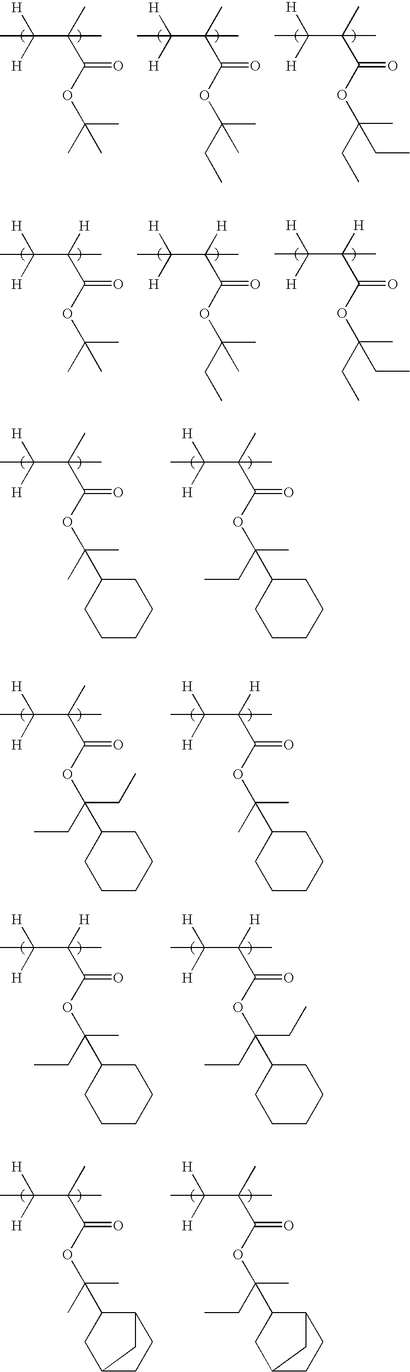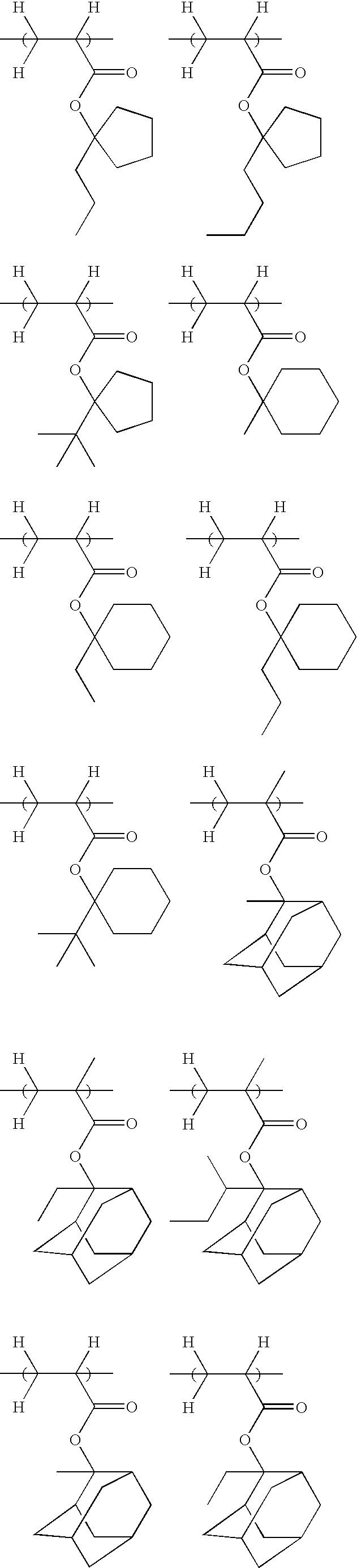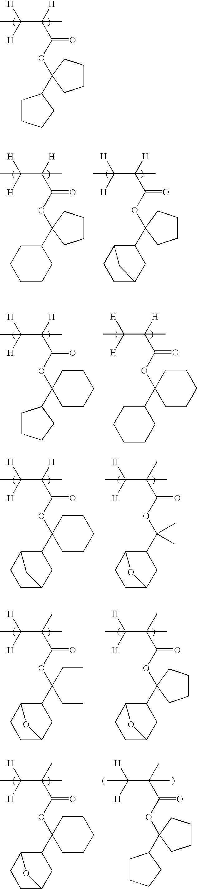 Example 1-1 R-01 Polymer 12 (80) PAG-2 (9.9) Base-1 (1.10) PGMEA (540) EL (1280) Example 1-2 R-02 Polymer 12 (80) PAG-3 (8.8) Base-1 (1.10) PGMEA (540) EL (1280) Example 1-3 R-03 Polymer 12 (80) PAG-4 (10.1) Base-1 (1.10) PGMEA (540) EL (1280) Example 1-4 R-04 Polymer 13 (80) PAG-4 (10.1) Base-1 (1.10) PGMEA (540) EL (1280) Example 1-5 R-05 Polymer 14 (80) PAG-4 (10.1) Base-1 (1.10) PGMEA (540) EL (1280) Example 1-6 R-06 Polymer 15 (80) PAG-4 (10.1) Base-1 (1.10) PGMEA (540) EL (1280) Example 1-7 R-07 Polymer 16 (80) PAG-4 (10.1) Base-1 (1.10) PGMEA (540) EL (1280) Example 1-8 R-08 Polymer 17 (80) PAG-4 (10.1) Base-1 (1.10) PGMEA (540) EL (1280) Example 1-9 R-09 Polymer 18 (80) PAG-4 (10.1) Base-1 (1.10) PGMEA (540) EL (1280) TMGU (10) Example 1-10 R-10 Polymer 19 (80) PAG-4 (10.1) Base-1 (1.10) PGMEA (540) EL (1280) Example 1-11 R-11 Polymer 20 (80) PAG-4 (10.1) Base-1 (1.10) PGMEA (540) EL (1280) Example 1-12 R-12 Polymer 23 (80) PAG-4 (10.1) Base-1 (1.10) PGMEA (540) EL (1280) Example 1-13 R-13 Polymer 24 (80) PAG-4 (10.1) Base-1 (1.10) PGMEA (540) EL (1280) Example 1-14 R-14 Polymer 25 (80) PAG-4 (10.1) Base-1 (1.10) PGMEA (540) EL (1280) Example 1-15 R-15 Polymer 26 (80) PAG-4 (10.1) Base-1 (1.10) PGMEA (540) EL (1280) Example 1-16 R-16 Polymer 27 (80) PAG-2 (7.0) Base-2 (1.23) PGMEA (896) CyHO (364) Example 1-17 R-17 Polymer 28 (80) PAG-2 (7.0) Base-2 (1.23) PGMEA (896) CyHO (364) Example 1-18 R-18 Polymer 29 (80) PAG-2 (5.3) — — PGMEA (896) CyHO (364) PAG-III (7.6) Example 1-19 R-19 Polymer 30 (80) PAG-2 (5.3) — — PGMEA (896) CyHO (364) PAG-III (7.6) Comparative R-20 Polymer 20 (80) PAG-I (7.2) Base-1 (1.10) PGMEA (540) EL (1280) Example 1-1 Comparative R-21 Polymer 20 (80) PAG-II (7.9) Base-1 (1.10) PGMEA (540) EL (1280) Example 1-2 Comparative R-22 Polymer 25 (80) PAG-I (7.2) Base-1 (1.10) PGMEA (540) EL (1280) Example 1-3 Comparative R-23 Polymer 25 (80) PAG-II (7.9) Base-1 (1.10) PGMEA (540) EL (1280) Example 1-4 Comparative R-24 Polymer 27 (80) PAG-III (6.0) Base-2 (1.23) PGMEA (896) CyHO (364) Example 1-5 Comparative R-25 Polymer 29 (80) PAG-III (6.0) Base-2 (1.23) PGMEA (896) CyHO (364) Example 1-6