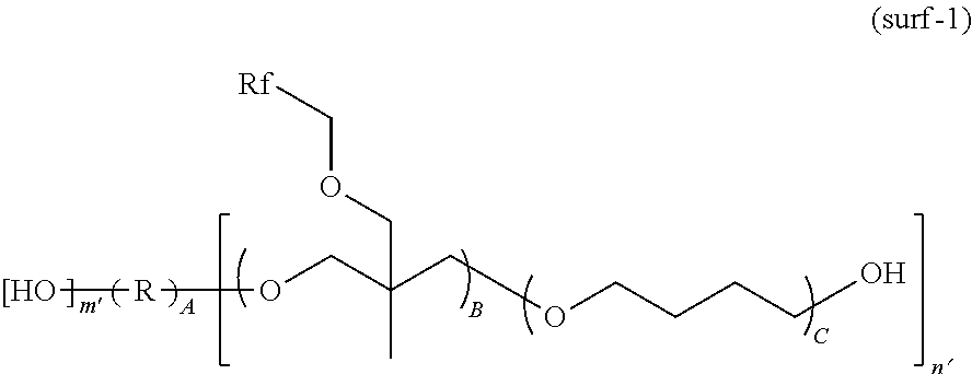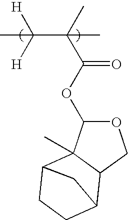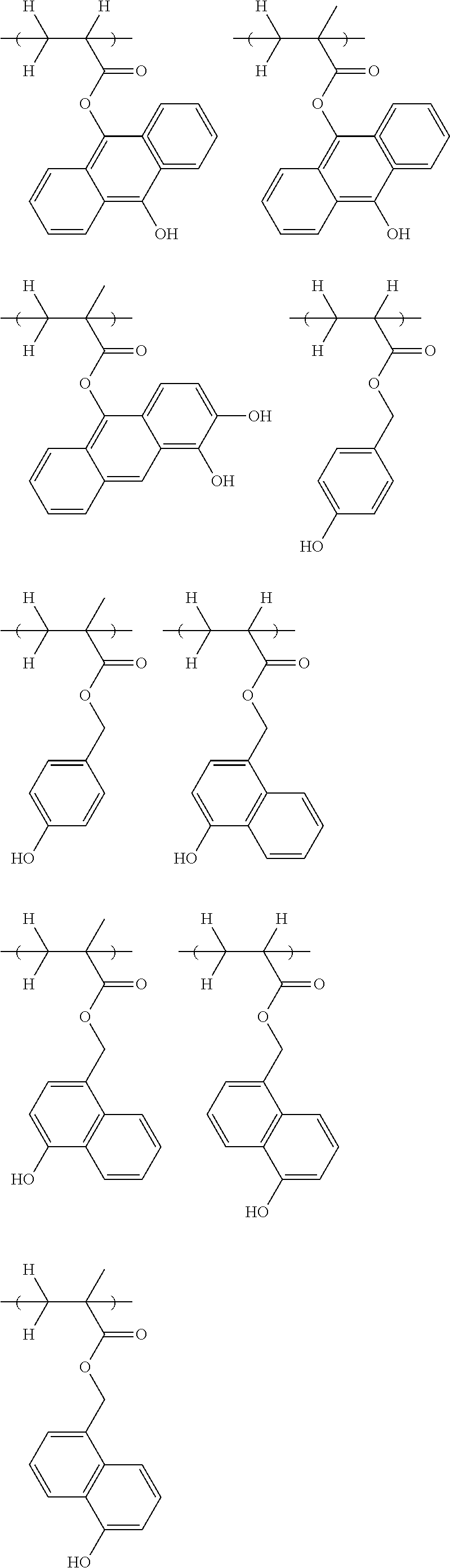 Synthesis Polymer 1 A-2 (0.70) A-9 (0.10) A-3 (0.20) Example 2-1 Synthesis Polymer 2 A-2 (0.70) A-10 (0.10) A-3 (0.20) Example 2-2 Synthesis Polymer 3 A-2 (0.70) A-9 (0.10) A-4 (0.20) Example 2-3 Synthesis Polymer 4 A-2 (0.70) A-10 (0.10) A-4 (0.20) Example 2-4 Synthesis Polymer 5 A-2 (0.70) A-9 (0.10) A-5 (0.20) Example 2-5 Synthesis Polymer 6 A-2 (0.70) A-10 (0.10) A-5 (0.20) Example 2-6 Synthesis Polymer 7 A-2 (0.80) A-9 (0.10) A-8 (0.10) Example 2-7 Synthesis Polymer 8 A-2 (0.85) B-4M (0.15) — Example 2-8 Synthesis Polymer 9 A-2 (0.80) A-10 (0.10) B-4M (0.10) Example 2-9 Synthesis Polymer 10 A-2 (0.90) A-9 (0.10) — Example 2-10 Synthesis Polymer 11 A-2 (0.90) A-10 (0.10) — Example 2-11 Synthesis Polymer 12 A-1 (0.70) A-9 (0.10) A-3 (0.20) Example 2-12 Synthesis Polymer 13 A-1 (0.70) A-10 (0.10) A-3 (0.20) Example 2-13 Synthesis Polymer 14 A-1 (0.70) A-9 (0.10) A-4 (0.20) Example 2-14 Synthesis Polymer 15 A-1 (0.70) A-10 (0.10) A-4 (0.20) Example 2-15 Synthesis Polymer 16 A-1 (0.70) A-9 (0.10) A-5 (0.20) Example 2-16 Synthesis Polymer 17 A-1 (0.70) A-10 (0.10) A-5 (0.20) Example 2-17 Synthesis Polymer 18 A-1 (0.80) A-9 (0.10) A-8 (0.10) Example 2-18 Synthesis Polymer 19 A-1 (0.85) B-4M (0.15) — Example 2-19 Synthesis Polymer 20 A-1 (0.80) A-10 (0.10) B-4M (0.10) Example 2-20 Synthesis Polymer 21 A-1 (0.90) A-9 (0.10) — Example 2-21 Synthesis Polymer 22 A-1 (0.90) A-10 (0.10) — Example 2-22 Synthesis Polymer 23 A-1 (0.70) A-9 (0.10) A-6 (0.20) Example 2-23 Synthesis Polymer 24 A-1 (0.70) A-10 (0.10) A-6 (0.20) Example 2-24 Synthesis Polymer 25 A-1 (0.70) A-9 (0.10) A-7 (0.20) Example 2-25 Synthesis Polymer 26 A-1 (0.70) A-10 (0.10) A-7 (0.20) Example 2-26 Synthesis Polymer 27 B-8M (0.30) B-4M (0.25) B-5M (0.45) Example 2-27 Synthesis Polymer 28 B-3M (0.50) B-4M (0.20) B-5M (0.30) Example 2-28 Synthesis Polymer 29 B-1M (0.50) B-4M (0.10) B-5M (0.40) Example 2-29 Synthesis Polymer 30 B-2M (0.50) B-4M (0.10) B-5M (0.40) Example 2-30