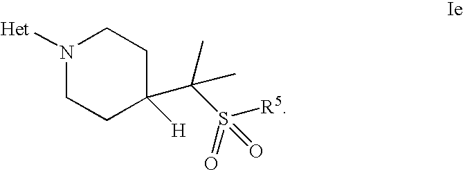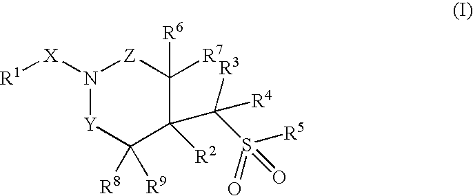 1-benzoyl-4-(1-methyl-1-{[3-(trifluoromethyl)phenyl]sulfonyl}ethyl)piperidine; tert-butyl 4-(1-{[3-(trifluoromethyl)phenyl]sulfonyl}ethyl)piperidine-1-carboxylate; tert-butyl 4-(1-methyl-1-{[3-(trifluoromethyl)phenyl]sulfonyl}ethyl)piperidine-1-carboxylate; 1-benzoyl-4-(1-methyl-1-{[3-(trifluoromethyl)phenyl]sulfonyl}ethyl)piperidine; 1-[2-(methylsulfonyl)-4-(trifluoromethoxy)benzoyl]-4-(1-methyl-1-{[3-(trifluoromethyl)phenyl]sulfonyl}ethyl)piperidine; 2-(cyclopropylsulfonyl)-3-{[4-(1-methyl-1-{[3-(trifluoromethyl)phenyl]sulfonyl}-ethyl)piperidin-1-yl]carbonyl}-6-(trifluoromethyl)pyridine; 1-[4-(cyclopropyloxy)-2,6-bis(methylsulfonyl)benzoyl]-4-(1-methyl-1-{[3-(trifluoromethyl)phenyl]sulfonyl}ethyl)piperidine; 1-[4-(cyclopropyloxy)-2,6-bis(methylthio)benzoyl]-4-(1-methyl-1-{[3-(trifluoromethyl)-phenyl]sulfonyl}ethyl)piperidine; 2-[(1-methyl-1-{1-[2-(methylsulfonyl)-4-(trifluoromethoxy)benzoyl]piperidin-4-yl}ethyl)sulfonyl]-6-(trifluoromethyl)pyridine; tert-butyl 4-(1-methyl-1-{[6-(trifluoromethyl)pyridin-2-yl]sulfonyl}ethyl)piperidine-1-carboxylate; 1-[4-(methylsulfonyl)-2-(trifluoromethoxy)benzoyl]-4-({[3-(trifluoromethyl)-phenyl]sulfonyl}methyl)-piperidine; 1-[5-fluoro-2-(methylsulfonyl)benzoyl]-4-({[3-(trifluoromethyl)-phenyl]sulfonyl}methyl)-piperidine; 1-[2-(methylsulfonyl)-4-(trifluoromethyl)benzoyl]-4-({[3-(trifluoromethyl)-phenyl]sulfonyl}methyl)piperidine; 1-[2-chloro-4-(methylsulfonyl)benzoyl]-4-({[3-(trifluoromethyl)-phenyl]sulfonyl}methyl)piperidine; 1-[5-fluoro-2-(methyl-sulfonyl)benzoyl]-4-{[(4-fluorophenyl)sulfonyl]-methyl}piperidinehyl}piperidine; 4-{[(4-fluorophenyl)-sulfonyl]methyl}-1-[4-(methylsulfonyl)-2-(trifluoromethoxy)benzoyl]piperidine; 4-{[(4-chlorophenyl)-sulfonyl]methyl}-1-[5-fluoro-2-(methylsulfonyl)benzoyl]piperidine; 4-{[(4-chlorophenyl)sulfonyl]methyl}-1-[4-(methylsulfonyl)-2-(trifluoromethoxy)benzoyl]-piperidine; 4-{[(3-chlorophenyl)sulfonyl]methyl}-1-[4-(methylsulfonyl)-2-(trifluoromethoxy)benzoyl]piperidine; 1-(3,5-di-tert-butyl-4-methoxybenzoyl)-4-{[(4-fluorophenyl)sulfonyl]methyl}piperidine; 4-{[(4-chlorophenyl)sulfonyl]methyl}-1-(3,5-di-tert-butyl-4-methoxybenzoyl)piperidine; 1-[4-(difluoromethoxy)-2-(methylsulfonyl)benzoyl]-4-({[3-(trifluoromethyl)-phenyl]sulfonyl}methyl)piperidine; 4-{[(4-fluorophenyl)-sulfonyl]methyl}-1-[2-(methylsulfonyl)-4-(trifluoromethyl)benzoyl]piperidine; 1-[4-(difluoromethoxy)-2-(methylsulfonyl)benzoyl]-4-{[(4-fluorophenyl)sulfonyl]methyl}piperidine; 4-{[(4-chlorophenyl)sulfonyl]methyl}-1-[2-(methylsulfonyl)-4-(trifluoromethyl)benzoyl]piperidine; 4-{[(4-chlorophenyl)sulfonyl]methyl}-1-[4-(difluoromethoxy)-2-(methylsulfonyl)benzoyl]piperidine; 1-[2-(methylsulfonyl)-4-(trifluoromethoxy)benzoyl]-4-({[3-(trifluoromethyl)phenyl]sulfonyl}methyl)piperidine; 4-{[(4-chlorophenyl)sulfonyl]methyl}-1-[2-(methylsulfonyl)-4-(trifluoromethoxy)benzoyl]piperidine; 4-{[(4-fluorophenyl)sulfonyl]methyl}-1-[2-(methylsulfonyl)-4-(trifluoromethoxy)benzoyl]piperidine; 1-[4-(methylsulfonyl)-2-(trifluoromethoxy)benzoyl]-4-(1-{[3-(trifluoromethyl)phenyl]-sulfonyl}ethyl)piperidine; 1-[4-(methylsulfonyl)-2-(trifluoromethoxy)benzoyl]-4-((1S)-1-{[3-(trifluoromethyl)phenyl]-sulfonyl}ethyl)piperidine; 1-[4-(methylsulfonyl)-2-(trifluoromethoxy)benzoyl]-4-((1R)-1-{[3-(trifluoromethyl)phenyl]-sulfonyl}ethyl)piperidine; 4-{1-[(4-fluorophenyl)sulfonyl]ethyl}-1-[4-(methylsulfonyl)-2-(trifluoromethoxy)benzoyl]-piperidine; 4-{1-[(4-chlorophenyl)sulfonyl]ethyl}-1-[4-(methylsulfonyl)-2-(trifluoromethoxy)benzoyl]-piperidine; 4-{1-[(4-chlorophenyl)sulfonyl]ethyl}-1-[5-fluoro-2-(methylsulfonyl)benzoyl]piperidine; 1-[5-fluoro-2-(methylsulfonyl)benzoyl]-4-(1-{[3-(trifluoromethyl)phenyl]sulfonyl}ethyl)-piperidine; 1-[2-(methylsulfonyl)-4-(trifluoromethyl)benzoyl]-4-(1-{[3-(trifluoromethyl)phenyl]sulfonyl}-ethyl)piperidine; tert-butyl-4-(1-{[3-(trifluoromethyl)phenyl]sulfonyl}ethyl)piperidine-1-carboxylate; 1-[2-(methylsulfonyl)-4-(trifluoromethoxy)benzoyl]-4-((1S)-1-{[3-(trifluoromethyl)phenyl]-sulfonyl}ethyl)piperidine; 1-[4-(difluoromethoxy)-2-(methylsulfonyl)benzoyl]-4-((1S)-1-{[3-(trifluoromethyl)phenyl]-sulfonyl}ethyl)piperidine; 1-[2-(methylsulfonyl)-4-(trifluoromethoxy)benzoyl]-4-((1R)-1-{[3-(trifluoromethyl)phenyl]-sulfonyl}ethyl)piperidine; 1-[4-(difluoromethoxy)-2-(methylsulfonyl)benzoyl]-4-((1R)-1-{[3-(trifluoromethyl)phenyl]-sulfonyl}ethyl)piperidine; 1-[4-(cyclopropyloxy)-2,6-bis(methylsulfonyl)benzoyl]-4-((1S)-1-{[3-(trifluoromethyl)phenyl]-sulfonyl}ethyl)piperidine; 1-[4-(cyclopropyloxy)-2,6-bis(methylsulfonyl)benzoyl]-4-((1R)-1-{[3-(trifluoromethyl)phenyl]-sulfonyl}ethyl)piperidine; 2-(cyclopropylsulfonyl)-6-(trifluoromethyl)-3-{[4-((1S)-1-{[3-(trifluoromethyl)phenyl]-sulfonyl}ethyl)piperidin-1-yl]carbonyl}pyridine; 2-(cyclopropylsulfonyl)-6-(trifluoromethyl)-3-{[4-((1R)-1-{[3-(trifluoromethyl)phenyl]sulfonyl}-ethyl)piperidin-1-yl]carbonyl}pyridine; 3-chloro-5-(trifluoromethyl)-2-{[4-((1S)-1-{[3-(trifluoromethyl)phenyl]sulfonyl}ethyl)piperidin-1-yl]carbonyl}pyridine; 3-chloro-5-(trifluoromethyl)-2-{[4-((1S)-1-{[3-(trifluoromethyl)phenyl]sulfonyl}ethyl)piperidin-1-yl]carbonyl}pyridine; 3-(methylsulfonyl)-5-(trifluoromethyl)-2-{[4-((1S)-1-{[3-(trifluoromethyl)phenyl]sulfonyl}-ethyl)piperidin-1-yl]carbonyl}pyridine; 3-(methylsulfonyl)-5-(trifluoromethyl)-2-{[4-((1S)-1-{[3-(trifluoromethyl)phenyl]sulfonyl}-ethyl)piperidin-1-yl]carbonyl}pyridine; 3-(cyclopropylsulfonyl)-5-(trifluoromethyl)-2-{[4-((15)-1-{[3-(trifluoromethyl)phenyl]sulfonyl}-ethyl)piperidin-1-yl]carbonyl}pyridine; 3-(cyclopropylsulfonyl)-5-(trifluoromethyl)-2-{[4-((15)-1-{[3-(trifluoromethyl)phenyl]-sulfonyl}ethyl)piperidin-1-yl]carbonyl}pyridine; 4-(cyclopropyl{[3-(trifluoromethyl)phenyl]sulfonyl}methyl)-1-[5-fluoro-2-(methylsulfonyl)-benzoyl]piperidine; 4-(cyclopropyl{[3-(trifluoromethyl)phenyl]sulfonyl}methyl)-1-[4-(methylsulfonyl)-2-(trifluoromethoxy)benzoyl]piperidine; 1-[4-(methylsulfonyl)-2-(trifluoromethoxy)benzoyl]-4-(1-methyl-1-{[3-(trifluoromethyl)phenyl]-sulfonyl}ethyl)piperidine; 1-
