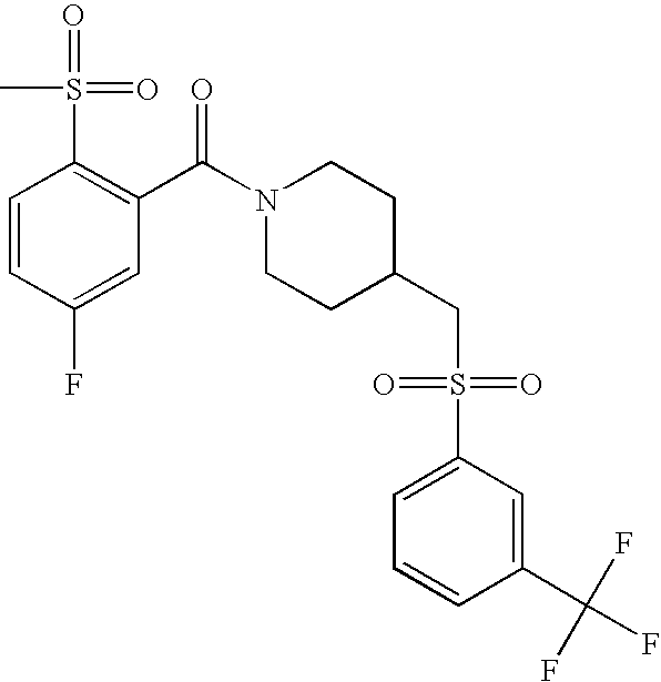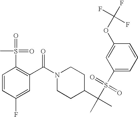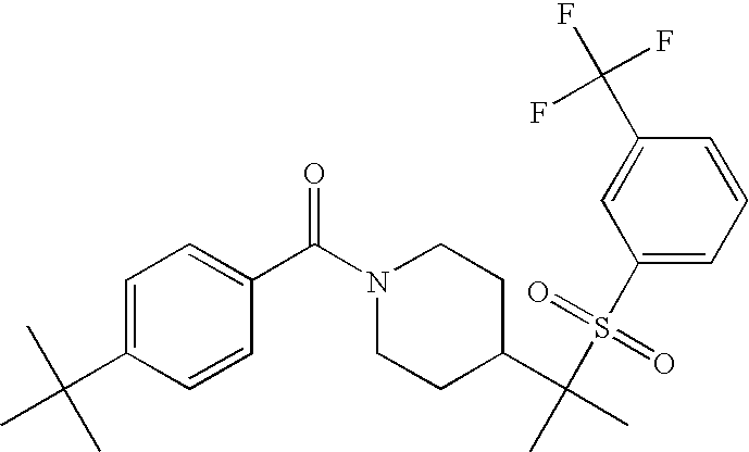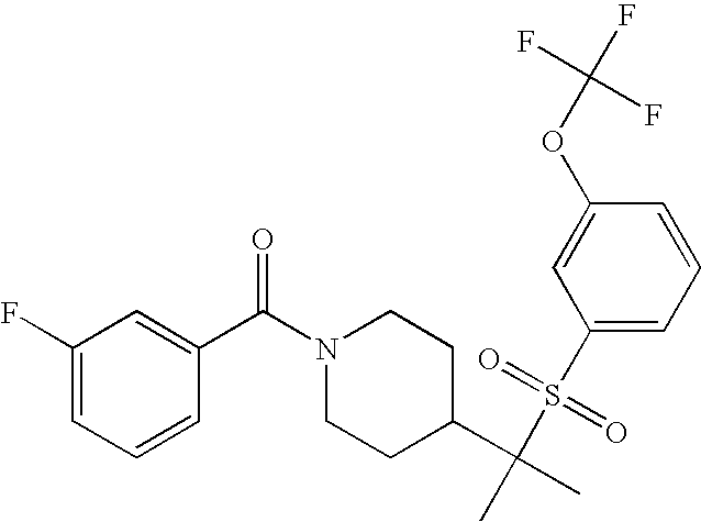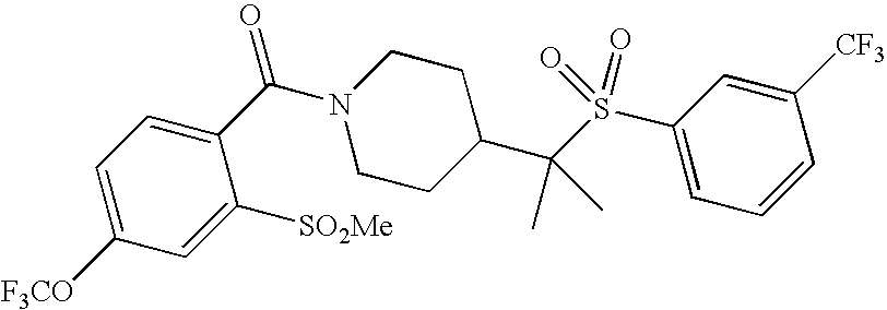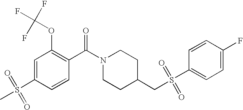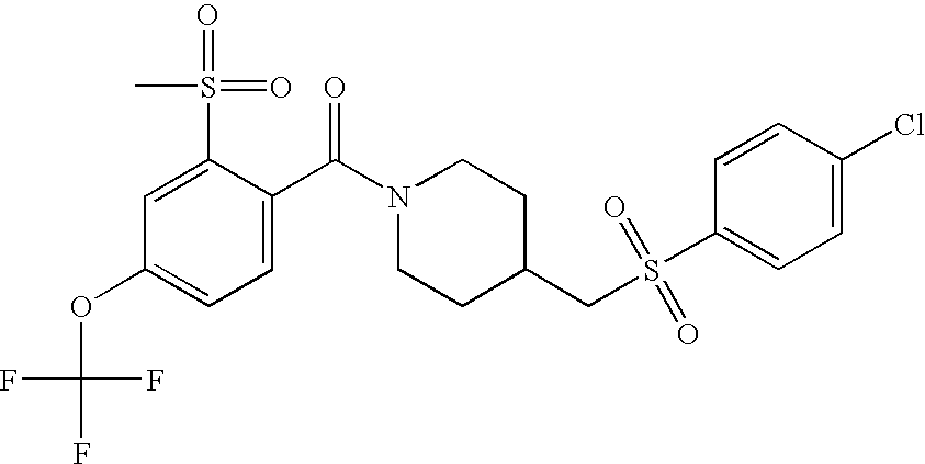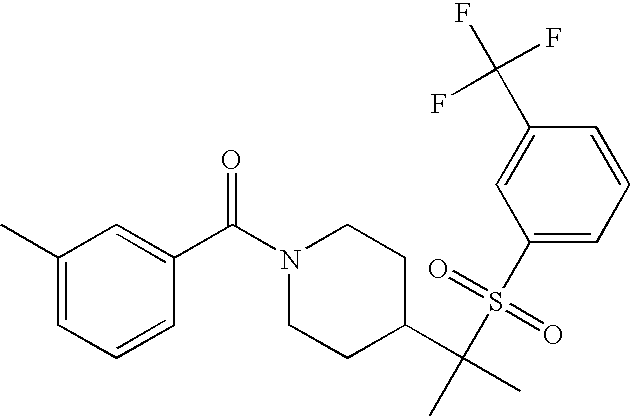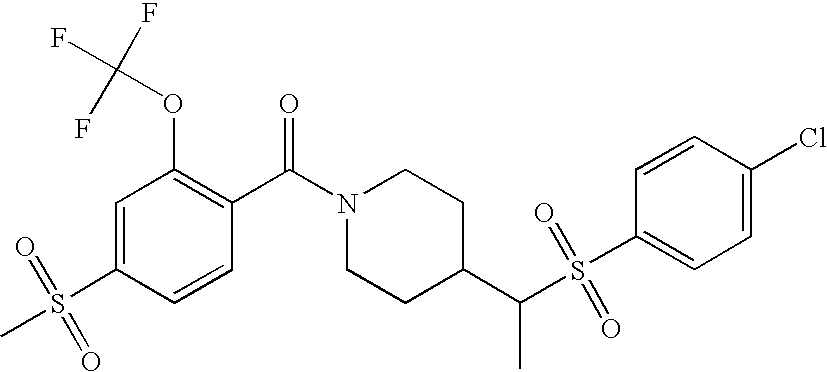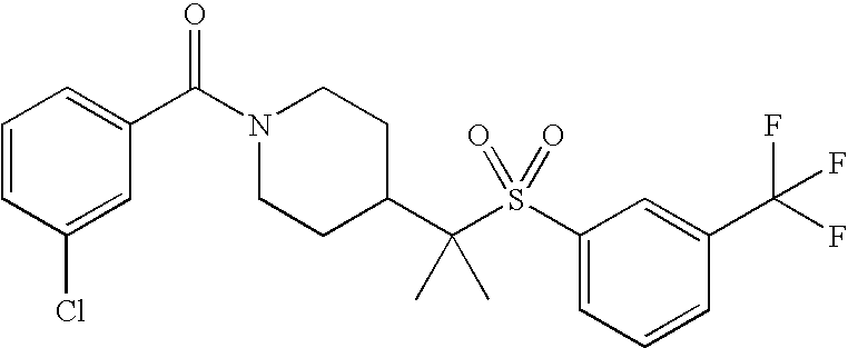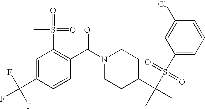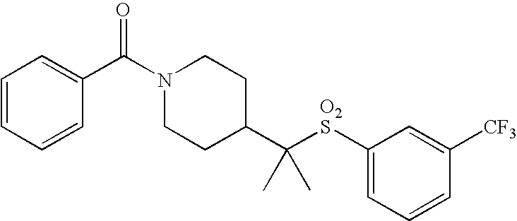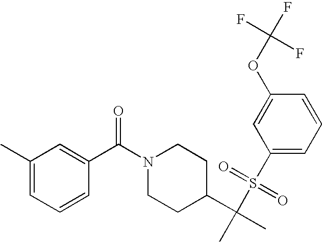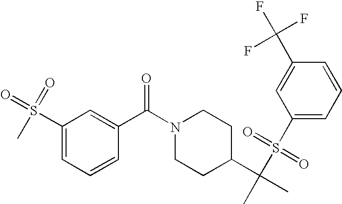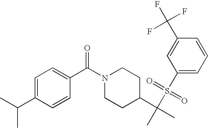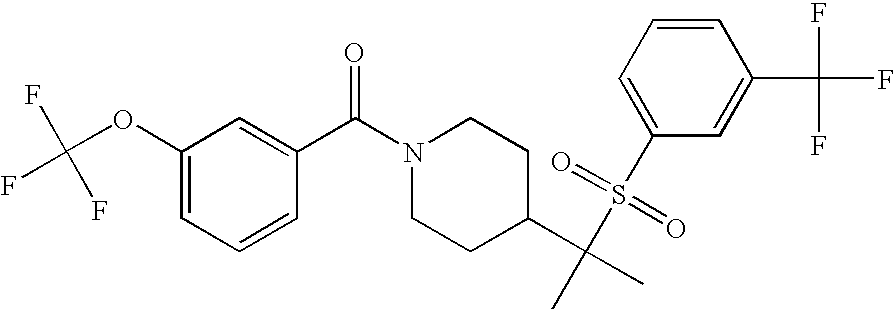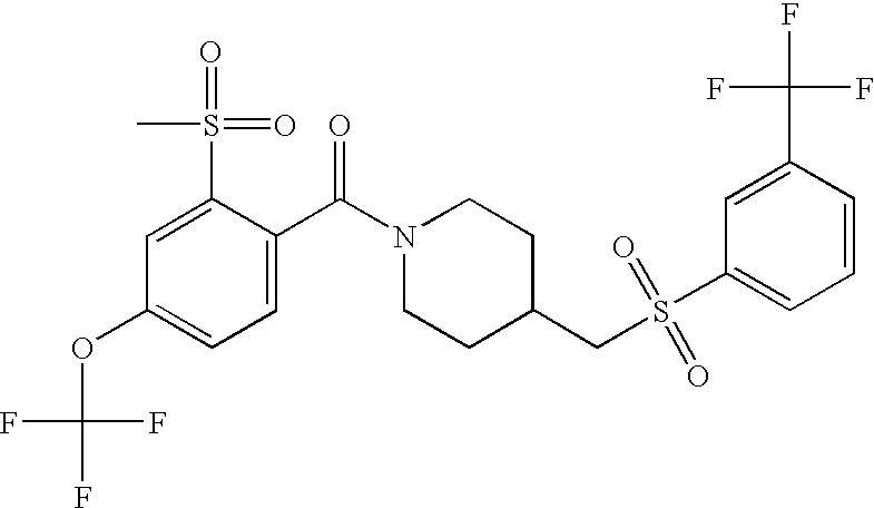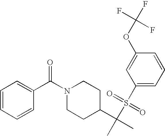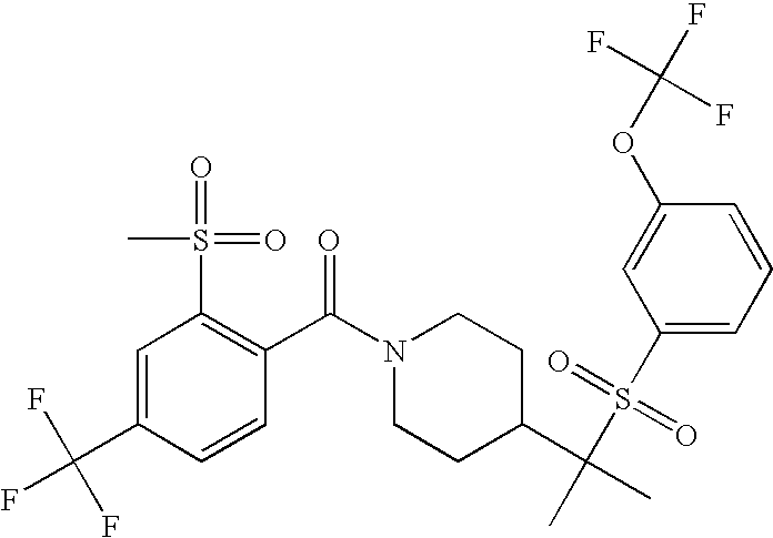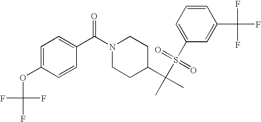 9 1-[4-(methylsulfonyl)-2- (trifluoromethoxy)benzoyl]- 4-({[3-(trifluoromethyl)- phenyl]sulfonyl}methyl)- piperidine 574 10 1-[5-fluoro-2- (methylsulfonyl)benzoyl]-4- ({[3-(trifluoromethyl)- phenyl]sulfonyl}methyl) piperidine 508 11 1-[2-(methylsulfonyl)-4- (trifluoromethyl)benzoyl]- 4-({[3-(trifluoromethyl)- phenyl]sulfonyl}methyl)- piperidine 558 12 1-[2-chloro-4- (methylsulfonyl)benzoyl]-4- ({[3-(trifluoromethyl)- phenyl]sulfonyl}methyl) piperidine 524 13 1-[5-fluoro-2-(methyl- sulfonyl)benzoyl]-4- ({[4-fluorophenyl)sulfonyl]- methyl}piperdinehyl} piperidine 458 14 4-{[(4-fluorophenyl)- sulfonyl]methyl}-1-[4- (methylsulfonyl)-2- (trifluoromethoxy)benzoyl] piperidine 524 15 4-{[(4-chlorophenyl)- sulfonyl]methyl}-1-[5- fluoro-2-(methyl- sulfonyl)benzoyl]piperidine 475 16 4-{[(4- chlorophenyl)sulfonyl] methyl}-1-[4-(methylsulfonyl)-2- (trifluoromethoxy)benzoyl] piperidine 541 17 4-{[(3- chlorophenyl)sulfonyl]methyl}- 1-[4-(methylsulfonyl)-2- (trifluoromethoxy)benzoyl] piperidine 541 18 1-(3,5-di-tert-butyl-4- methoxybenzoyl)-4-{[(4- fluorophenyl)sulfonyl]methyl} piperidine 504 19 4-{[(4- chlorophenyl)sulfonyl]methyl}- 1-(3,5-di-tert-butyl-4- methoxybenzoyl)piperidine 520 20 1-[4-(difluoromethoxy)-2- (methylsulfonyl)benzoyl]-4- ({[3-(trifluoromethyl)- phenyl]sulfonyl}methyl) piperidine 556 21 4-{[(4-fluorophenyl)- sulfonyl]methyl}-1-[2- (methylsulfonyl)-4- (trifluoromethyl)benzoyl] piperidine 508 22 1-[4-(difluoromethoxy)-2- (methylsulfonyl)benzoyl]-4- {[(4- fluorophenyl)sulfonyl]methyl} piperidine 506 23 4-{[(4- chlorophenyl)sulfonyl]methyl}- 1-[2-(methylsulfonyl)-4- (trifluoromethyl)benzoyl] piperidine 524 24 4-{[(4- chlorophenyl)sulfonyl]methy1}-1- [4-(difluoromethoxy)-2- (methylsulfonyl)benzoyl] piperidine 522 25 1-[2-(methylsulfonyl)-4- (trifluoromethoxy)benzoyl]- 4-({{3- (trifluoromethyl)phenyl] sulfonyl}methyl)piperidine 574 26 4-{[(4- chlorophenyl)sulfonyl]methyl}- 1-[2-(methylsulfonyl)-4- (trifluoromethoxy)benzoyl] piperidine 540 27 4-{[(4- fluorophenyl)sulfonyl]methyl}- 1-[2-(methylsulfonyl)-4- (trifluoromethoxy)benzoyl] piperidine 524 28 1-[4-(methylsulfonyl)-2- (trifluoromethoxy)benzoyl]- 4-(1-{[3-(trifluoromethyl) phenyl]sulfonyl}ethyl) piperidine 588 29 1-[4-(methylsulfonyl)-2- (trifluoromethoxy)benzoyl]- 4-((1S)-1-{[3-(trifluoromethyl) phenyl]sulfonyl}ethyl)piperidine 588 30 1-[4-(methylsulfonyl)-2- (trifluoromethoxy)benzoyl]- 4-((1R)-1-{[3- (trifluoromethyl) phenyl]sulfonyl} ethyl)piperidine 588 31 4-{1-[(4- fluorophenyl)sulfonyl]ethyl}-1- [4-(methylsulfonyl)-2- (trifluoromethoxy)benzoyl] piperidine 538 32 4-{1-[(4- chlorophenyl)sulfonyl]ethyl}- 1-[4-(methylsulfonyl)-2- (trifluoromethoxy)benzoyl] piperidine 555 33 4-{1-[(4- chlorophenyl)sulfonyl]ethyl}- 1-[5-fluoro-2-(methylsulfonyl) benzoyl]piperidine 488 34 1-[5-fluoro-2- (methylsulfonyl)benzoyl]- 4-(1-{[3-(trifluoromethyl)phenyl] sulfonyl}ethyl)piperidine 522 35 1-[2-(methylsulfonyl)-4- (trifluoromethyl)benzoyl]- 4-(1-{[3- (trifluoromethyl) phenyl]sulfonyl} ethyl)piperidine 572 36 tert-butyl4-(1-{[3- (trifluoromethyl)phenyl] sulfonyl}ethyl)piperidine-1- carboxylate 422 37 1-[2-(methylsulfonyl)-4- (trifluoromethoxy)benzoyl]- 4-((1S)-1-{[3- (trifluoromethyl)phenyl] sulfonyl}ethyl)piperidine 588 38 1-[4-(difluoromethoxy)-2- (methylsulfonyl)benzoyl]- 4-((1S)-1-{[3- (trifluoromethyl)phenyl] sulfonyl}ethyl)piperidine 570 39 1-[2-(methylsulfonyl)-4- (trifluoromethoxy)benzoyl]- 4-((1R)-1-{[3- trifluoromethyl)phenyl] sulfonyl}ethyl)piperidine 588 40 1-[4-(difluoromethoxy)-2- (methylsulfonyl)benzoyl]- 4-((1R)-1-{[3- (trifluoromethyl)phenyl] sulfonyl}ethyl)piperidine 570 41 1-[4-(cyclopropyloxy)-2,6- bis(methylsulfonyl)benzoyl]- 4-((1S)-1-{[3-(trifluoromethyl) phenyl] sulfonyl}ethyl)piperidine 638 42 1-[4-(cyclopropyloxy)-2,6- bis(methylsulfonyl)benzoyl]- 4-((1R)-1-{[3- (trifluoromethyl)phenyl] sulfonyl}ethyl)piperidine 638 43 2-(cyclopropylsulfonyl)-6- (trifluoromethyl)-3- {[4-((1S)-1-{[3- (trifluoromethyl)phenyl] sulfonyl}ethyl)piperidin-1- yl]carbonyl}pyridine 599 44 2-(cyclopropylsulfonyl)-6- (trifluoromethyl)-3- {[4-((1R)-1-{[3- (trifluoromethyl)phenyl] sulfonyl}ethyl)piperidin-1- yl]carbonyl}pyridine 599 45 3-chloro-5- (trifluoromethyl)-2-{[4- ((1S)-1-{[3- (trifluoromethyl)phenyl] sulfonyl}ethyl)piperidin-1- yl]carbonyl}pyridine 529 46 3-chloro-5- (trifluoromethyl)-2-{[4- ((1S)-1-{[3- (trifluoromethyl)phenyl] sulfonyl}ethyl)piperidin-1- yl]carbonyl}pyridine 529 47 3-(methylsulfonyl)-5- (trifluoromethyl)-2-{[4- ((1S)-1-{[3- (trifluoromethyl)phenyl] sulfonyl}ethyl)piperidin-1- yl]carbonyl}pyridine 573 48 3-(methylsulfonyl)-5- (trifluoromethyl)-2-{[4- ((1S)-1-{[3- (trifluoromethyl)phenyl] sulfonyl}ethyl)piperidin-1- yl]carbonyl}pyridine 573 49 3-(cyclopropylsulfonyl)-5- (trifluoromethyl)-2- {[4-((1S)-1-{[3- (trifluoromethyl)phenyl] sulfonyl}ethyl)piperidin-1- yl]carbonyl}pyridine 599 50 3-(cyclopropylsulfonyl)-5- (trifluoromethyl)-2- {[4-((1S)-1-{[3- (trifluoromethyl)phenyl] sulfonyl}ethyl)piperidin-1- yl]carbonyl}pyridine 599 51 4-(cyclopropyl{[3- (trifluoromethyl)phenyl] sulfonyl}methyl)-1-[5-fluoro- 2- (methylsulfonyl)benzoyl] piperidine 548 52 4-(cyclopropyl{[3- (trifluoromethyl)phenyl] sulfonyl}methyl)-1-[4- (methylsulfonyl)-2- (trifluoromethoxy)benzoyl] piperidine 514 53 1-[4-(methylsulfonyl)-2- (trifluoromethoxy)benzoyl]- 4-(1-methyl-1-{[3- (trifluoromethyl)phenyl] sulfonyl}ethyl)piperidine 602 54 1-[2-(methylsulfonyl)-4 (trifluoromethyl)benzoyl]- 4-(1-methyl-1-{[3- (trifluoromethyl)phenyl] sulfonyl}ethyl)piperidine 586 55 1-[5-fluoro-2- (methylsulfonyl)benzoyl]- 4-(1-methyl-1-{[3- (trifluoromethyl)phenyl] sulfonyl}ethyl)piperidine 536 56 1-(3-fluorobenzoyl)-4-(1- methyl-1-{[3- (trifluoromethyl)phenyl] sulfonyl}ethyl)piperidine 458 57 1-(3-methylbenzoyl)-4- (1-methyl-1-{[3- (trifluoromethyl)phenyl] sulfonyl}ethyl)piperidine 454 58 1-(3-methoxybenzoyl)-4- (1-methyl-1-{[3- (trifluoromethyl)phenyl] sulfonyl}ethyl)piperidine 470 59 1-(4-isopropylbenzoyl)-4- (1-methyl-1-{[3- (trifluoromethyl)phenyl] sulfonyl}ethyl)piperidine 