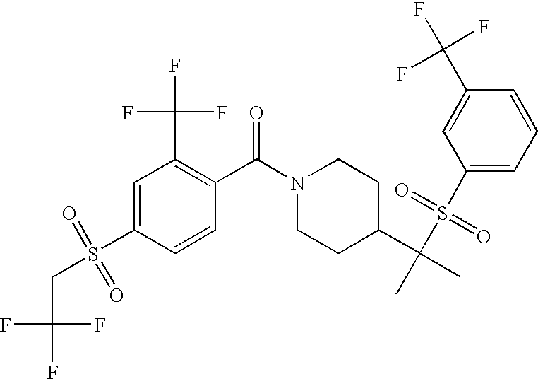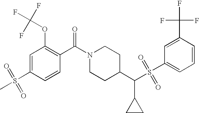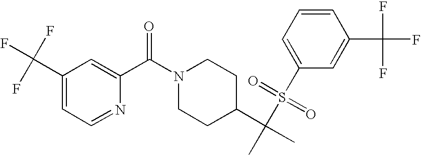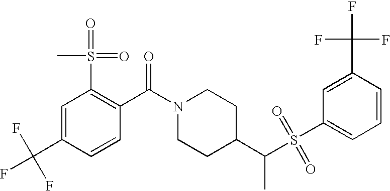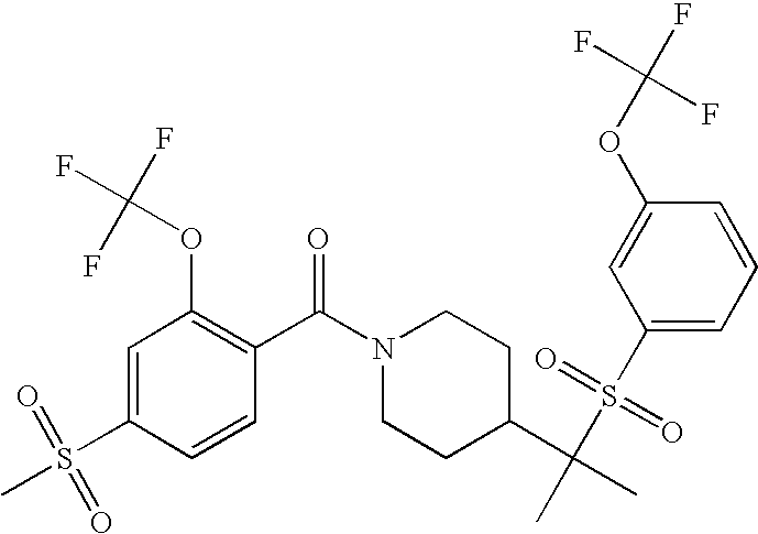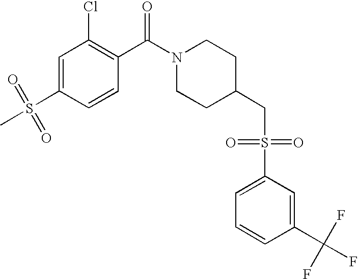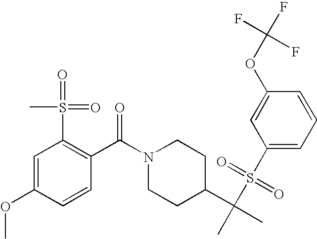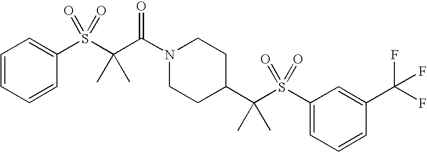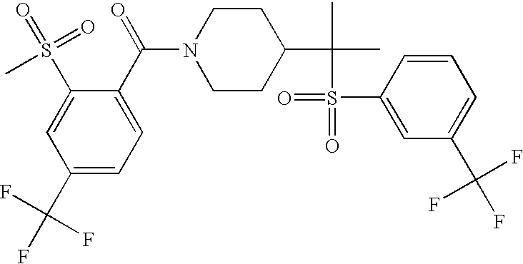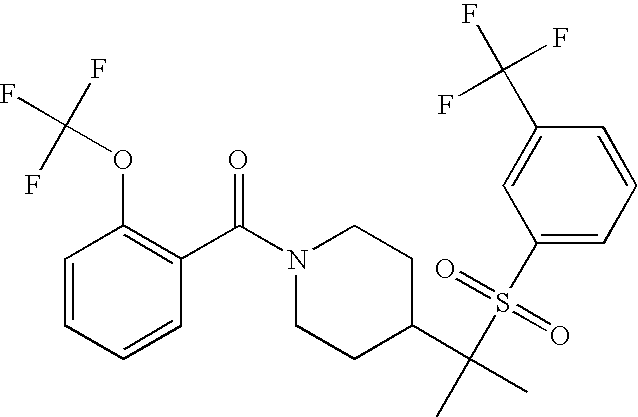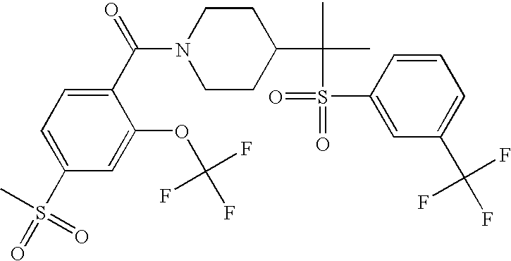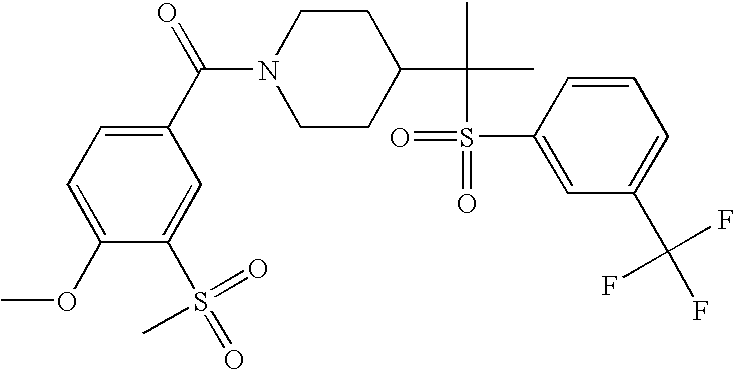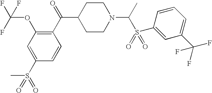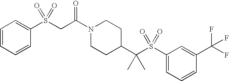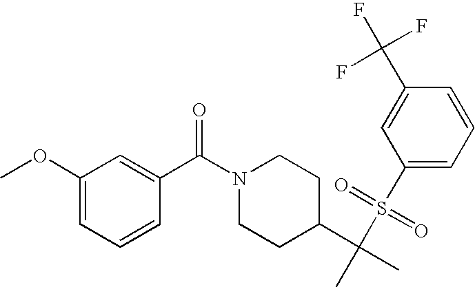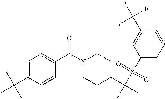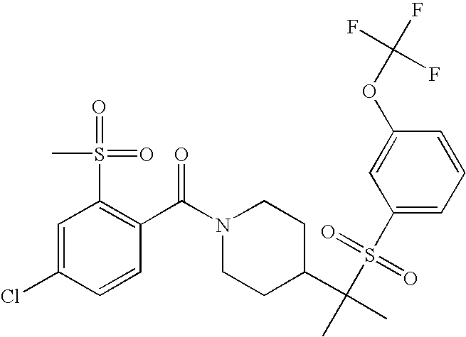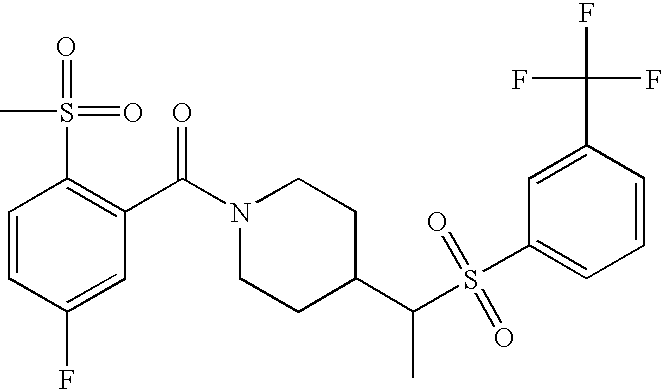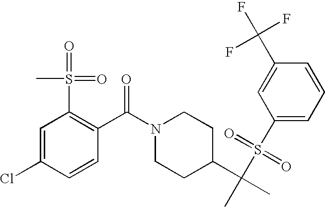 9 1-[4-(methylsulfonyl)-2- (trifluoromethoxy)benzoyl]- 4-({[3-(trifluoromethyl)- phenyl]sulfonyl}methyl)- piperidine 574 10 1-[5-fluoro-2- (methylsulfonyl)benzoyl]-4- ({[3-(trifluoromethyl)- phenyl]sulfonyl}methyl) piperidine 508 11 1-[2-(methylsulfonyl)-4- (trifluoromethyl)benzoyl]- 4-({[3-(trifluoromethyl)- phenyl]sulfonyl}methyl)- piperidine 558 12 1-[2-chloro-4- (methylsulfonyl)benzoyl]-4- ({[3-(trifluoromethyl)- phenyl]sulfonyl}methyl) piperidine 524 13 1-[5-fluoro-2-(methyl- sulfonyl)benzoyl]-4- ({[4-fluorophenyl)sulfonyl]- methyl}piperdinehyl} piperidine 458 14 4-{[(4-fluorophenyl)- sulfonyl]methyl}-1-[4- (methylsulfonyl)-2- (trifluoromethoxy)benzoyl] piperidine 524 15 4-{[(4-chlorophenyl)- sulfonyl]methyl}-1-[5- fluoro-2-(methyl- sulfonyl)benzoyl]piperidine 475 16 4-{[(4- chlorophenyl)sulfonyl] methyl}-1-[4-(methylsulfonyl)-2- (trifluoromethoxy)benzoyl] piperidine 541 17 4-{[(3- chlorophenyl)sulfonyl]methyl}- 1-[4-(methylsulfonyl)-2- (trifluoromethoxy)benzoyl] piperidine 541 18 1-(3,5-di-tert-butyl-4- methoxybenzoyl)-4-{[(4- fluorophenyl)sulfonyl]methyl} piperidine 504 19 4-{[(4- chlorophenyl)sulfonyl]methyl}- 1-(3,5-di-tert-butyl-4- methoxybenzoyl)piperidine 520 20 1-[4-(difluoromethoxy)-2- (methylsulfonyl)benzoyl]-4- ({[3-(trifluoromethyl)- phenyl]sulfonyl}methyl) piperidine 556 21 4-{[(4-fluorophenyl)- sulfonyl]methyl}-1-[2- (methylsulfonyl)-4- (trifluoromethyl)benzoyl] piperidine 508 22 1-[4-(difluoromethoxy)-2- (methylsulfonyl)benzoyl]-4- {[(4- fluorophenyl)sulfonyl]methyl} piperidine 506 23 4-{[(4- chlorophenyl)sulfonyl]methyl}- 1-[2-(methylsulfonyl)-4- (trifluoromethyl)benzoyl] piperidine 524 24 4-{[(4- chlorophenyl)sulfonyl]methy1}-1- [4-(difluoromethoxy)-2- (methylsulfonyl)benzoyl] piperidine 522 25 1-[2-(methylsulfonyl)-4- (trifluoromethoxy)benzoyl]- 4-({{3- (trifluoromethyl)phenyl] sulfonyl}methyl)piperidine 574 26 4-{[(4- chlorophenyl)sulfonyl]methyl}- 1-[2-(methylsulfonyl)-4- (trifluoromethoxy)benzoyl] piperidine 540 27 4-{[(4- fluorophenyl)sulfonyl]methyl}- 1-[2-(methylsulfonyl)-4- (trifluoromethoxy)benzoyl] piperidine 524 28 1-[4-(methylsulfonyl)-2- (trifluoromethoxy)benzoyl]- 4-(1-{[3-(trifluoromethyl) phenyl]sulfonyl}ethyl) piperidine 588 29 1-[4-(methylsulfonyl)-2- (trifluoromethoxy)benzoyl]- 4-((1S)-1-{[3-(trifluoromethyl) phenyl]sulfonyl}ethyl)piperidine 588 30 1-[4-(methylsulfonyl)-2- (trifluoromethoxy)benzoyl]- 4-((1R)-1-{[3- (trifluoromethyl) phenyl]sulfonyl} ethyl)piperidine 588 31 4-{1-[(4- fluorophenyl)sulfonyl]ethyl}-1- [4-(methylsulfonyl)-2- (trifluoromethoxy)benzoyl] piperidine 538 32 4-{1-[(4- chlorophenyl)sulfonyl]ethyl}- 1-[4-(methylsulfonyl)-2- (trifluoromethoxy)benzoyl] piperidine 555 33 4-{1-[(4- chlorophenyl)sulfonyl]ethyl}- 1-[5-fluoro-2-(methylsulfonyl) benzoyl]piperidine 488 34 1-[5-fluoro-2- (methylsulfonyl)benzoyl]- 4-(1-{[3-(trifluoromethyl)phenyl] sulfonyl}ethyl)piperidine 522 35 1-[2-(methylsulfonyl)-4- (trifluoromethyl)benzoyl]- 4-(1-{[3- (trifluoromethyl) phenyl]sulfonyl} ethyl)piperidine 572 36 tert-butyl4-(1-{[3- (trifluoromethyl)phenyl] sulfonyl}ethyl)piperidine-1- carboxylate 422 37 1-[2-(methylsulfonyl)-4- (trifluoromethoxy)benzoyl]- 4-((1S)-1-{[3- (trifluoromethyl)phenyl] sulfonyl}ethyl)piperidine 588 38 1-[4-(difluoromethoxy)-2- (methylsulfonyl)benzoyl]- 4-((1S)-1-{[3- (trifluoromethyl)phenyl] sulfonyl}ethyl)piperidine 570 39 1-[2-(methylsulfonyl)-4- (trifluoromethoxy)benzoyl]- 4-((1R)-1-{[3- trifluoromethyl)phenyl] sulfonyl}ethyl)piperidine 588 40 1-[4-(difluoromethoxy)-2- (methylsulfonyl)benzoyl]- 4-((1R)-1-{[3- (trifluoromethyl)phenyl] sulfonyl}ethyl)piperidine 570 41 1-[4-(cyclopropyloxy)-2,6- bis(methylsulfonyl)benzoyl]- 4-((1S)-1-{[3-(trifluoromethyl) phenyl] sulfonyl}ethyl)piperidine 638 42 1-[4-(cyclopropyloxy)-2,6- bis(methylsulfonyl)benzoyl]- 4-((1R)-1-{[3- (trifluoromethyl)phenyl] sulfonyl}ethyl)piperidine 638 43 2-(cyclopropylsulfonyl)-6- (trifluoromethyl)-3- {[4-((1S)-1-{[3- (trifluoromethyl)phenyl] sulfonyl}ethyl)piperidin-1- yl]carbonyl}pyridine 599 44 2-(cyclopropylsulfonyl)-6- (trifluoromethyl)-3- {[4-((1R)-1-{[3- (trifluoromethyl)phenyl] sulfonyl}ethyl)piperidin-1- yl]carbonyl}pyridine 599 45 3-chloro-5- (trifluoromethyl)-2-{[4- ((1S)-1-{[3- (trifluoromethyl)phenyl] sulfonyl}ethyl)piperidin-1- yl]carbonyl}pyridine 529 46 3-chloro-5- (trifluoromethyl)-2-{[4- ((1S)-1-{[3- (trifluoromethyl)phenyl] sulfonyl}ethyl)piperidin-1- yl]carbonyl}pyridine 529 47 3-(methylsulfonyl)-5- (trifluoromethyl)-2-{[4- ((1S)-1-{[3- (trifluoromethyl)phenyl] sulfonyl}ethyl)piperidin-1- yl]carbonyl}pyridine 573 48 3-(methylsulfonyl)-5- (trifluoromethyl)-2-{[4- ((1S)-1-{[3- (trifluoromethyl)phenyl] sulfonyl}ethyl)piperidin-1- yl]carbonyl}pyridine 573 49 3-(cyclopropylsulfonyl)-5- (trifluoromethyl)-2- {[4-((1S)-1-{[3- (trifluoromethyl)phenyl] sulfonyl}ethyl)piperidin-1- yl]carbonyl}pyridine 599 50 3-(cyclopropylsulfonyl)-5- (trifluoromethyl)-2- {[4-((1S)-1-{[3- (trifluoromethyl)phenyl] sulfonyl}ethyl)piperidin-1- yl]carbonyl}pyridine 599 51 4-(cyclopropyl{[3- (trifluoromethyl)phenyl] sulfonyl}methyl)-1-[5-fluoro- 2- (methylsulfonyl)benzoyl] piperidine 548 52 4-(cyclopropyl{[3- (trifluoromethyl)phenyl] sulfonyl}methyl)-1-[4- (methylsulfonyl)-2- (trifluoromethoxy)benzoyl] piperidine 514 53 1-[4-(methylsulfonyl)-2- (trifluoromethoxy)benzoyl]- 4-(1-methyl-1-{[3- (trifluoromethyl)phenyl] sulfonyl}ethyl)piperidine 602 54 1-[2-(methylsulfonyl)-4 (trifluoromethyl)benzoyl]- 4-(1-methyl-1-{[3- (trifluoromethyl)phenyl] sulfonyl}ethyl)piperidine 586 55 1-[5-fluoro-2- (methylsulfonyl)benzoyl]- 4-(1-methyl-1-{[3- (trifluoromethyl)phenyl] sulfonyl}ethyl)piperidine 536 56 1-(3-fluorobenzoyl)-4-(1- methyl-1-{[3- (trifluoromethyl)phenyl] sulfonyl}ethyl)piperidine 458 57 1-(3-methylbenzoyl)-4- (1-methyl-1-{[3- (trifluoromethyl)phenyl] sulfonyl}ethyl)piperidine 454 58 1-(3-methoxybenzoyl)-4- (1-methyl-1-{[3- (trifluoromethyl)phenyl] sulfonyl}ethyl)piperidine 470 59 1-(4-isopropylbenzoyl)-4- (1-methyl-1-{[3- (trifluoromethyl)phenyl] sulfonyl}ethyl)piperidine 