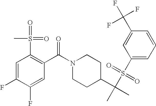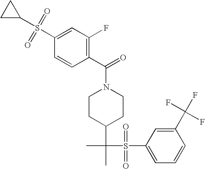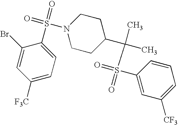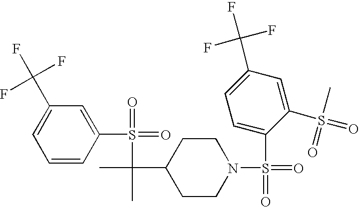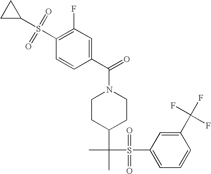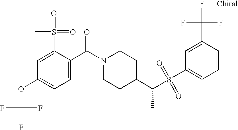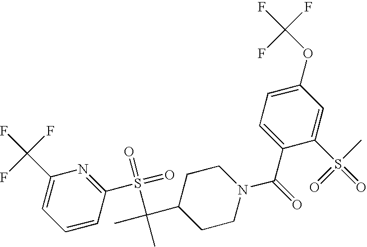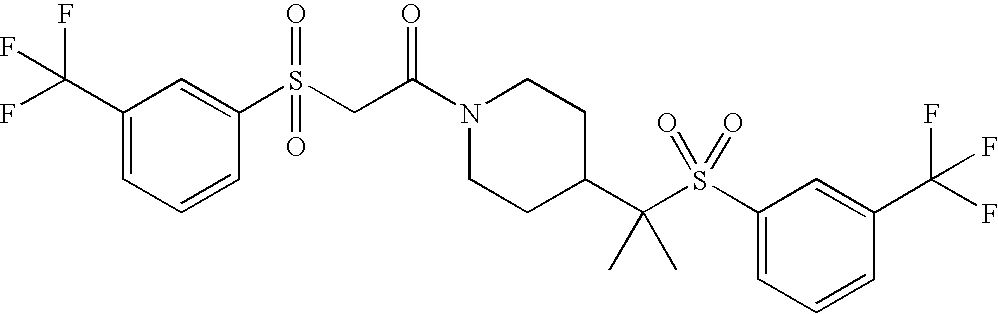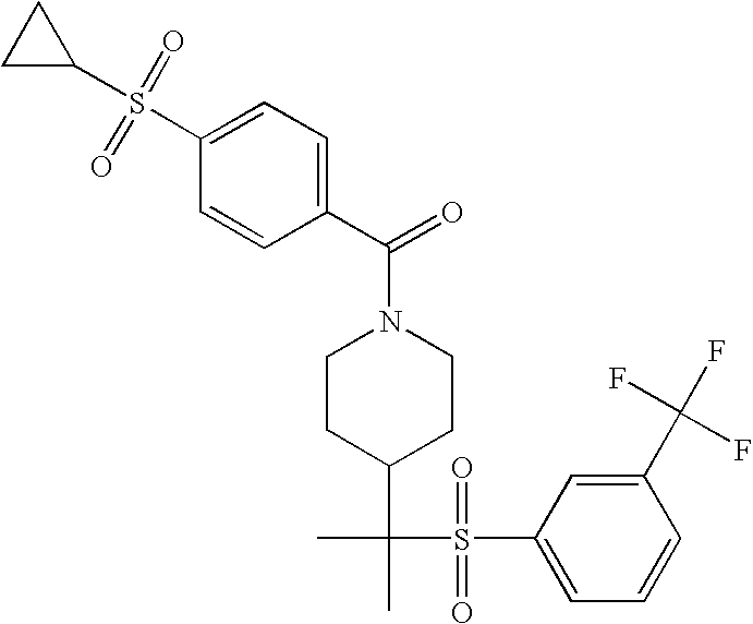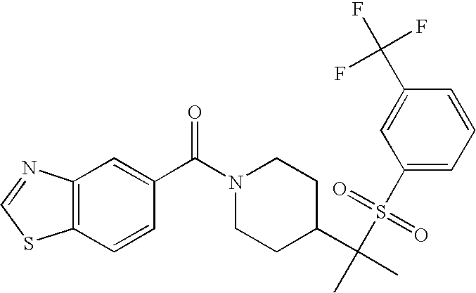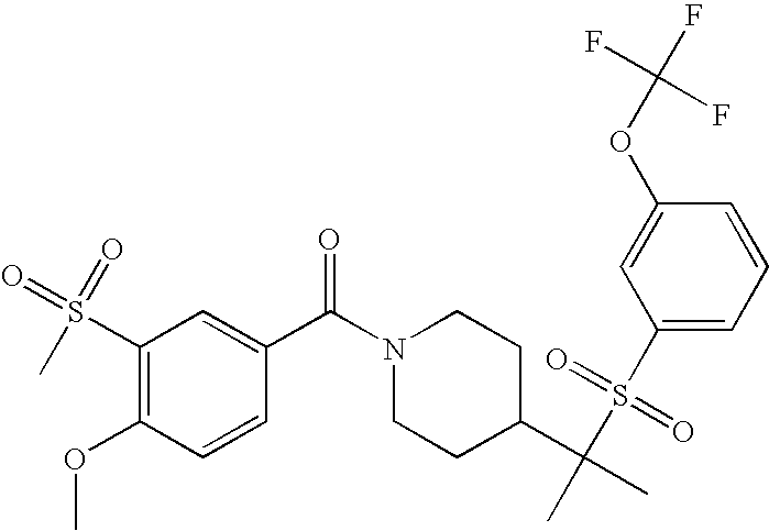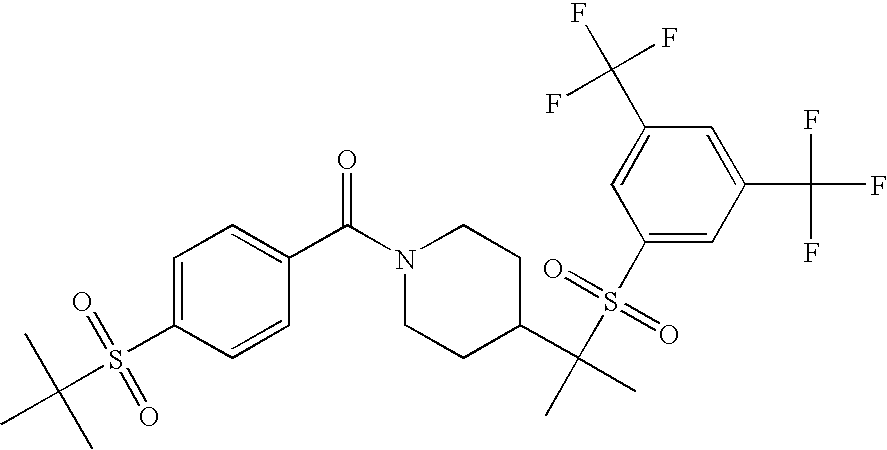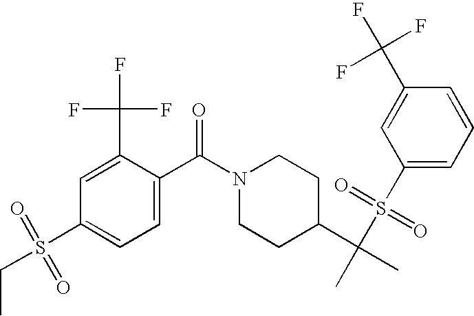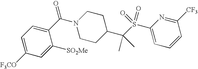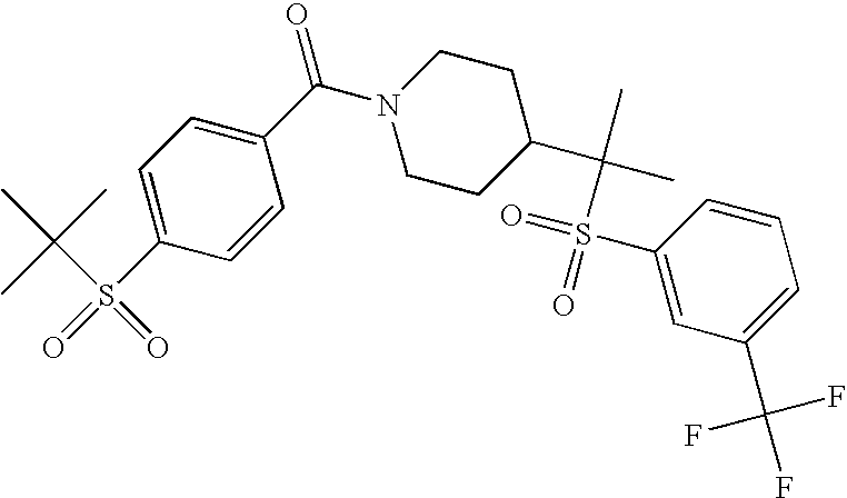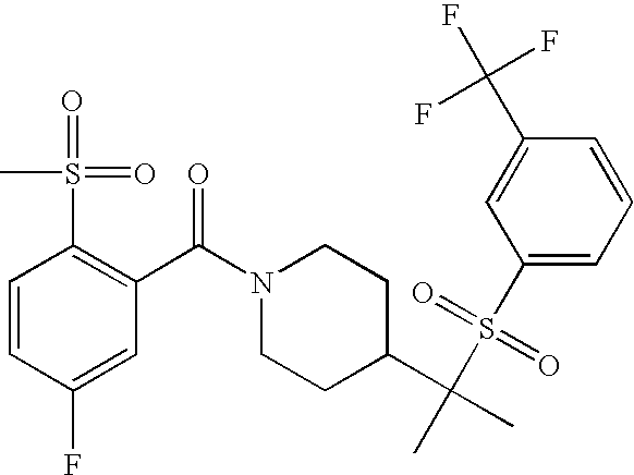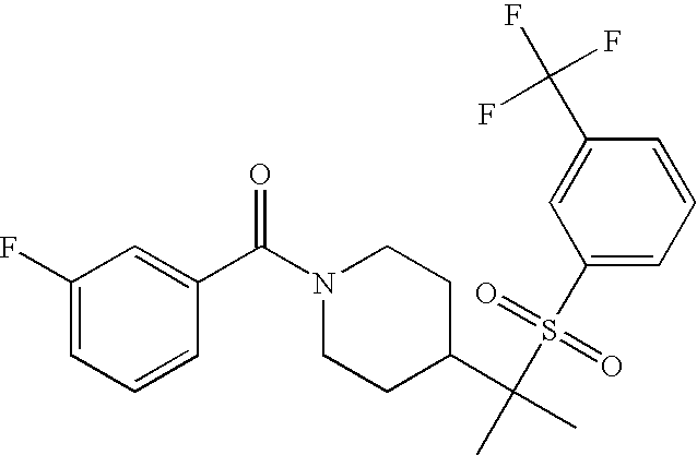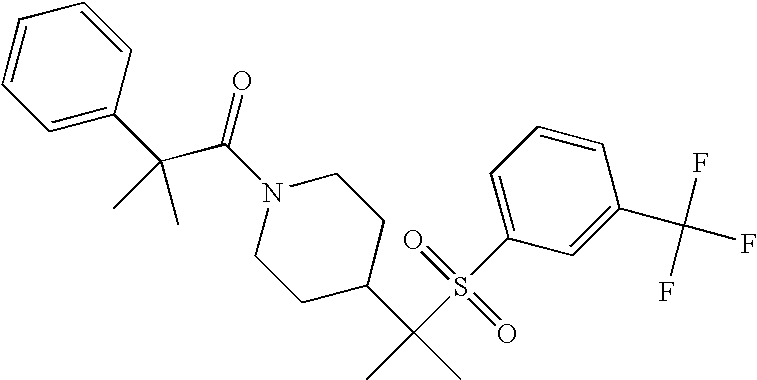 9 1-[4-(methylsulfonyl)-2- (trifluoromethoxy)benzoyl]- 4-({[3-(trifluoromethyl)- phenyl]sulfonyl}methyl)- piperidine 574 10 1-[5-fluoro-2- (methylsulfonyl)benzoyl]-4- ({[3-(trifluoromethyl)- phenyl]sulfonyl}methyl) piperidine 508 11 1-[2-(methylsulfonyl)-4- (trifluoromethyl)benzoyl]- 4-({[3-(trifluoromethyl)- phenyl]sulfonyl}methyl)- piperidine 558 12 1-[2-chloro-4- (methylsulfonyl)benzoyl]-4- ({[3-(trifluoromethyl)- phenyl]sulfonyl}methyl) piperidine 524 13 1-[5-fluoro-2-(methyl- sulfonyl)benzoyl]-4- ({[4-fluorophenyl)sulfonyl]- methyl}piperdinehyl} piperidine 458 14 4-{[(4-fluorophenyl)- sulfonyl]methyl}-1-[4- (methylsulfonyl)-2- (trifluoromethoxy)benzoyl] piperidine 524 15 4-{[(4-chlorophenyl)- sulfonyl]methyl}-1-[5- fluoro-2-(methyl- sulfonyl)benzoyl]piperidine 475 16 4-{[(4- chlorophenyl)sulfonyl] methyl}-1-[4-(methylsulfonyl)-2- (trifluoromethoxy)benzoyl] piperidine 541 17 4-{[(3- chlorophenyl)sulfonyl]methyl}- 1-[4-(methylsulfonyl)-2- (trifluoromethoxy)benzoyl] piperidine 541 18 1-(3,5-di-tert-butyl-4- methoxybenzoyl)-4-{[(4- fluorophenyl)sulfonyl]methyl} piperidine 504 19 4-{[(4- chlorophenyl)sulfonyl]methyl}- 1-(3,5-di-tert-butyl-4- methoxybenzoyl)piperidine 520 20 1-[4-(difluoromethoxy)-2- (methylsulfonyl)benzoyl]-4- ({[3-(trifluoromethyl)- phenyl]sulfonyl}methyl) piperidine 556 21 4-{[(4-fluorophenyl)- sulfonyl]methyl}-1-[2- (methylsulfonyl)-4- (trifluoromethyl)benzoyl] piperidine 508 22 1-[4-(difluoromethoxy)-2- (methylsulfonyl)benzoyl]-4- {[(4- fluorophenyl)sulfonyl]methyl} piperidine 506 23 4-{[(4- chlorophenyl)sulfonyl]methyl}- 1-[2-(methylsulfonyl)-4- (trifluoromethyl)benzoyl] piperidine 524 24 4-{[(4- chlorophenyl)sulfonyl]methy1}-1- [4-(difluoromethoxy)-2- (methylsulfonyl)benzoyl] piperidine 522 25 1-[2-(methylsulfonyl)-4- (trifluoromethoxy)benzoyl]- 4-({{3- (trifluoromethyl)phenyl] sulfonyl}methyl)piperidine 574 26 4-{[(4- chlorophenyl)sulfonyl]methyl}- 1-[2-(methylsulfonyl)-4- (trifluoromethoxy)benzoyl] piperidine 540 27 4-{[(4- fluorophenyl)sulfonyl]methyl}- 1-[2-(methylsulfonyl)-4- (trifluoromethoxy)benzoyl] piperidine 524 28 1-[4-(methylsulfonyl)-2- (trifluoromethoxy)benzoyl]- 4-(1-{[3-(trifluoromethyl) phenyl]sulfonyl}ethyl) piperidine 588 29 1-[4-(methylsulfonyl)-2- (trifluoromethoxy)benzoyl]- 4-((1S)-1-{[3-(trifluoromethyl) phenyl]sulfonyl}ethyl)piperidine 588 30 1-[4-(methylsulfonyl)-2- (trifluoromethoxy)benzoyl]- 4-((1R)-1-{[3- (trifluoromethyl) phenyl]sulfonyl} ethyl)piperidine 588 31 4-{1-[(4- fluorophenyl)sulfonyl]ethyl}-1- [4-(methylsulfonyl)-2- (trifluoromethoxy)benzoyl] piperidine 538 32 4-{1-[(4- chlorophenyl)sulfonyl]ethyl}- 1-[4-(methylsulfonyl)-2- (trifluoromethoxy)benzoyl] piperidine 555 33 4-{1-[(4- chlorophenyl)sulfonyl]ethyl}- 1-[5-fluoro-2-(methylsulfonyl) benzoyl]piperidine 488 34 1-[5-fluoro-2- (methylsulfonyl)benzoyl]- 4-(1-{[3-(trifluoromethyl)phenyl] sulfonyl}ethyl)piperidine 522 35 1-[2-(methylsulfonyl)-4- (trifluoromethyl)benzoyl]- 4-(1-{[3- (trifluoromethyl) phenyl]sulfonyl} ethyl)piperidine 572 36 tert-butyl4-(1-{[3- (trifluoromethyl)phenyl] sulfonyl}ethyl)piperidine-1- carboxylate 422 37 1-[2-(methylsulfonyl)-4- (trifluoromethoxy)benzoyl]- 4-((1S)-1-{[3- (trifluoromethyl)phenyl] sulfonyl}ethyl)piperidine 588 38 1-[4-(difluoromethoxy)-2- (methylsulfonyl)benzoyl]- 4-((1S)-1-{[3- (trifluoromethyl)phenyl] sulfonyl}ethyl)piperidine 570 39 1-[2-(methylsulfonyl)-4- (trifluoromethoxy)benzoyl]- 4-((1R)-1-{[3- trifluoromethyl)phenyl] sulfonyl}ethyl)piperidine 588 40 1-[4-(difluoromethoxy)-2- (methylsulfonyl)benzoyl]- 4-((1R)-1-{[3- (trifluoromethyl)phenyl] sulfonyl}ethyl)piperidine 570 41 1-[4-(cyclopropyloxy)-2,6- bis(methylsulfonyl)benzoyl]- 4-((1S)-1-{[3-(trifluoromethyl) phenyl] sulfonyl}ethyl)piperidine 638 42 1-[4-(cyclopropyloxy)-2,6- bis(methylsulfonyl)benzoyl]- 4-((1R)-1-{[3- (trifluoromethyl)phenyl] sulfonyl}ethyl)piperidine 638 43 2-(cyclopropylsulfonyl)-6- (trifluoromethyl)-3- {[4-((1S)-1-{[3- (trifluoromethyl)phenyl] sulfonyl}ethyl)piperidin-1- yl]carbonyl}pyridine 599 44 2-(cyclopropylsulfonyl)-6- (trifluoromethyl)-3- {[4-((1R)-1-{[3- (trifluoromethyl)phenyl] sulfonyl}ethyl)piperidin-1- yl]carbonyl}pyridine 599 45 3-chloro-5- (trifluoromethyl)-2-{[4- ((1S)-1-{[3- (trifluoromethyl)phenyl] sulfonyl}ethyl)piperidin-1- yl]carbonyl}pyridine 529 46 3-chloro-5- (trifluoromethyl)-2-{[4- ((1S)-1-{[3- (trifluoromethyl)phenyl] sulfonyl}ethyl)piperidin-1- yl]carbonyl}pyridine 529 47 3-(methylsulfonyl)-5- (trifluoromethyl)-2-{[4- ((1S)-1-{[3- (trifluoromethyl)phenyl] sulfonyl}ethyl)piperidin-1- yl]carbonyl}pyridine 573 48 3-(methylsulfonyl)-5- (trifluoromethyl)-2-{[4- ((1S)-1-{[3- (trifluoromethyl)phenyl] sulfonyl}ethyl)piperidin-1- yl]carbonyl}pyridine 573 49 3-(cyclopropylsulfonyl)-5- (trifluoromethyl)-2- {[4-((1S)-1-{[3- (trifluoromethyl)phenyl] sulfonyl}ethyl)piperidin-1- yl]carbonyl}pyridine 599 50 3-(cyclopropylsulfonyl)-5- (trifluoromethyl)-2- {[4-((1S)-1-{[3- (trifluoromethyl)phenyl] sulfonyl}ethyl)piperidin-1- yl]carbonyl}pyridine 599 51 4-(cyclopropyl{[3- (trifluoromethyl)phenyl] sulfonyl}methyl)-1-[5-fluoro- 2- (methylsulfonyl)benzoyl] piperidine 548 52 4-(cyclopropyl{[3- (trifluoromethyl)phenyl] sulfonyl}methyl)-1-[4- (methylsulfonyl)-2- (trifluoromethoxy)benzoyl] piperidine 514 53 1-[4-(methylsulfonyl)-2- (trifluoromethoxy)benzoyl]- 4-(1-methyl-1-{[3- (trifluoromethyl)phenyl] sulfonyl}ethyl)piperidine 602 54 1-[2-(methylsulfonyl)-4 (trifluoromethyl)benzoyl]- 4-(1-methyl-1-{[3- (trifluoromethyl)phenyl] sulfonyl}ethyl)piperidine 586 55 1-[5-fluoro-2- (methylsulfonyl)benzoyl]- 4-(1-methyl-1-{[3- (trifluoromethyl)phenyl] sulfonyl}ethyl)piperidine 536 56 1-(3-fluorobenzoyl)-4-(1- methyl-1-{[3- (trifluoromethyl)phenyl] sulfonyl}ethyl)piperidine 458 57 1-(3-methylbenzoyl)-4- (1-methyl-1-{[3- (trifluoromethyl)phenyl] sulfonyl}ethyl)piperidine 454 58 1-(3-methoxybenzoyl)-4- (1-methyl-1-{[3- (trifluoromethyl)phenyl] sulfonyl}ethyl)piperidine 470 59 1-(4-isopropylbenzoyl)-4- (1-methyl-1-{[3- (trifluoromethyl)phenyl] sulfonyl}ethyl)piperidine 