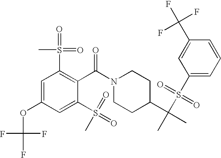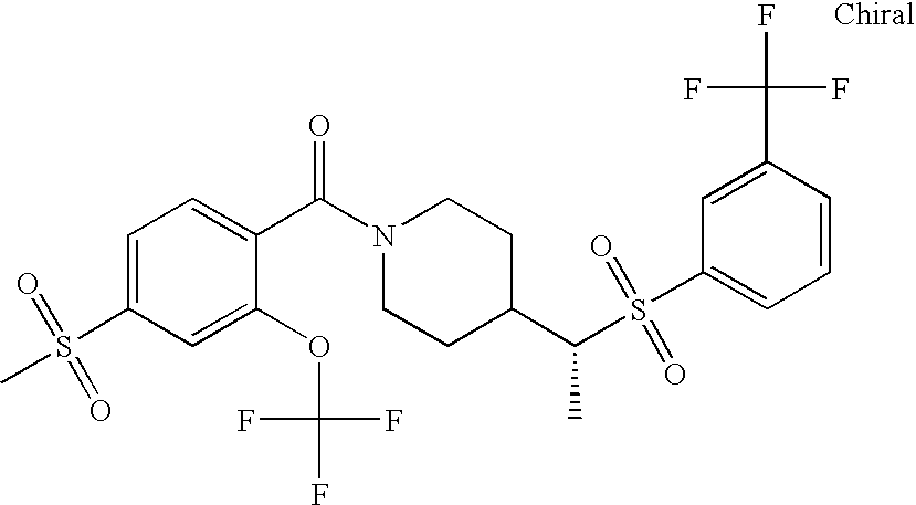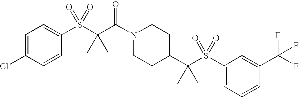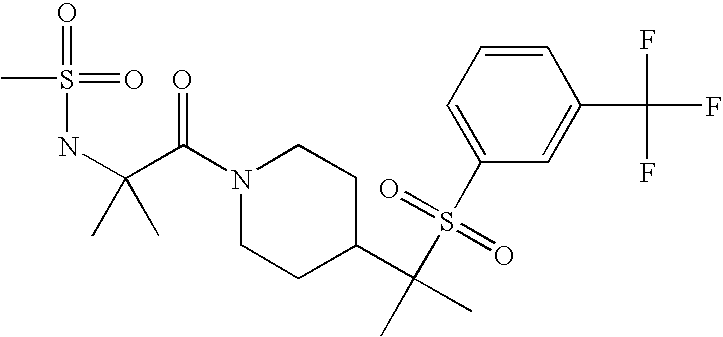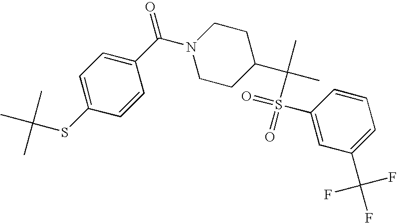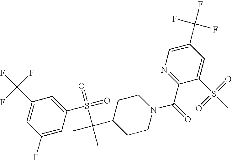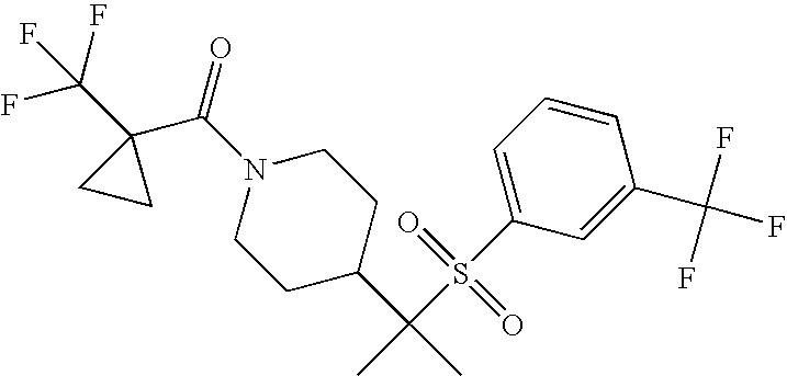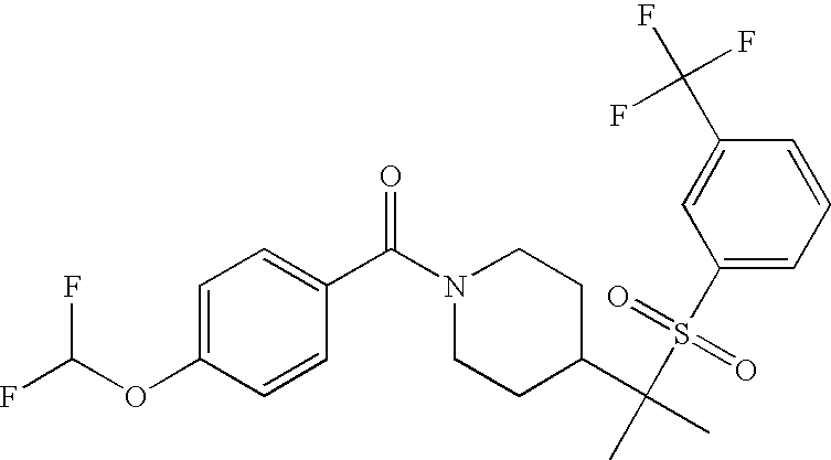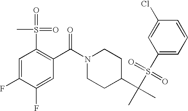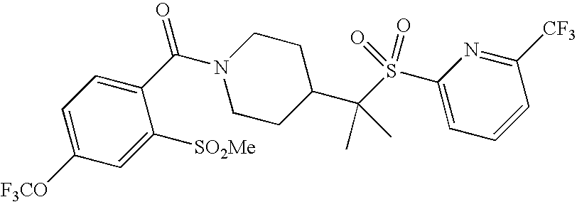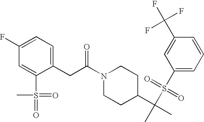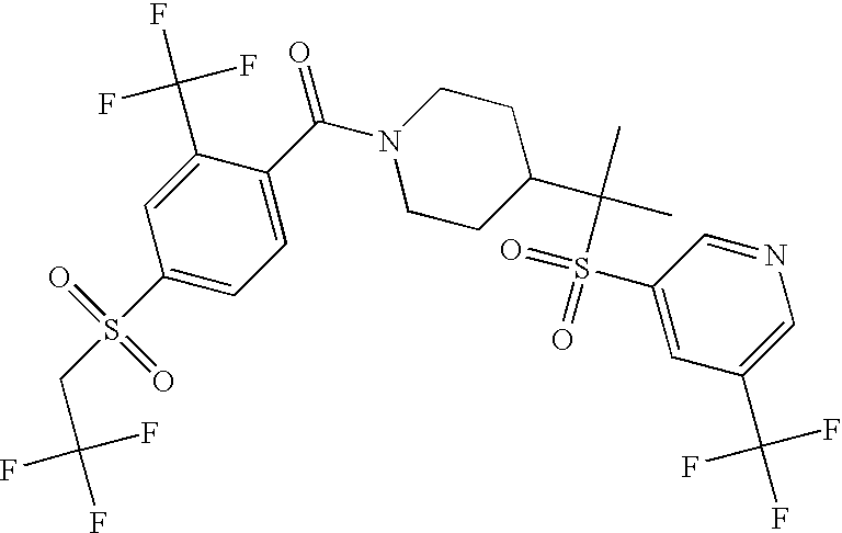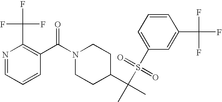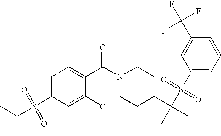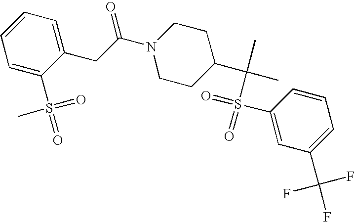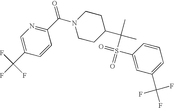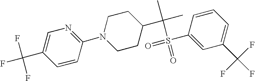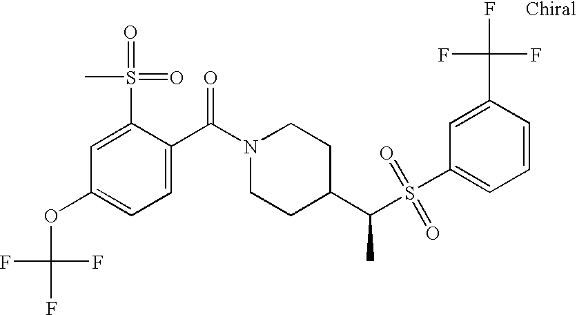 9 1-[4-(methylsulfonyl)-2- (trifluoromethoxy)benzoyl]- 4-({[3-(trifluoromethyl)- phenyl]sulfonyl}methyl)- piperidine 574 10 1-[5-fluoro-2- (methylsulfonyl)benzoyl]-4- ({[3-(trifluoromethyl)- phenyl]sulfonyl}methyl) piperidine 508 11 1-[2-(methylsulfonyl)-4- (trifluoromethyl)benzoyl]- 4-({[3-(trifluoromethyl)- phenyl]sulfonyl}methyl)- piperidine 558 12 1-[2-chloro-4- (methylsulfonyl)benzoyl]-4- ({[3-(trifluoromethyl)- phenyl]sulfonyl}methyl) piperidine 524 13 1-[5-fluoro-2-(methyl- sulfonyl)benzoyl]-4- ({[4-fluorophenyl)sulfonyl]- methyl}piperdinehyl} piperidine 458 14 4-{[(4-fluorophenyl)- sulfonyl]methyl}-1-[4- (methylsulfonyl)-2- (trifluoromethoxy)benzoyl] piperidine 524 15 4-{[(4-chlorophenyl)- sulfonyl]methyl}-1-[5- fluoro-2-(methyl- sulfonyl)benzoyl]piperidine 475 16 4-{[(4- chlorophenyl)sulfonyl] methyl}-1-[4-(methylsulfonyl)-2- (trifluoromethoxy)benzoyl] piperidine 541 17 4-{[(3- chlorophenyl)sulfonyl]methyl}- 1-[4-(methylsulfonyl)-2- (trifluoromethoxy)benzoyl] piperidine 541 18 1-(3,5-di-tert-butyl-4- methoxybenzoyl)-4-{[(4- fluorophenyl)sulfonyl]methyl} piperidine 504 19 4-{[(4- chlorophenyl)sulfonyl]methyl}- 1-(3,5-di-tert-butyl-4- methoxybenzoyl)piperidine 520 20 1-[4-(difluoromethoxy)-2- (methylsulfonyl)benzoyl]-4- ({[3-(trifluoromethyl)- phenyl]sulfonyl}methyl) piperidine 556 21 4-{[(4-fluorophenyl)- sulfonyl]methyl}-1-[2- (methylsulfonyl)-4- (trifluoromethyl)benzoyl] piperidine 508 22 1-[4-(difluoromethoxy)-2- (methylsulfonyl)benzoyl]-4- {[(4- fluorophenyl)sulfonyl]methyl} piperidine 506 23 4-{[(4- chlorophenyl)sulfonyl]methyl}- 1-[2-(methylsulfonyl)-4- (trifluoromethyl)benzoyl] piperidine 524 24 4-{[(4- chlorophenyl)sulfonyl]methy1}-1- [4-(difluoromethoxy)-2- (methylsulfonyl)benzoyl] piperidine 522 25 1-[2-(methylsulfonyl)-4- (trifluoromethoxy)benzoyl]- 4-({{3- (trifluoromethyl)phenyl] sulfonyl}methyl)piperidine 574 26 4-{[(4- chlorophenyl)sulfonyl]methyl}- 1-[2-(methylsulfonyl)-4- (trifluoromethoxy)benzoyl] piperidine 540 27 4-{[(4- fluorophenyl)sulfonyl]methyl}- 1-[2-(methylsulfonyl)-4- (trifluoromethoxy)benzoyl] piperidine 524 28 1-[4-(methylsulfonyl)-2- (trifluoromethoxy)benzoyl]- 4-(1-{[3-(trifluoromethyl) phenyl]sulfonyl}ethyl) piperidine 588 29 1-[4-(methylsulfonyl)-2- (trifluoromethoxy)benzoyl]- 4-((1S)-1-{[3-(trifluoromethyl) phenyl]sulfonyl}ethyl)piperidine 588 30 1-[4-(methylsulfonyl)-2- (trifluoromethoxy)benzoyl]- 4-((1R)-1-{[3- (trifluoromethyl) phenyl]sulfonyl} ethyl)piperidine 588 31 4-{1-[(4- fluorophenyl)sulfonyl]ethyl}-1- [4-(methylsulfonyl)-2- (trifluoromethoxy)benzoyl] piperidine 538 32 4-{1-[(4- chlorophenyl)sulfonyl]ethyl}- 1-[4-(methylsulfonyl)-2- (trifluoromethoxy)benzoyl] piperidine 555 33 4-{1-[(4- chlorophenyl)sulfonyl]ethyl}- 1-[5-fluoro-2-(methylsulfonyl) benzoyl]piperidine 488 34 1-[5-fluoro-2- (methylsulfonyl)benzoyl]- 4-(1-{[3-(trifluoromethyl)phenyl] sulfonyl}ethyl)piperidine 522 35 1-[2-(methylsulfonyl)-4- (trifluoromethyl)benzoyl]- 4-(1-{[3- (trifluoromethyl) phenyl]sulfonyl} ethyl)piperidine 572 36 tert-butyl4-(1-{[3- (trifluoromethyl)phenyl] sulfonyl}ethyl)piperidine-1- carboxylate 422 37 1-[2-(methylsulfonyl)-4- (trifluoromethoxy)benzoyl]- 4-((1S)-1-{[3- (trifluoromethyl)phenyl] sulfonyl}ethyl)piperidine 588 38 1-[4-(difluoromethoxy)-2- (methylsulfonyl)benzoyl]- 4-((1S)-1-{[3- (trifluoromethyl)phenyl] sulfonyl}ethyl)piperidine 570 39 1-[2-(methylsulfonyl)-4- (trifluoromethoxy)benzoyl]- 4-((1R)-1-{[3- trifluoromethyl)phenyl] sulfonyl}ethyl)piperidine 588 40 1-[4-(difluoromethoxy)-2- (methylsulfonyl)benzoyl]- 4-((1R)-1-{[3- (trifluoromethyl)phenyl] sulfonyl}ethyl)piperidine 570 41 1-[4-(cyclopropyloxy)-2,6- bis(methylsulfonyl)benzoyl]- 4-((1S)-1-{[3-(trifluoromethyl) phenyl] sulfonyl}ethyl)piperidine 638 42 1-[4-(cyclopropyloxy)-2,6- bis(methylsulfonyl)benzoyl]- 4-((1R)-1-{[3- (trifluoromethyl)phenyl] sulfonyl}ethyl)piperidine 638 43 2-(cyclopropylsulfonyl)-6- (trifluoromethyl)-3- {[4-((1S)-1-{[3- (trifluoromethyl)phenyl] sulfonyl}ethyl)piperidin-1- yl]carbonyl}pyridine 599 44 2-(cyclopropylsulfonyl)-6- (trifluoromethyl)-3- {[4-((1R)-1-{[3- (trifluoromethyl)phenyl] sulfonyl}ethyl)piperidin-1- yl]carbonyl}pyridine 599 45 3-chloro-5- (trifluoromethyl)-2-{[4- ((1S)-1-{[3- (trifluoromethyl)phenyl] sulfonyl}ethyl)piperidin-1- yl]carbonyl}pyridine 529 46 3-chloro-5- (trifluoromethyl)-2-{[4- ((1S)-1-{[3- (trifluoromethyl)phenyl] sulfonyl}ethyl)piperidin-1- yl]carbonyl}pyridine 529 47 3-(methylsulfonyl)-5- (trifluoromethyl)-2-{[4- ((1S)-1-{[3- (trifluoromethyl)phenyl] sulfonyl}ethyl)piperidin-1- yl]carbonyl}pyridine 573 48 3-(methylsulfonyl)-5- (trifluoromethyl)-2-{[4- ((1S)-1-{[3- (trifluoromethyl)phenyl] sulfonyl}ethyl)piperidin-1- yl]carbonyl}pyridine 573 49 3-(cyclopropylsulfonyl)-5- (trifluoromethyl)-2- {[4-((1S)-1-{[3- (trifluoromethyl)phenyl] sulfonyl}ethyl)piperidin-1- yl]carbonyl}pyridine 599 50 3-(cyclopropylsulfonyl)-5- (trifluoromethyl)-2- {[4-((1S)-1-{[3- (trifluoromethyl)phenyl] sulfonyl}ethyl)piperidin-1- yl]carbonyl}pyridine 599 51 4-(cyclopropyl{[3- (trifluoromethyl)phenyl] sulfonyl}methyl)-1-[5-fluoro- 2- (methylsulfonyl)benzoyl] piperidine 548 52 4-(cyclopropyl{[3- (trifluoromethyl)phenyl] sulfonyl}methyl)-1-[4- (methylsulfonyl)-2- (trifluoromethoxy)benzoyl] piperidine 514 53 1-[4-(methylsulfonyl)-2- (trifluoromethoxy)benzoyl]- 4-(1-methyl-1-{[3- (trifluoromethyl)phenyl] sulfonyl}ethyl)piperidine 602 54 1-[2-(methylsulfonyl)-4 (trifluoromethyl)benzoyl]- 4-(1-methyl-1-{[3- (trifluoromethyl)phenyl] sulfonyl}ethyl)piperidine 586 55 1-[5-fluoro-2- (methylsulfonyl)benzoyl]- 4-(1-methyl-1-{[3- (trifluoromethyl)phenyl] sulfonyl}ethyl)piperidine 536 56 1-(3-fluorobenzoyl)-4-(1- methyl-1-{[3- (trifluoromethyl)phenyl] sulfonyl}ethyl)piperidine 458 57 1-(3-methylbenzoyl)-4- (1-methyl-1-{[3- (trifluoromethyl)phenyl] sulfonyl}ethyl)piperidine 454 58 1-(3-methoxybenzoyl)-4- (1-methyl-1-{[3- (trifluoromethyl)phenyl] sulfonyl}ethyl)piperidine 470 59 1-(4-isopropylbenzoyl)-4- (1-methyl-1-{[3- (trifluoromethyl)phenyl] sulfonyl}ethyl)piperidine 