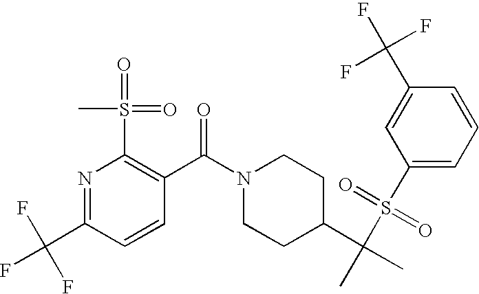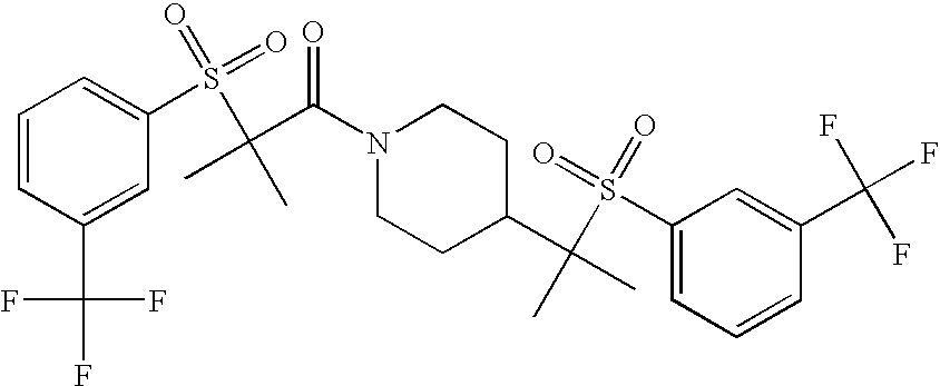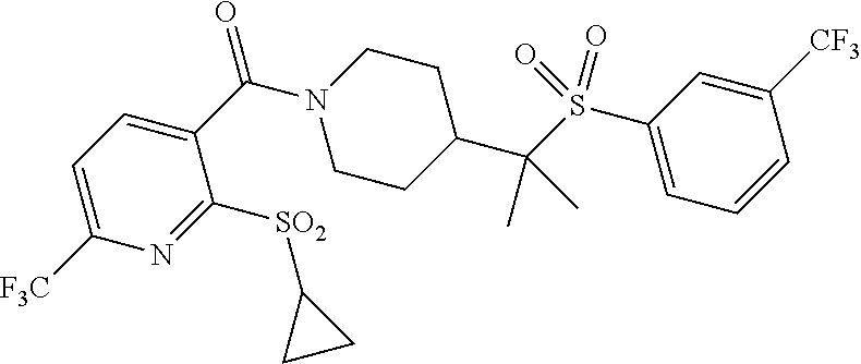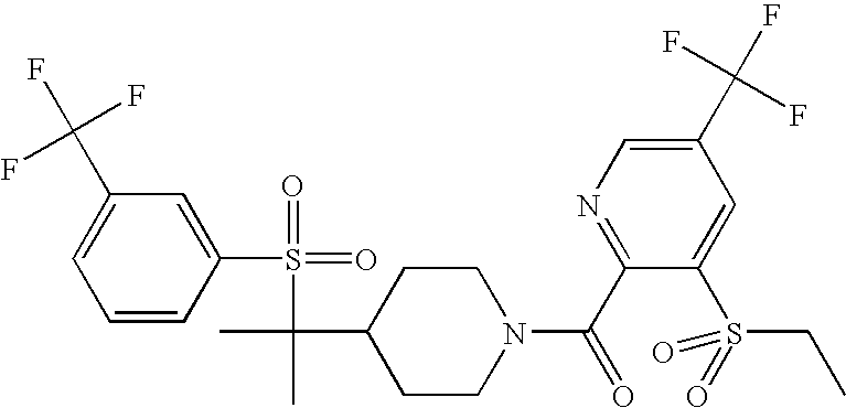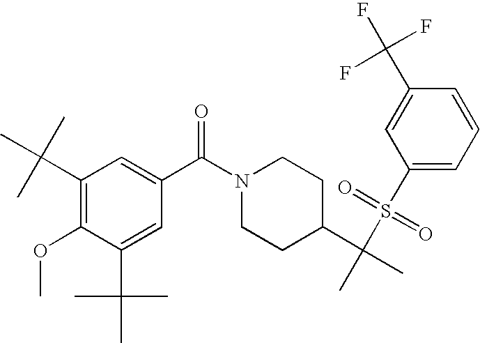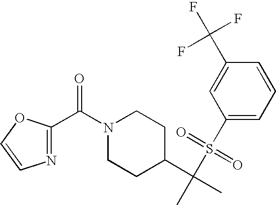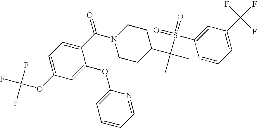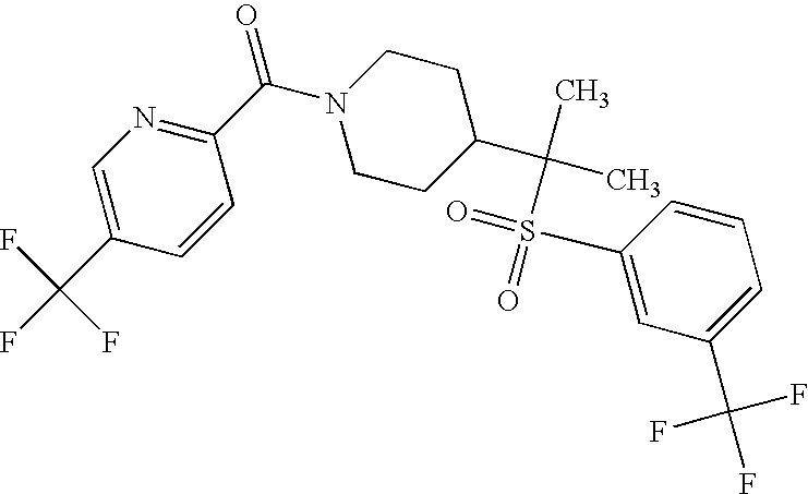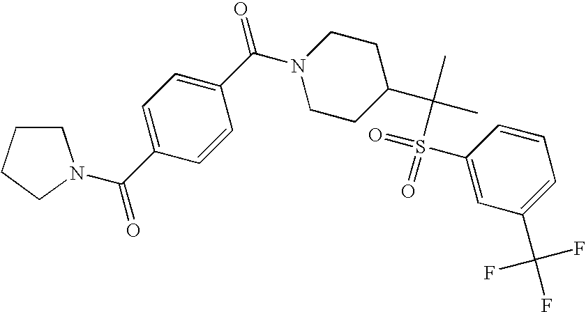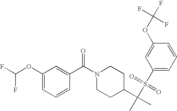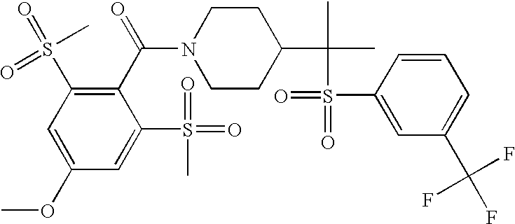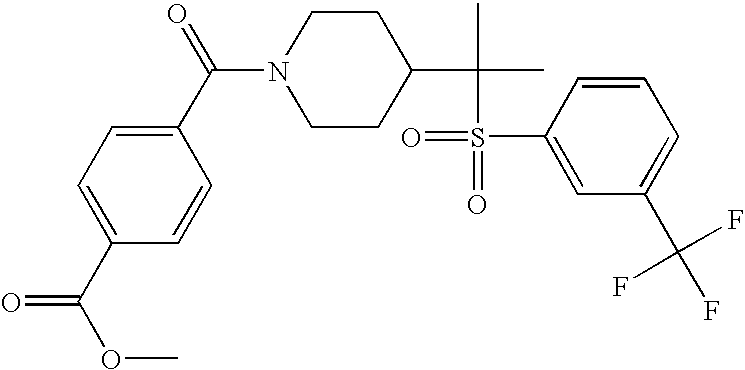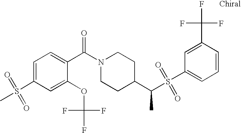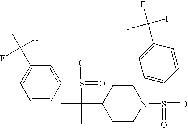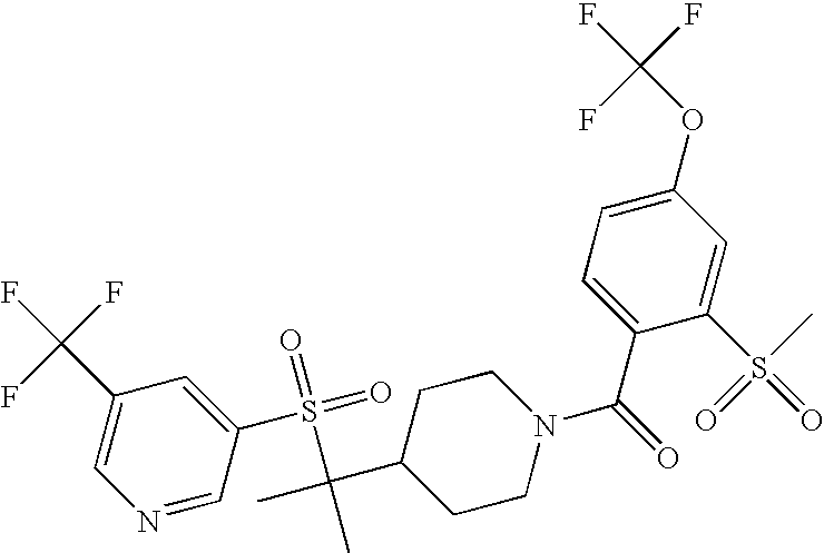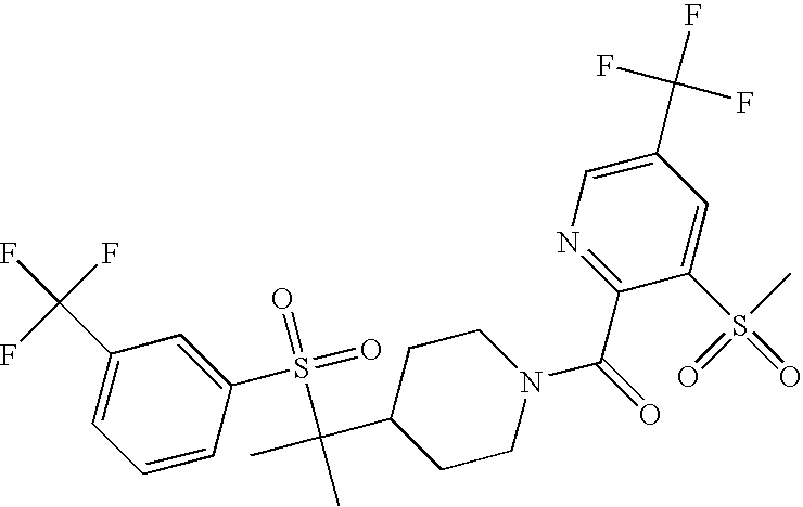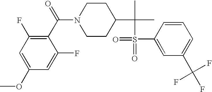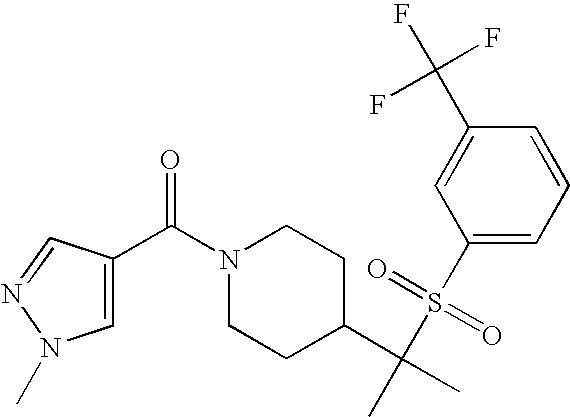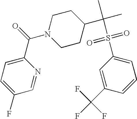 9 1-[4-(methylsulfonyl)-2- (trifluoromethoxy)benzoyl]- 4-({[3-(trifluoromethyl)- phenyl]sulfonyl}methyl)- piperidine 574 10 1-[5-fluoro-2- (methylsulfonyl)benzoyl]-4- ({[3-(trifluoromethyl)- phenyl]sulfonyl}methyl) piperidine 508 11 1-[2-(methylsulfonyl)-4- (trifluoromethyl)benzoyl]- 4-({[3-(trifluoromethyl)- phenyl]sulfonyl}methyl)- piperidine 558 12 1-[2-chloro-4- (methylsulfonyl)benzoyl]-4- ({[3-(trifluoromethyl)- phenyl]sulfonyl}methyl) piperidine 524 13 1-[5-fluoro-2-(methyl- sulfonyl)benzoyl]-4- ({[4-fluorophenyl)sulfonyl]- methyl}piperdinehyl} piperidine 458 14 4-{[(4-fluorophenyl)- sulfonyl]methyl}-1-[4- (methylsulfonyl)-2- (trifluoromethoxy)benzoyl] piperidine 524 15 4-{[(4-chlorophenyl)- sulfonyl]methyl}-1-[5- fluoro-2-(methyl- sulfonyl)benzoyl]piperidine 475 16 4-{[(4- chlorophenyl)sulfonyl] methyl}-1-[4-(methylsulfonyl)-2- (trifluoromethoxy)benzoyl] piperidine 541 17 4-{[(3- chlorophenyl)sulfonyl]methyl}- 1-[4-(methylsulfonyl)-2- (trifluoromethoxy)benzoyl] piperidine 541 18 1-(3,5-di-tert-butyl-4- methoxybenzoyl)-4-{[(4- fluorophenyl)sulfonyl]methyl} piperidine 504 19 4-{[(4- chlorophenyl)sulfonyl]methyl}- 1-(3,5-di-tert-butyl-4- methoxybenzoyl)piperidine 520 20 1-[4-(difluoromethoxy)-2- (methylsulfonyl)benzoyl]-4- ({[3-(trifluoromethyl)- phenyl]sulfonyl}methyl) piperidine 556 21 4-{[(4-fluorophenyl)- sulfonyl]methyl}-1-[2- (methylsulfonyl)-4- (trifluoromethyl)benzoyl] piperidine 508 22 1-[4-(difluoromethoxy)-2- (methylsulfonyl)benzoyl]-4- {[(4- fluorophenyl)sulfonyl]methyl} piperidine 506 23 4-{[(4- chlorophenyl)sulfonyl]methyl}- 1-[2-(methylsulfonyl)-4- (trifluoromethyl)benzoyl] piperidine 524 24 4-{[(4- chlorophenyl)sulfonyl]methy1}-1- [4-(difluoromethoxy)-2- (methylsulfonyl)benzoyl] piperidine 522 25 1-[2-(methylsulfonyl)-4- (trifluoromethoxy)benzoyl]- 4-({{3- (trifluoromethyl)phenyl] sulfonyl}methyl)piperidine 574 26 4-{[(4- chlorophenyl)sulfonyl]methyl}- 1-[2-(methylsulfonyl)-4- (trifluoromethoxy)benzoyl] piperidine 540 27 4-{[(4- fluorophenyl)sulfonyl]methyl}- 1-[2-(methylsulfonyl)-4- (trifluoromethoxy)benzoyl] piperidine 524 28 1-[4-(methylsulfonyl)-2- (trifluoromethoxy)benzoyl]- 4-(1-{[3-(trifluoromethyl) phenyl]sulfonyl}ethyl) piperidine 588 29 1-[4-(methylsulfonyl)-2- (trifluoromethoxy)benzoyl]- 4-((1S)-1-{[3-(trifluoromethyl) phenyl]sulfonyl}ethyl)piperidine 588 30 1-[4-(methylsulfonyl)-2- (trifluoromethoxy)benzoyl]- 4-((1R)-1-{[3- (trifluoromethyl) phenyl]sulfonyl} ethyl)piperidine 588 31 4-{1-[(4- fluorophenyl)sulfonyl]ethyl}-1- [4-(methylsulfonyl)-2- (trifluoromethoxy)benzoyl] piperidine 538 32 4-{1-[(4- chlorophenyl)sulfonyl]ethyl}- 1-[4-(methylsulfonyl)-2- (trifluoromethoxy)benzoyl] piperidine 555 33 4-{1-[(4- chlorophenyl)sulfonyl]ethyl}- 1-[5-fluoro-2-(methylsulfonyl) benzoyl]piperidine 488 34 1-[5-fluoro-2- (methylsulfonyl)benzoyl]- 4-(1-{[3-(trifluoromethyl)phenyl] sulfonyl}ethyl)piperidine 522 35 1-[2-(methylsulfonyl)-4- (trifluoromethyl)benzoyl]- 4-(1-{[3- (trifluoromethyl) phenyl]sulfonyl} ethyl)piperidine 572 36 tert-butyl4-(1-{[3- (trifluoromethyl)phenyl] sulfonyl}ethyl)piperidine-1- carboxylate 422 37 1-[2-(methylsulfonyl)-4- (trifluoromethoxy)benzoyl]- 4-((1S)-1-{[3- (trifluoromethyl)phenyl] sulfonyl}ethyl)piperidine 588 38 1-[4-(difluoromethoxy)-2- (methylsulfonyl)benzoyl]- 4-((1S)-1-{[3- (trifluoromethyl)phenyl] sulfonyl}ethyl)piperidine 570 39 1-[2-(methylsulfonyl)-4- (trifluoromethoxy)benzoyl]- 4-((1R)-1-{[3- trifluoromethyl)phenyl] sulfonyl}ethyl)piperidine 588 40 1-[4-(difluoromethoxy)-2- (methylsulfonyl)benzoyl]- 4-((1R)-1-{[3- (trifluoromethyl)phenyl] sulfonyl}ethyl)piperidine 570 41 1-[4-(cyclopropyloxy)-2,6- bis(methylsulfonyl)benzoyl]- 4-((1S)-1-{[3-(trifluoromethyl) phenyl] sulfonyl}ethyl)piperidine 638 42 1-[4-(cyclopropyloxy)-2,6- bis(methylsulfonyl)benzoyl]- 4-((1R)-1-{[3- (trifluoromethyl)phenyl] sulfonyl}ethyl)piperidine 638 43 2-(cyclopropylsulfonyl)-6- (trifluoromethyl)-3- {[4-((1S)-1-{[3- (trifluoromethyl)phenyl] sulfonyl}ethyl)piperidin-1- yl]carbonyl}pyridine 599 44 2-(cyclopropylsulfonyl)-6- (trifluoromethyl)-3- {[4-((1R)-1-{[3- (trifluoromethyl)phenyl] sulfonyl}ethyl)piperidin-1- yl]carbonyl}pyridine 599 45 3-chloro-5- (trifluoromethyl)-2-{[4- ((1S)-1-{[3- (trifluoromethyl)phenyl] sulfonyl}ethyl)piperidin-1- yl]carbonyl}pyridine 529 46 3-chloro-5- (trifluoromethyl)-2-{[4- ((1S)-1-{[3- (trifluoromethyl)phenyl] sulfonyl}ethyl)piperidin-1- yl]carbonyl}pyridine 529 47 3-(methylsulfonyl)-5- (trifluoromethyl)-2-{[4- ((1S)-1-{[3- (trifluoromethyl)phenyl] sulfonyl}ethyl)piperidin-1- yl]carbonyl}pyridine 573 48 3-(methylsulfonyl)-5- (trifluoromethyl)-2-{[4- ((1S)-1-{[3- (trifluoromethyl)phenyl] sulfonyl}ethyl)piperidin-1- yl]carbonyl}pyridine 573 49 3-(cyclopropylsulfonyl)-5- (trifluoromethyl)-2- {[4-((1S)-1-{[3- (trifluoromethyl)phenyl] sulfonyl}ethyl)piperidin-1- yl]carbonyl}pyridine 599 50 3-(cyclopropylsulfonyl)-5- (trifluoromethyl)-2- {[4-((1S)-1-{[3- (trifluoromethyl)phenyl] sulfonyl}ethyl)piperidin-1- yl]carbonyl}pyridine 599 51 4-(cyclopropyl{[3- (trifluoromethyl)phenyl] sulfonyl}methyl)-1-[5-fluoro- 2- (methylsulfonyl)benzoyl] piperidine 548 52 4-(cyclopropyl{[3- (trifluoromethyl)phenyl] sulfonyl}methyl)-1-[4- (methylsulfonyl)-2- (trifluoromethoxy)benzoyl] piperidine 514 53 1-[4-(methylsulfonyl)-2- (trifluoromethoxy)benzoyl]- 4-(1-methyl-1-{[3- (trifluoromethyl)phenyl] sulfonyl}ethyl)piperidine 602 54 1-[2-(methylsulfonyl)-4 (trifluoromethyl)benzoyl]- 4-(1-methyl-1-{[3- (trifluoromethyl)phenyl] sulfonyl}ethyl)piperidine 586 55 1-[5-fluoro-2- (methylsulfonyl)benzoyl]- 4-(1-methyl-1-{[3- (trifluoromethyl)phenyl] sulfonyl}ethyl)piperidine 536 56 1-(3-fluorobenzoyl)-4-(1- methyl-1-{[3- (trifluoromethyl)phenyl] sulfonyl}ethyl)piperidine 458 57 1-(3-methylbenzoyl)-4- (1-methyl-1-{[3- (trifluoromethyl)phenyl] sulfonyl}ethyl)piperidine 454 58 1-(3-methoxybenzoyl)-4- (1-methyl-1-{[3- (trifluoromethyl)phenyl] sulfonyl}ethyl)piperidine 470 59 1-(4-isopropylbenzoyl)-4- (1-methyl-1-{[3- (trifluoromethyl)phenyl] sulfonyl}ethyl)piperidine 