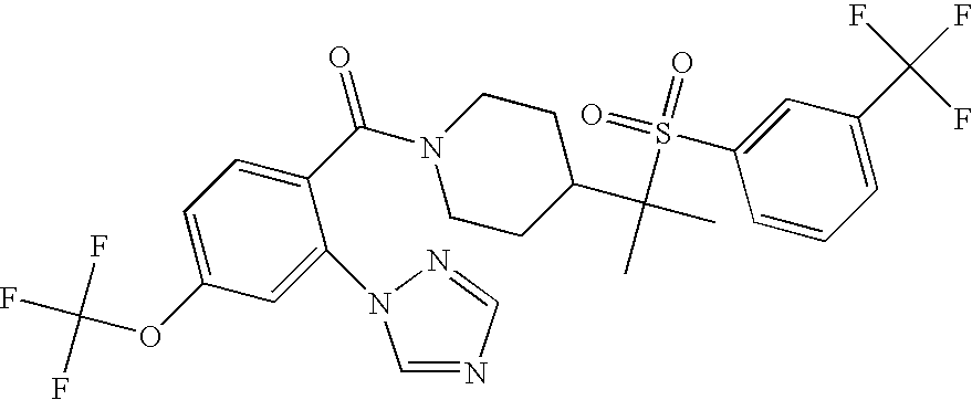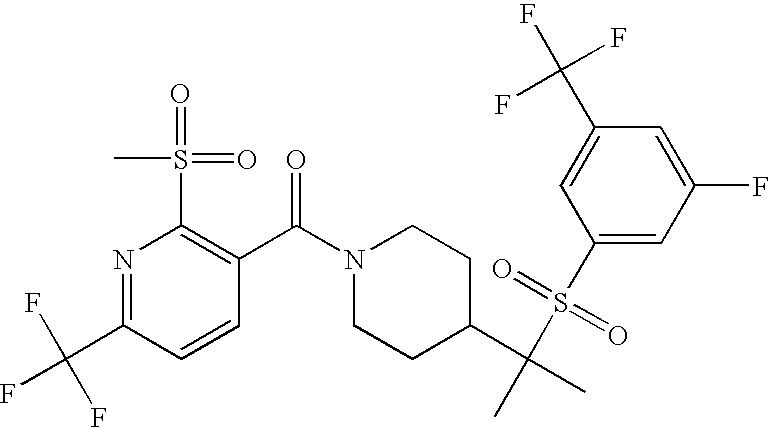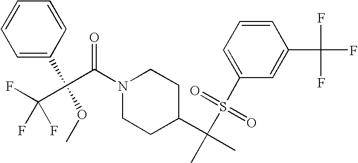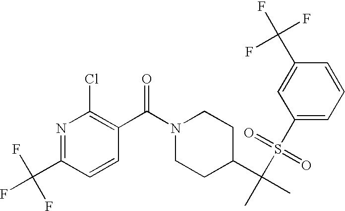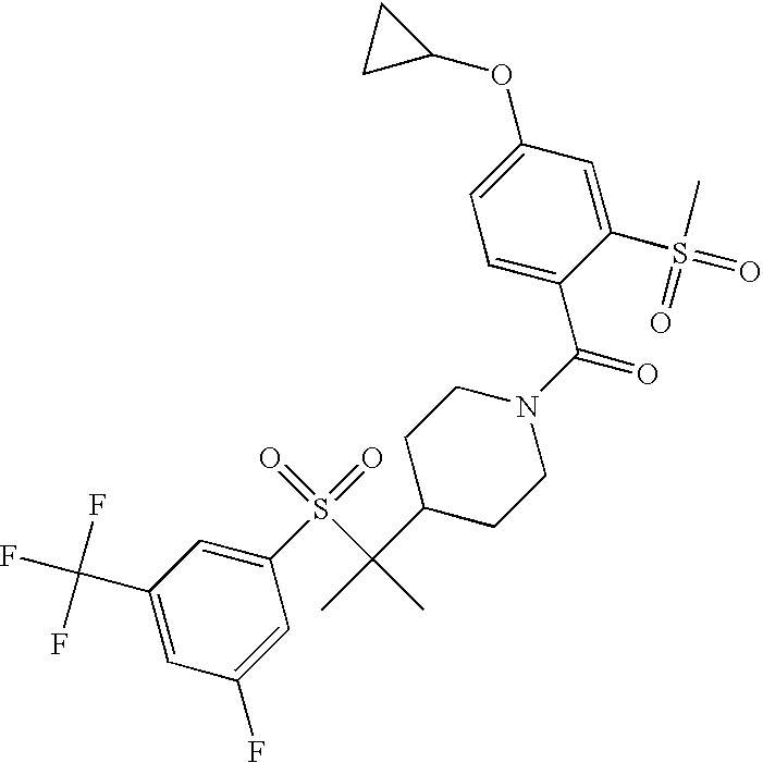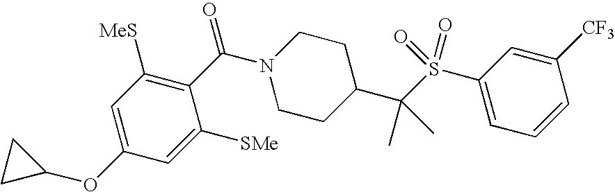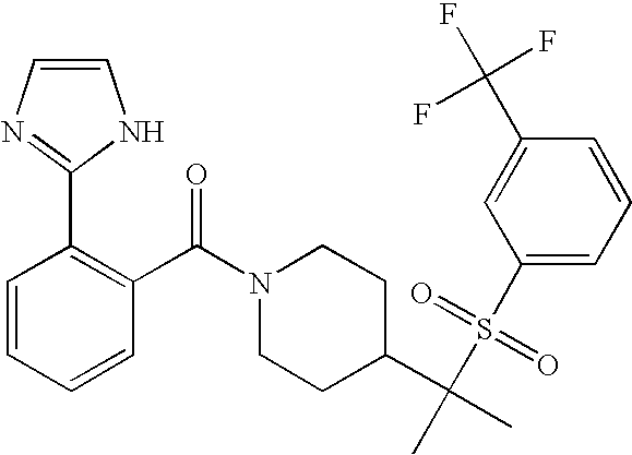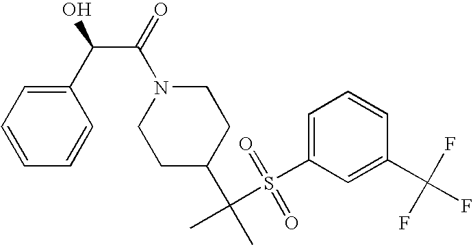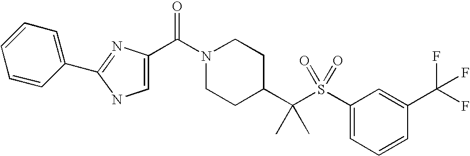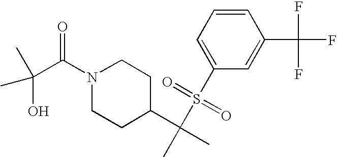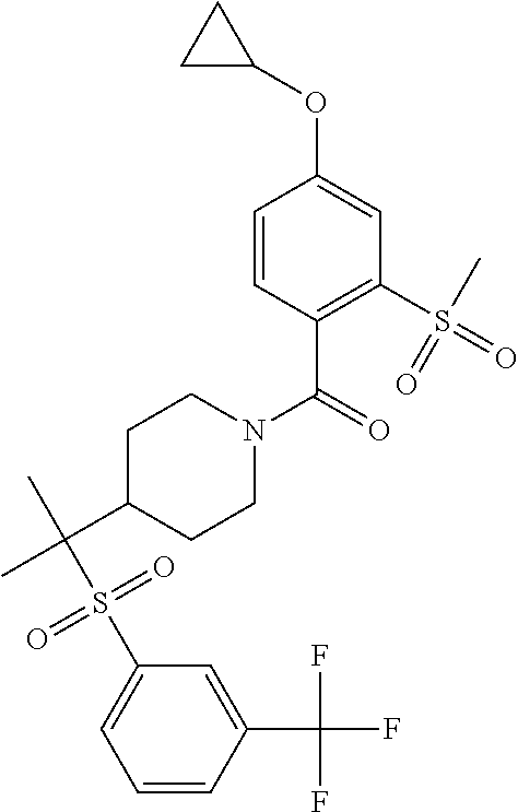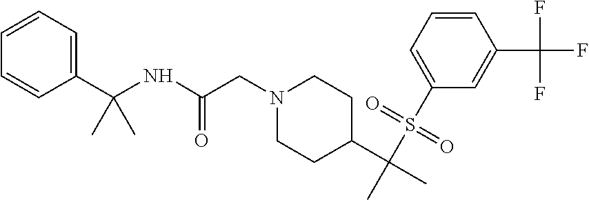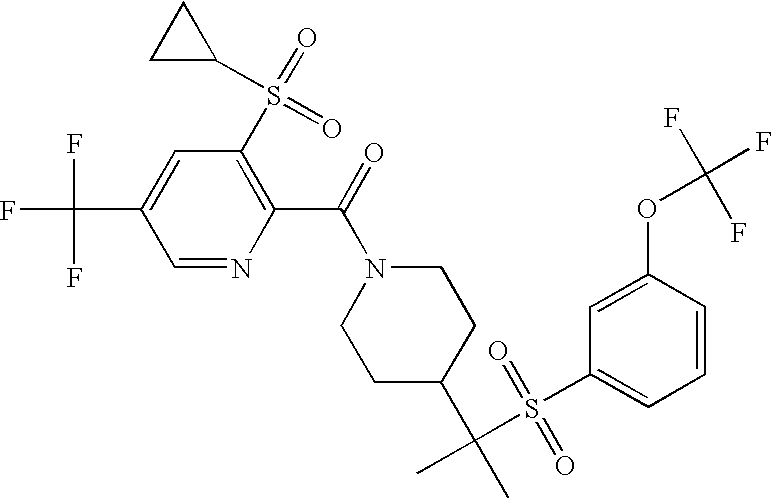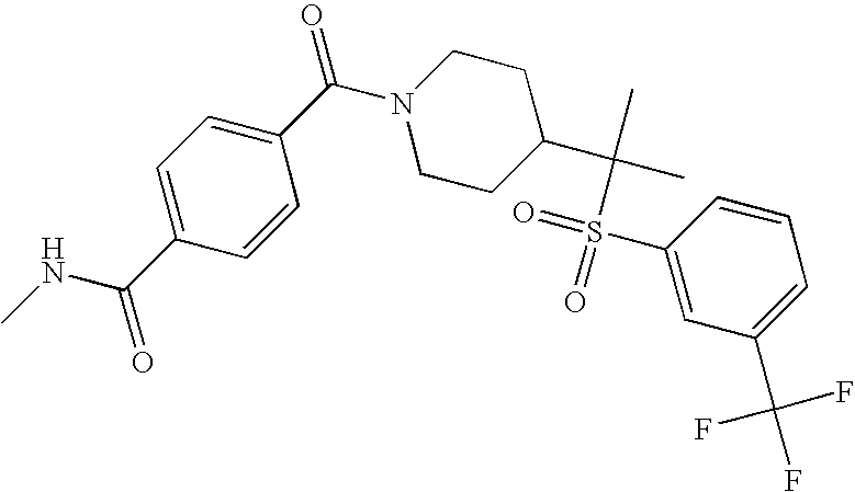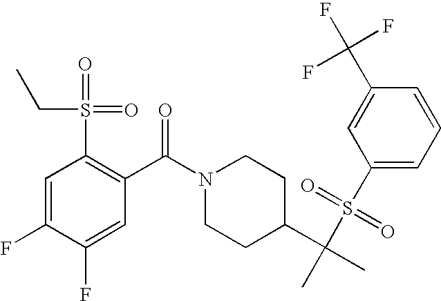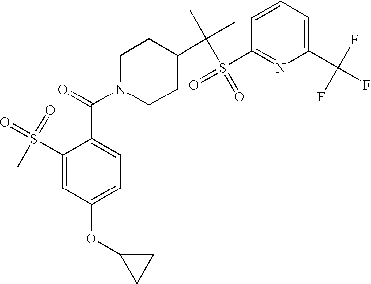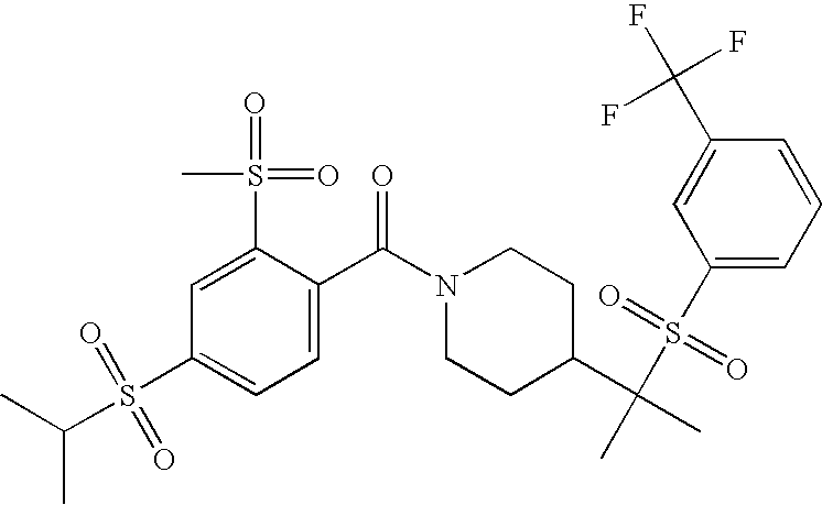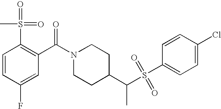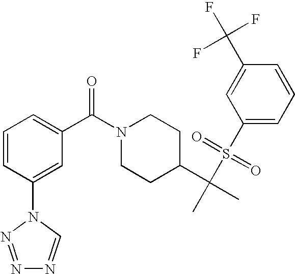 9 1-[4-(methylsulfonyl)-2- (trifluoromethoxy)benzoyl]- 4-({[3-(trifluoromethyl)- phenyl]sulfonyl}methyl)- piperidine 574 10 1-[5-fluoro-2- (methylsulfonyl)benzoyl]-4- ({[3-(trifluoromethyl)- phenyl]sulfonyl}methyl) piperidine 508 11 1-[2-(methylsulfonyl)-4- (trifluoromethyl)benzoyl]- 4-({[3-(trifluoromethyl)- phenyl]sulfonyl}methyl)- piperidine 558 12 1-[2-chloro-4- (methylsulfonyl)benzoyl]-4- ({[3-(trifluoromethyl)- phenyl]sulfonyl}methyl) piperidine 524 13 1-[5-fluoro-2-(methyl- sulfonyl)benzoyl]-4- ({[4-fluorophenyl)sulfonyl]- methyl}piperdinehyl} piperidine 458 14 4-{[(4-fluorophenyl)- sulfonyl]methyl}-1-[4- (methylsulfonyl)-2- (trifluoromethoxy)benzoyl] piperidine 524 15 4-{[(4-chlorophenyl)- sulfonyl]methyl}-1-[5- fluoro-2-(methyl- sulfonyl)benzoyl]piperidine 475 16 4-{[(4- chlorophenyl)sulfonyl] methyl}-1-[4-(methylsulfonyl)-2- (trifluoromethoxy)benzoyl] piperidine 541 17 4-{[(3- chlorophenyl)sulfonyl]methyl}- 1-[4-(methylsulfonyl)-2- (trifluoromethoxy)benzoyl] piperidine 541 18 1-(3,5-di-tert-butyl-4- methoxybenzoyl)-4-{[(4- fluorophenyl)sulfonyl]methyl} piperidine 504 19 4-{[(4- chlorophenyl)sulfonyl]methyl}- 1-(3,5-di-tert-butyl-4- methoxybenzoyl)piperidine 520 20 1-[4-(difluoromethoxy)-2- (methylsulfonyl)benzoyl]-4- ({[3-(trifluoromethyl)- phenyl]sulfonyl}methyl) piperidine 556 21 4-{[(4-fluorophenyl)- sulfonyl]methyl}-1-[2- (methylsulfonyl)-4- (trifluoromethyl)benzoyl] piperidine 508 22 1-[4-(difluoromethoxy)-2- (methylsulfonyl)benzoyl]-4- {[(4- fluorophenyl)sulfonyl]methyl} piperidine 506 23 4-{[(4- chlorophenyl)sulfonyl]methyl}- 1-[2-(methylsulfonyl)-4- (trifluoromethyl)benzoyl] piperidine 524 24 4-{[(4- chlorophenyl)sulfonyl]methy1}-1- [4-(difluoromethoxy)-2- (methylsulfonyl)benzoyl] piperidine 522 25 1-[2-(methylsulfonyl)-4- (trifluoromethoxy)benzoyl]- 4-({{3- (trifluoromethyl)phenyl] sulfonyl}methyl)piperidine 574 26 4-{[(4- chlorophenyl)sulfonyl]methyl}- 1-[2-(methylsulfonyl)-4- (trifluoromethoxy)benzoyl] piperidine 540 27 4-{[(4- fluorophenyl)sulfonyl]methyl}- 1-[2-(methylsulfonyl)-4- (trifluoromethoxy)benzoyl] piperidine 524 28 1-[4-(methylsulfonyl)-2- (trifluoromethoxy)benzoyl]- 4-(1-{[3-(trifluoromethyl) phenyl]sulfonyl}ethyl) piperidine 588 29 1-[4-(methylsulfonyl)-2- (trifluoromethoxy)benzoyl]- 4-((1S)-1-{[3-(trifluoromethyl) phenyl]sulfonyl}ethyl)piperidine 588 30 1-[4-(methylsulfonyl)-2- (trifluoromethoxy)benzoyl]- 4-((1R)-1-{[3- (trifluoromethyl) phenyl]sulfonyl} ethyl)piperidine 588 31 4-{1-[(4- fluorophenyl)sulfonyl]ethyl}-1- [4-(methylsulfonyl)-2- (trifluoromethoxy)benzoyl] piperidine 538 32 4-{1-[(4- chlorophenyl)sulfonyl]ethyl}- 1-[4-(methylsulfonyl)-2- (trifluoromethoxy)benzoyl] piperidine 555 33 4-{1-[(4- chlorophenyl)sulfonyl]ethyl}- 1-[5-fluoro-2-(methylsulfonyl) benzoyl]piperidine 488 34 1-[5-fluoro-2- (methylsulfonyl)benzoyl]- 4-(1-{[3-(trifluoromethyl)phenyl] sulfonyl}ethyl)piperidine 522 35 1-[2-(methylsulfonyl)-4- (trifluoromethyl)benzoyl]- 4-(1-{[3- (trifluoromethyl) phenyl]sulfonyl} ethyl)piperidine 572 36 tert-butyl4-(1-{[3- (trifluoromethyl)phenyl] sulfonyl}ethyl)piperidine-1- carboxylate 422 37 1-[2-(methylsulfonyl)-4- (trifluoromethoxy)benzoyl]- 4-((1S)-1-{[3- (trifluoromethyl)phenyl] sulfonyl}ethyl)piperidine 588 38 1-[4-(difluoromethoxy)-2- (methylsulfonyl)benzoyl]- 4-((1S)-1-{[3- (trifluoromethyl)phenyl] sulfonyl}ethyl)piperidine 570 39 1-[2-(methylsulfonyl)-4- (trifluoromethoxy)benzoyl]- 4-((1R)-1-{[3- trifluoromethyl)phenyl] sulfonyl}ethyl)piperidine 588 40 1-[4-(difluoromethoxy)-2- (methylsulfonyl)benzoyl]- 4-((1R)-1-{[3- (trifluoromethyl)phenyl] sulfonyl}ethyl)piperidine 570 41 1-[4-(cyclopropyloxy)-2,6- bis(methylsulfonyl)benzoyl]- 4-((1S)-1-{[3-(trifluoromethyl) phenyl] sulfonyl}ethyl)piperidine 638 42 1-[4-(cyclopropyloxy)-2,6- bis(methylsulfonyl)benzoyl]- 4-((1R)-1-{[3- (trifluoromethyl)phenyl] sulfonyl}ethyl)piperidine 638 43 2-(cyclopropylsulfonyl)-6- (trifluoromethyl)-3- {[4-((1S)-1-{[3- (trifluoromethyl)phenyl] sulfonyl}ethyl)piperidin-1- yl]carbonyl}pyridine 599 44 2-(cyclopropylsulfonyl)-6- (trifluoromethyl)-3- {[4-((1R)-1-{[3- (trifluoromethyl)phenyl] sulfonyl}ethyl)piperidin-1- yl]carbonyl}pyridine 599 45 3-chloro-5- (trifluoromethyl)-2-{[4- ((1S)-1-{[3- (trifluoromethyl)phenyl] sulfonyl}ethyl)piperidin-1- yl]carbonyl}pyridine 529 46 3-chloro-5- (trifluoromethyl)-2-{[4- ((1S)-1-{[3- (trifluoromethyl)phenyl] sulfonyl}ethyl)piperidin-1- yl]carbonyl}pyridine 529 47 3-(methylsulfonyl)-5- (trifluoromethyl)-2-{[4- ((1S)-1-{[3- (trifluoromethyl)phenyl] sulfonyl}ethyl)piperidin-1- yl]carbonyl}pyridine 573 48 3-(methylsulfonyl)-5- (trifluoromethyl)-2-{[4- ((1S)-1-{[3- (trifluoromethyl)phenyl] sulfonyl}ethyl)piperidin-1- yl]carbonyl}pyridine 573 49 3-(cyclopropylsulfonyl)-5- (trifluoromethyl)-2- {[4-((1S)-1-{[3- (trifluoromethyl)phenyl] sulfonyl}ethyl)piperidin-1- yl]carbonyl}pyridine 599 50 3-(cyclopropylsulfonyl)-5- (trifluoromethyl)-2- {[4-((1S)-1-{[3- (trifluoromethyl)phenyl] sulfonyl}ethyl)piperidin-1- yl]carbonyl}pyridine 599 51 4-(cyclopropyl{[3- (trifluoromethyl)phenyl] sulfonyl}methyl)-1-[5-fluoro- 2- (methylsulfonyl)benzoyl] piperidine 548 52 4-(cyclopropyl{[3- (trifluoromethyl)phenyl] sulfonyl}methyl)-1-[4- (methylsulfonyl)-2- (trifluoromethoxy)benzoyl] piperidine 514 53 1-[4-(methylsulfonyl)-2- (trifluoromethoxy)benzoyl]- 4-(1-methyl-1-{[3- (trifluoromethyl)phenyl] sulfonyl}ethyl)piperidine 602 54 1-[2-(methylsulfonyl)-4 (trifluoromethyl)benzoyl]- 4-(1-methyl-1-{[3- (trifluoromethyl)phenyl] sulfonyl}ethyl)piperidine 586 55 1-[5-fluoro-2- (methylsulfonyl)benzoyl]- 4-(1-methyl-1-{[3- (trifluoromethyl)phenyl] sulfonyl}ethyl)piperidine 536 56 1-(3-fluorobenzoyl)-4-(1- methyl-1-{[3- (trifluoromethyl)phenyl] sulfonyl}ethyl)piperidine 458 57 1-(3-methylbenzoyl)-4- (1-methyl-1-{[3- (trifluoromethyl)phenyl] sulfonyl}ethyl)piperidine 454 58 1-(3-methoxybenzoyl)-4- (1-methyl-1-{[3- (trifluoromethyl)phenyl] sulfonyl}ethyl)piperidine 470 59 1-(4-isopropylbenzoyl)-4- (1-methyl-1-{[3- (trifluoromethyl)phenyl] sulfonyl}ethyl)piperidine 