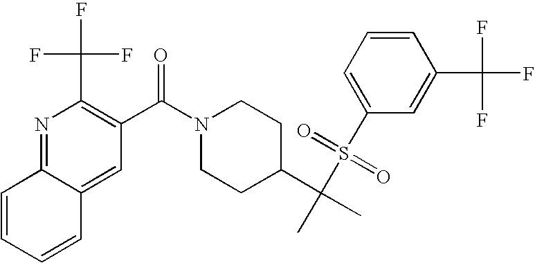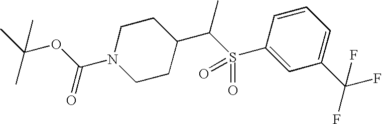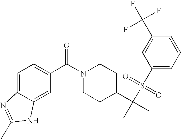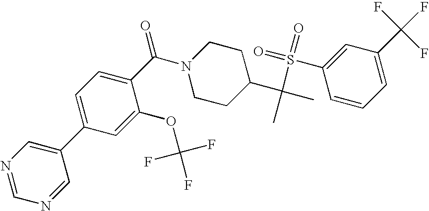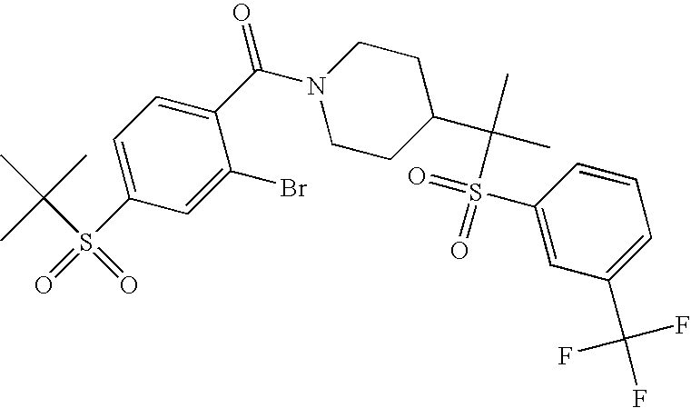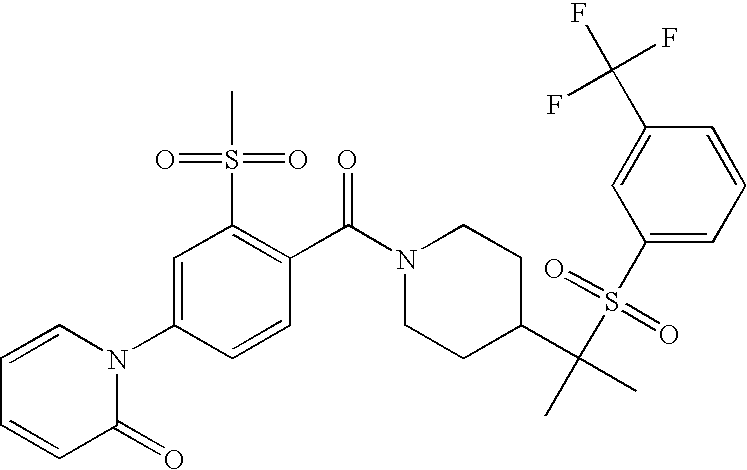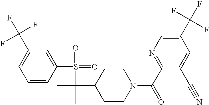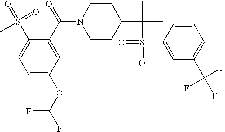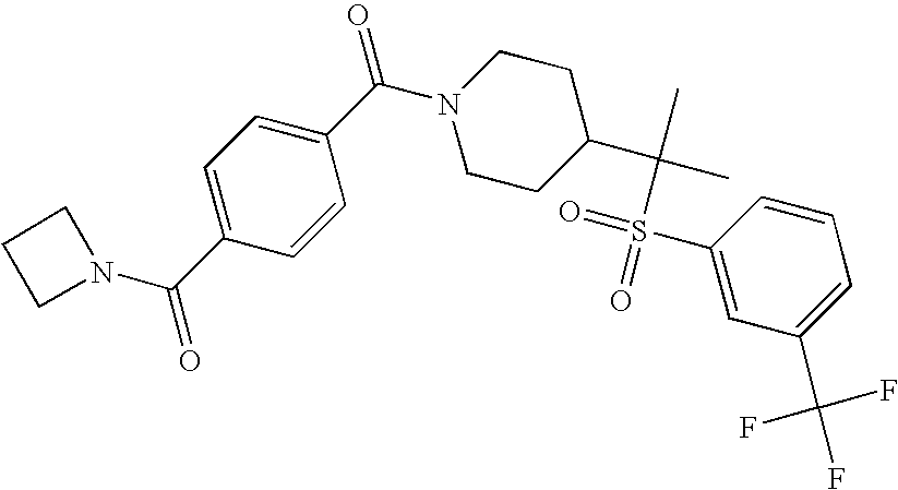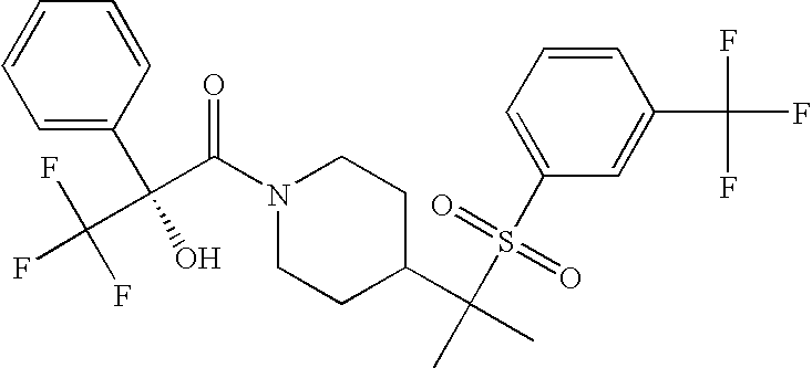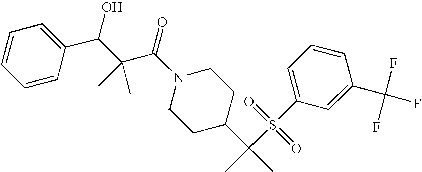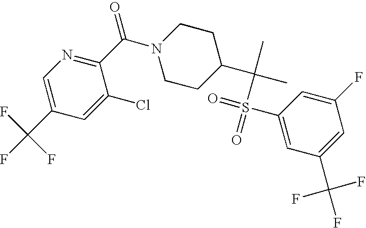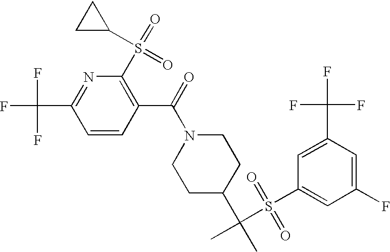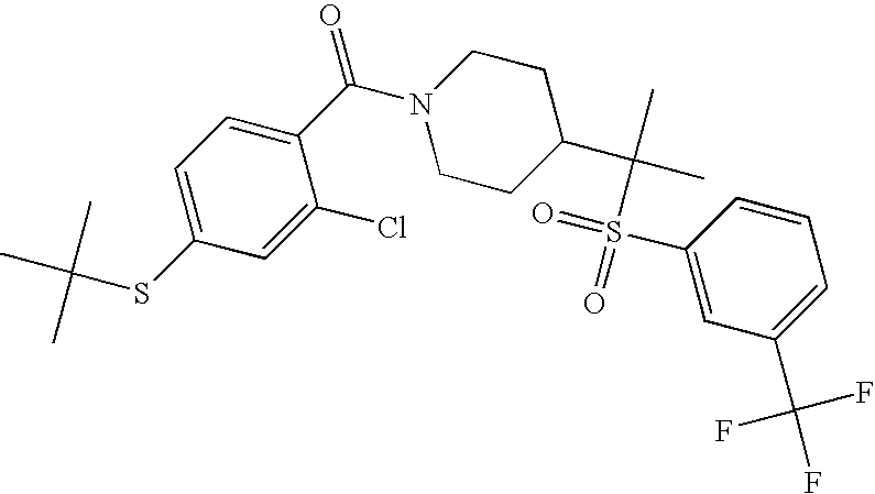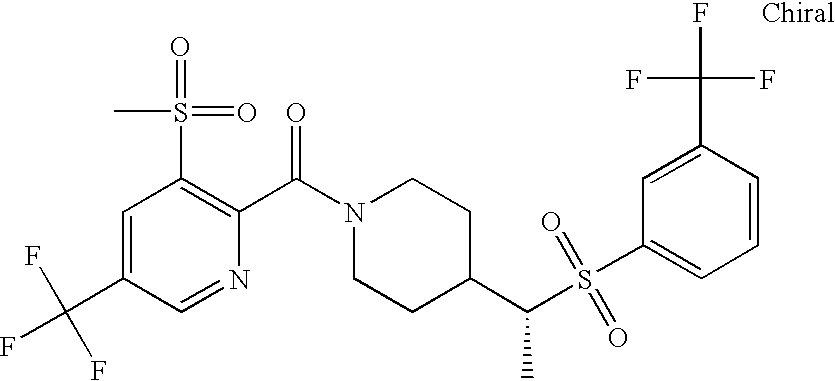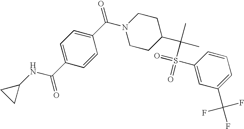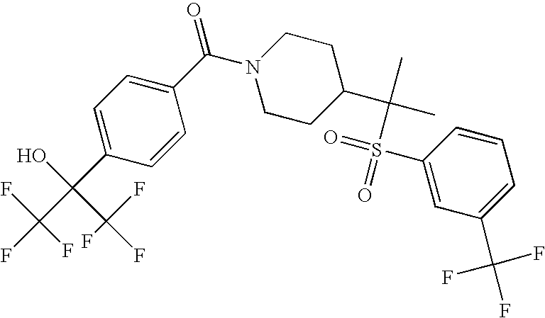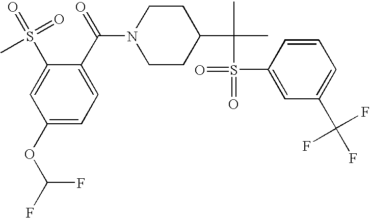 9 1-[4-(methylsulfonyl)-2- (trifluoromethoxy)benzoyl]- 4-({[3-(trifluoromethyl)- phenyl]sulfonyl}methyl)- piperidine 574 10 1-[5-fluoro-2- (methylsulfonyl)benzoyl]-4- ({[3-(trifluoromethyl)- phenyl]sulfonyl}methyl) piperidine 508 11 1-[2-(methylsulfonyl)-4- (trifluoromethyl)benzoyl]- 4-({[3-(trifluoromethyl)- phenyl]sulfonyl}methyl)- piperidine 558 12 1-[2-chloro-4- (methylsulfonyl)benzoyl]-4- ({[3-(trifluoromethyl)- phenyl]sulfonyl}methyl) piperidine 524 13 1-[5-fluoro-2-(methyl- sulfonyl)benzoyl]-4- ({[4-fluorophenyl)sulfonyl]- methyl}piperdinehyl} piperidine 458 14 4-{[(4-fluorophenyl)- sulfonyl]methyl}-1-[4- (methylsulfonyl)-2- (trifluoromethoxy)benzoyl] piperidine 524 15 4-{[(4-chlorophenyl)- sulfonyl]methyl}-1-[5- fluoro-2-(methyl- sulfonyl)benzoyl]piperidine 475 16 4-{[(4- chlorophenyl)sulfonyl] methyl}-1-[4-(methylsulfonyl)-2- (trifluoromethoxy)benzoyl] piperidine 541 17 4-{[(3- chlorophenyl)sulfonyl]methyl}- 1-[4-(methylsulfonyl)-2- (trifluoromethoxy)benzoyl] piperidine 541 18 1-(3,5-di-tert-butyl-4- methoxybenzoyl)-4-{[(4- fluorophenyl)sulfonyl]methyl} piperidine 504 19 4-{[(4- chlorophenyl)sulfonyl]methyl}- 1-(3,5-di-tert-butyl-4- methoxybenzoyl)piperidine 520 20 1-[4-(difluoromethoxy)-2- (methylsulfonyl)benzoyl]-4- ({[3-(trifluoromethyl)- phenyl]sulfonyl}methyl) piperidine 556 21 4-{[(4-fluorophenyl)- sulfonyl]methyl}-1-[2- (methylsulfonyl)-4- (trifluoromethyl)benzoyl] piperidine 508 22 1-[4-(difluoromethoxy)-2- (methylsulfonyl)benzoyl]-4- {[(4- fluorophenyl)sulfonyl]methyl} piperidine 506 23 4-{[(4- chlorophenyl)sulfonyl]methyl}- 1-[2-(methylsulfonyl)-4- (trifluoromethyl)benzoyl] piperidine 524 24 4-{[(4- chlorophenyl)sulfonyl]methy1}-1- [4-(difluoromethoxy)-2- (methylsulfonyl)benzoyl] piperidine 522 25 1-[2-(methylsulfonyl)-4- (trifluoromethoxy)benzoyl]- 4-({{3- (trifluoromethyl)phenyl] sulfonyl}methyl)piperidine 574 26 4-{[(4- chlorophenyl)sulfonyl]methyl}- 1-[2-(methylsulfonyl)-4- (trifluoromethoxy)benzoyl] piperidine 540 27 4-{[(4- fluorophenyl)sulfonyl]methyl}- 1-[2-(methylsulfonyl)-4- (trifluoromethoxy)benzoyl] piperidine 524 28 1-[4-(methylsulfonyl)-2- (trifluoromethoxy)benzoyl]- 4-(1-{[3-(trifluoromethyl) phenyl]sulfonyl}ethyl) piperidine 588 29 1-[4-(methylsulfonyl)-2- (trifluoromethoxy)benzoyl]- 4-((1S)-1-{[3-(trifluoromethyl) phenyl]sulfonyl}ethyl)piperidine 588 30 1-[4-(methylsulfonyl)-2- (trifluoromethoxy)benzoyl]- 4-((1R)-1-{[3- (trifluoromethyl) phenyl]sulfonyl} ethyl)piperidine 588 31 4-{1-[(4- fluorophenyl)sulfonyl]ethyl}-1- [4-(methylsulfonyl)-2- (trifluoromethoxy)benzoyl] piperidine 538 32 4-{1-[(4- chlorophenyl)sulfonyl]ethyl}- 1-[4-(methylsulfonyl)-2- (trifluoromethoxy)benzoyl] piperidine 555 33 4-{1-[(4- chlorophenyl)sulfonyl]ethyl}- 1-[5-fluoro-2-(methylsulfonyl) benzoyl]piperidine 488 34 1-[5-fluoro-2- (methylsulfonyl)benzoyl]- 4-(1-{[3-(trifluoromethyl)phenyl] sulfonyl}ethyl)piperidine 522 35 1-[2-(methylsulfonyl)-4- (trifluoromethyl)benzoyl]- 4-(1-{[3- (trifluoromethyl) phenyl]sulfonyl} ethyl)piperidine 572 36 tert-butyl4-(1-{[3- (trifluoromethyl)phenyl] sulfonyl}ethyl)piperidine-1- carboxylate 422 37 1-[2-(methylsulfonyl)-4- (trifluoromethoxy)benzoyl]- 4-((1S)-1-{[3- (trifluoromethyl)phenyl] sulfonyl}ethyl)piperidine 588 38 1-[4-(difluoromethoxy)-2- (methylsulfonyl)benzoyl]- 4-((1S)-1-{[3- (trifluoromethyl)phenyl] sulfonyl}ethyl)piperidine 570 39 1-[2-(methylsulfonyl)-4- (trifluoromethoxy)benzoyl]- 4-((1R)-1-{[3- trifluoromethyl)phenyl] sulfonyl}ethyl)piperidine 588 40 1-[4-(difluoromethoxy)-2- (methylsulfonyl)benzoyl]- 4-((1R)-1-{[3- (trifluoromethyl)phenyl] sulfonyl}ethyl)piperidine 570 41 1-[4-(cyclopropyloxy)-2,6- bis(methylsulfonyl)benzoyl]- 4-((1S)-1-{[3-(trifluoromethyl) phenyl] sulfonyl}ethyl)piperidine 638 42 1-[4-(cyclopropyloxy)-2,6- bis(methylsulfonyl)benzoyl]- 4-((1R)-1-{[3- (trifluoromethyl)phenyl] sulfonyl}ethyl)piperidine 638 43 2-(cyclopropylsulfonyl)-6- (trifluoromethyl)-3- {[4-((1S)-1-{[3- (trifluoromethyl)phenyl] sulfonyl}ethyl)piperidin-1- yl]carbonyl}pyridine 599 44 2-(cyclopropylsulfonyl)-6- (trifluoromethyl)-3- {[4-((1R)-1-{[3- (trifluoromethyl)phenyl] sulfonyl}ethyl)piperidin-1- yl]carbonyl}pyridine 599 45 3-chloro-5- (trifluoromethyl)-2-{[4- ((1S)-1-{[3- (trifluoromethyl)phenyl] sulfonyl}ethyl)piperidin-1- yl]carbonyl}pyridine 529 46 3-chloro-5- (trifluoromethyl)-2-{[4- ((1S)-1-{[3- (trifluoromethyl)phenyl] sulfonyl}ethyl)piperidin-1- yl]carbonyl}pyridine 529 47 3-(methylsulfonyl)-5- (trifluoromethyl)-2-{[4- ((1S)-1-{[3- (trifluoromethyl)phenyl] sulfonyl}ethyl)piperidin-1- yl]carbonyl}pyridine 573 48 3-(methylsulfonyl)-5- (trifluoromethyl)-2-{[4- ((1S)-1-{[3- (trifluoromethyl)phenyl] sulfonyl}ethyl)piperidin-1- yl]carbonyl}pyridine 573 49 3-(cyclopropylsulfonyl)-5- (trifluoromethyl)-2- {[4-((1S)-1-{[3- (trifluoromethyl)phenyl] sulfonyl}ethyl)piperidin-1- yl]carbonyl}pyridine 599 50 3-(cyclopropylsulfonyl)-5- (trifluoromethyl)-2- {[4-((1S)-1-{[3- (trifluoromethyl)phenyl] sulfonyl}ethyl)piperidin-1- yl]carbonyl}pyridine 599 51 4-(cyclopropyl{[3- (trifluoromethyl)phenyl] sulfonyl}methyl)-1-[5-fluoro- 2- (methylsulfonyl)benzoyl] piperidine 548 52 4-(cyclopropyl{[3- (trifluoromethyl)phenyl] sulfonyl}methyl)-1-[4- (methylsulfonyl)-2- (trifluoromethoxy)benzoyl] piperidine 514 53 1-[4-(methylsulfonyl)-2- (trifluoromethoxy)benzoyl]- 4-(1-methyl-1-{[3- (trifluoromethyl)phenyl] sulfonyl}ethyl)piperidine 602 54 1-[2-(methylsulfonyl)-4 (trifluoromethyl)benzoyl]- 4-(1-methyl-1-{[3- (trifluoromethyl)phenyl] sulfonyl}ethyl)piperidine 586 55 1-[5-fluoro-2- (methylsulfonyl)benzoyl]- 4-(1-methyl-1-{[3- (trifluoromethyl)phenyl] sulfonyl}ethyl)piperidine 536 56 1-(3-fluorobenzoyl)-4-(1- methyl-1-{[3- (trifluoromethyl)phenyl] sulfonyl}ethyl)piperidine 458 57 1-(3-methylbenzoyl)-4- (1-methyl-1-{[3- (trifluoromethyl)phenyl] sulfonyl}ethyl)piperidine 454 58 1-(3-methoxybenzoyl)-4- (1-methyl-1-{[3- (trifluoromethyl)phenyl] sulfonyl}ethyl)piperidine 470 59 1-(4-isopropylbenzoyl)-4- (1-methyl-1-{[3- (trifluoromethyl)phenyl] sulfonyl}ethyl)piperidine 