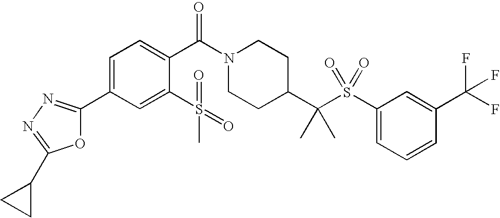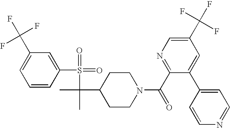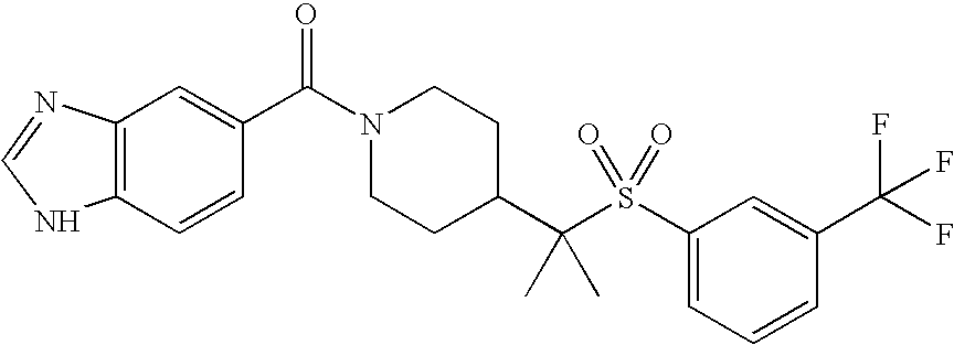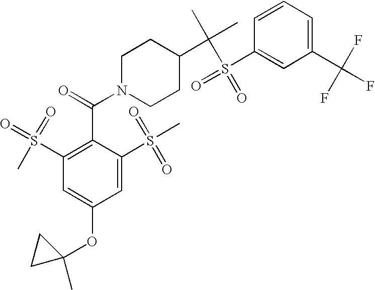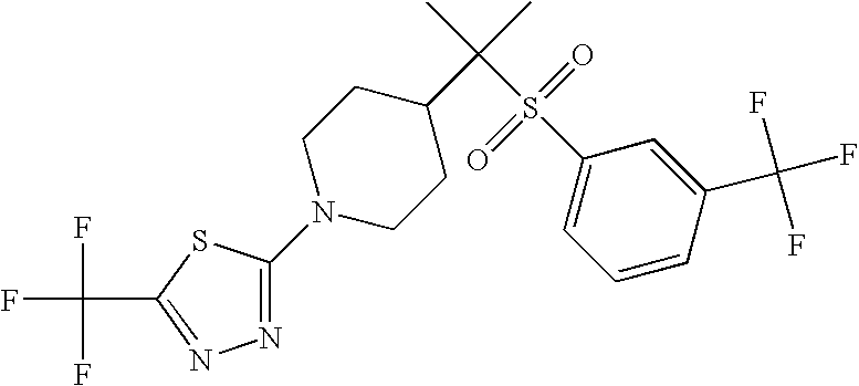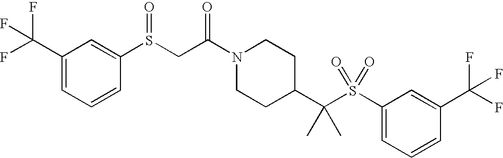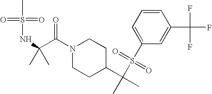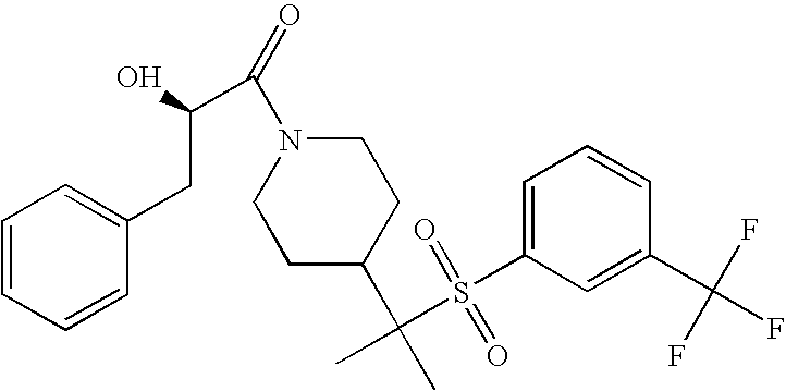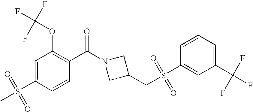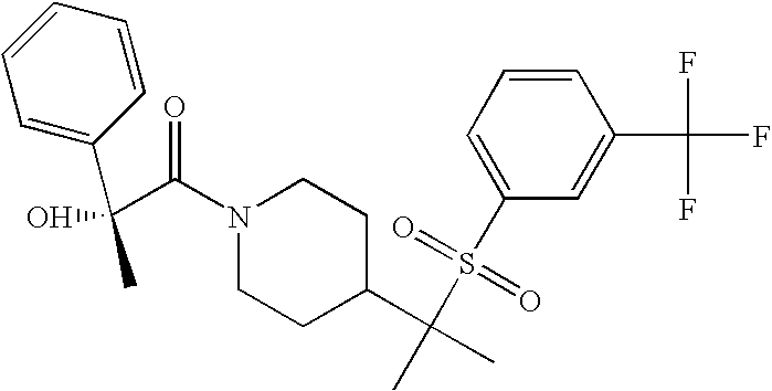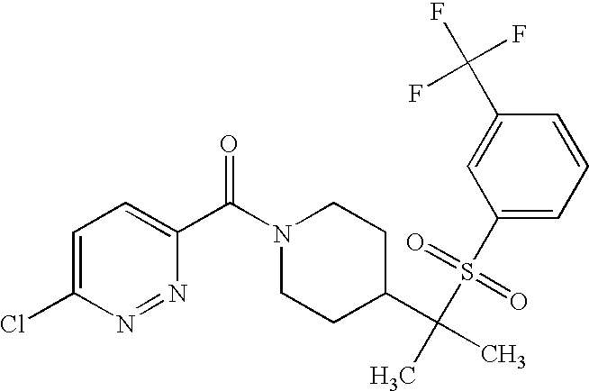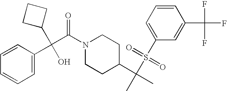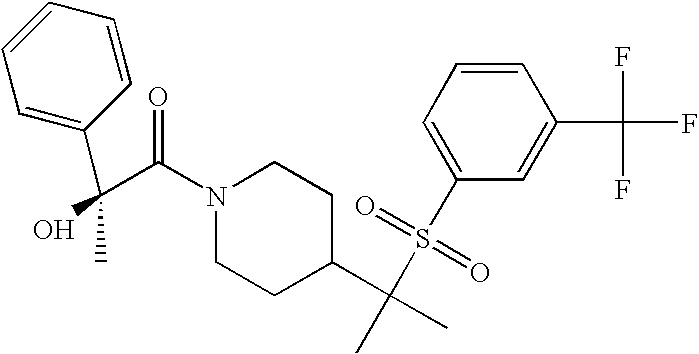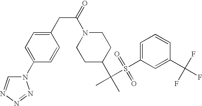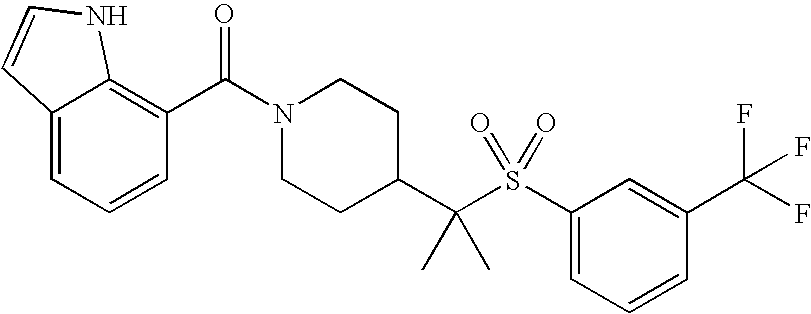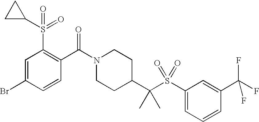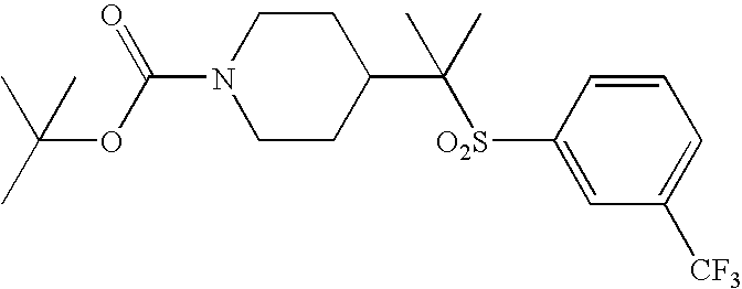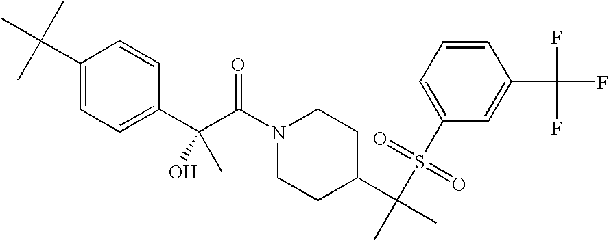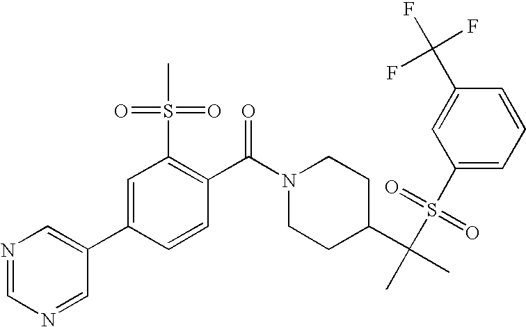 9 1-[4-(methylsulfonyl)-2- (trifluoromethoxy)benzoyl]- 4-({[3-(trifluoromethyl)- phenyl]sulfonyl}methyl)- piperidine 574 10 1-[5-fluoro-2- (methylsulfonyl)benzoyl]-4- ({[3-(trifluoromethyl)- phenyl]sulfonyl}methyl) piperidine 508 11 1-[2-(methylsulfonyl)-4- (trifluoromethyl)benzoyl]- 4-({[3-(trifluoromethyl)- phenyl]sulfonyl}methyl)- piperidine 558 12 1-[2-chloro-4- (methylsulfonyl)benzoyl]-4- ({[3-(trifluoromethyl)- phenyl]sulfonyl}methyl) piperidine 524 13 1-[5-fluoro-2-(methyl- sulfonyl)benzoyl]-4- ({[4-fluorophenyl)sulfonyl]- methyl}piperdinehyl} piperidine 458 14 4-{[(4-fluorophenyl)- sulfonyl]methyl}-1-[4- (methylsulfonyl)-2- (trifluoromethoxy)benzoyl] piperidine 524 15 4-{[(4-chlorophenyl)- sulfonyl]methyl}-1-[5- fluoro-2-(methyl- sulfonyl)benzoyl]piperidine 475 16 4-{[(4- chlorophenyl)sulfonyl] methyl}-1-[4-(methylsulfonyl)-2- (trifluoromethoxy)benzoyl] piperidine 541 17 4-{[(3- chlorophenyl)sulfonyl]methyl}- 1-[4-(methylsulfonyl)-2- (trifluoromethoxy)benzoyl] piperidine 541 18 1-(3,5-di-tert-butyl-4- methoxybenzoyl)-4-{[(4- fluorophenyl)sulfonyl]methyl} piperidine 504 19 4-{[(4- chlorophenyl)sulfonyl]methyl}- 1-(3,5-di-tert-butyl-4- methoxybenzoyl)piperidine 520 20 1-[4-(difluoromethoxy)-2- (methylsulfonyl)benzoyl]-4- ({[3-(trifluoromethyl)- phenyl]sulfonyl}methyl) piperidine 556 21 4-{[(4-fluorophenyl)- sulfonyl]methyl}-1-[2- (methylsulfonyl)-4- (trifluoromethyl)benzoyl] piperidine 508 22 1-[4-(difluoromethoxy)-2- (methylsulfonyl)benzoyl]-4- {[(4- fluorophenyl)sulfonyl]methyl} piperidine 506 23 4-{[(4- chlorophenyl)sulfonyl]methyl}- 1-[2-(methylsulfonyl)-4- (trifluoromethyl)benzoyl] piperidine 524 24 4-{[(4- chlorophenyl)sulfonyl]methy1}-1- [4-(difluoromethoxy)-2- (methylsulfonyl)benzoyl] piperidine 522 25 1-[2-(methylsulfonyl)-4- (trifluoromethoxy)benzoyl]- 4-({{3- (trifluoromethyl)phenyl] sulfonyl}methyl)piperidine 574 26 4-{[(4- chlorophenyl)sulfonyl]methyl}- 1-[2-(methylsulfonyl)-4- (trifluoromethoxy)benzoyl] piperidine 540 27 4-{[(4- fluorophenyl)sulfonyl]methyl}- 1-[2-(methylsulfonyl)-4- (trifluoromethoxy)benzoyl] piperidine 524 28 1-[4-(methylsulfonyl)-2- (trifluoromethoxy)benzoyl]- 4-(1-{[3-(trifluoromethyl) phenyl]sulfonyl}ethyl) piperidine 588 29 1-[4-(methylsulfonyl)-2- (trifluoromethoxy)benzoyl]- 4-((1S)-1-{[3-(trifluoromethyl) phenyl]sulfonyl}ethyl)piperidine 588 30 1-[4-(methylsulfonyl)-2- (trifluoromethoxy)benzoyl]- 4-((1R)-1-{[3- (trifluoromethyl) phenyl]sulfonyl} ethyl)piperidine 588 31 4-{1-[(4- fluorophenyl)sulfonyl]ethyl}-1- [4-(methylsulfonyl)-2- (trifluoromethoxy)benzoyl] piperidine 538 32 4-{1-[(4- chlorophenyl)sulfonyl]ethyl}- 1-[4-(methylsulfonyl)-2- (trifluoromethoxy)benzoyl] piperidine 555 33 4-{1-[(4- chlorophenyl)sulfonyl]ethyl}- 1-[5-fluoro-2-(methylsulfonyl) benzoyl]piperidine 488 34 1-[5-fluoro-2- (methylsulfonyl)benzoyl]- 4-(1-{[3-(trifluoromethyl)phenyl] sulfonyl}ethyl)piperidine 522 35 1-[2-(methylsulfonyl)-4- (trifluoromethyl)benzoyl]- 4-(1-{[3- (trifluoromethyl) phenyl]sulfonyl} ethyl)piperidine 572 36 tert-butyl4-(1-{[3- (trifluoromethyl)phenyl] sulfonyl}ethyl)piperidine-1- carboxylate 422 37 1-[2-(methylsulfonyl)-4- (trifluoromethoxy)benzoyl]- 4-((1S)-1-{[3- (trifluoromethyl)phenyl] sulfonyl}ethyl)piperidine 588 38 1-[4-(difluoromethoxy)-2- (methylsulfonyl)benzoyl]- 4-((1S)-1-{[3- (trifluoromethyl)phenyl] sulfonyl}ethyl)piperidine 570 39 1-[2-(methylsulfonyl)-4- (trifluoromethoxy)benzoyl]- 4-((1R)-1-{[3- trifluoromethyl)phenyl] sulfonyl}ethyl)piperidine 588 40 1-[4-(difluoromethoxy)-2- (methylsulfonyl)benzoyl]- 4-((1R)-1-{[3- (trifluoromethyl)phenyl] sulfonyl}ethyl)piperidine 570 41 1-[4-(cyclopropyloxy)-2,6- bis(methylsulfonyl)benzoyl]- 4-((1S)-1-{[3-(trifluoromethyl) phenyl] sulfonyl}ethyl)piperidine 638 42 1-[4-(cyclopropyloxy)-2,6- bis(methylsulfonyl)benzoyl]- 4-((1R)-1-{[3- (trifluoromethyl)phenyl] sulfonyl}ethyl)piperidine 638 43 2-(cyclopropylsulfonyl)-6- (trifluoromethyl)-3- {[4-((1S)-1-{[3- (trifluoromethyl)phenyl] sulfonyl}ethyl)piperidin-1- yl]carbonyl}pyridine 599 44 2-(cyclopropylsulfonyl)-6- (trifluoromethyl)-3- {[4-((1R)-1-{[3- (trifluoromethyl)phenyl] sulfonyl}ethyl)piperidin-1- yl]carbonyl}pyridine 599 45 3-chloro-5- (trifluoromethyl)-2-{[4- ((1S)-1-{[3- (trifluoromethyl)phenyl] sulfonyl}ethyl)piperidin-1- yl]carbonyl}pyridine 529 46 3-chloro-5- (trifluoromethyl)-2-{[4- ((1S)-1-{[3- (trifluoromethyl)phenyl] sulfonyl}ethyl)piperidin-1- yl]carbonyl}pyridine 529 47 3-(methylsulfonyl)-5- (trifluoromethyl)-2-{[4- ((1S)-1-{[3- (trifluoromethyl)phenyl] sulfonyl}ethyl)piperidin-1- yl]carbonyl}pyridine 573 48 3-(methylsulfonyl)-5- (trifluoromethyl)-2-{[4- ((1S)-1-{[3- (trifluoromethyl)phenyl] sulfonyl}ethyl)piperidin-1- yl]carbonyl}pyridine 573 49 3-(cyclopropylsulfonyl)-5- (trifluoromethyl)-2- {[4-((1S)-1-{[3- (trifluoromethyl)phenyl] sulfonyl}ethyl)piperidin-1- yl]carbonyl}pyridine 599 50 3-(cyclopropylsulfonyl)-5- (trifluoromethyl)-2- {[4-((1S)-1-{[3- (trifluoromethyl)phenyl] sulfonyl}ethyl)piperidin-1- yl]carbonyl}pyridine 599 51 4-(cyclopropyl{[3- (trifluoromethyl)phenyl] sulfonyl}methyl)-1-[5-fluoro- 2- (methylsulfonyl)benzoyl] piperidine 548 52 4-(cyclopropyl{[3- (trifluoromethyl)phenyl] sulfonyl}methyl)-1-[4- (methylsulfonyl)-2- (trifluoromethoxy)benzoyl] piperidine 514 53 1-[4-(methylsulfonyl)-2- (trifluoromethoxy)benzoyl]- 4-(1-methyl-1-{[3- (trifluoromethyl)phenyl] sulfonyl}ethyl)piperidine 602 54 1-[2-(methylsulfonyl)-4 (trifluoromethyl)benzoyl]- 4-(1-methyl-1-{[3- (trifluoromethyl)phenyl] sulfonyl}ethyl)piperidine 586 55 1-[5-fluoro-2- (methylsulfonyl)benzoyl]- 4-(1-methyl-1-{[3- (trifluoromethyl)phenyl] sulfonyl}ethyl)piperidine 536 56 1-(3-fluorobenzoyl)-4-(1- methyl-1-{[3- (trifluoromethyl)phenyl] sulfonyl}ethyl)piperidine 458 57 1-(3-methylbenzoyl)-4- (1-methyl-1-{[3- (trifluoromethyl)phenyl] sulfonyl}ethyl)piperidine 454 58 1-(3-methoxybenzoyl)-4- (1-methyl-1-{[3- (trifluoromethyl)phenyl] sulfonyl}ethyl)piperidine 470 59 1-(4-isopropylbenzoyl)-4- (1-methyl-1-{[3- (trifluoromethyl)phenyl] sulfonyl}ethyl)piperidine 