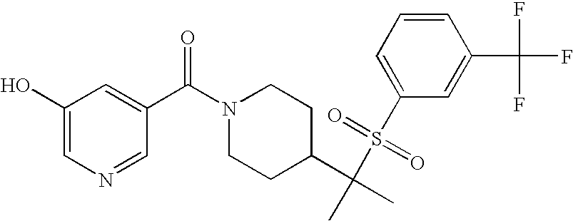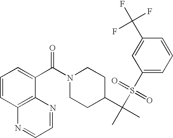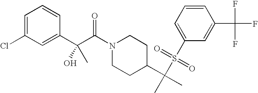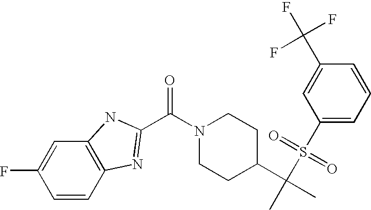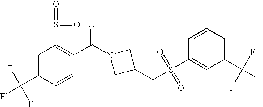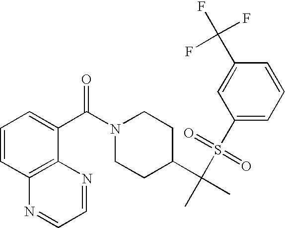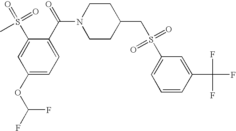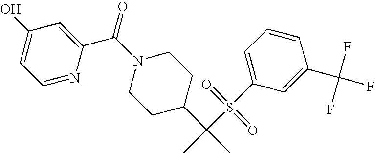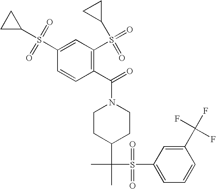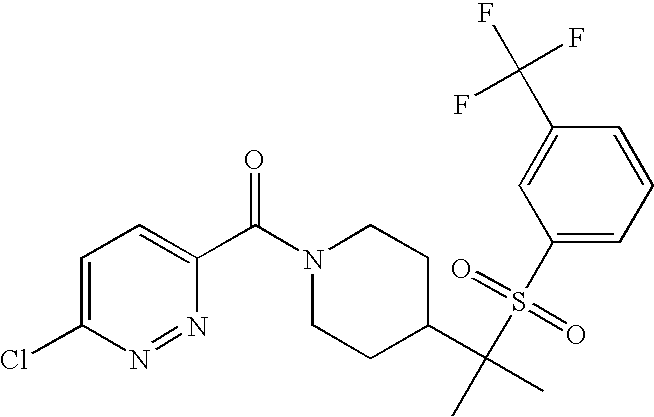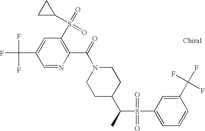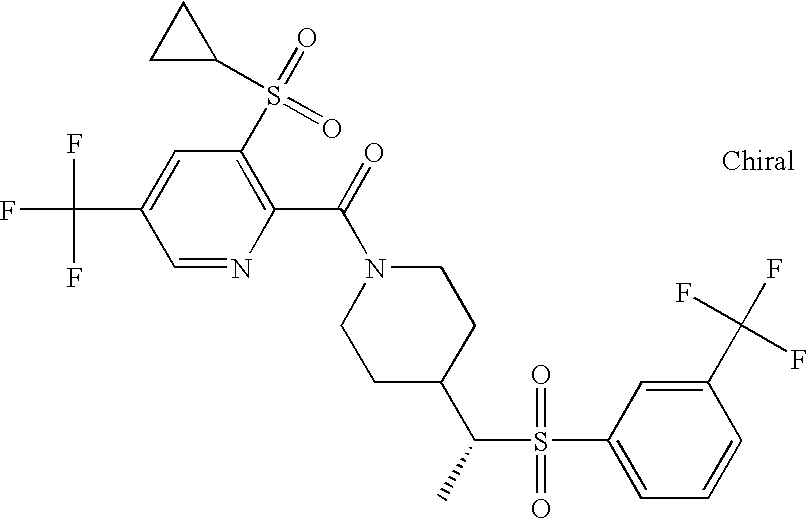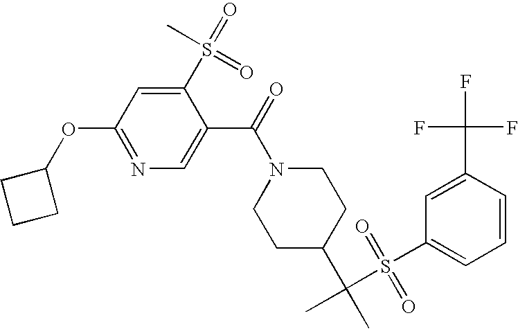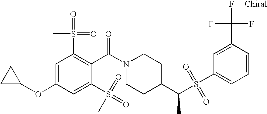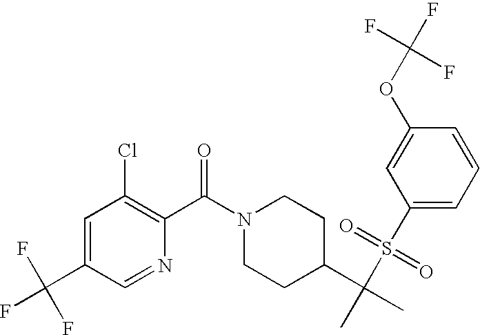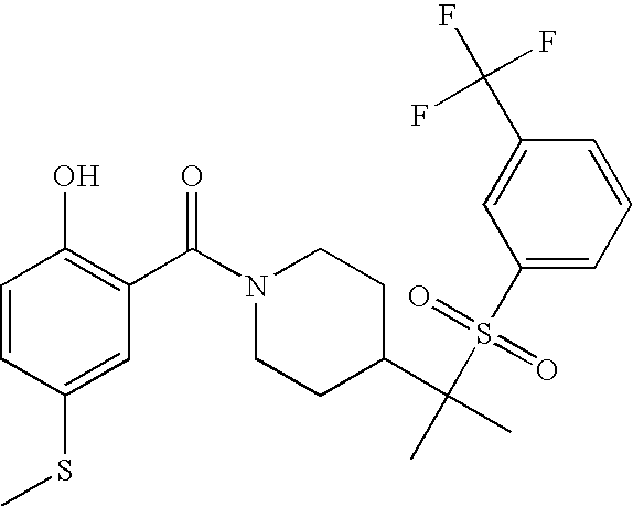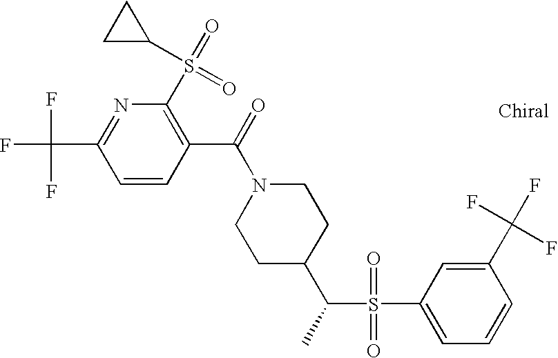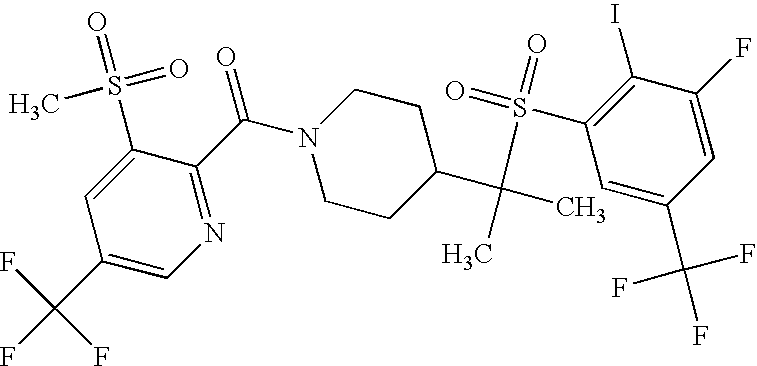 9 1-[4-(methylsulfonyl)-2- (trifluoromethoxy)benzoyl]- 4-({[3-(trifluoromethyl)- phenyl]sulfonyl}methyl)- piperidine 574 10 1-[5-fluoro-2- (methylsulfonyl)benzoyl]-4- ({[3-(trifluoromethyl)- phenyl]sulfonyl}methyl) piperidine 508 11 1-[2-(methylsulfonyl)-4- (trifluoromethyl)benzoyl]- 4-({[3-(trifluoromethyl)- phenyl]sulfonyl}methyl)- piperidine 558 12 1-[2-chloro-4- (methylsulfonyl)benzoyl]-4- ({[3-(trifluoromethyl)- phenyl]sulfonyl}methyl) piperidine 524 13 1-[5-fluoro-2-(methyl- sulfonyl)benzoyl]-4- ({[4-fluorophenyl)sulfonyl]- methyl}piperdinehyl} piperidine 458 14 4-{[(4-fluorophenyl)- sulfonyl]methyl}-1-[4- (methylsulfonyl)-2- (trifluoromethoxy)benzoyl] piperidine 524 15 4-{[(4-chlorophenyl)- sulfonyl]methyl}-1-[5- fluoro-2-(methyl- sulfonyl)benzoyl]piperidine 475 16 4-{[(4- chlorophenyl)sulfonyl] methyl}-1-[4-(methylsulfonyl)-2- (trifluoromethoxy)benzoyl] piperidine 541 17 4-{[(3- chlorophenyl)sulfonyl]methyl}- 1-[4-(methylsulfonyl)-2- (trifluoromethoxy)benzoyl] piperidine 541 18 1-(3,5-di-tert-butyl-4- methoxybenzoyl)-4-{[(4- fluorophenyl)sulfonyl]methyl} piperidine 504 19 4-{[(4- chlorophenyl)sulfonyl]methyl}- 1-(3,5-di-tert-butyl-4- methoxybenzoyl)piperidine 520 20 1-[4-(difluoromethoxy)-2- (methylsulfonyl)benzoyl]-4- ({[3-(trifluoromethyl)- phenyl]sulfonyl}methyl) piperidine 556 21 4-{[(4-fluorophenyl)- sulfonyl]methyl}-1-[2- (methylsulfonyl)-4- (trifluoromethyl)benzoyl] piperidine 508 22 1-[4-(difluoromethoxy)-2- (methylsulfonyl)benzoyl]-4- {[(4- fluorophenyl)sulfonyl]methyl} piperidine 506 23 4-{[(4- chlorophenyl)sulfonyl]methyl}- 1-[2-(methylsulfonyl)-4- (trifluoromethyl)benzoyl] piperidine 524 24 4-{[(4- chlorophenyl)sulfonyl]methy1}-1- [4-(difluoromethoxy)-2- (methylsulfonyl)benzoyl] piperidine 522 25 1-[2-(methylsulfonyl)-4- (trifluoromethoxy)benzoyl]- 4-({{3- (trifluoromethyl)phenyl] sulfonyl}methyl)piperidine 574 26 4-{[(4- chlorophenyl)sulfonyl]methyl}- 1-[2-(methylsulfonyl)-4- (trifluoromethoxy)benzoyl] piperidine 540 27 4-{[(4- fluorophenyl)sulfonyl]methyl}- 1-[2-(methylsulfonyl)-4- (trifluoromethoxy)benzoyl] piperidine 524 28 1-[4-(methylsulfonyl)-2- (trifluoromethoxy)benzoyl]- 4-(1-{[3-(trifluoromethyl) phenyl]sulfonyl}ethyl) piperidine 588 29 1-[4-(methylsulfonyl)-2- (trifluoromethoxy)benzoyl]- 4-((1S)-1-{[3-(trifluoromethyl) phenyl]sulfonyl}ethyl)piperidine 588 30 1-[4-(methylsulfonyl)-2- (trifluoromethoxy)benzoyl]- 4-((1R)-1-{[3- (trifluoromethyl) phenyl]sulfonyl} ethyl)piperidine 588 31 4-{1-[(4- fluorophenyl)sulfonyl]ethyl}-1- [4-(methylsulfonyl)-2- (trifluoromethoxy)benzoyl] piperidine 538 32 4-{1-[(4- chlorophenyl)sulfonyl]ethyl}- 1-[4-(methylsulfonyl)-2- (trifluoromethoxy)benzoyl] piperidine 555 33 4-{1-[(4- chlorophenyl)sulfonyl]ethyl}- 1-[5-fluoro-2-(methylsulfonyl) benzoyl]piperidine 488 34 1-[5-fluoro-2- (methylsulfonyl)benzoyl]- 4-(1-{[3-(trifluoromethyl)phenyl] sulfonyl}ethyl)piperidine 522 35 1-[2-(methylsulfonyl)-4- (trifluoromethyl)benzoyl]- 4-(1-{[3- (trifluoromethyl) phenyl]sulfonyl} ethyl)piperidine 572 36 tert-butyl4-(1-{[3- (trifluoromethyl)phenyl] sulfonyl}ethyl)piperidine-1- carboxylate 422 37 1-[2-(methylsulfonyl)-4- (trifluoromethoxy)benzoyl]- 4-((1S)-1-{[3- (trifluoromethyl)phenyl] sulfonyl}ethyl)piperidine 588 38 1-[4-(difluoromethoxy)-2- (methylsulfonyl)benzoyl]- 4-((1S)-1-{[3- (trifluoromethyl)phenyl] sulfonyl}ethyl)piperidine 570 39 1-[2-(methylsulfonyl)-4- (trifluoromethoxy)benzoyl]- 4-((1R)-1-{[3- trifluoromethyl)phenyl] sulfonyl}ethyl)piperidine 588 40 1-[4-(difluoromethoxy)-2- (methylsulfonyl)benzoyl]- 4-((1R)-1-{[3- (trifluoromethyl)phenyl] sulfonyl}ethyl)piperidine 570 41 1-[4-(cyclopropyloxy)-2,6- bis(methylsulfonyl)benzoyl]- 4-((1S)-1-{[3-(trifluoromethyl) phenyl] sulfonyl}ethyl)piperidine 638 42 1-[4-(cyclopropyloxy)-2,6- bis(methylsulfonyl)benzoyl]- 4-((1R)-1-{[3- (trifluoromethyl)phenyl] sulfonyl}ethyl)piperidine 638 43 2-(cyclopropylsulfonyl)-6- (trifluoromethyl)-3- {[4-((1S)-1-{[3- (trifluoromethyl)phenyl] sulfonyl}ethyl)piperidin-1- yl]carbonyl}pyridine 599 44 2-(cyclopropylsulfonyl)-6- (trifluoromethyl)-3- {[4-((1R)-1-{[3- (trifluoromethyl)phenyl] sulfonyl}ethyl)piperidin-1- yl]carbonyl}pyridine 599 45 3-chloro-5- (trifluoromethyl)-2-{[4- ((1S)-1-{[3- (trifluoromethyl)phenyl] sulfonyl}ethyl)piperidin-1- yl]carbonyl}pyridine 529 46 3-chloro-5- (trifluoromethyl)-2-{[4- ((1S)-1-{[3- (trifluoromethyl)phenyl] sulfonyl}ethyl)piperidin-1- yl]carbonyl}pyridine 529 47 3-(methylsulfonyl)-5- (trifluoromethyl)-2-{[4- ((1S)-1-{[3- (trifluoromethyl)phenyl] sulfonyl}ethyl)piperidin-1- yl]carbonyl}pyridine 573 48 3-(methylsulfonyl)-5- (trifluoromethyl)-2-{[4- ((1S)-1-{[3- (trifluoromethyl)phenyl] sulfonyl}ethyl)piperidin-1- yl]carbonyl}pyridine 573 49 3-(cyclopropylsulfonyl)-5- (trifluoromethyl)-2- {[4-((1S)-1-{[3- (trifluoromethyl)phenyl] sulfonyl}ethyl)piperidin-1- yl]carbonyl}pyridine 599 50 3-(cyclopropylsulfonyl)-5- (trifluoromethyl)-2- {[4-((1S)-1-{[3- (trifluoromethyl)phenyl] sulfonyl}ethyl)piperidin-1- yl]carbonyl}pyridine 599 51 4-(cyclopropyl{[3- (trifluoromethyl)phenyl] sulfonyl}methyl)-1-[5-fluoro- 2- (methylsulfonyl)benzoyl] piperidine 548 52 4-(cyclopropyl{[3- (trifluoromethyl)phenyl] sulfonyl}methyl)-1-[4- (methylsulfonyl)-2- (trifluoromethoxy)benzoyl] piperidine 514 53 1-[4-(methylsulfonyl)-2- (trifluoromethoxy)benzoyl]- 4-(1-methyl-1-{[3- (trifluoromethyl)phenyl] sulfonyl}ethyl)piperidine 602 54 1-[2-(methylsulfonyl)-4 (trifluoromethyl)benzoyl]- 4-(1-methyl-1-{[3- (trifluoromethyl)phenyl] sulfonyl}ethyl)piperidine 586 55 1-[5-fluoro-2- (methylsulfonyl)benzoyl]- 4-(1-methyl-1-{[3- (trifluoromethyl)phenyl] sulfonyl}ethyl)piperidine 536 56 1-(3-fluorobenzoyl)-4-(1- methyl-1-{[3- (trifluoromethyl)phenyl] sulfonyl}ethyl)piperidine 458 57 1-(3-methylbenzoyl)-4- (1-methyl-1-{[3- (trifluoromethyl)phenyl] sulfonyl}ethyl)piperidine 454 58 1-(3-methoxybenzoyl)-4- (1-methyl-1-{[3- (trifluoromethyl)phenyl] sulfonyl}ethyl)piperidine 470 59 1-(4-isopropylbenzoyl)-4- (1-methyl-1-{[3- (trifluoromethyl)phenyl] sulfonyl}ethyl)piperidine 