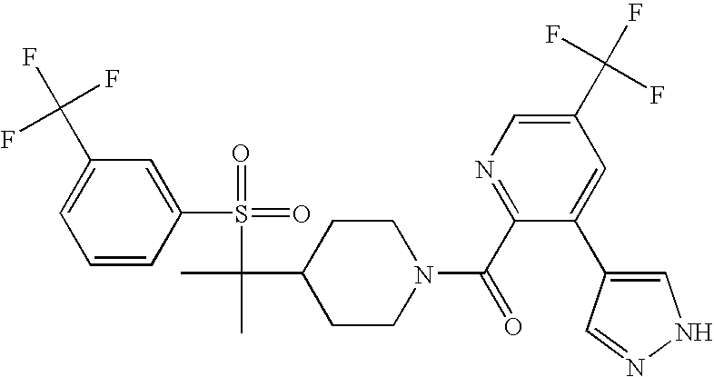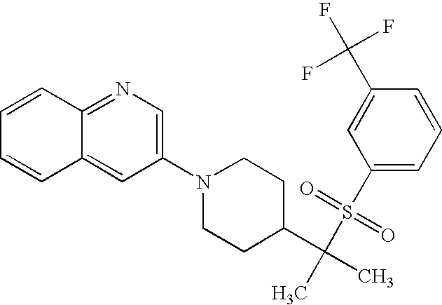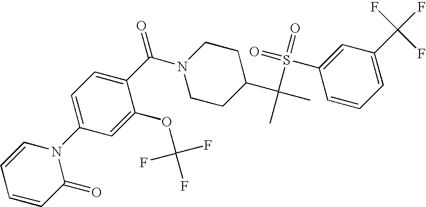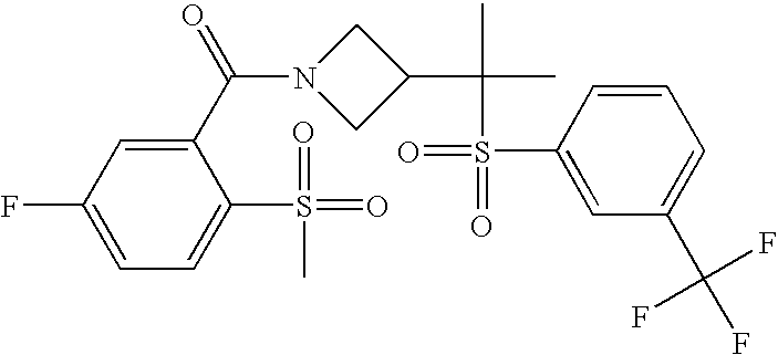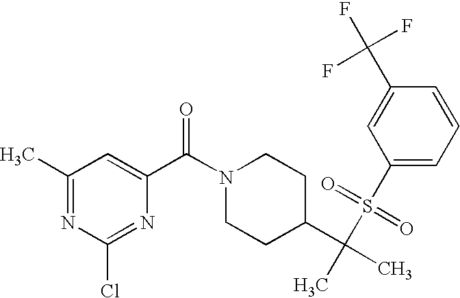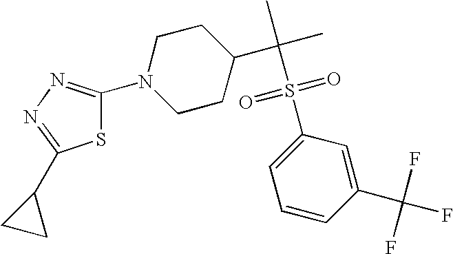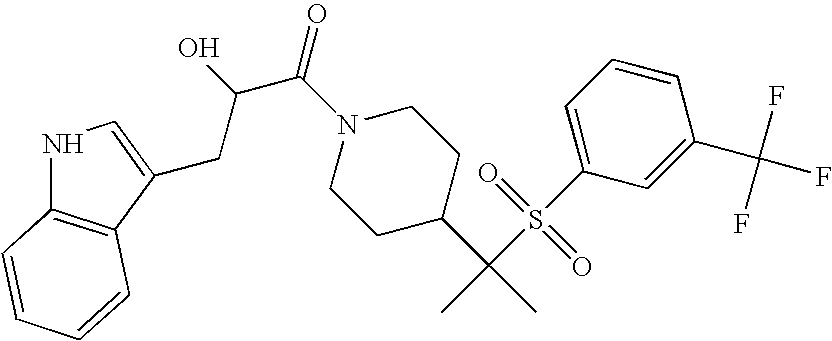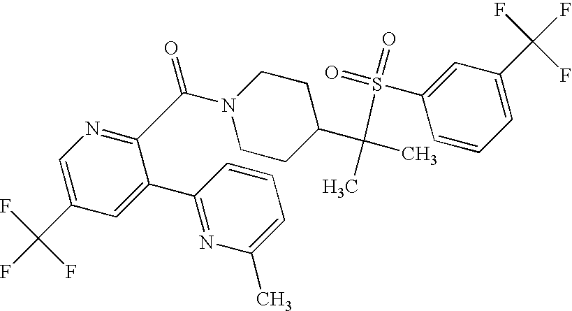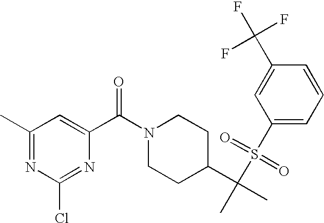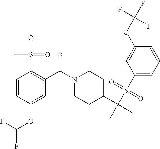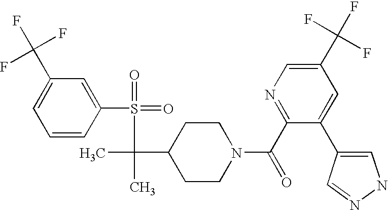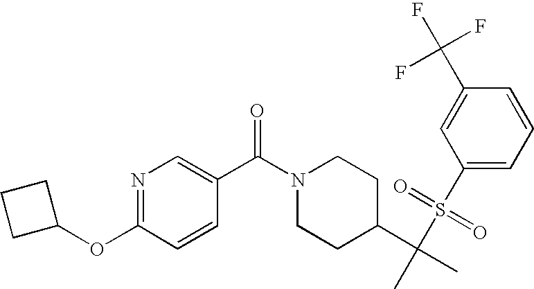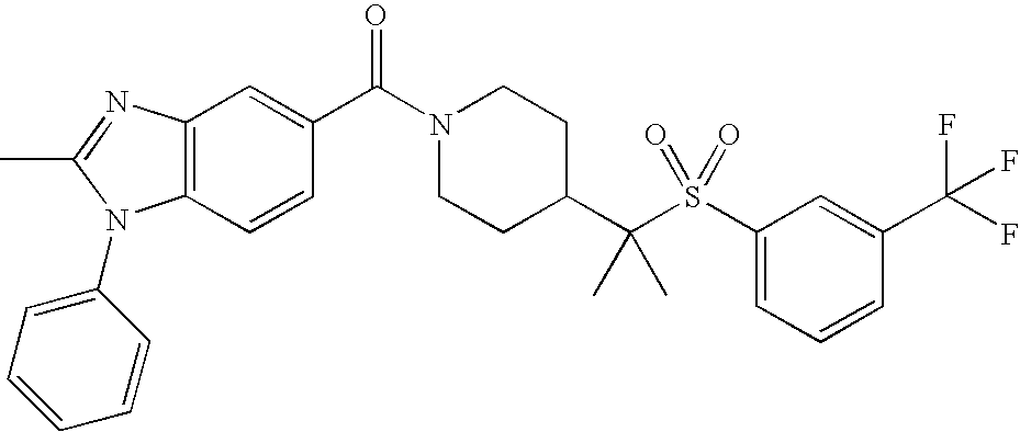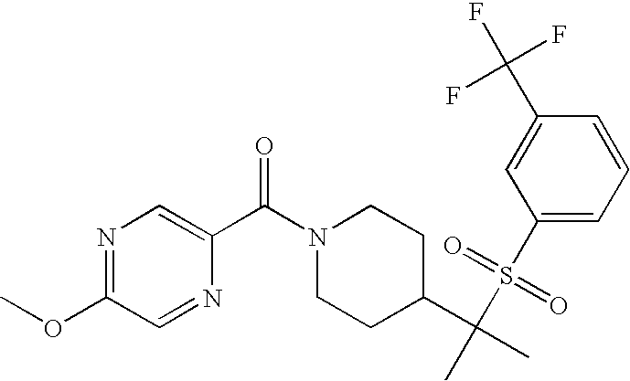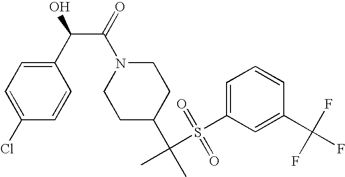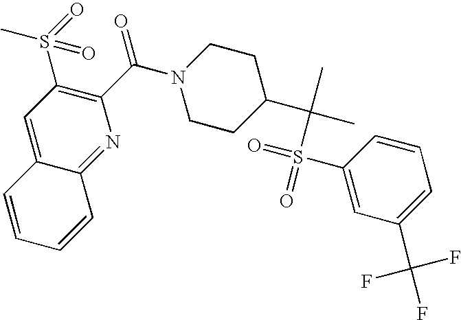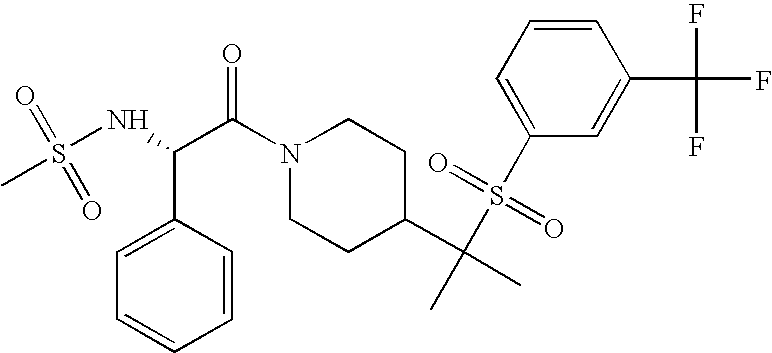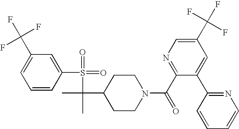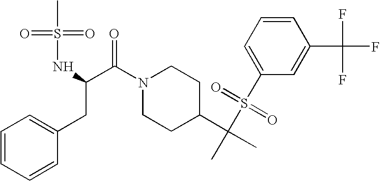 9 1-[4-(methylsulfonyl)-2- (trifluoromethoxy)benzoyl]- 4-({[3-(trifluoromethyl)- phenyl]sulfonyl}methyl)- piperidine 574 10 1-[5-fluoro-2- (methylsulfonyl)benzoyl]-4- ({[3-(trifluoromethyl)- phenyl]sulfonyl}methyl) piperidine 508 11 1-[2-(methylsulfonyl)-4- (trifluoromethyl)benzoyl]- 4-({[3-(trifluoromethyl)- phenyl]sulfonyl}methyl)- piperidine 558 12 1-[2-chloro-4- (methylsulfonyl)benzoyl]-4- ({[3-(trifluoromethyl)- phenyl]sulfonyl}methyl) piperidine 524 13 1-[5-fluoro-2-(methyl- sulfonyl)benzoyl]-4- ({[4-fluorophenyl)sulfonyl]- methyl}piperdinehyl} piperidine 458 14 4-{[(4-fluorophenyl)- sulfonyl]methyl}-1-[4- (methylsulfonyl)-2- (trifluoromethoxy)benzoyl] piperidine 524 15 4-{[(4-chlorophenyl)- sulfonyl]methyl}-1-[5- fluoro-2-(methyl- sulfonyl)benzoyl]piperidine 475 16 4-{[(4- chlorophenyl)sulfonyl] methyl}-1-[4-(methylsulfonyl)-2- (trifluoromethoxy)benzoyl] piperidine 541 17 4-{[(3- chlorophenyl)sulfonyl]methyl}- 1-[4-(methylsulfonyl)-2- (trifluoromethoxy)benzoyl] piperidine 541 18 1-(3,5-di-tert-butyl-4- methoxybenzoyl)-4-{[(4- fluorophenyl)sulfonyl]methyl} piperidine 504 19 4-{[(4- chlorophenyl)sulfonyl]methyl}- 1-(3,5-di-tert-butyl-4- methoxybenzoyl)piperidine 520 20 1-[4-(difluoromethoxy)-2- (methylsulfonyl)benzoyl]-4- ({[3-(trifluoromethyl)- phenyl]sulfonyl}methyl) piperidine 556 21 4-{[(4-fluorophenyl)- sulfonyl]methyl}-1-[2- (methylsulfonyl)-4- (trifluoromethyl)benzoyl] piperidine 508 22 1-[4-(difluoromethoxy)-2- (methylsulfonyl)benzoyl]-4- {[(4- fluorophenyl)sulfonyl]methyl} piperidine 506 23 4-{[(4- chlorophenyl)sulfonyl]methyl}- 1-[2-(methylsulfonyl)-4- (trifluoromethyl)benzoyl] piperidine 524 24 4-{[(4- chlorophenyl)sulfonyl]methy1}-1- [4-(difluoromethoxy)-2- (methylsulfonyl)benzoyl] piperidine 522 25 1-[2-(methylsulfonyl)-4- (trifluoromethoxy)benzoyl]- 4-({{3- (trifluoromethyl)phenyl] sulfonyl}methyl)piperidine 574 26 4-{[(4- chlorophenyl)sulfonyl]methyl}- 1-[2-(methylsulfonyl)-4- (trifluoromethoxy)benzoyl] piperidine 540 27 4-{[(4- fluorophenyl)sulfonyl]methyl}- 1-[2-(methylsulfonyl)-4- (trifluoromethoxy)benzoyl] piperidine 524 28 1-[4-(methylsulfonyl)-2- (trifluoromethoxy)benzoyl]- 4-(1-{[3-(trifluoromethyl) phenyl]sulfonyl}ethyl) piperidine 588 29 1-[4-(methylsulfonyl)-2- (trifluoromethoxy)benzoyl]- 4-((1S)-1-{[3-(trifluoromethyl) phenyl]sulfonyl}ethyl)piperidine 588 30 1-[4-(methylsulfonyl)-2- (trifluoromethoxy)benzoyl]- 4-((1R)-1-{[3- (trifluoromethyl) phenyl]sulfonyl} ethyl)piperidine 588 31 4-{1-[(4- fluorophenyl)sulfonyl]ethyl}-1- [4-(methylsulfonyl)-2- (trifluoromethoxy)benzoyl] piperidine 538 32 4-{1-[(4- chlorophenyl)sulfonyl]ethyl}- 1-[4-(methylsulfonyl)-2- (trifluoromethoxy)benzoyl] piperidine 555 33 4-{1-[(4- chlorophenyl)sulfonyl]ethyl}- 1-[5-fluoro-2-(methylsulfonyl) benzoyl]piperidine 488 34 1-[5-fluoro-2- (methylsulfonyl)benzoyl]- 4-(1-{[3-(trifluoromethyl)phenyl] sulfonyl}ethyl)piperidine 522 35 1-[2-(methylsulfonyl)-4- (trifluoromethyl)benzoyl]- 4-(1-{[3- (trifluoromethyl) phenyl]sulfonyl} ethyl)piperidine 572 36 tert-butyl4-(1-{[3- (trifluoromethyl)phenyl] sulfonyl}ethyl)piperidine-1- carboxylate 422 37 1-[2-(methylsulfonyl)-4- (trifluoromethoxy)benzoyl]- 4-((1S)-1-{[3- (trifluoromethyl)phenyl] sulfonyl}ethyl)piperidine 588 38 1-[4-(difluoromethoxy)-2- (methylsulfonyl)benzoyl]- 4-((1S)-1-{[3- (trifluoromethyl)phenyl] sulfonyl}ethyl)piperidine 570 39 1-[2-(methylsulfonyl)-4- (trifluoromethoxy)benzoyl]- 4-((1R)-1-{[3- trifluoromethyl)phenyl] sulfonyl}ethyl)piperidine 588 40 1-[4-(difluoromethoxy)-2- (methylsulfonyl)benzoyl]- 4-((1R)-1-{[3- (trifluoromethyl)phenyl] sulfonyl}ethyl)piperidine 570 41 1-[4-(cyclopropyloxy)-2,6- bis(methylsulfonyl)benzoyl]- 4-((1S)-1-{[3-(trifluoromethyl) phenyl] sulfonyl}ethyl)piperidine 638 42 1-[4-(cyclopropyloxy)-2,6- bis(methylsulfonyl)benzoyl]- 4-((1R)-1-{[3- (trifluoromethyl)phenyl] sulfonyl}ethyl)piperidine 638 43 2-(cyclopropylsulfonyl)-6- (trifluoromethyl)-3- {[4-((1S)-1-{[3- (trifluoromethyl)phenyl] sulfonyl}ethyl)piperidin-1- yl]carbonyl}pyridine 599 44 2-(cyclopropylsulfonyl)-6- (trifluoromethyl)-3- {[4-((1R)-1-{[3- (trifluoromethyl)phenyl] sulfonyl}ethyl)piperidin-1- yl]carbonyl}pyridine 599 45 3-chloro-5- (trifluoromethyl)-2-{[4- ((1S)-1-{[3- (trifluoromethyl)phenyl] sulfonyl}ethyl)piperidin-1- yl]carbonyl}pyridine 529 46 3-chloro-5- (trifluoromethyl)-2-{[4- ((1S)-1-{[3- (trifluoromethyl)phenyl] sulfonyl}ethyl)piperidin-1- yl]carbonyl}pyridine 529 47 3-(methylsulfonyl)-5- (trifluoromethyl)-2-{[4- ((1S)-1-{[3- (trifluoromethyl)phenyl] sulfonyl}ethyl)piperidin-1- yl]carbonyl}pyridine 573 48 3-(methylsulfonyl)-5- (trifluoromethyl)-2-{[4- ((1S)-1-{[3- (trifluoromethyl)phenyl] sulfonyl}ethyl)piperidin-1- yl]carbonyl}pyridine 573 49 3-(cyclopropylsulfonyl)-5- (trifluoromethyl)-2- {[4-((1S)-1-{[3- (trifluoromethyl)phenyl] sulfonyl}ethyl)piperidin-1- yl]carbonyl}pyridine 599 50 3-(cyclopropylsulfonyl)-5- (trifluoromethyl)-2- {[4-((1S)-1-{[3- (trifluoromethyl)phenyl] sulfonyl}ethyl)piperidin-1- yl]carbonyl}pyridine 599 51 4-(cyclopropyl{[3- (trifluoromethyl)phenyl] sulfonyl}methyl)-1-[5-fluoro- 2- (methylsulfonyl)benzoyl] piperidine 548 52 4-(cyclopropyl{[3- (trifluoromethyl)phenyl] sulfonyl}methyl)-1-[4- (methylsulfonyl)-2- (trifluoromethoxy)benzoyl] piperidine 514 53 1-[4-(methylsulfonyl)-2- (trifluoromethoxy)benzoyl]- 4-(1-methyl-1-{[3- (trifluoromethyl)phenyl] sulfonyl}ethyl)piperidine 602 54 1-[2-(methylsulfonyl)-4 (trifluoromethyl)benzoyl]- 4-(1-methyl-1-{[3- (trifluoromethyl)phenyl] sulfonyl}ethyl)piperidine 586 55 1-[5-fluoro-2- (methylsulfonyl)benzoyl]- 4-(1-methyl-1-{[3- (trifluoromethyl)phenyl] sulfonyl}ethyl)piperidine 536 56 1-(3-fluorobenzoyl)-4-(1- methyl-1-{[3- (trifluoromethyl)phenyl] sulfonyl}ethyl)piperidine 458 57 1-(3-methylbenzoyl)-4- (1-methyl-1-{[3- (trifluoromethyl)phenyl] sulfonyl}ethyl)piperidine 454 58 1-(3-methoxybenzoyl)-4- (1-methyl-1-{[3- (trifluoromethyl)phenyl] sulfonyl}ethyl)piperidine 470 59 1-(4-isopropylbenzoyl)-4- (1-methyl-1-{[3- (trifluoromethyl)phenyl] sulfonyl}ethyl)piperidine 