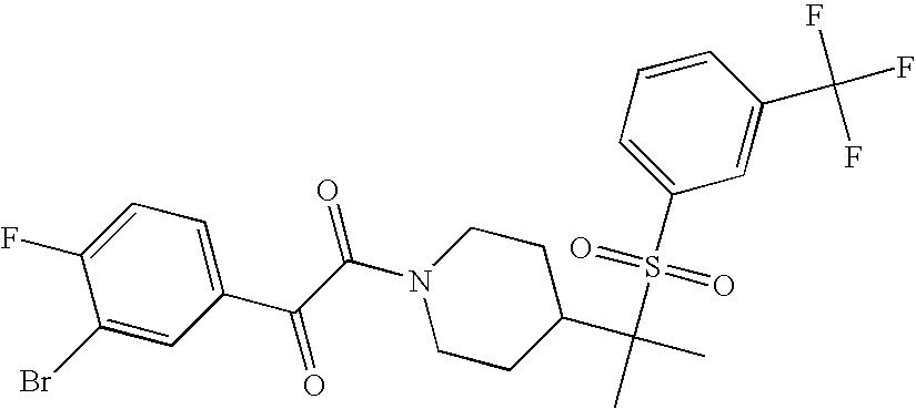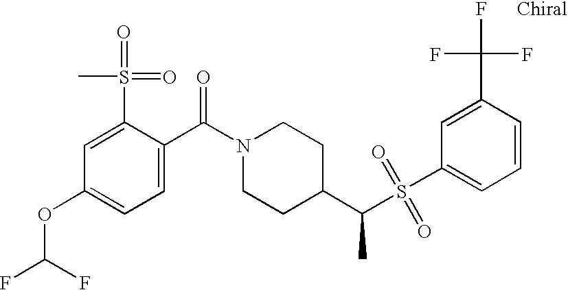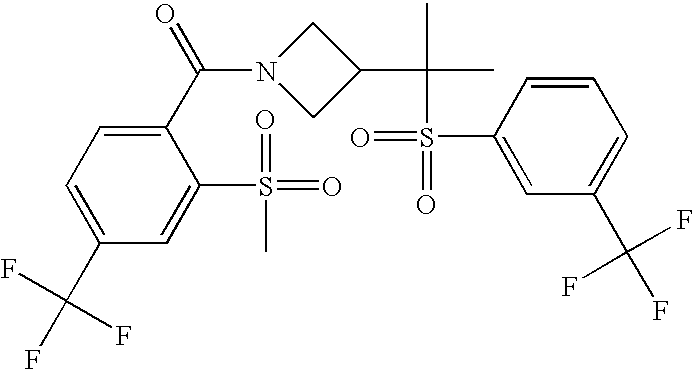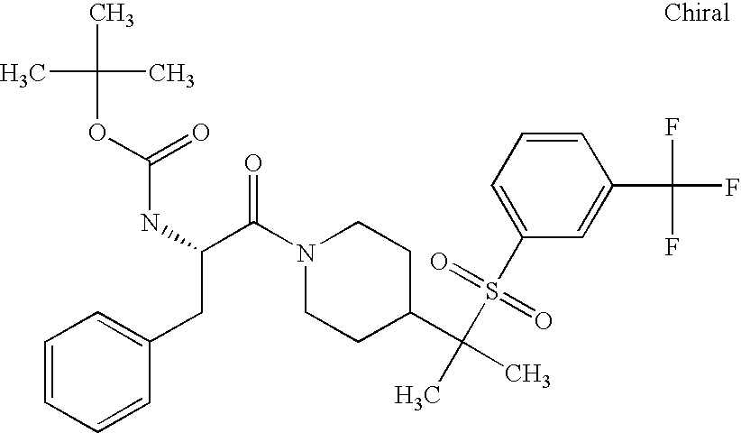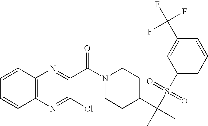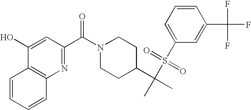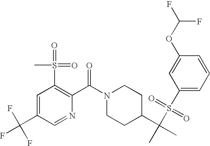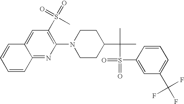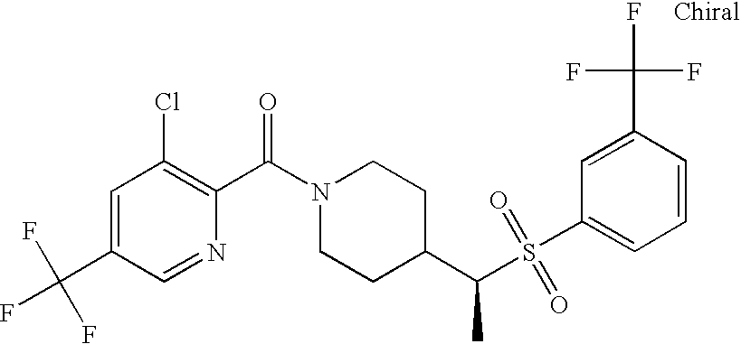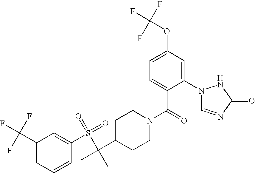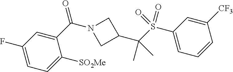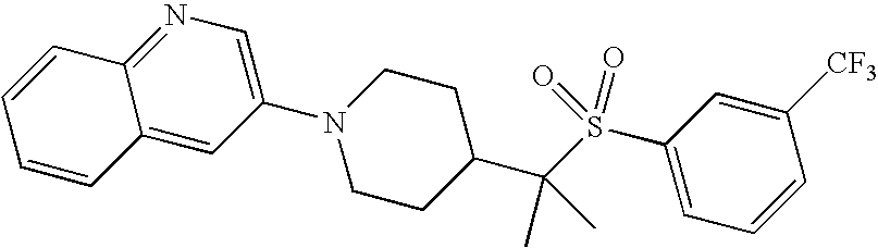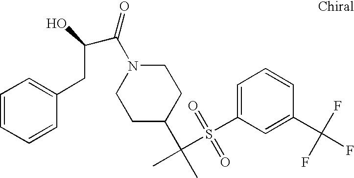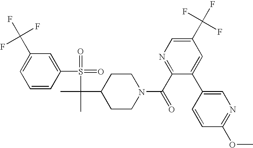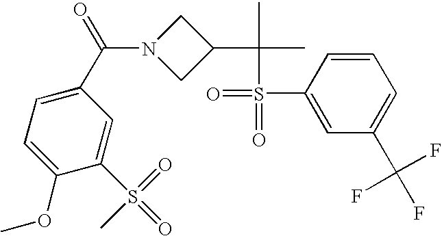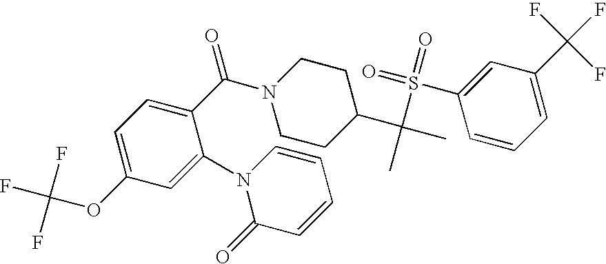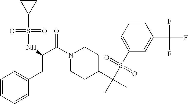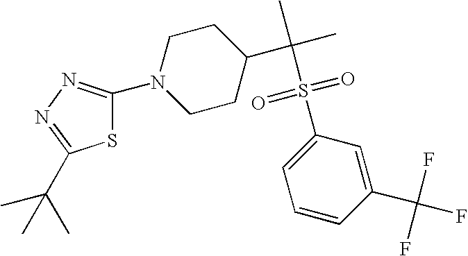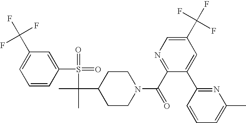 9 1-[4-(methylsulfonyl)-2- (trifluoromethoxy)benzoyl]- 4-({[3-(trifluoromethyl)- phenyl]sulfonyl}methyl)- piperidine 574 10 1-[5-fluoro-2- (methylsulfonyl)benzoyl]-4- ({[3-(trifluoromethyl)- phenyl]sulfonyl}methyl) piperidine 508 11 1-[2-(methylsulfonyl)-4- (trifluoromethyl)benzoyl]- 4-({[3-(trifluoromethyl)- phenyl]sulfonyl}methyl)- piperidine 558 12 1-[2-chloro-4- (methylsulfonyl)benzoyl]-4- ({[3-(trifluoromethyl)- phenyl]sulfonyl}methyl) piperidine 524 13 1-[5-fluoro-2-(methyl- sulfonyl)benzoyl]-4- ({[4-fluorophenyl)sulfonyl]- methyl}piperdinehyl} piperidine 458 14 4-{[(4-fluorophenyl)- sulfonyl]methyl}-1-[4- (methylsulfonyl)-2- (trifluoromethoxy)benzoyl] piperidine 524 15 4-{[(4-chlorophenyl)- sulfonyl]methyl}-1-[5- fluoro-2-(methyl- sulfonyl)benzoyl]piperidine 475 16 4-{[(4- chlorophenyl)sulfonyl] methyl}-1-[4-(methylsulfonyl)-2- (trifluoromethoxy)benzoyl] piperidine 541 17 4-{[(3- chlorophenyl)sulfonyl]methyl}- 1-[4-(methylsulfonyl)-2- (trifluoromethoxy)benzoyl] piperidine 541 18 1-(3,5-di-tert-butyl-4- methoxybenzoyl)-4-{[(4- fluorophenyl)sulfonyl]methyl} piperidine 504 19 4-{[(4- chlorophenyl)sulfonyl]methyl}- 1-(3,5-di-tert-butyl-4- methoxybenzoyl)piperidine 520 20 1-[4-(difluoromethoxy)-2- (methylsulfonyl)benzoyl]-4- ({[3-(trifluoromethyl)- phenyl]sulfonyl}methyl) piperidine 556 21 4-{[(4-fluorophenyl)- sulfonyl]methyl}-1-[2- (methylsulfonyl)-4- (trifluoromethyl)benzoyl] piperidine 508 22 1-[4-(difluoromethoxy)-2- (methylsulfonyl)benzoyl]-4- {[(4- fluorophenyl)sulfonyl]methyl} piperidine 506 23 4-{[(4- chlorophenyl)sulfonyl]methyl}- 1-[2-(methylsulfonyl)-4- (trifluoromethyl)benzoyl] piperidine 524 24 4-{[(4- chlorophenyl)sulfonyl]methy1}-1- [4-(difluoromethoxy)-2- (methylsulfonyl)benzoyl] piperidine 522 25 1-[2-(methylsulfonyl)-4- (trifluoromethoxy)benzoyl]- 4-({{3- (trifluoromethyl)phenyl] sulfonyl}methyl)piperidine 574 26 4-{[(4- chlorophenyl)sulfonyl]methyl}- 1-[2-(methylsulfonyl)-4- (trifluoromethoxy)benzoyl] piperidine 540 27 4-{[(4- fluorophenyl)sulfonyl]methyl}- 1-[2-(methylsulfonyl)-4- (trifluoromethoxy)benzoyl] piperidine 524 28 1-[4-(methylsulfonyl)-2- (trifluoromethoxy)benzoyl]- 4-(1-{[3-(trifluoromethyl) phenyl]sulfonyl}ethyl) piperidine 588 29 1-[4-(methylsulfonyl)-2- (trifluoromethoxy)benzoyl]- 4-((1S)-1-{[3-(trifluoromethyl) phenyl]sulfonyl}ethyl)piperidine 588 30 1-[4-(methylsulfonyl)-2- (trifluoromethoxy)benzoyl]- 4-((1R)-1-{[3- (trifluoromethyl) phenyl]sulfonyl} ethyl)piperidine 588 31 4-{1-[(4- fluorophenyl)sulfonyl]ethyl}-1- [4-(methylsulfonyl)-2- (trifluoromethoxy)benzoyl] piperidine 538 32 4-{1-[(4- chlorophenyl)sulfonyl]ethyl}- 1-[4-(methylsulfonyl)-2- (trifluoromethoxy)benzoyl] piperidine 555 33 4-{1-[(4- chlorophenyl)sulfonyl]ethyl}- 1-[5-fluoro-2-(methylsulfonyl) benzoyl]piperidine 488 34 1-[5-fluoro-2- (methylsulfonyl)benzoyl]- 4-(1-{[3-(trifluoromethyl)phenyl] sulfonyl}ethyl)piperidine 522 35 1-[2-(methylsulfonyl)-4- (trifluoromethyl)benzoyl]- 4-(1-{[3- (trifluoromethyl) phenyl]sulfonyl} ethyl)piperidine 572 36 tert-butyl4-(1-{[3- (trifluoromethyl)phenyl] sulfonyl}ethyl)piperidine-1- carboxylate 422 37 1-[2-(methylsulfonyl)-4- (trifluoromethoxy)benzoyl]- 4-((1S)-1-{[3- (trifluoromethyl)phenyl] sulfonyl}ethyl)piperidine 588 38 1-[4-(difluoromethoxy)-2- (methylsulfonyl)benzoyl]- 4-((1S)-1-{[3- (trifluoromethyl)phenyl] sulfonyl}ethyl)piperidine 570 39 1-[2-(methylsulfonyl)-4- (trifluoromethoxy)benzoyl]- 4-((1R)-1-{[3- trifluoromethyl)phenyl] sulfonyl}ethyl)piperidine 588 40 1-[4-(difluoromethoxy)-2- (methylsulfonyl)benzoyl]- 4-((1R)-1-{[3- (trifluoromethyl)phenyl] sulfonyl}ethyl)piperidine 570 41 1-[4-(cyclopropyloxy)-2,6- bis(methylsulfonyl)benzoyl]- 4-((1S)-1-{[3-(trifluoromethyl) phenyl] sulfonyl}ethyl)piperidine 638 42 1-[4-(cyclopropyloxy)-2,6- bis(methylsulfonyl)benzoyl]- 4-((1R)-1-{[3- (trifluoromethyl)phenyl] sulfonyl}ethyl)piperidine 638 43 2-(cyclopropylsulfonyl)-6- (trifluoromethyl)-3- {[4-((1S)-1-{[3- (trifluoromethyl)phenyl] sulfonyl}ethyl)piperidin-1- yl]carbonyl}pyridine 599 44 2-(cyclopropylsulfonyl)-6- (trifluoromethyl)-3- {[4-((1R)-1-{[3- (trifluoromethyl)phenyl] sulfonyl}ethyl)piperidin-1- yl]carbonyl}pyridine 599 45 3-chloro-5- (trifluoromethyl)-2-{[4- ((1S)-1-{[3- (trifluoromethyl)phenyl] sulfonyl}ethyl)piperidin-1- yl]carbonyl}pyridine 529 46 3-chloro-5- (trifluoromethyl)-2-{[4- ((1S)-1-{[3- (trifluoromethyl)phenyl] sulfonyl}ethyl)piperidin-1- yl]carbonyl}pyridine 529 47 3-(methylsulfonyl)-5- (trifluoromethyl)-2-{[4- ((1S)-1-{[3- (trifluoromethyl)phenyl] sulfonyl}ethyl)piperidin-1- yl]carbonyl}pyridine 573 48 3-(methylsulfonyl)-5- (trifluoromethyl)-2-{[4- ((1S)-1-{[3- (trifluoromethyl)phenyl] sulfonyl}ethyl)piperidin-1- yl]carbonyl}pyridine 573 49 3-(cyclopropylsulfonyl)-5- (trifluoromethyl)-2- {[4-((1S)-1-{[3- (trifluoromethyl)phenyl] sulfonyl}ethyl)piperidin-1- yl]carbonyl}pyridine 599 50 3-(cyclopropylsulfonyl)-5- (trifluoromethyl)-2- {[4-((1S)-1-{[3- (trifluoromethyl)phenyl] sulfonyl}ethyl)piperidin-1- yl]carbonyl}pyridine 599 51 4-(cyclopropyl{[3- (trifluoromethyl)phenyl] sulfonyl}methyl)-1-[5-fluoro- 2- (methylsulfonyl)benzoyl] piperidine 548 52 4-(cyclopropyl{[3- (trifluoromethyl)phenyl] sulfonyl}methyl)-1-[4- (methylsulfonyl)-2- (trifluoromethoxy)benzoyl] piperidine 514 53 1-[4-(methylsulfonyl)-2- (trifluoromethoxy)benzoyl]- 4-(1-methyl-1-{[3- (trifluoromethyl)phenyl] sulfonyl}ethyl)piperidine 602 54 1-[2-(methylsulfonyl)-4 (trifluoromethyl)benzoyl]- 4-(1-methyl-1-{[3- (trifluoromethyl)phenyl] sulfonyl}ethyl)piperidine 586 55 1-[5-fluoro-2- (methylsulfonyl)benzoyl]- 4-(1-methyl-1-{[3- (trifluoromethyl)phenyl] sulfonyl}ethyl)piperidine 536 56 1-(3-fluorobenzoyl)-4-(1- methyl-1-{[3- (trifluoromethyl)phenyl] sulfonyl}ethyl)piperidine 458 57 1-(3-methylbenzoyl)-4- (1-methyl-1-{[3- (trifluoromethyl)phenyl] sulfonyl}ethyl)piperidine 454 58 1-(3-methoxybenzoyl)-4- (1-methyl-1-{[3- (trifluoromethyl)phenyl] sulfonyl}ethyl)piperidine 470 59 1-(4-isopropylbenzoyl)-4- (1-methyl-1-{[3- (trifluoromethyl)phenyl] sulfonyl}ethyl)piperidine 