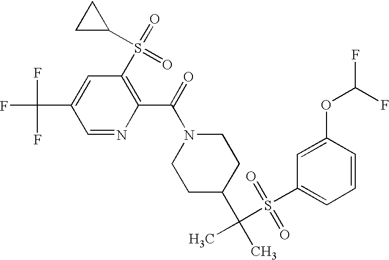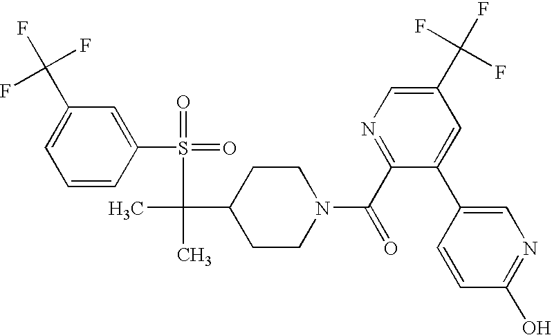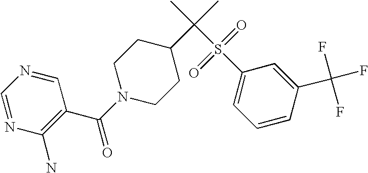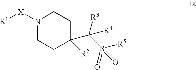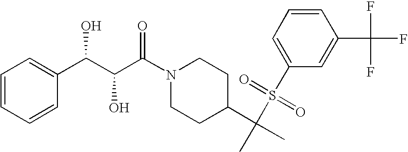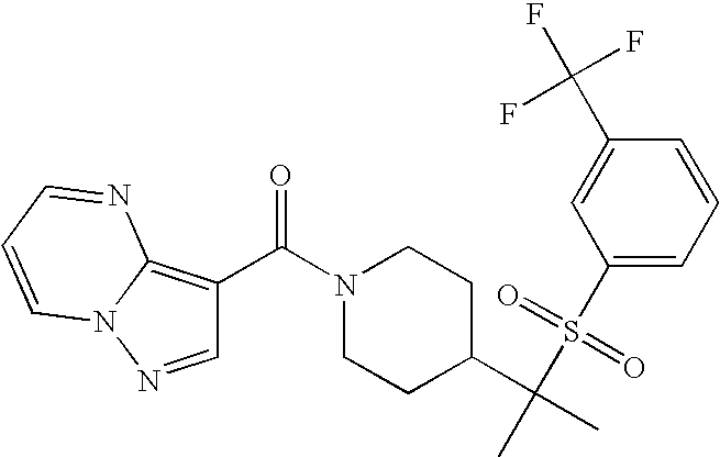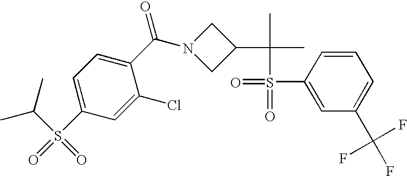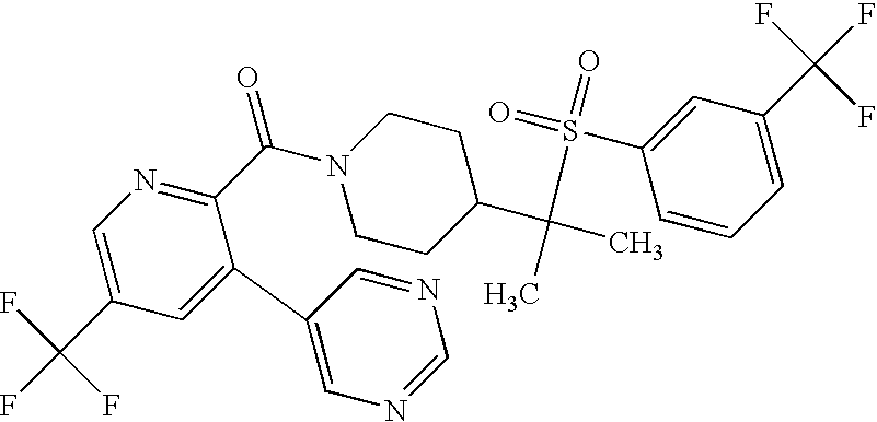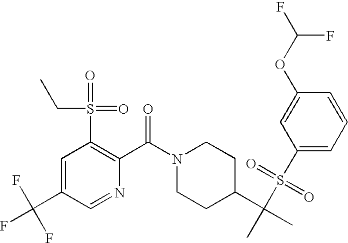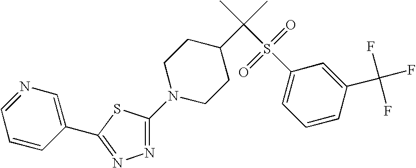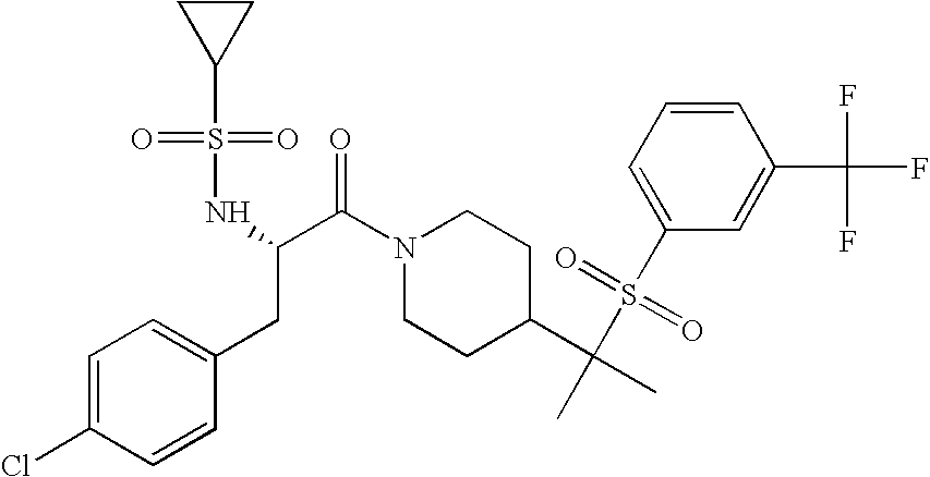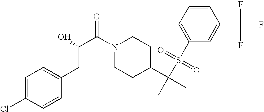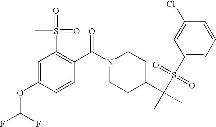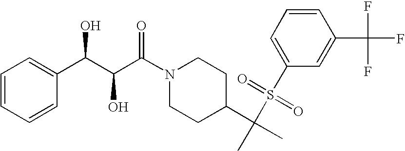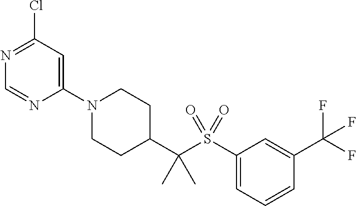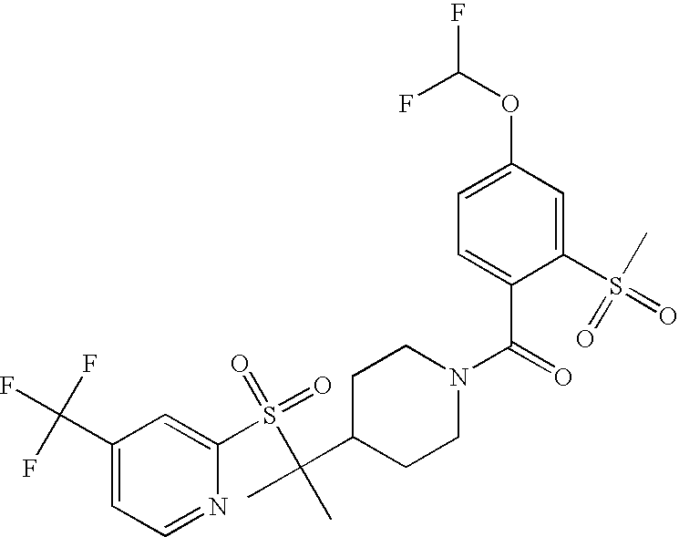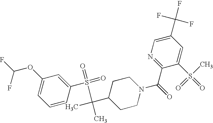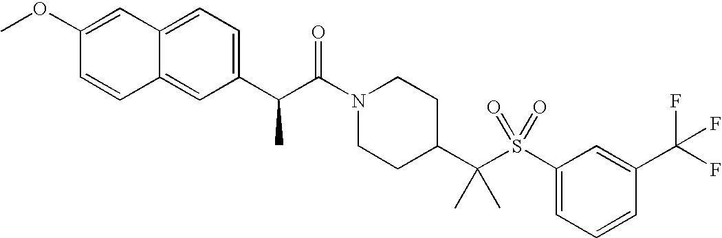 9 1-[4-(methylsulfonyl)-2- (trifluoromethoxy)benzoyl]- 4-({[3-(trifluoromethyl)- phenyl]sulfonyl}methyl)- piperidine 574 10 1-[5-fluoro-2- (methylsulfonyl)benzoyl]-4- ({[3-(trifluoromethyl)- phenyl]sulfonyl}methyl) piperidine 508 11 1-[2-(methylsulfonyl)-4- (trifluoromethyl)benzoyl]- 4-({[3-(trifluoromethyl)- phenyl]sulfonyl}methyl)- piperidine 558 12 1-[2-chloro-4- (methylsulfonyl)benzoyl]-4- ({[3-(trifluoromethyl)- phenyl]sulfonyl}methyl) piperidine 524 13 1-[5-fluoro-2-(methyl- sulfonyl)benzoyl]-4- ({[4-fluorophenyl)sulfonyl]- methyl}piperdinehyl} piperidine 458 14 4-{[(4-fluorophenyl)- sulfonyl]methyl}-1-[4- (methylsulfonyl)-2- (trifluoromethoxy)benzoyl] piperidine 524 15 4-{[(4-chlorophenyl)- sulfonyl]methyl}-1-[5- fluoro-2-(methyl- sulfonyl)benzoyl]piperidine 475 16 4-{[(4- chlorophenyl)sulfonyl] methyl}-1-[4-(methylsulfonyl)-2- (trifluoromethoxy)benzoyl] piperidine 541 17 4-{[(3- chlorophenyl)sulfonyl]methyl}- 1-[4-(methylsulfonyl)-2- (trifluoromethoxy)benzoyl] piperidine 541 18 1-(3,5-di-tert-butyl-4- methoxybenzoyl)-4-{[(4- fluorophenyl)sulfonyl]methyl} piperidine 504 19 4-{[(4- chlorophenyl)sulfonyl]methyl}- 1-(3,5-di-tert-butyl-4- methoxybenzoyl)piperidine 520 20 1-[4-(difluoromethoxy)-2- (methylsulfonyl)benzoyl]-4- ({[3-(trifluoromethyl)- phenyl]sulfonyl}methyl) piperidine 556 21 4-{[(4-fluorophenyl)- sulfonyl]methyl}-1-[2- (methylsulfonyl)-4- (trifluoromethyl)benzoyl] piperidine 508 22 1-[4-(difluoromethoxy)-2- (methylsulfonyl)benzoyl]-4- {[(4- fluorophenyl)sulfonyl]methyl} piperidine 506 23 4-{[(4- chlorophenyl)sulfonyl]methyl}- 1-[2-(methylsulfonyl)-4- (trifluoromethyl)benzoyl] piperidine 524 24 4-{[(4- chlorophenyl)sulfonyl]methy1}-1- [4-(difluoromethoxy)-2- (methylsulfonyl)benzoyl] piperidine 522 25 1-[2-(methylsulfonyl)-4- (trifluoromethoxy)benzoyl]- 4-({{3- (trifluoromethyl)phenyl] sulfonyl}methyl)piperidine 574 26 4-{[(4- chlorophenyl)sulfonyl]methyl}- 1-[2-(methylsulfonyl)-4- (trifluoromethoxy)benzoyl] piperidine 540 27 4-{[(4- fluorophenyl)sulfonyl]methyl}- 1-[2-(methylsulfonyl)-4- (trifluoromethoxy)benzoyl] piperidine 524 28 1-[4-(methylsulfonyl)-2- (trifluoromethoxy)benzoyl]- 4-(1-{[3-(trifluoromethyl) phenyl]sulfonyl}ethyl) piperidine 588 29 1-[4-(methylsulfonyl)-2- (trifluoromethoxy)benzoyl]- 4-((1S)-1-{[3-(trifluoromethyl) phenyl]sulfonyl}ethyl)piperidine 588 30 1-[4-(methylsulfonyl)-2- (trifluoromethoxy)benzoyl]- 4-((1R)-1-{[3- (trifluoromethyl) phenyl]sulfonyl} ethyl)piperidine 588 31 4-{1-[(4- fluorophenyl)sulfonyl]ethyl}-1- [4-(methylsulfonyl)-2- (trifluoromethoxy)benzoyl] piperidine 538 32 4-{1-[(4- chlorophenyl)sulfonyl]ethyl}- 1-[4-(methylsulfonyl)-2- (trifluoromethoxy)benzoyl] piperidine 555 33 4-{1-[(4- chlorophenyl)sulfonyl]ethyl}- 1-[5-fluoro-2-(methylsulfonyl) benzoyl]piperidine 488 34 1-[5-fluoro-2- (methylsulfonyl)benzoyl]- 4-(1-{[3-(trifluoromethyl)phenyl] sulfonyl}ethyl)piperidine 522 35 1-[2-(methylsulfonyl)-4- (trifluoromethyl)benzoyl]- 4-(1-{[3- (trifluoromethyl) phenyl]sulfonyl} ethyl)piperidine 572 36 tert-butyl4-(1-{[3- (trifluoromethyl)phenyl] sulfonyl}ethyl)piperidine-1- carboxylate 422 37 1-[2-(methylsulfonyl)-4- (trifluoromethoxy)benzoyl]- 4-((1S)-1-{[3- (trifluoromethyl)phenyl] sulfonyl}ethyl)piperidine 588 38 1-[4-(difluoromethoxy)-2- (methylsulfonyl)benzoyl]- 4-((1S)-1-{[3- (trifluoromethyl)phenyl] sulfonyl}ethyl)piperidine 570 39 1-[2-(methylsulfonyl)-4- (trifluoromethoxy)benzoyl]- 4-((1R)-1-{[3- trifluoromethyl)phenyl] sulfonyl}ethyl)piperidine 588 40 1-[4-(difluoromethoxy)-2- (methylsulfonyl)benzoyl]- 4-((1R)-1-{[3- (trifluoromethyl)phenyl] sulfonyl}ethyl)piperidine 570 41 1-[4-(cyclopropyloxy)-2,6- bis(methylsulfonyl)benzoyl]- 4-((1S)-1-{[3-(trifluoromethyl) phenyl] sulfonyl}ethyl)piperidine 638 42 1-[4-(cyclopropyloxy)-2,6- bis(methylsulfonyl)benzoyl]- 4-((1R)-1-{[3- (trifluoromethyl)phenyl] sulfonyl}ethyl)piperidine 638 43 2-(cyclopropylsulfonyl)-6- (trifluoromethyl)-3- {[4-((1S)-1-{[3- (trifluoromethyl)phenyl] sulfonyl}ethyl)piperidin-1- yl]carbonyl}pyridine 599 44 2-(cyclopropylsulfonyl)-6- (trifluoromethyl)-3- {[4-((1R)-1-{[3- (trifluoromethyl)phenyl] sulfonyl}ethyl)piperidin-1- yl]carbonyl}pyridine 599 45 3-chloro-5- (trifluoromethyl)-2-{[4- ((1S)-1-{[3- (trifluoromethyl)phenyl] sulfonyl}ethyl)piperidin-1- yl]carbonyl}pyridine 529 46 3-chloro-5- (trifluoromethyl)-2-{[4- ((1S)-1-{[3- (trifluoromethyl)phenyl] sulfonyl}ethyl)piperidin-1- yl]carbonyl}pyridine 529 47 3-(methylsulfonyl)-5- (trifluoromethyl)-2-{[4- ((1S)-1-{[3- (trifluoromethyl)phenyl] sulfonyl}ethyl)piperidin-1- yl]carbonyl}pyridine 573 48 3-(methylsulfonyl)-5- (trifluoromethyl)-2-{[4- ((1S)-1-{[3- (trifluoromethyl)phenyl] sulfonyl}ethyl)piperidin-1- yl]carbonyl}pyridine 573 49 3-(cyclopropylsulfonyl)-5- (trifluoromethyl)-2- {[4-((1S)-1-{[3- (trifluoromethyl)phenyl] sulfonyl}ethyl)piperidin-1- yl]carbonyl}pyridine 599 50 3-(cyclopropylsulfonyl)-5- (trifluoromethyl)-2- {[4-((1S)-1-{[3- (trifluoromethyl)phenyl] sulfonyl}ethyl)piperidin-1- yl]carbonyl}pyridine 599 51 4-(cyclopropyl{[3- (trifluoromethyl)phenyl] sulfonyl}methyl)-1-[5-fluoro- 2- (methylsulfonyl)benzoyl] piperidine 548 52 4-(cyclopropyl{[3- (trifluoromethyl)phenyl] sulfonyl}methyl)-1-[4- (methylsulfonyl)-2- (trifluoromethoxy)benzoyl] piperidine 514 53 1-[4-(methylsulfonyl)-2- (trifluoromethoxy)benzoyl]- 4-(1-methyl-1-{[3- (trifluoromethyl)phenyl] sulfonyl}ethyl)piperidine 602 54 1-[2-(methylsulfonyl)-4 (trifluoromethyl)benzoyl]- 4-(1-methyl-1-{[3- (trifluoromethyl)phenyl] sulfonyl}ethyl)piperidine 586 55 1-[5-fluoro-2- (methylsulfonyl)benzoyl]- 4-(1-methyl-1-{[3- (trifluoromethyl)phenyl] sulfonyl}ethyl)piperidine 536 56 1-(3-fluorobenzoyl)-4-(1- methyl-1-{[3- (trifluoromethyl)phenyl] sulfonyl}ethyl)piperidine 458 57 1-(3-methylbenzoyl)-4- (1-methyl-1-{[3- (trifluoromethyl)phenyl] sulfonyl}ethyl)piperidine 454 58 1-(3-methoxybenzoyl)-4- (1-methyl-1-{[3- (trifluoromethyl)phenyl] sulfonyl}ethyl)piperidine 470 59 1-(4-isopropylbenzoyl)-4- (1-methyl-1-{[3- (trifluoromethyl)phenyl] sulfonyl}ethyl)piperidine 