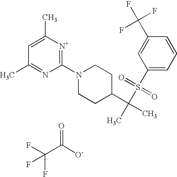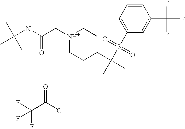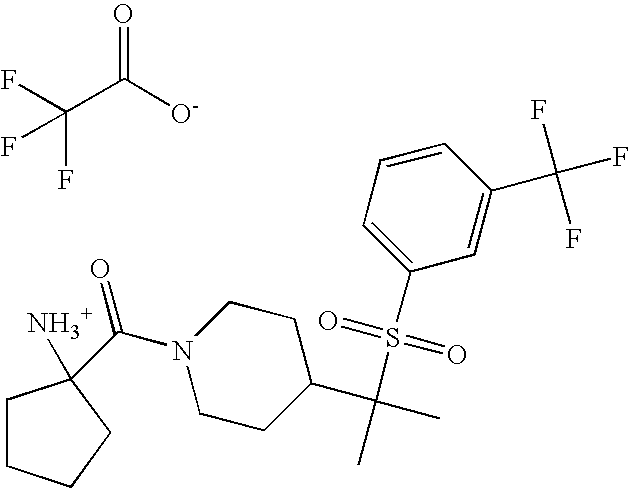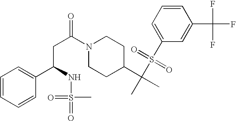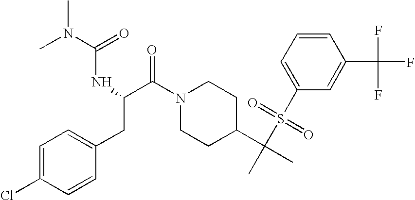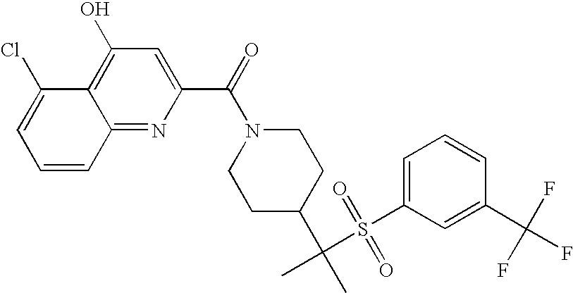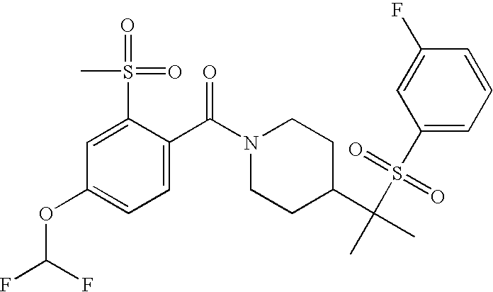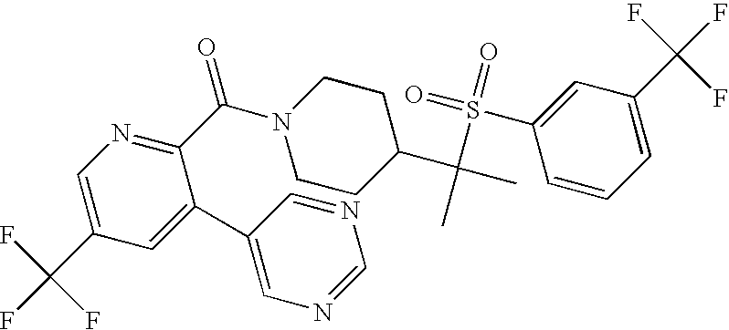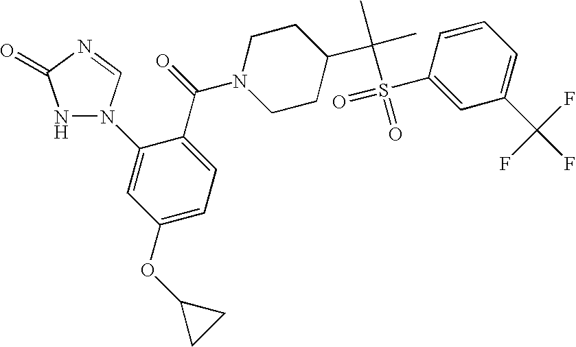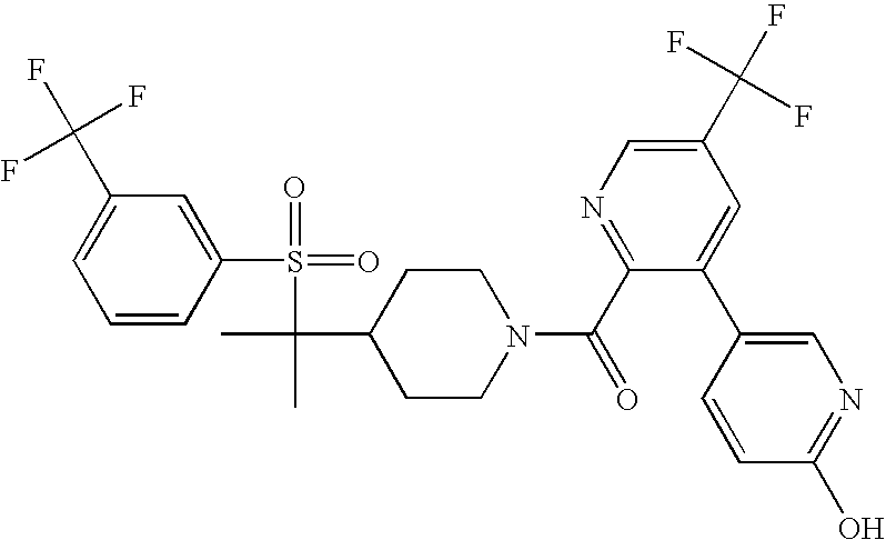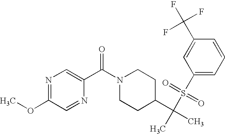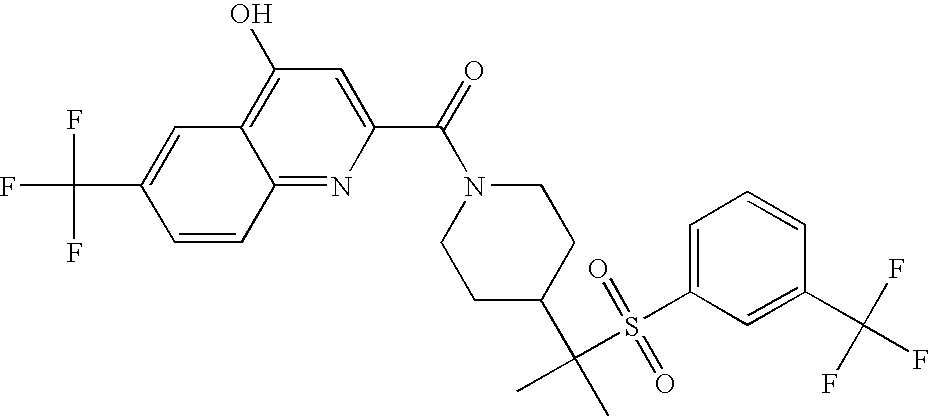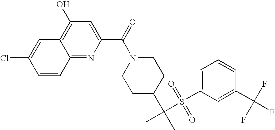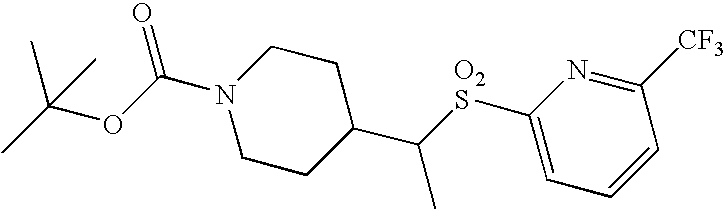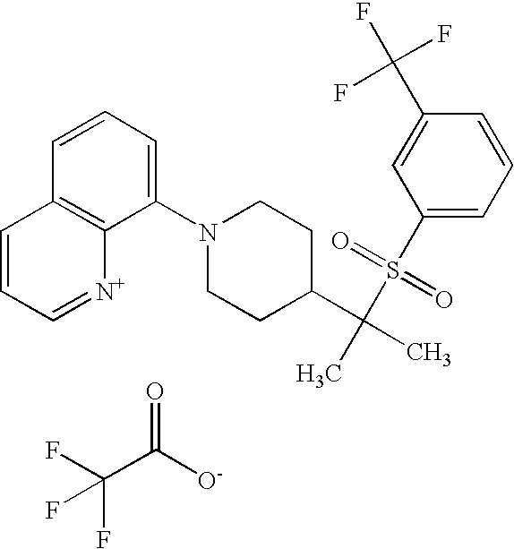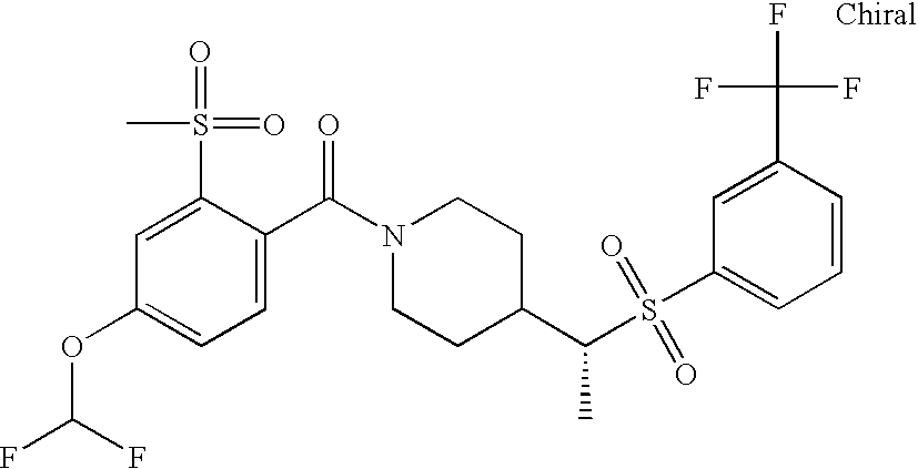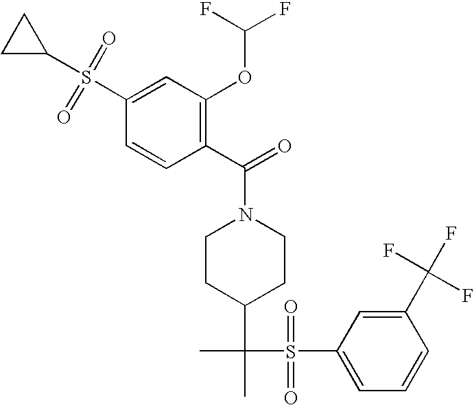 9 1-[4-(methylsulfonyl)-2- (trifluoromethoxy)benzoyl]- 4-({[3-(trifluoromethyl)- phenyl]sulfonyl}methyl)- piperidine 574 10 1-[5-fluoro-2- (methylsulfonyl)benzoyl]-4- ({[3-(trifluoromethyl)- phenyl]sulfonyl}methyl) piperidine 508 11 1-[2-(methylsulfonyl)-4- (trifluoromethyl)benzoyl]- 4-({[3-(trifluoromethyl)- phenyl]sulfonyl}methyl)- piperidine 558 12 1-[2-chloro-4- (methylsulfonyl)benzoyl]-4- ({[3-(trifluoromethyl)- phenyl]sulfonyl}methyl) piperidine 524 13 1-[5-fluoro-2-(methyl- sulfonyl)benzoyl]-4- ({[4-fluorophenyl)sulfonyl]- methyl}piperdinehyl} piperidine 458 14 4-{[(4-fluorophenyl)- sulfonyl]methyl}-1-[4- (methylsulfonyl)-2- (trifluoromethoxy)benzoyl] piperidine 524 15 4-{[(4-chlorophenyl)- sulfonyl]methyl}-1-[5- fluoro-2-(methyl- sulfonyl)benzoyl]piperidine 475 16 4-{[(4- chlorophenyl)sulfonyl] methyl}-1-[4-(methylsulfonyl)-2- (trifluoromethoxy)benzoyl] piperidine 541 17 4-{[(3- chlorophenyl)sulfonyl]methyl}- 1-[4-(methylsulfonyl)-2- (trifluoromethoxy)benzoyl] piperidine 541 18 1-(3,5-di-tert-butyl-4- methoxybenzoyl)-4-{[(4- fluorophenyl)sulfonyl]methyl} piperidine 504 19 4-{[(4- chlorophenyl)sulfonyl]methyl}- 1-(3,5-di-tert-butyl-4- methoxybenzoyl)piperidine 520 20 1-[4-(difluoromethoxy)-2- (methylsulfonyl)benzoyl]-4- ({[3-(trifluoromethyl)- phenyl]sulfonyl}methyl) piperidine 556 21 4-{[(4-fluorophenyl)- sulfonyl]methyl}-1-[2- (methylsulfonyl)-4- (trifluoromethyl)benzoyl] piperidine 508 22 1-[4-(difluoromethoxy)-2- (methylsulfonyl)benzoyl]-4- {[(4- fluorophenyl)sulfonyl]methyl} piperidine 506 23 4-{[(4- chlorophenyl)sulfonyl]methyl}- 1-[2-(methylsulfonyl)-4- (trifluoromethyl)benzoyl] piperidine 524 24 4-{[(4- chlorophenyl)sulfonyl]methy1}-1- [4-(difluoromethoxy)-2- (methylsulfonyl)benzoyl] piperidine 522 25 1-[2-(methylsulfonyl)-4- (trifluoromethoxy)benzoyl]- 4-({{3- (trifluoromethyl)phenyl] sulfonyl}methyl)piperidine 574 26 4-{[(4- chlorophenyl)sulfonyl]methyl}- 1-[2-(methylsulfonyl)-4- (trifluoromethoxy)benzoyl] piperidine 540 27 4-{[(4- fluorophenyl)sulfonyl]methyl}- 1-[2-(methylsulfonyl)-4- (trifluoromethoxy)benzoyl] piperidine 524 28 1-[4-(methylsulfonyl)-2- (trifluoromethoxy)benzoyl]- 4-(1-{[3-(trifluoromethyl) phenyl]sulfonyl}ethyl) piperidine 588 29 1-[4-(methylsulfonyl)-2- (trifluoromethoxy)benzoyl]- 4-((1S)-1-{[3-(trifluoromethyl) phenyl]sulfonyl}ethyl)piperidine 588 30 1-[4-(methylsulfonyl)-2- (trifluoromethoxy)benzoyl]- 4-((1R)-1-{[3- (trifluoromethyl) phenyl]sulfonyl} ethyl)piperidine 588 31 4-{1-[(4- fluorophenyl)sulfonyl]ethyl}-1- [4-(methylsulfonyl)-2- (trifluoromethoxy)benzoyl] piperidine 538 32 4-{1-[(4- chlorophenyl)sulfonyl]ethyl}- 1-[4-(methylsulfonyl)-2- (trifluoromethoxy)benzoyl] piperidine 555 33 4-{1-[(4- chlorophenyl)sulfonyl]ethyl}- 1-[5-fluoro-2-(methylsulfonyl) benzoyl]piperidine 488 34 1-[5-fluoro-2- (methylsulfonyl)benzoyl]- 4-(1-{[3-(trifluoromethyl)phenyl] sulfonyl}ethyl)piperidine 522 35 1-[2-(methylsulfonyl)-4- (trifluoromethyl)benzoyl]- 4-(1-{[3- (trifluoromethyl) phenyl]sulfonyl} ethyl)piperidine 572 36 tert-butyl4-(1-{[3- (trifluoromethyl)phenyl] sulfonyl}ethyl)piperidine-1- carboxylate 422 37 1-[2-(methylsulfonyl)-4- (trifluoromethoxy)benzoyl]- 4-((1S)-1-{[3- (trifluoromethyl)phenyl] sulfonyl}ethyl)piperidine 588 38 1-[4-(difluoromethoxy)-2- (methylsulfonyl)benzoyl]- 4-((1S)-1-{[3- (trifluoromethyl)phenyl] sulfonyl}ethyl)piperidine 570 39 1-[2-(methylsulfonyl)-4- (trifluoromethoxy)benzoyl]- 4-((1R)-1-{[3- trifluoromethyl)phenyl] sulfonyl}ethyl)piperidine 588 40 1-[4-(difluoromethoxy)-2- (methylsulfonyl)benzoyl]- 4-((1R)-1-{[3- (trifluoromethyl)phenyl] sulfonyl}ethyl)piperidine 570 41 1-[4-(cyclopropyloxy)-2,6- bis(methylsulfonyl)benzoyl]- 4-((1S)-1-{[3-(trifluoromethyl) phenyl] sulfonyl}ethyl)piperidine 638 42 1-[4-(cyclopropyloxy)-2,6- bis(methylsulfonyl)benzoyl]- 4-((1R)-1-{[3- (trifluoromethyl)phenyl] sulfonyl}ethyl)piperidine 638 43 2-(cyclopropylsulfonyl)-6- (trifluoromethyl)-3- {[4-((1S)-1-{[3- (trifluoromethyl)phenyl] sulfonyl}ethyl)piperidin-1- yl]carbonyl}pyridine 599 44 2-(cyclopropylsulfonyl)-6- (trifluoromethyl)-3- {[4-((1R)-1-{[3- (trifluoromethyl)phenyl] sulfonyl}ethyl)piperidin-1- yl]carbonyl}pyridine 599 45 3-chloro-5- (trifluoromethyl)-2-{[4- ((1S)-1-{[3- (trifluoromethyl)phenyl] sulfonyl}ethyl)piperidin-1- yl]carbonyl}pyridine 529 46 3-chloro-5- (trifluoromethyl)-2-{[4- ((1S)-1-{[3- (trifluoromethyl)phenyl] sulfonyl}ethyl)piperidin-1- yl]carbonyl}pyridine 529 47 3-(methylsulfonyl)-5- (trifluoromethyl)-2-{[4- ((1S)-1-{[3- (trifluoromethyl)phenyl] sulfonyl}ethyl)piperidin-1- yl]carbonyl}pyridine 573 48 3-(methylsulfonyl)-5- (trifluoromethyl)-2-{[4- ((1S)-1-{[3- (trifluoromethyl)phenyl] sulfonyl}ethyl)piperidin-1- yl]carbonyl}pyridine 573 49 3-(cyclopropylsulfonyl)-5- (trifluoromethyl)-2- {[4-((1S)-1-{[3- (trifluoromethyl)phenyl] sulfonyl}ethyl)piperidin-1- yl]carbonyl}pyridine 599 50 3-(cyclopropylsulfonyl)-5- (trifluoromethyl)-2- {[4-((1S)-1-{[3- (trifluoromethyl)phenyl] sulfonyl}ethyl)piperidin-1- yl]carbonyl}pyridine 599 51 4-(cyclopropyl{[3- (trifluoromethyl)phenyl] sulfonyl}methyl)-1-[5-fluoro- 2- (methylsulfonyl)benzoyl] piperidine 548 52 4-(cyclopropyl{[3- (trifluoromethyl)phenyl] sulfonyl}methyl)-1-[4- (methylsulfonyl)-2- (trifluoromethoxy)benzoyl] piperidine 514 53 1-[4-(methylsulfonyl)-2- (trifluoromethoxy)benzoyl]- 4-(1-methyl-1-{[3- (trifluoromethyl)phenyl] sulfonyl}ethyl)piperidine 602 54 1-[2-(methylsulfonyl)-4 (trifluoromethyl)benzoyl]- 4-(1-methyl-1-{[3- (trifluoromethyl)phenyl] sulfonyl}ethyl)piperidine 586 55 1-[5-fluoro-2- (methylsulfonyl)benzoyl]- 4-(1-methyl-1-{[3- (trifluoromethyl)phenyl] sulfonyl}ethyl)piperidine 536 56 1-(3-fluorobenzoyl)-4-(1- methyl-1-{[3- (trifluoromethyl)phenyl] sulfonyl}ethyl)piperidine 458 57 1-(3-methylbenzoyl)-4- (1-methyl-1-{[3- (trifluoromethyl)phenyl] sulfonyl}ethyl)piperidine 454 58 1-(3-methoxybenzoyl)-4- (1-methyl-1-{[3- (trifluoromethyl)phenyl] sulfonyl}ethyl)piperidine 470 59 1-(4-isopropylbenzoyl)-4- (1-methyl-1-{[3- (trifluoromethyl)phenyl] sulfonyl}ethyl)piperidine 
