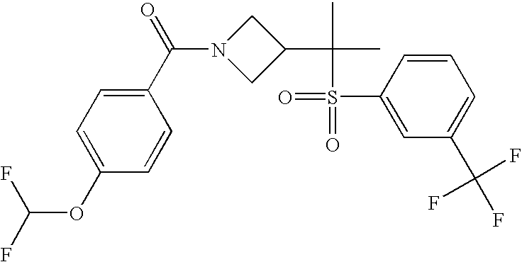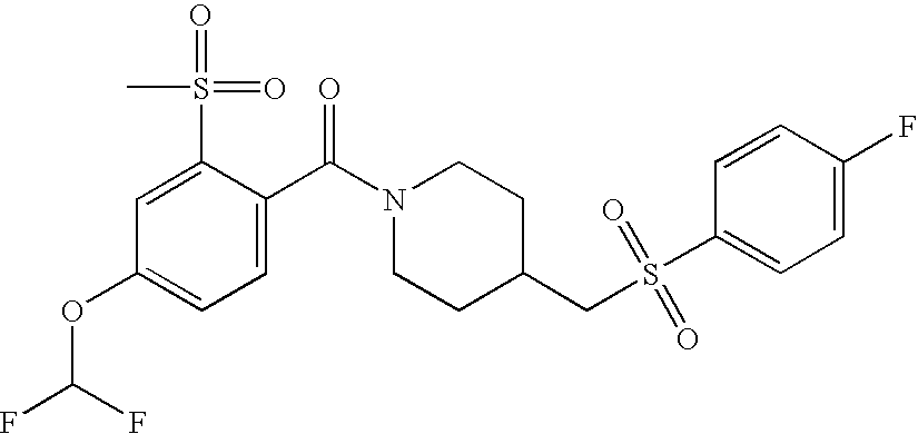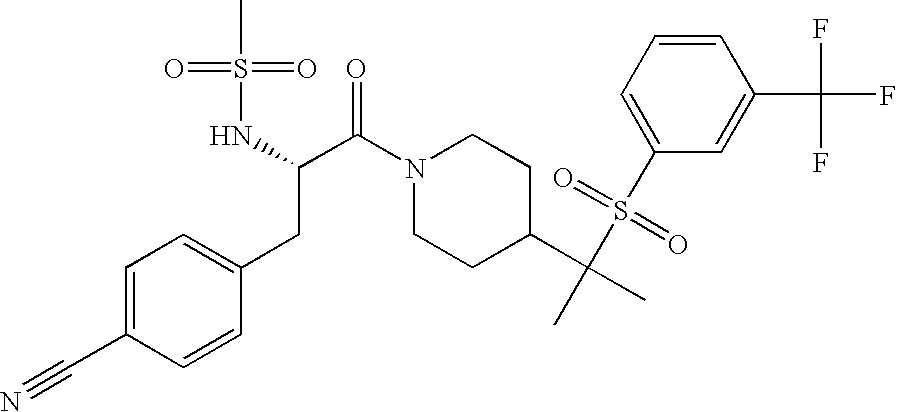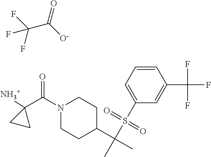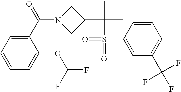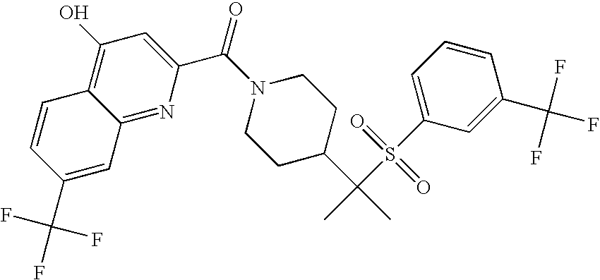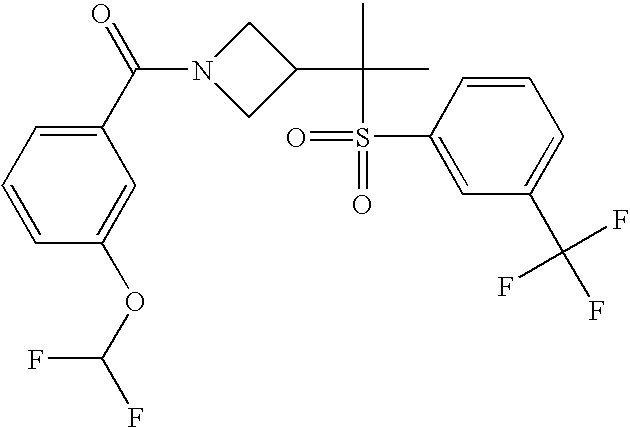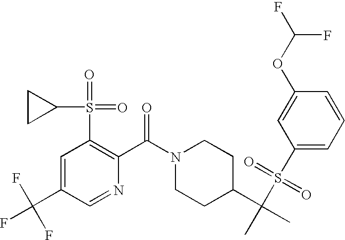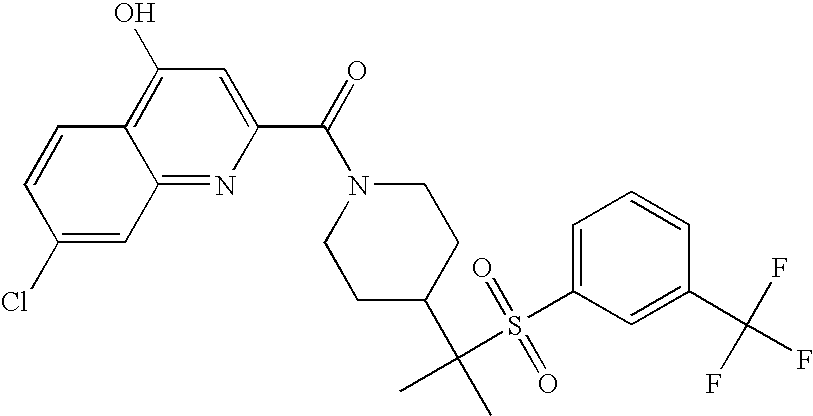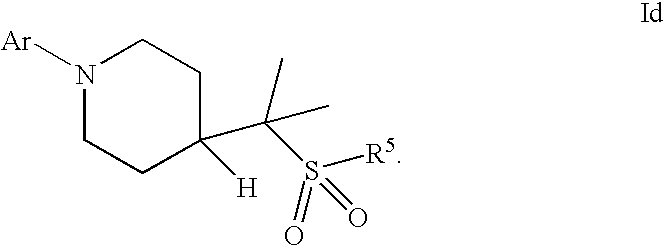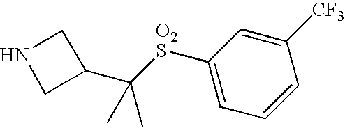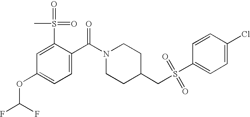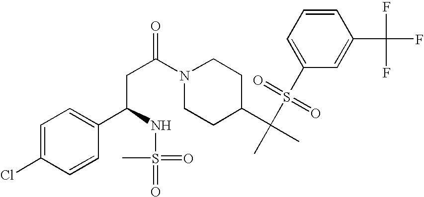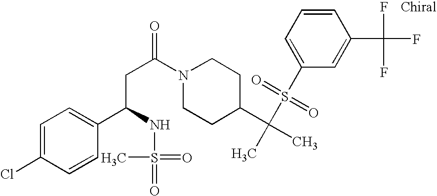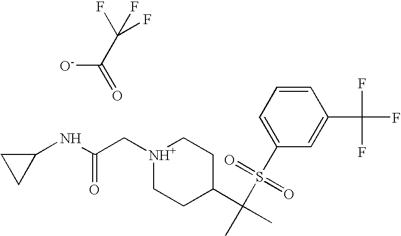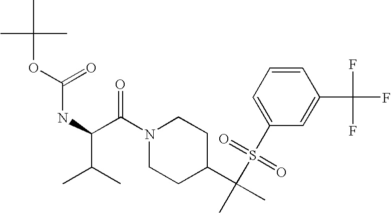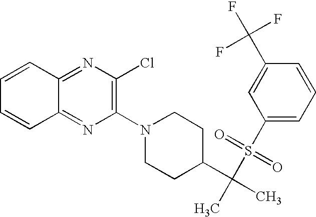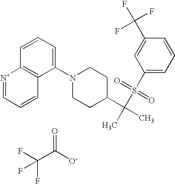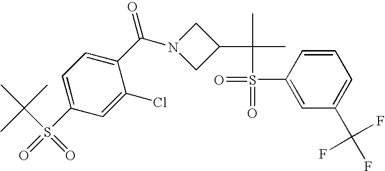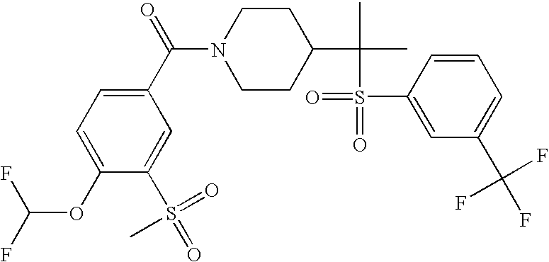 9 1-[4-(methylsulfonyl)-2- (trifluoromethoxy)benzoyl]- 4-({[3-(trifluoromethyl)- phenyl]sulfonyl}methyl)- piperidine 574 10 1-[5-fluoro-2- (methylsulfonyl)benzoyl]-4- ({[3-(trifluoromethyl)- phenyl]sulfonyl}methyl) piperidine 508 11 1-[2-(methylsulfonyl)-4- (trifluoromethyl)benzoyl]- 4-({[3-(trifluoromethyl)- phenyl]sulfonyl}methyl)- piperidine 558 12 1-[2-chloro-4- (methylsulfonyl)benzoyl]-4- ({[3-(trifluoromethyl)- phenyl]sulfonyl}methyl) piperidine 524 13 1-[5-fluoro-2-(methyl- sulfonyl)benzoyl]-4- ({[4-fluorophenyl)sulfonyl]- methyl}piperdinehyl} piperidine 458 14 4-{[(4-fluorophenyl)- sulfonyl]methyl}-1-[4- (methylsulfonyl)-2- (trifluoromethoxy)benzoyl] piperidine 524 15 4-{[(4-chlorophenyl)- sulfonyl]methyl}-1-[5- fluoro-2-(methyl- sulfonyl)benzoyl]piperidine 475 16 4-{[(4- chlorophenyl)sulfonyl] methyl}-1-[4-(methylsulfonyl)-2- (trifluoromethoxy)benzoyl] piperidine 541 17 4-{[(3- chlorophenyl)sulfonyl]methyl}- 1-[4-(methylsulfonyl)-2- (trifluoromethoxy)benzoyl] piperidine 541 18 1-(3,5-di-tert-butyl-4- methoxybenzoyl)-4-{[(4- fluorophenyl)sulfonyl]methyl} piperidine 504 19 4-{[(4- chlorophenyl)sulfonyl]methyl}- 1-(3,5-di-tert-butyl-4- methoxybenzoyl)piperidine 520 20 1-[4-(difluoromethoxy)-2- (methylsulfonyl)benzoyl]-4- ({[3-(trifluoromethyl)- phenyl]sulfonyl}methyl) piperidine 556 21 4-{[(4-fluorophenyl)- sulfonyl]methyl}-1-[2- (methylsulfonyl)-4- (trifluoromethyl)benzoyl] piperidine 508 22 1-[4-(difluoromethoxy)-2- (methylsulfonyl)benzoyl]-4- {[(4- fluorophenyl)sulfonyl]methyl} piperidine 506 23 4-{[(4- chlorophenyl)sulfonyl]methyl}- 1-[2-(methylsulfonyl)-4- (trifluoromethyl)benzoyl] piperidine 524 24 4-{[(4- chlorophenyl)sulfonyl]methy1}-1- [4-(difluoromethoxy)-2- (methylsulfonyl)benzoyl] piperidine 522 25 1-[2-(methylsulfonyl)-4- (trifluoromethoxy)benzoyl]- 4-({{3- (trifluoromethyl)phenyl] sulfonyl}methyl)piperidine 574 26 4-{[(4- chlorophenyl)sulfonyl]methyl}- 1-[2-(methylsulfonyl)-4- (trifluoromethoxy)benzoyl] piperidine 540 27 4-{[(4- fluorophenyl)sulfonyl]methyl}- 1-[2-(methylsulfonyl)-4- (trifluoromethoxy)benzoyl] piperidine 524 28 1-[4-(methylsulfonyl)-2- (trifluoromethoxy)benzoyl]- 4-(1-{[3-(trifluoromethyl) phenyl]sulfonyl}ethyl) piperidine 588 29 1-[4-(methylsulfonyl)-2- (trifluoromethoxy)benzoyl]- 4-((1S)-1-{[3-(trifluoromethyl) phenyl]sulfonyl}ethyl)piperidine 588 30 1-[4-(methylsulfonyl)-2- (trifluoromethoxy)benzoyl]- 4-((1R)-1-{[3- (trifluoromethyl) phenyl]sulfonyl} ethyl)piperidine 588 31 4-{1-[(4- fluorophenyl)sulfonyl]ethyl}-1- [4-(methylsulfonyl)-2- (trifluoromethoxy)benzoyl] piperidine 538 32 4-{1-[(4- chlorophenyl)sulfonyl]ethyl}- 1-[4-(methylsulfonyl)-2- (trifluoromethoxy)benzoyl] piperidine 555 33 4-{1-[(4- chlorophenyl)sulfonyl]ethyl}- 1-[5-fluoro-2-(methylsulfonyl) benzoyl]piperidine 488 34 1-[5-fluoro-2- (methylsulfonyl)benzoyl]- 4-(1-{[3-(trifluoromethyl)phenyl] sulfonyl}ethyl)piperidine 522 35 1-[2-(methylsulfonyl)-4- (trifluoromethyl)benzoyl]- 4-(1-{[3- (trifluoromethyl) phenyl]sulfonyl} ethyl)piperidine 572 36 tert-butyl4-(1-{[3- (trifluoromethyl)phenyl] sulfonyl}ethyl)piperidine-1- carboxylate 422 37 1-[2-(methylsulfonyl)-4- (trifluoromethoxy)benzoyl]- 4-((1S)-1-{[3- (trifluoromethyl)phenyl] sulfonyl}ethyl)piperidine 588 38 1-[4-(difluoromethoxy)-2- (methylsulfonyl)benzoyl]- 4-((1S)-1-{[3- (trifluoromethyl)phenyl] sulfonyl}ethyl)piperidine 570 39 1-[2-(methylsulfonyl)-4- (trifluoromethoxy)benzoyl]- 4-((1R)-1-{[3- trifluoromethyl)phenyl] sulfonyl}ethyl)piperidine 588 40 1-[4-(difluoromethoxy)-2- (methylsulfonyl)benzoyl]- 4-((1R)-1-{[3- (trifluoromethyl)phenyl] sulfonyl}ethyl)piperidine 570 41 1-[4-(cyclopropyloxy)-2,6- bis(methylsulfonyl)benzoyl]- 4-((1S)-1-{[3-(trifluoromethyl) phenyl] sulfonyl}ethyl)piperidine 638 42 1-[4-(cyclopropyloxy)-2,6- bis(methylsulfonyl)benzoyl]- 4-((1R)-1-{[3- (trifluoromethyl)phenyl] sulfonyl}ethyl)piperidine 638 43 2-(cyclopropylsulfonyl)-6- (trifluoromethyl)-3- {[4-((1S)-1-{[3- (trifluoromethyl)phenyl] sulfonyl}ethyl)piperidin-1- yl]carbonyl}pyridine 599 44 2-(cyclopropylsulfonyl)-6- (trifluoromethyl)-3- {[4-((1R)-1-{[3- (trifluoromethyl)phenyl] sulfonyl}ethyl)piperidin-1- yl]carbonyl}pyridine 599 45 3-chloro-5- (trifluoromethyl)-2-{[4- ((1S)-1-{[3- (trifluoromethyl)phenyl] sulfonyl}ethyl)piperidin-1- yl]carbonyl}pyridine 529 46 3-chloro-5- (trifluoromethyl)-2-{[4- ((1S)-1-{[3- (trifluoromethyl)phenyl] sulfonyl}ethyl)piperidin-1- yl]carbonyl}pyridine 529 47 3-(methylsulfonyl)-5- (trifluoromethyl)-2-{[4- ((1S)-1-{[3- (trifluoromethyl)phenyl] sulfonyl}ethyl)piperidin-1- yl]carbonyl}pyridine 573 48 3-(methylsulfonyl)-5- (trifluoromethyl)-2-{[4- ((1S)-1-{[3- (trifluoromethyl)phenyl] sulfonyl}ethyl)piperidin-1- yl]carbonyl}pyridine 573 49 3-(cyclopropylsulfonyl)-5- (trifluoromethyl)-2- {[4-((1S)-1-{[3- (trifluoromethyl)phenyl] sulfonyl}ethyl)piperidin-1- yl]carbonyl}pyridine 599 50 3-(cyclopropylsulfonyl)-5- (trifluoromethyl)-2- {[4-((1S)-1-{[3- (trifluoromethyl)phenyl] sulfonyl}ethyl)piperidin-1- yl]carbonyl}pyridine 599 51 4-(cyclopropyl{[3- (trifluoromethyl)phenyl] sulfonyl}methyl)-1-[5-fluoro- 2- (methylsulfonyl)benzoyl] piperidine 548 52 4-(cyclopropyl{[3- (trifluoromethyl)phenyl] sulfonyl}methyl)-1-[4- (methylsulfonyl)-2- (trifluoromethoxy)benzoyl] piperidine 514 53 1-[4-(methylsulfonyl)-2- (trifluoromethoxy)benzoyl]- 4-(1-methyl-1-{[3- (trifluoromethyl)phenyl] sulfonyl}ethyl)piperidine 602 54 1-[2-(methylsulfonyl)-4 (trifluoromethyl)benzoyl]- 4-(1-methyl-1-{[3- (trifluoromethyl)phenyl] sulfonyl}ethyl)piperidine 586 55 1-[5-fluoro-2- (methylsulfonyl)benzoyl]- 4-(1-methyl-1-{[3- (trifluoromethyl)phenyl] sulfonyl}ethyl)piperidine 536 56 1-(3-fluorobenzoyl)-4-(1- methyl-1-{[3- (trifluoromethyl)phenyl] sulfonyl}ethyl)piperidine 458 57 1-(3-methylbenzoyl)-4- (1-methyl-1-{[3- (trifluoromethyl)phenyl] sulfonyl}ethyl)piperidine 454 58 1-(3-methoxybenzoyl)-4- (1-methyl-1-{[3- (trifluoromethyl)phenyl] sulfonyl}ethyl)piperidine 470 59 1-(4-isopropylbenzoyl)-4- (1-methyl-1-{[3- (trifluoromethyl)phenyl] sulfonyl}ethyl)piperidine 