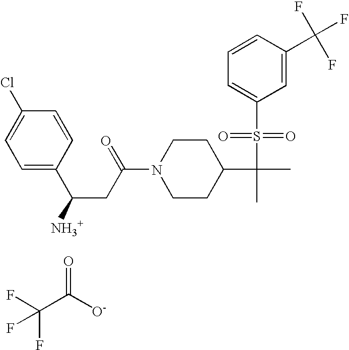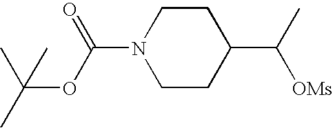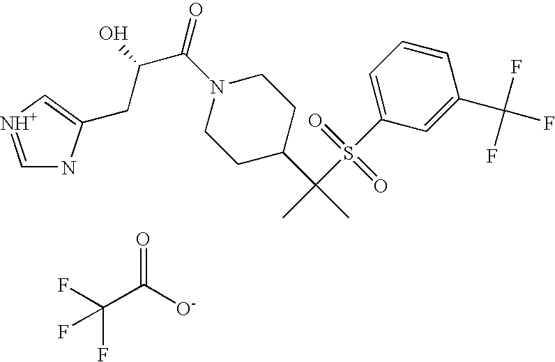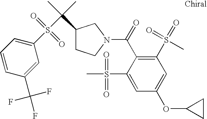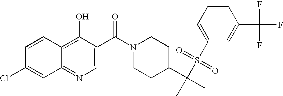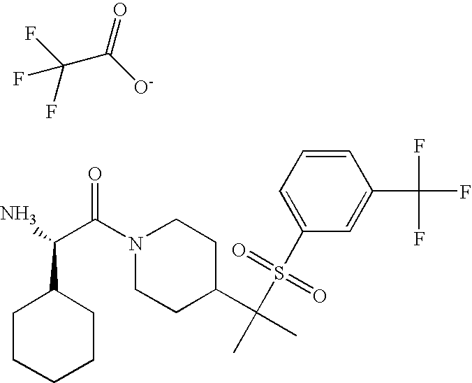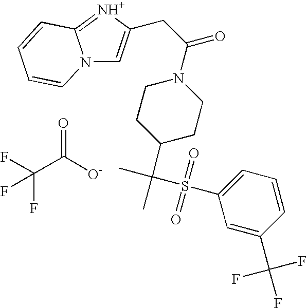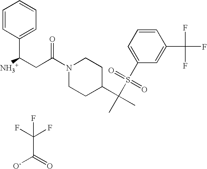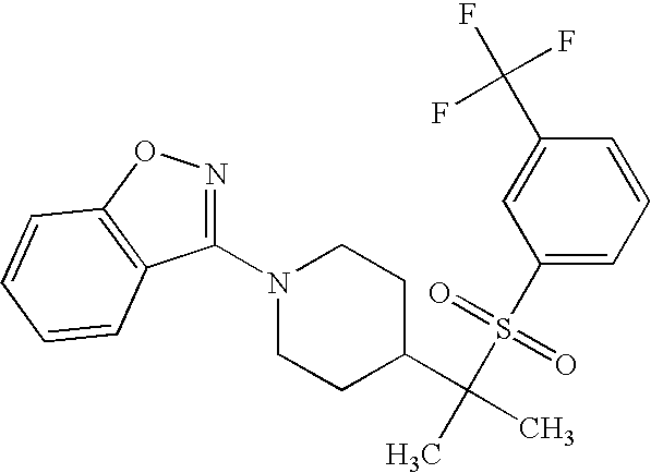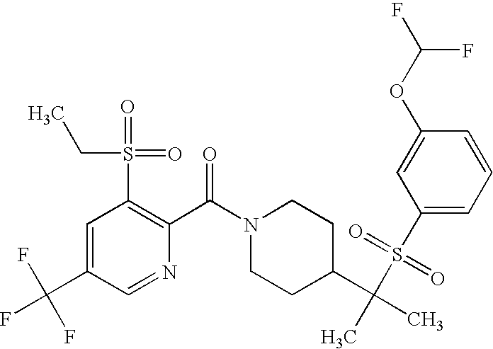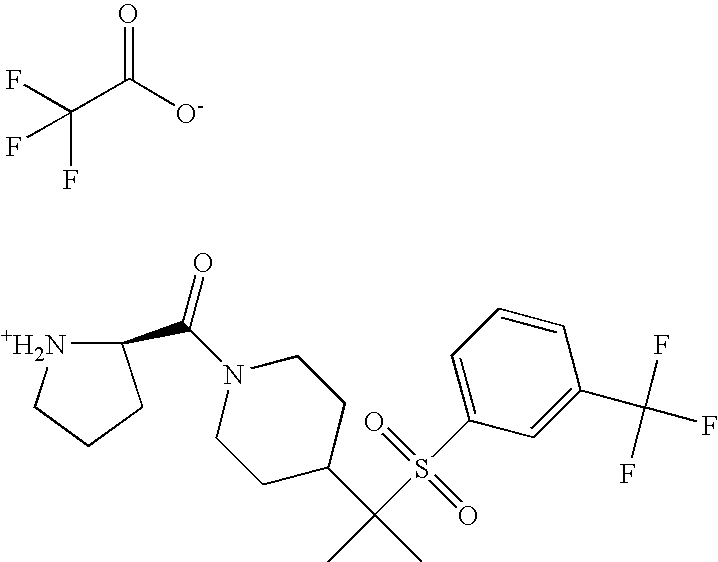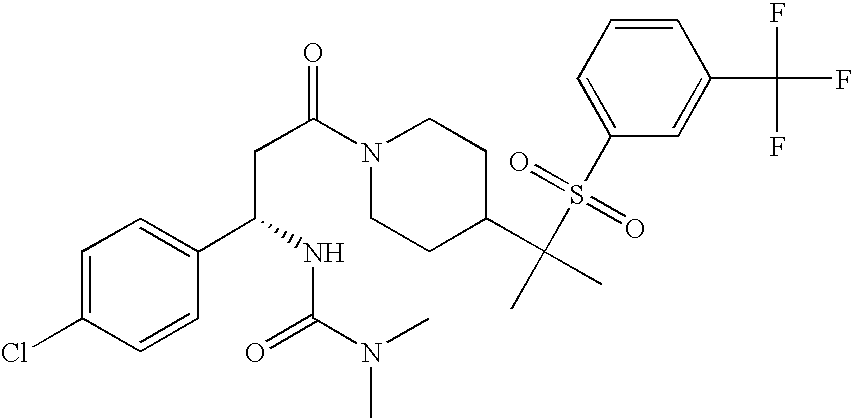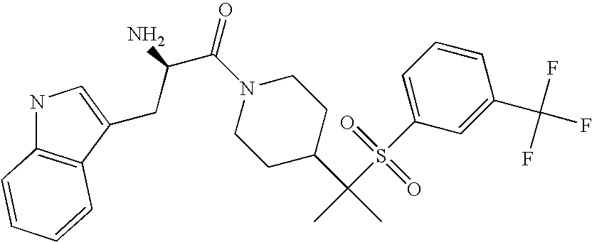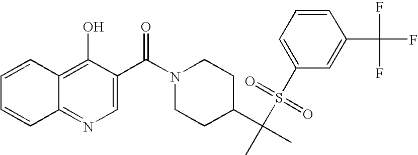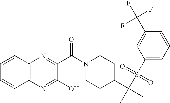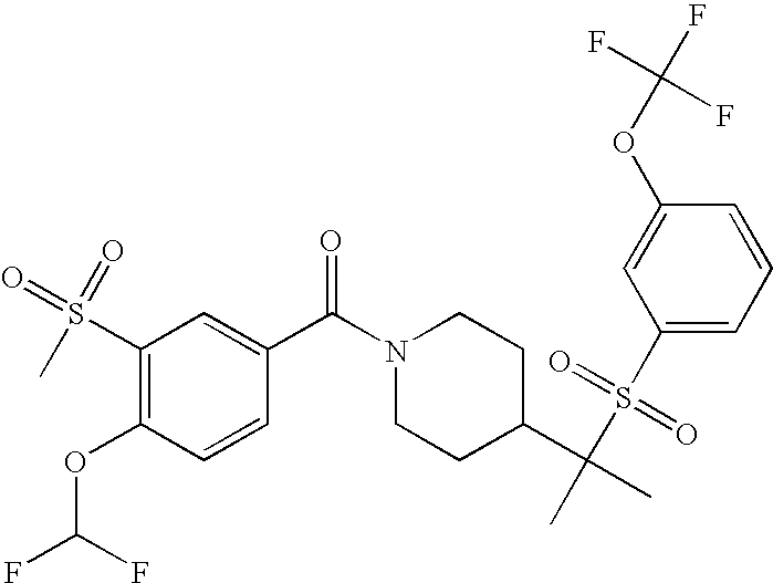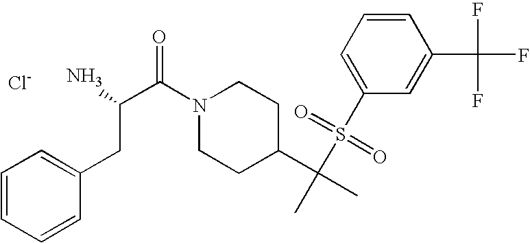 9 1-[4-(methylsulfonyl)-2- (trifluoromethoxy)benzoyl]- 4-({[3-(trifluoromethyl)- phenyl]sulfonyl}methyl)- piperidine 574 10 1-[5-fluoro-2- (methylsulfonyl)benzoyl]-4- ({[3-(trifluoromethyl)- phenyl]sulfonyl}methyl) piperidine 508 11 1-[2-(methylsulfonyl)-4- (trifluoromethyl)benzoyl]- 4-({[3-(trifluoromethyl)- phenyl]sulfonyl}methyl)- piperidine 558 12 1-[2-chloro-4- (methylsulfonyl)benzoyl]-4- ({[3-(trifluoromethyl)- phenyl]sulfonyl}methyl) piperidine 524 13 1-[5-fluoro-2-(methyl- sulfonyl)benzoyl]-4- ({[4-fluorophenyl)sulfonyl]- methyl}piperdinehyl} piperidine 458 14 4-{[(4-fluorophenyl)- sulfonyl]methyl}-1-[4- (methylsulfonyl)-2- (trifluoromethoxy)benzoyl] piperidine 524 15 4-{[(4-chlorophenyl)- sulfonyl]methyl}-1-[5- fluoro-2-(methyl- sulfonyl)benzoyl]piperidine 475 16 4-{[(4- chlorophenyl)sulfonyl] methyl}-1-[4-(methylsulfonyl)-2- (trifluoromethoxy)benzoyl] piperidine 541 17 4-{[(3- chlorophenyl)sulfonyl]methyl}- 1-[4-(methylsulfonyl)-2- (trifluoromethoxy)benzoyl] piperidine 541 18 1-(3,5-di-tert-butyl-4- methoxybenzoyl)-4-{[(4- fluorophenyl)sulfonyl]methyl} piperidine 504 19 4-{[(4- chlorophenyl)sulfonyl]methyl}- 1-(3,5-di-tert-butyl-4- methoxybenzoyl)piperidine 520 20 1-[4-(difluoromethoxy)-2- (methylsulfonyl)benzoyl]-4- ({[3-(trifluoromethyl)- phenyl]sulfonyl}methyl) piperidine 556 21 4-{[(4-fluorophenyl)- sulfonyl]methyl}-1-[2- (methylsulfonyl)-4- (trifluoromethyl)benzoyl] piperidine 508 22 1-[4-(difluoromethoxy)-2- (methylsulfonyl)benzoyl]-4- {[(4- fluorophenyl)sulfonyl]methyl} piperidine 506 23 4-{[(4- chlorophenyl)sulfonyl]methyl}- 1-[2-(methylsulfonyl)-4- (trifluoromethyl)benzoyl] piperidine 524 24 4-{[(4- chlorophenyl)sulfonyl]methy1}-1- [4-(difluoromethoxy)-2- (methylsulfonyl)benzoyl] piperidine 522 25 1-[2-(methylsulfonyl)-4- (trifluoromethoxy)benzoyl]- 4-({{3- (trifluoromethyl)phenyl] sulfonyl}methyl)piperidine 574 26 4-{[(4- chlorophenyl)sulfonyl]methyl}- 1-[2-(methylsulfonyl)-4- (trifluoromethoxy)benzoyl] piperidine 540 27 4-{[(4- fluorophenyl)sulfonyl]methyl}- 1-[2-(methylsulfonyl)-4- (trifluoromethoxy)benzoyl] piperidine 524 28 1-[4-(methylsulfonyl)-2- (trifluoromethoxy)benzoyl]- 4-(1-{[3-(trifluoromethyl) phenyl]sulfonyl}ethyl) piperidine 588 29 1-[4-(methylsulfonyl)-2- (trifluoromethoxy)benzoyl]- 4-((1S)-1-{[3-(trifluoromethyl) phenyl]sulfonyl}ethyl)piperidine 588 30 1-[4-(methylsulfonyl)-2- (trifluoromethoxy)benzoyl]- 4-((1R)-1-{[3- (trifluoromethyl) phenyl]sulfonyl} ethyl)piperidine 588 31 4-{1-[(4- fluorophenyl)sulfonyl]ethyl}-1- [4-(methylsulfonyl)-2- (trifluoromethoxy)benzoyl] piperidine 538 32 4-{1-[(4- chlorophenyl)sulfonyl]ethyl}- 1-[4-(methylsulfonyl)-2- (trifluoromethoxy)benzoyl] piperidine 555 33 4-{1-[(4- chlorophenyl)sulfonyl]ethyl}- 1-[5-fluoro-2-(methylsulfonyl) benzoyl]piperidine 488 34 1-[5-fluoro-2- (methylsulfonyl)benzoyl]- 4-(1-{[3-(trifluoromethyl)phenyl] sulfonyl}ethyl)piperidine 522 35 1-[2-(methylsulfonyl)-4- (trifluoromethyl)benzoyl]- 4-(1-{[3- (trifluoromethyl) phenyl]sulfonyl} ethyl)piperidine 572 36 tert-butyl4-(1-{[3- (trifluoromethyl)phenyl] sulfonyl}ethyl)piperidine-1- carboxylate 422 37 1-[2-(methylsulfonyl)-4- (trifluoromethoxy)benzoyl]- 4-((1S)-1-{[3- (trifluoromethyl)phenyl] sulfonyl}ethyl)piperidine 588 38 1-[4-(difluoromethoxy)-2- (methylsulfonyl)benzoyl]- 4-((1S)-1-{[3- (trifluoromethyl)phenyl] sulfonyl}ethyl)piperidine 570 39 1-[2-(methylsulfonyl)-4- (trifluoromethoxy)benzoyl]- 4-((1R)-1-{[3- trifluoromethyl)phenyl] sulfonyl}ethyl)piperidine 588 40 1-[4-(difluoromethoxy)-2- (methylsulfonyl)benzoyl]- 4-((1R)-1-{[3- (trifluoromethyl)phenyl] sulfonyl}ethyl)piperidine 570 41 1-[4-(cyclopropyloxy)-2,6- bis(methylsulfonyl)benzoyl]- 4-((1S)-1-{[3-(trifluoromethyl) phenyl] sulfonyl}ethyl)piperidine 638 42 1-[4-(cyclopropyloxy)-2,6- bis(methylsulfonyl)benzoyl]- 4-((1R)-1-{[3- (trifluoromethyl)phenyl] sulfonyl}ethyl)piperidine 638 43 2-(cyclopropylsulfonyl)-6- (trifluoromethyl)-3- {[4-((1S)-1-{[3- (trifluoromethyl)phenyl] sulfonyl}ethyl)piperidin-1- yl]carbonyl}pyridine 599 44 2-(cyclopropylsulfonyl)-6- (trifluoromethyl)-3- {[4-((1R)-1-{[3- (trifluoromethyl)phenyl] sulfonyl}ethyl)piperidin-1- yl]carbonyl}pyridine 599 45 3-chloro-5- (trifluoromethyl)-2-{[4- ((1S)-1-{[3- (trifluoromethyl)phenyl] sulfonyl}ethyl)piperidin-1- yl]carbonyl}pyridine 529 46 3-chloro-5- (trifluoromethyl)-2-{[4- ((1S)-1-{[3- (trifluoromethyl)phenyl] sulfonyl}ethyl)piperidin-1- yl]carbonyl}pyridine 529 47 3-(methylsulfonyl)-5- (trifluoromethyl)-2-{[4- ((1S)-1-{[3- (trifluoromethyl)phenyl] sulfonyl}ethyl)piperidin-1- yl]carbonyl}pyridine 573 48 3-(methylsulfonyl)-5- (trifluoromethyl)-2-{[4- ((1S)-1-{[3- (trifluoromethyl)phenyl] sulfonyl}ethyl)piperidin-1- yl]carbonyl}pyridine 573 49 3-(cyclopropylsulfonyl)-5- (trifluoromethyl)-2- {[4-((1S)-1-{[3- (trifluoromethyl)phenyl] sulfonyl}ethyl)piperidin-1- yl]carbonyl}pyridine 599 50 3-(cyclopropylsulfonyl)-5- (trifluoromethyl)-2- {[4-((1S)-1-{[3- (trifluoromethyl)phenyl] sulfonyl}ethyl)piperidin-1- yl]carbonyl}pyridine 599 51 4-(cyclopropyl{[3- (trifluoromethyl)phenyl] sulfonyl}methyl)-1-[5-fluoro- 2- (methylsulfonyl)benzoyl] piperidine 548 52 4-(cyclopropyl{[3- (trifluoromethyl)phenyl] sulfonyl}methyl)-1-[4- (methylsulfonyl)-2- (trifluoromethoxy)benzoyl] piperidine 514 53 1-[4-(methylsulfonyl)-2- (trifluoromethoxy)benzoyl]- 4-(1-methyl-1-{[3- (trifluoromethyl)phenyl] sulfonyl}ethyl)piperidine 602 54 1-[2-(methylsulfonyl)-4 (trifluoromethyl)benzoyl]- 4-(1-methyl-1-{[3- (trifluoromethyl)phenyl] sulfonyl}ethyl)piperidine 586 55 1-[5-fluoro-2- (methylsulfonyl)benzoyl]- 4-(1-methyl-1-{[3- (trifluoromethyl)phenyl] sulfonyl}ethyl)piperidine 536 56 1-(3-fluorobenzoyl)-4-(1- methyl-1-{[3- (trifluoromethyl)phenyl] sulfonyl}ethyl)piperidine 458 57 1-(3-methylbenzoyl)-4- (1-methyl-1-{[3- (trifluoromethyl)phenyl] sulfonyl}ethyl)piperidine 454 58 1-(3-methoxybenzoyl)-4- (1-methyl-1-{[3- (trifluoromethyl)phenyl] sulfonyl}ethyl)piperidine 470 59 1-(4-isopropylbenzoyl)-4- (1-methyl-1-{[3- (trifluoromethyl)phenyl] sulfonyl}ethyl)piperidine 